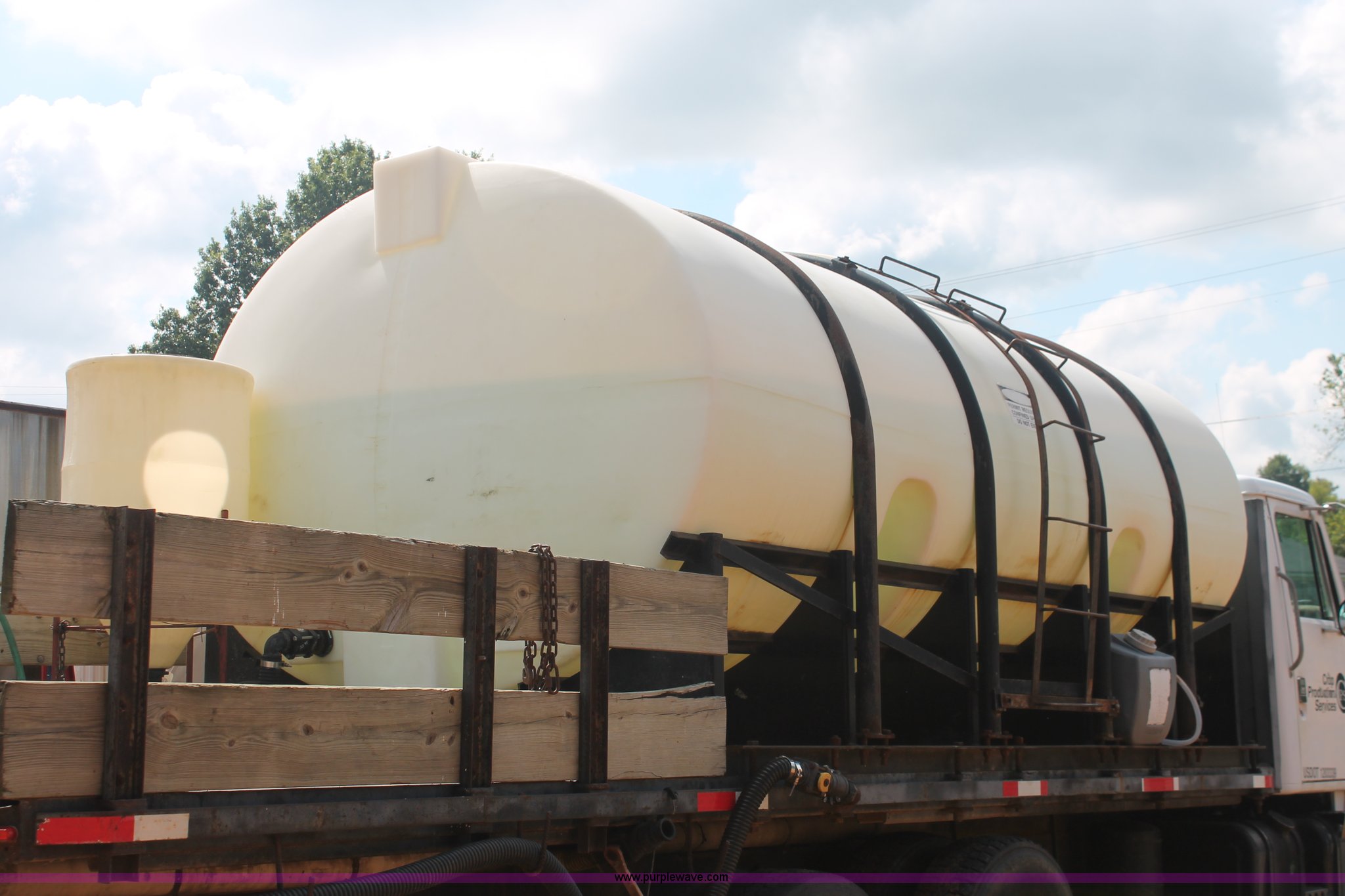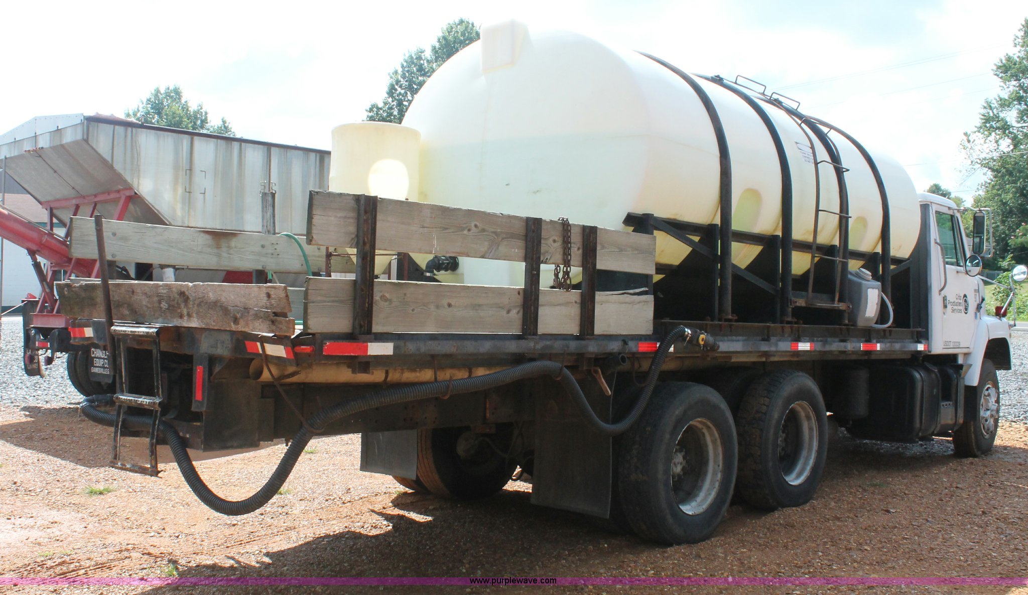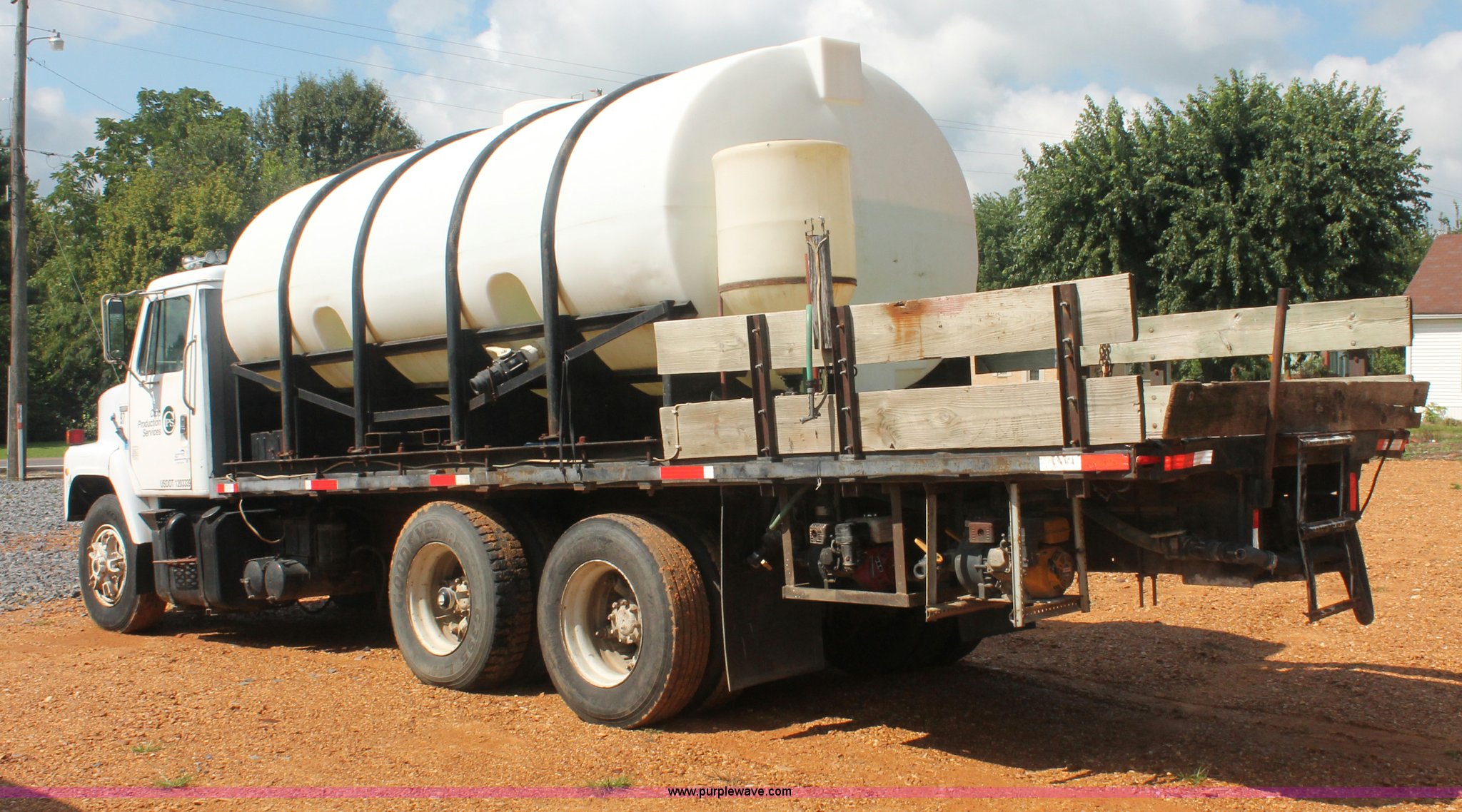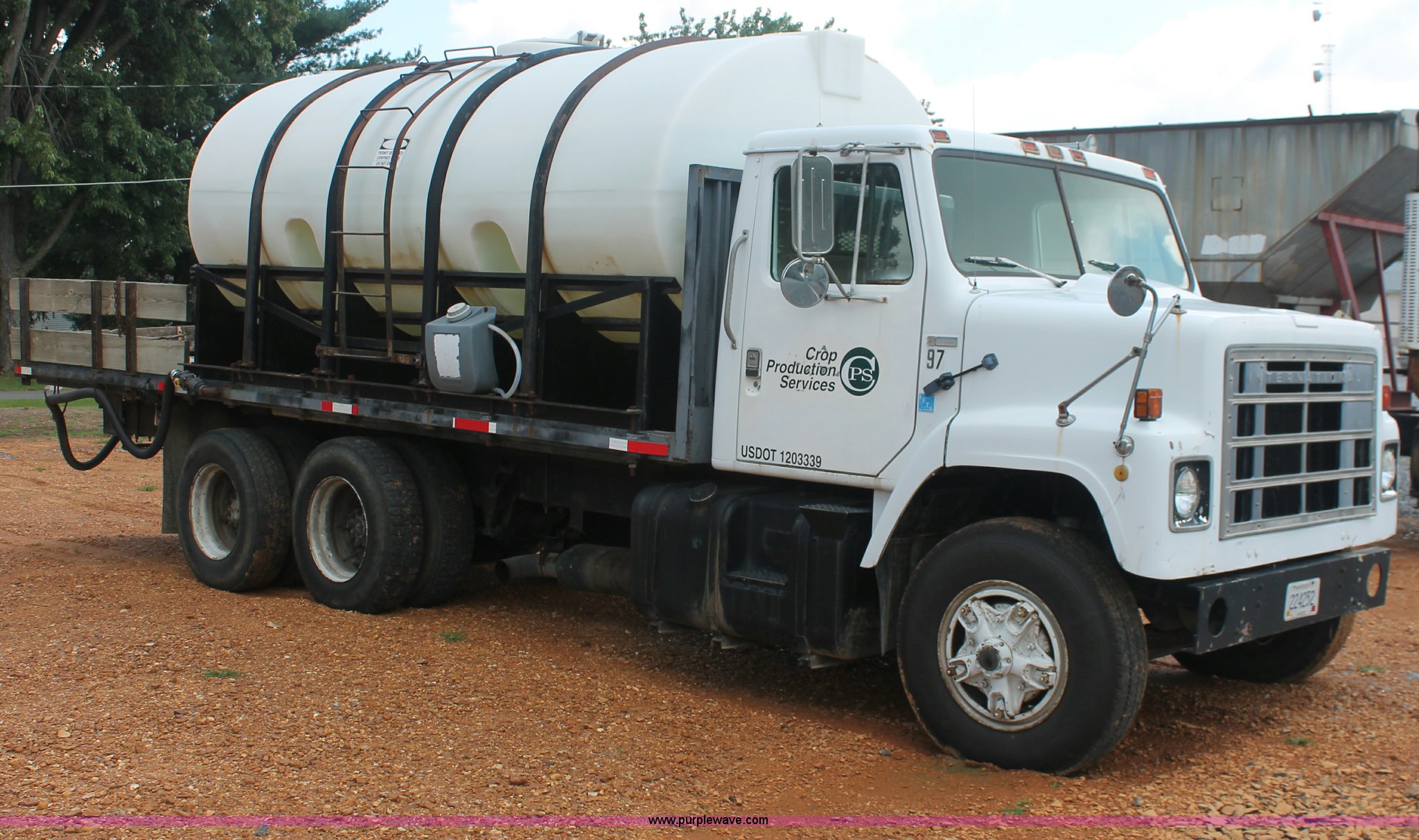 1982 International F2275 flatbed liquid nurse truck. 242,687 miles on odometer, Cummins diesel engine, Fuller Road Ranger RT-9509 nine speed manual transmission, Power divider lock, Fifth wheel lock, AC and heat Unknown operating condition, 22' flatbed 3,000 gallon poly tank, 95 gallon induction tank, 55 gallon induction tank, 2" plumbing, Shut-off valves, Honda GX160 5.5 HP gas engine, Lifan 5.5 HP gas engine, Steel frame with wood decking, Spring suspension, Air brakes, 192" wheelbase, 295/75R22.5 tires, Unit# 45719. Title distribution may be delayed up to 30 days from verification of funds. 1HTDF2272CGB10717. Shipping quotes available. Crop Production Services - Sedalia. 1680 Kentucky 339 East. Sedalia, KY 42079