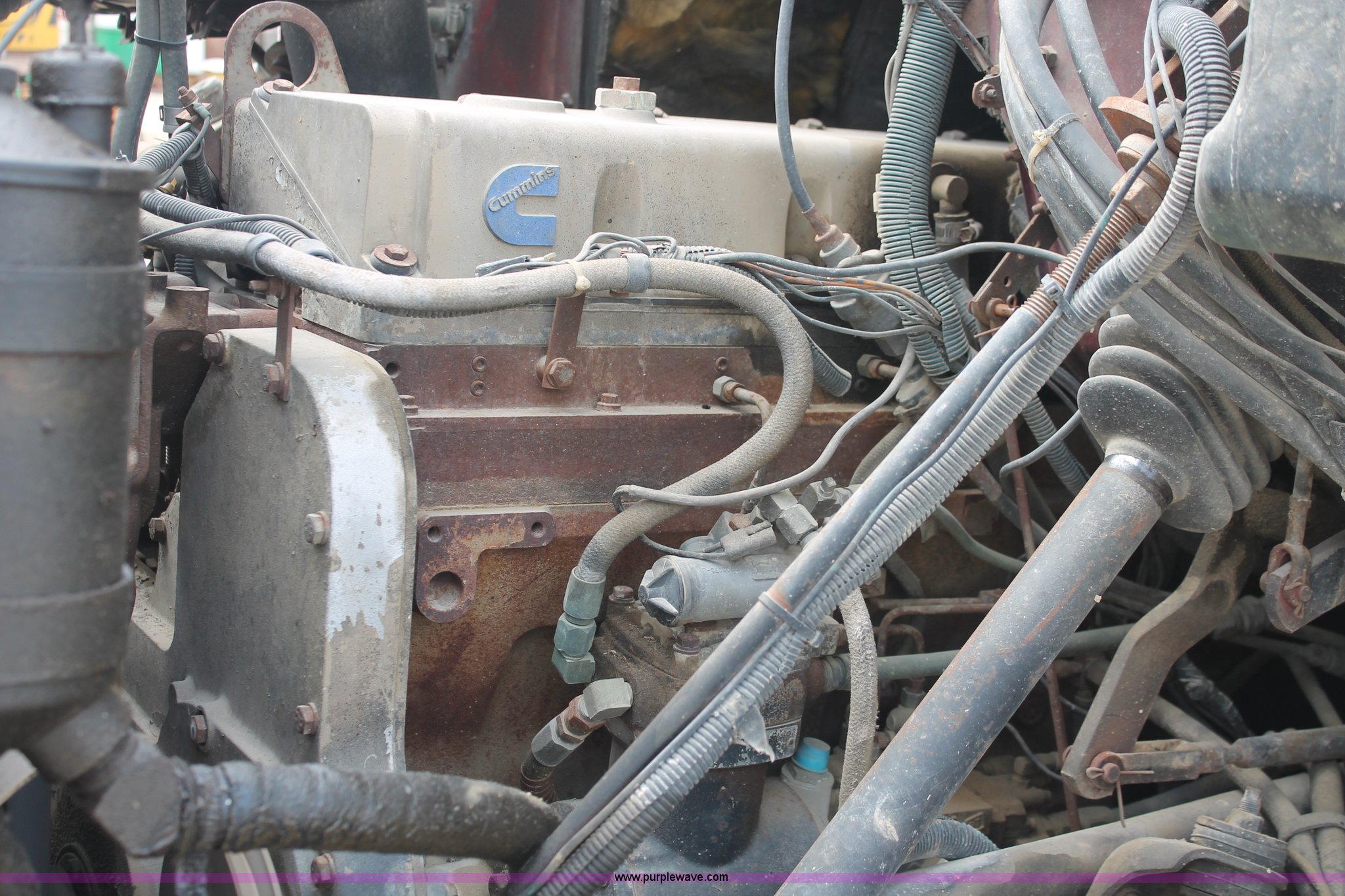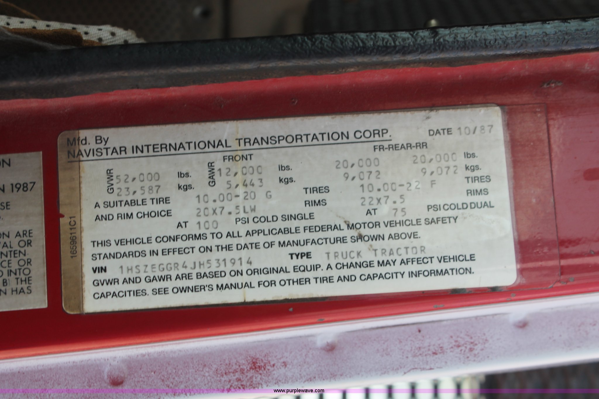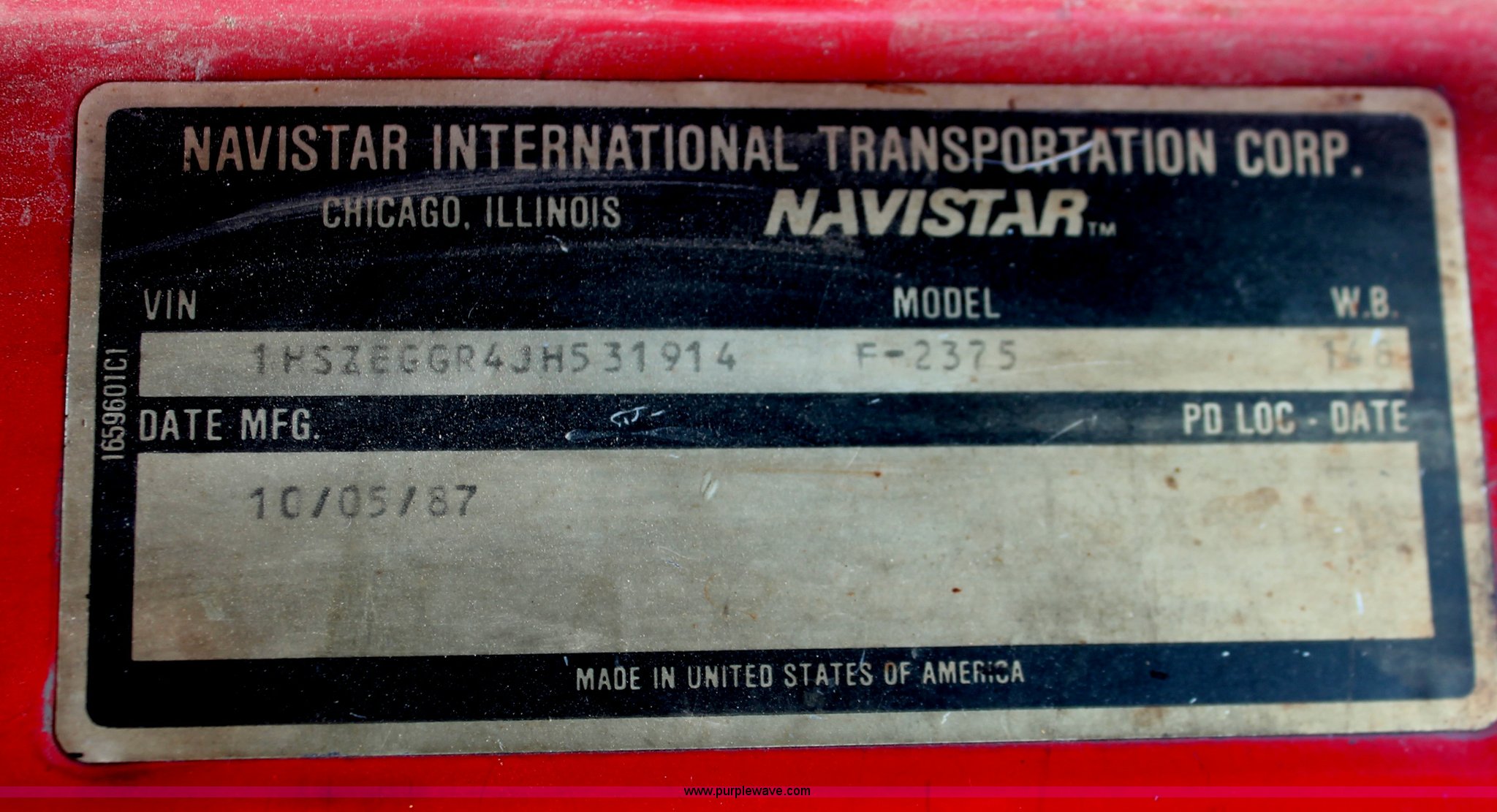 Purple Wave is selling a used Flat Bed Truck in Tennessee. This item is a 1988 International F-2375 flatbed water truck with the following: 101,291 miles on odometer, Cummins L10 10.0L L6 diesel engine, Manual transmission, Heat, Radius CB radio, 25'L x 96"W flatbed, 3,500 gallon poly tank, 60 gallon induction tank, 5.5 HP water pump, 3.5" plumbing, 3'H mess gate, Dual fuel tanks, Single rear exhaust stack, Pintle hitch, Trailer wiring, Spring suspension, Air brakes, 220" wheelbase, 295/75R22.5 tires, GVWR 52,000 lbs, FAWR 12,000 lbs, IAWR 20,000 lbs, RAWR 20,000 lbs, Windshield cracked, Unit# 51089