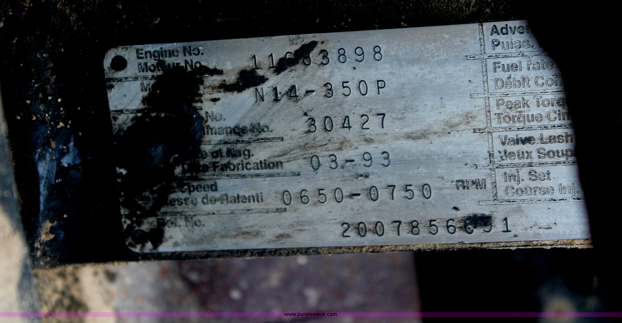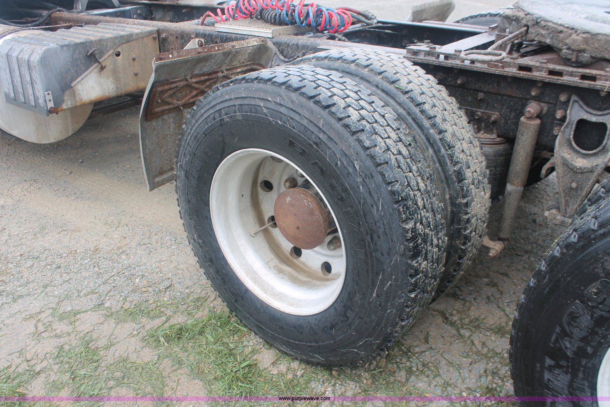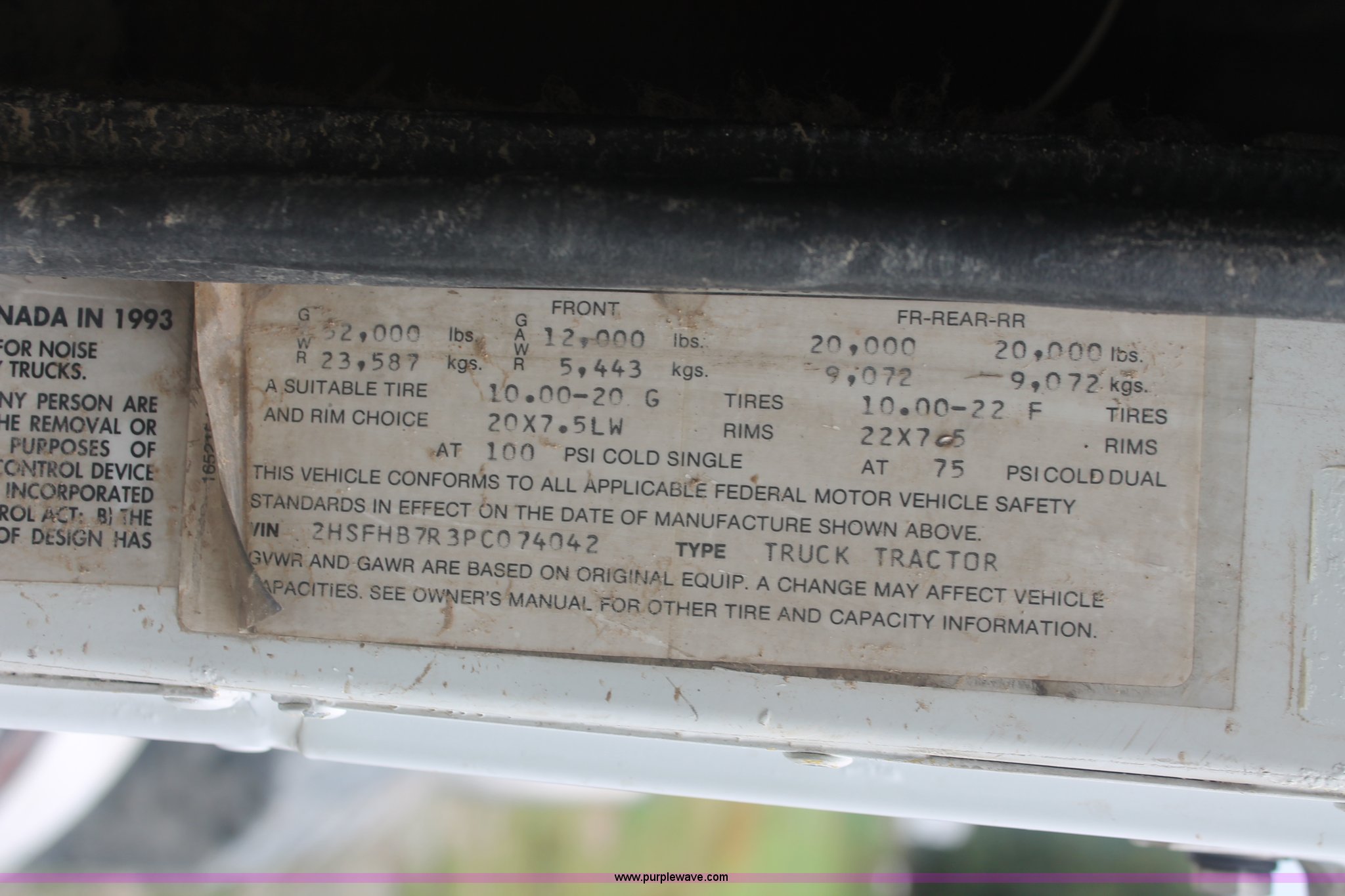 Purple Wave is selling a used Truck Tractor in Tennessee. This item is a 1993 International 9400 semi truck with the following: 839,360 miles on odometer, Cummins N14 14.0L L6 diesel engine, 350 HP, Serial 11683898, Eaton Fuller nine speed manual transmission, AC and heat, Air suspension seat, Passenger daylight door, Throttle lock, Exterior visor, Block heater, Dual fuel tanks, Stainless steel quarter fenders, Single rear exhaust stack, Aluminum deck plate, Fifth wheel lock, PTO, Dump valves, Air suspension, Air brakes, 211" wheelbase, Wheel and nut covers, 11R22.5 tires, GVWR 52,000 lbs, FAWR 12,000 lbs, IAWR 20,000 lbs, RAWR 20,000 lbs, Unit# 17937