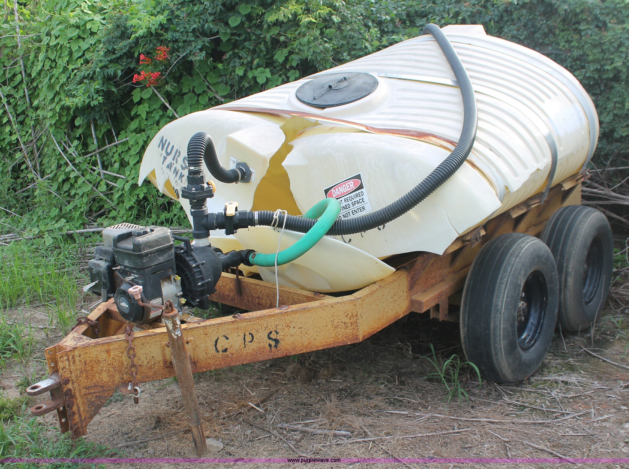 1,000 gallon liquid nurse trailer. Briggs & Stratton 5.5 HP gas engine, Poly tank, 2" plumbing, Shut-off valves, Height adjustable pin hitch, 11L-15 tires, Tank is cracked, Unit# 86240. Shipping quotes available. Crop Production Services - Lake Providence. 1015 Davis St. Lake Providence , LA 71254