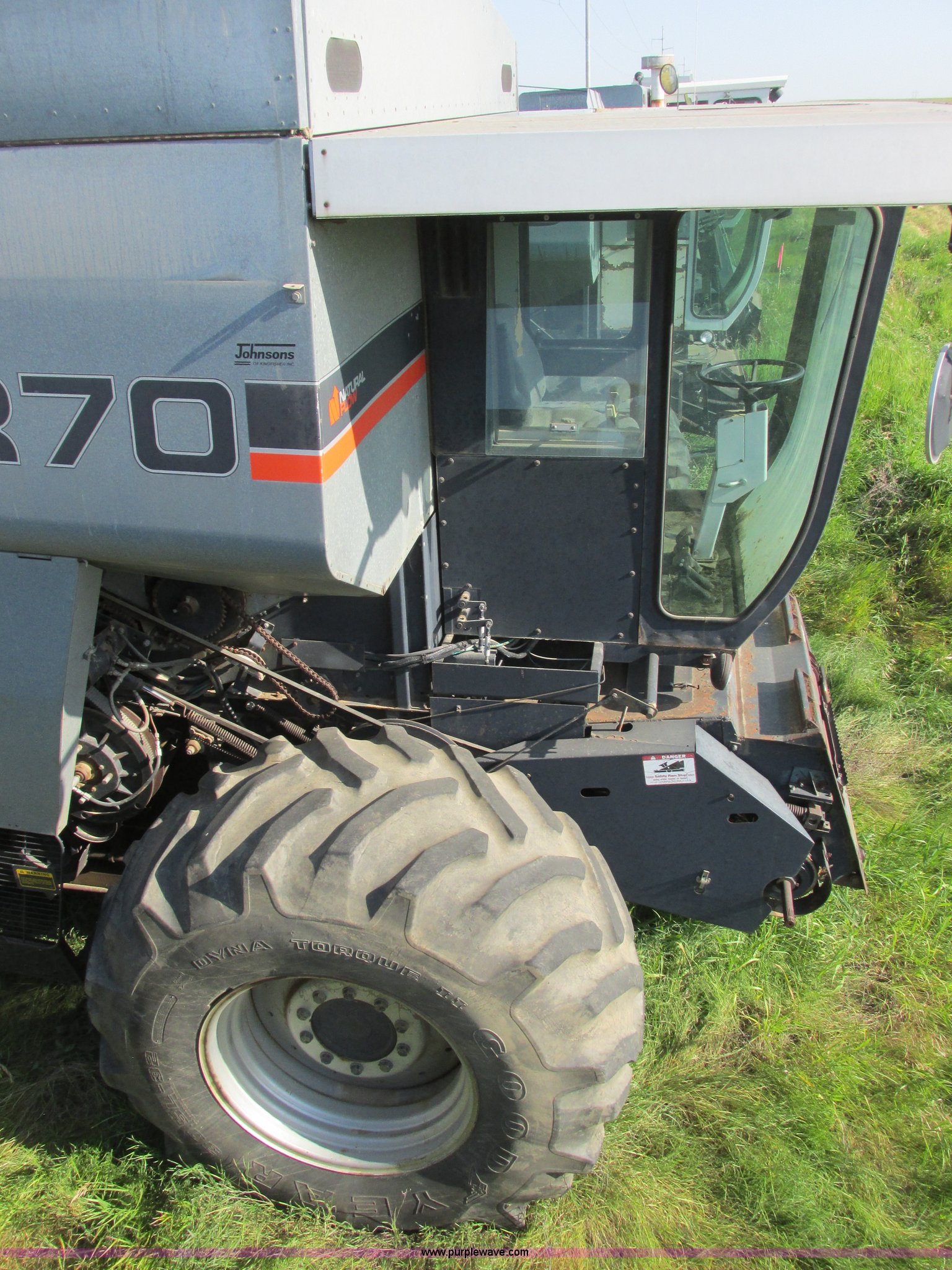 Purple Wave is selling a used Combine in North Dakota. This item is a 1991 Gleaner R70 combine with the following: 4,281 engine hours on meter, 2,517 separator hours on meter, Deutz eight cylinder air cooled diesel engine, 270 HP, Hydrostatic transmission, 4F-4R gears, AC and heat, AM/FM/cassette, Spring suspension seat, Tilt steering wheel, 310 bushel bin capacity, Work lights, Straw spreader, Two speed rotor, Feeder house reverser, 30.5L-32 drive tires, 16.9-24 rear tires, Hydraulic leak developed near hydrostat, will be repaired prior to auction, Serial R70G012825H9191