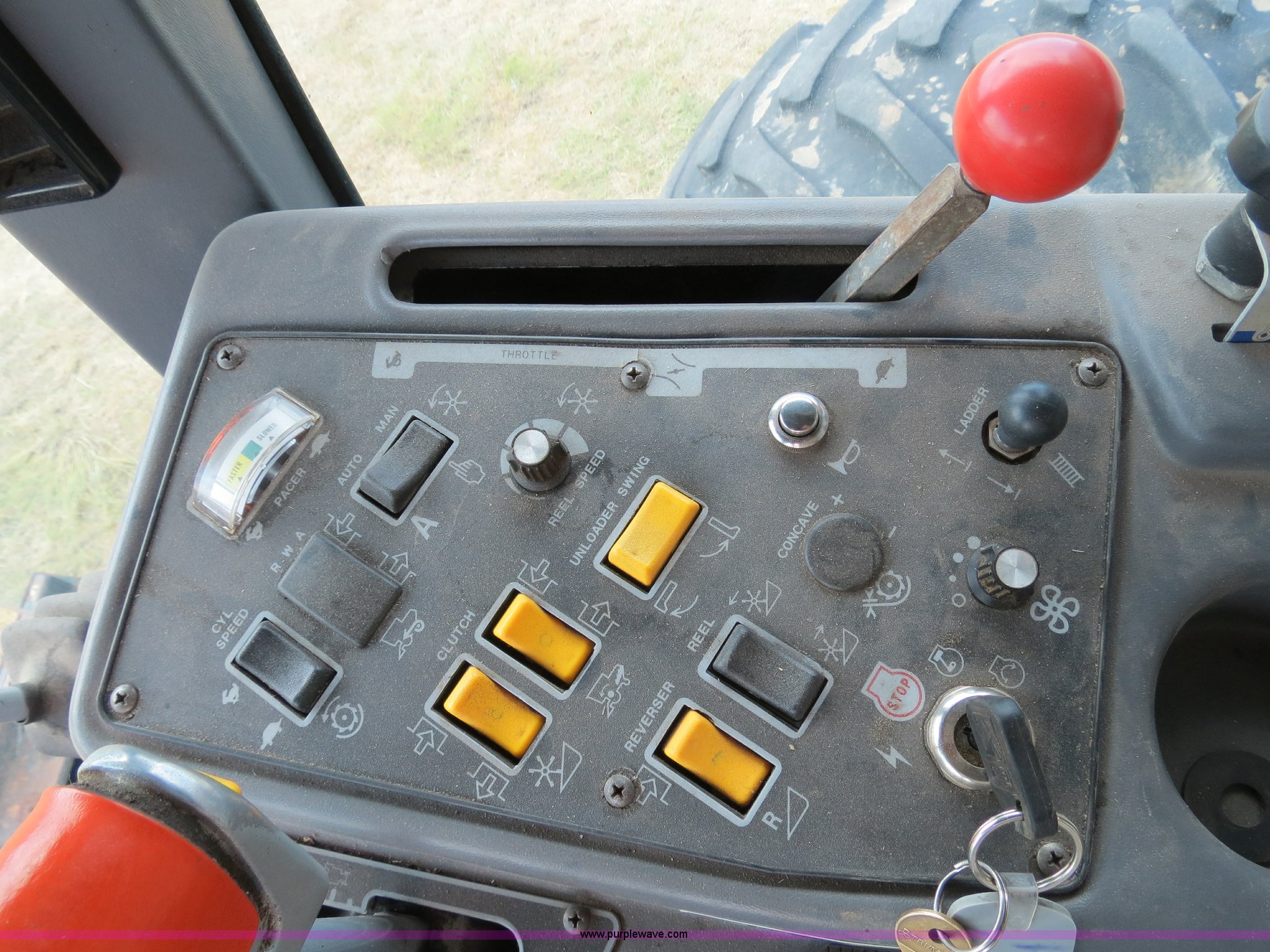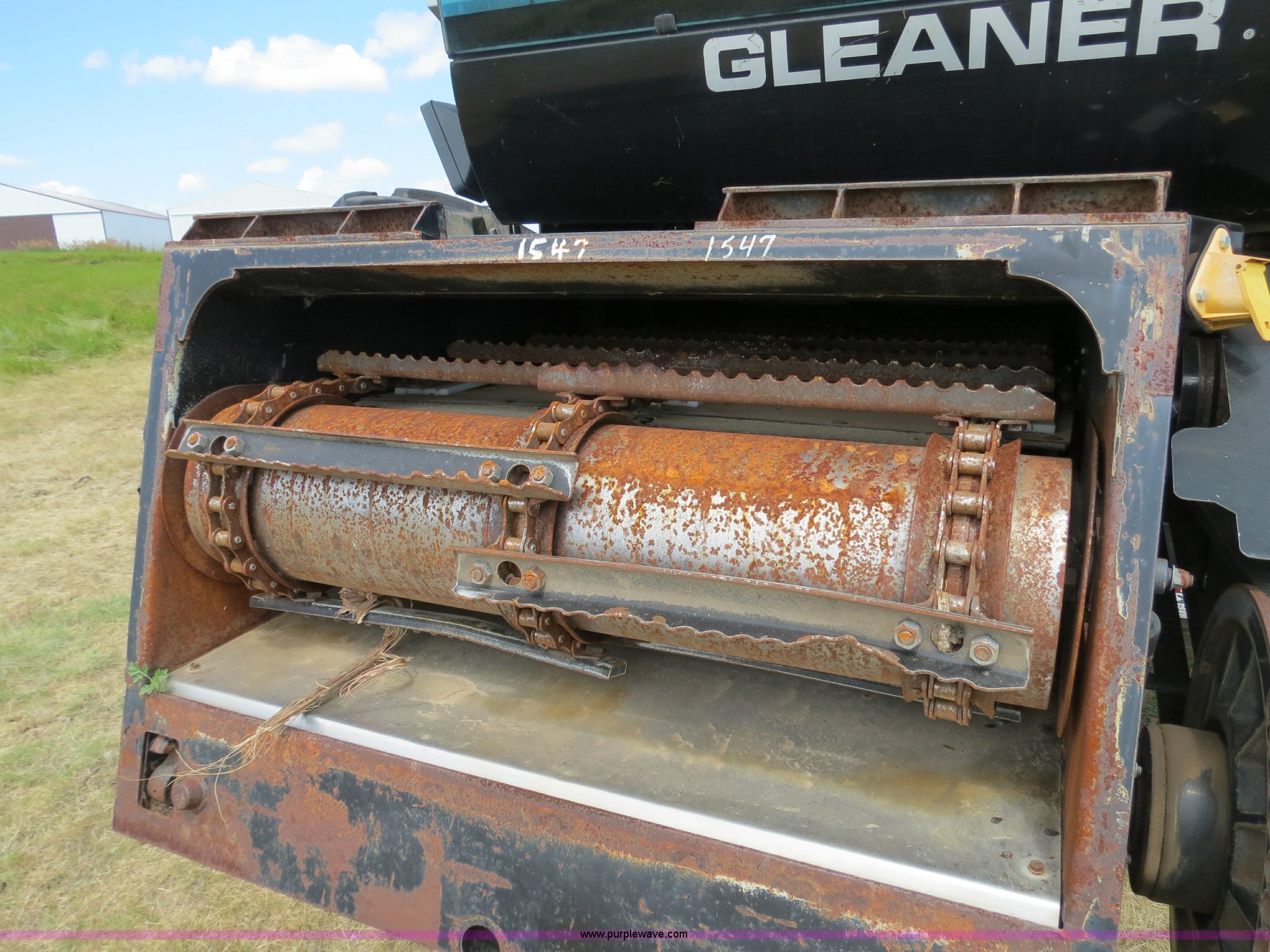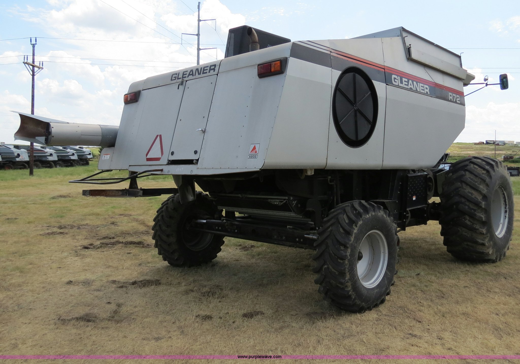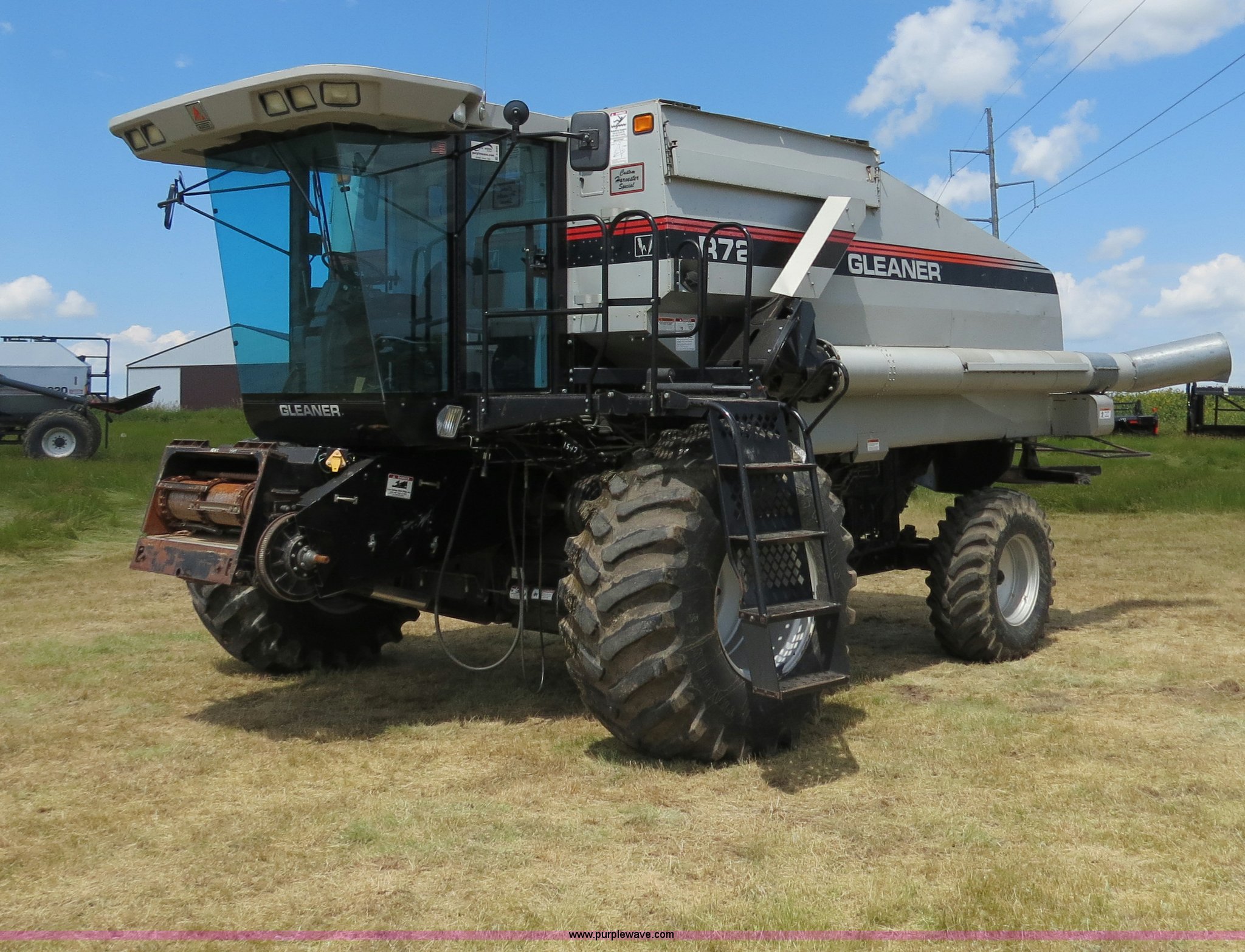 Purple Wave is selling a used Combine in North Dakota. This item is a 1999 Gleaner R72 combine with the following: 2,918 engine hours on meter, 2,107 separator hours on meter, Cummins M11-A six cylinder diesel engine, 330 HP, Hydrostatic transmission, 4F-4R gears, AC and heat, AM/FM/cassette/weatherband, Spring suspension seat, Instructor's seat, Header control system, Auto header height control, Hydraulic ladder, 330 bushel bin capacity, Straw chopper, Firestone Super all traction tires, 30.5L-32 drive tires, 16.9-24 rear tires, Serial R7279017