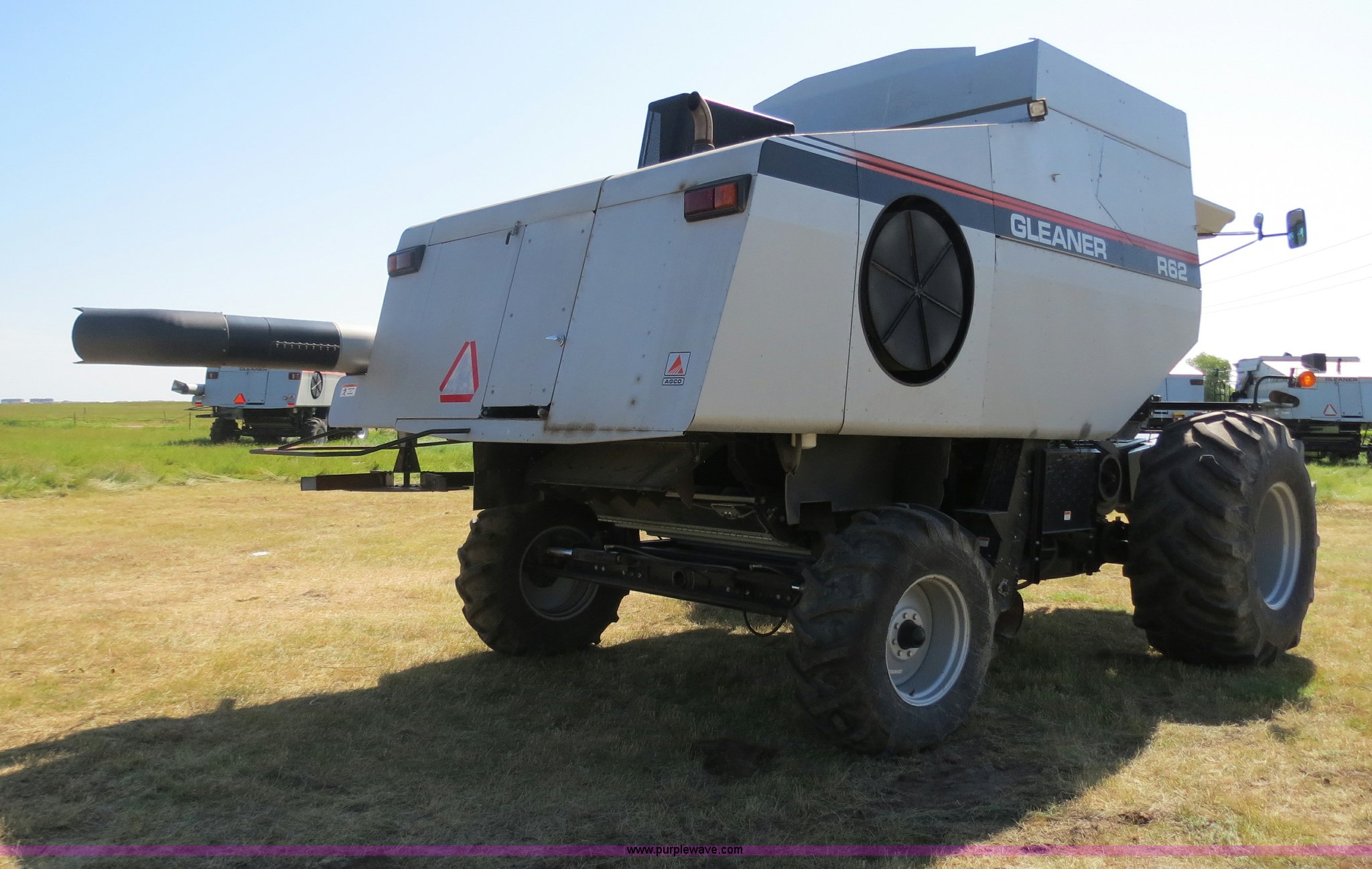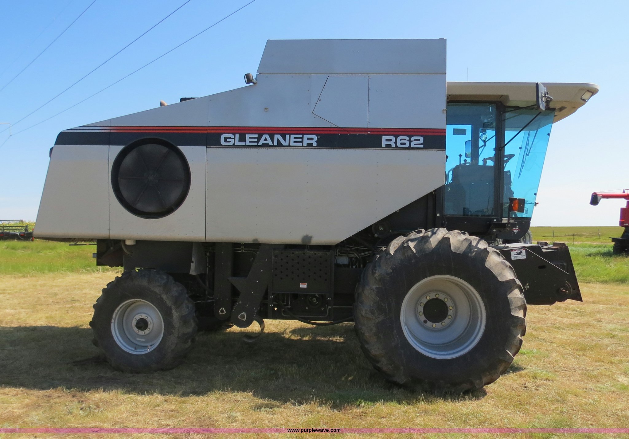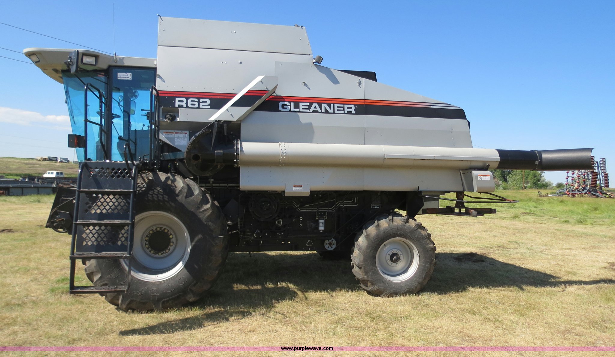 Purple Wave is selling a used Combine in North Dakota. This item is a 1998 Gleaner R62 combine with the following: Hour meter nonoperational, Last reported approx 3,950 engine hours, Last reported approx 3,100 separator hours, Cummins six cylinder diesel engine, Model C-8.3-A, 285 HP, Serial 5580846, Hydrostatic transmission, 4F-4R gears, AC and heat, AM/FM, Spring suspension seat, Tilt steering wheel, Instructor's seat, Bin extension, 300 bushel bin capacity, Work lights, Two speed rotor, Feeder house reverser, Straw spreader, 30.5-32 drive tires, 16.9-24 rear tires, 3,848 hours on meter in Feb 2012, Serial R6268134