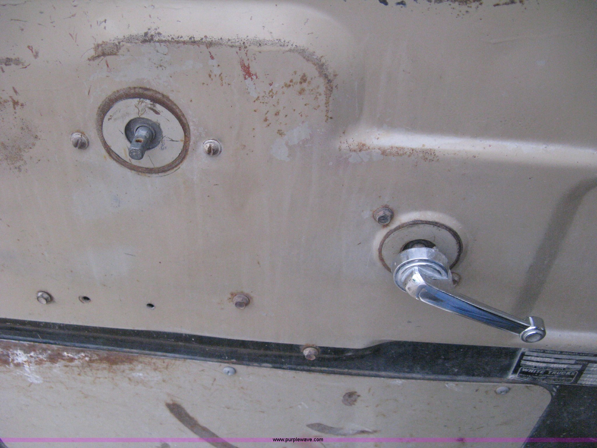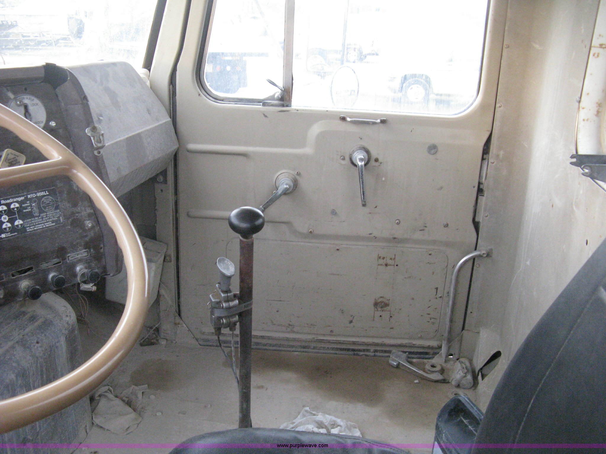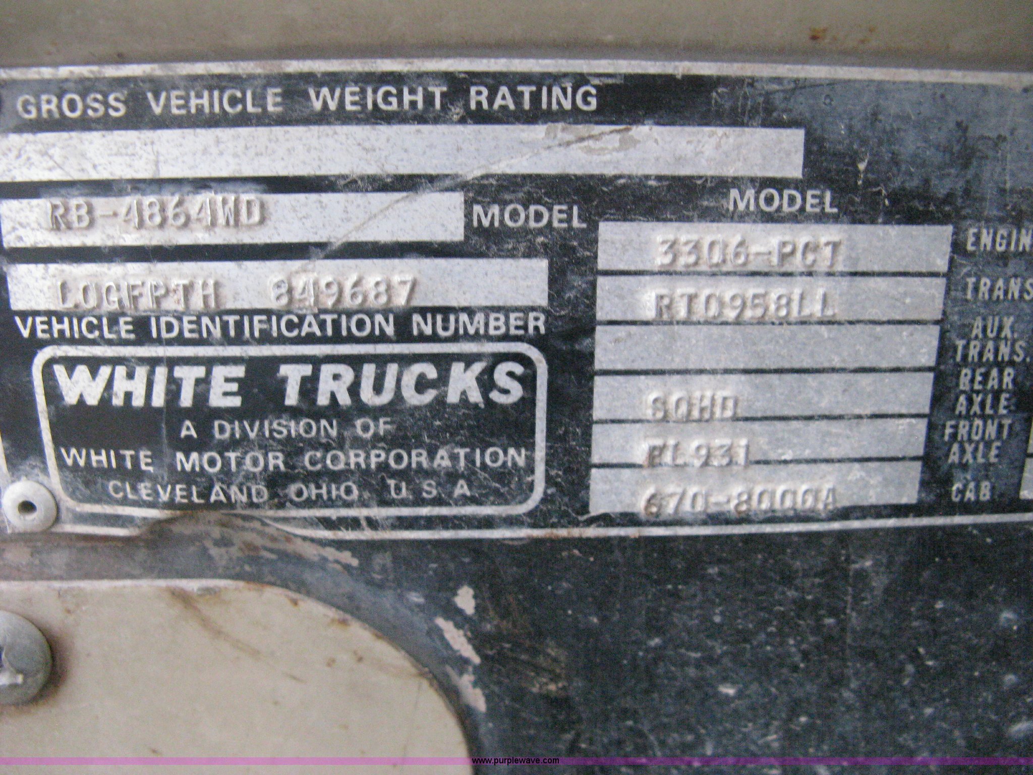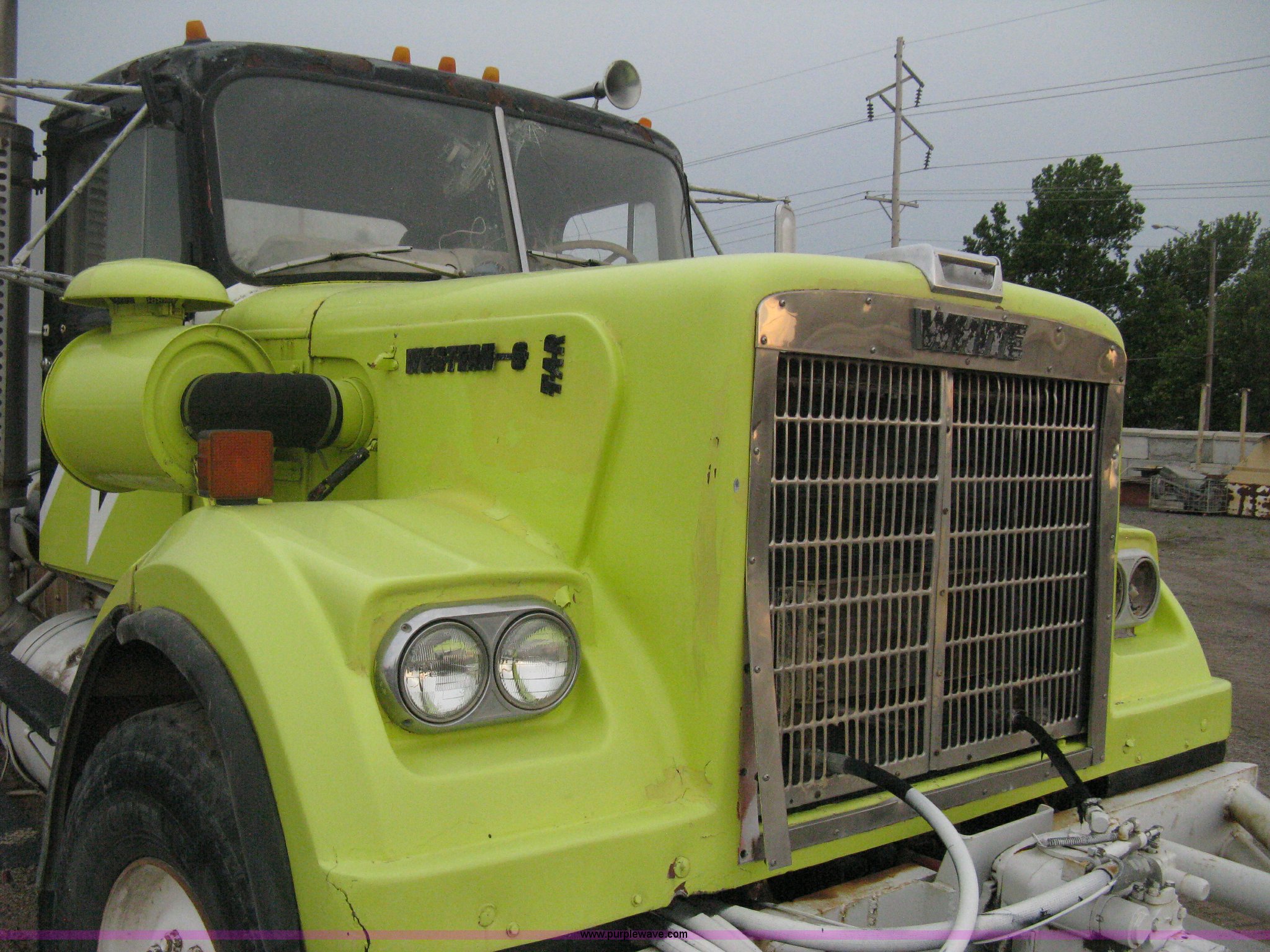 Purple Wave is selling a used Tank Truck or Water Truck in Kansas. This item is a 1977 White Western Star water tanker truck with the following: 432,997 miles on odometer, Not Actual Mileage, 2,233 hours on meter, 3306-PC7 diesel engine, Eaton Fuller RT0-958LL eight speed manual transmission, Deep reduction, Full screw, Heat, Air suspension seat, Single fuel tank, Single rear exhaust stack, PTO, Rear tow bumper, Air suspension, Air brakes, 236" wheelbase, 425/65R22.5 front tires, 295/75R22.5 rear tires, Interior/exterior cosmetic damage, Windshield cracked, Passenger side door handle missing, Driver's side window is rolled down, Will not raise, Brakes need work, Unit# 48.629
