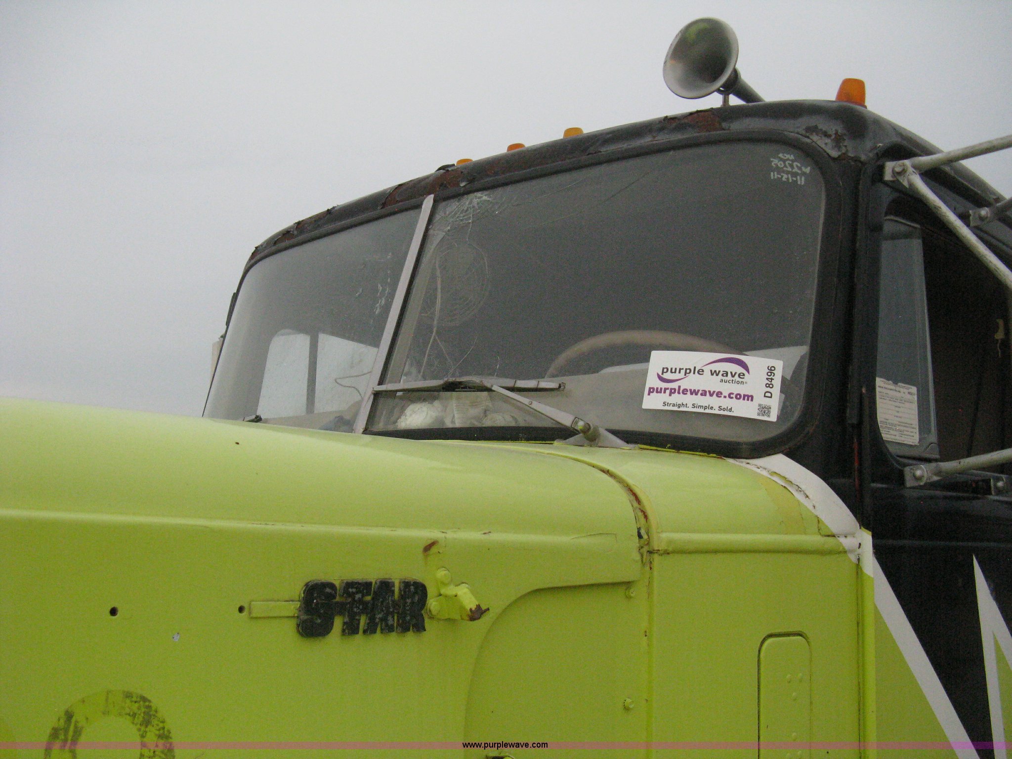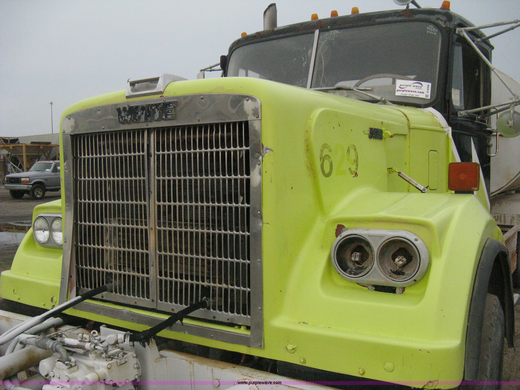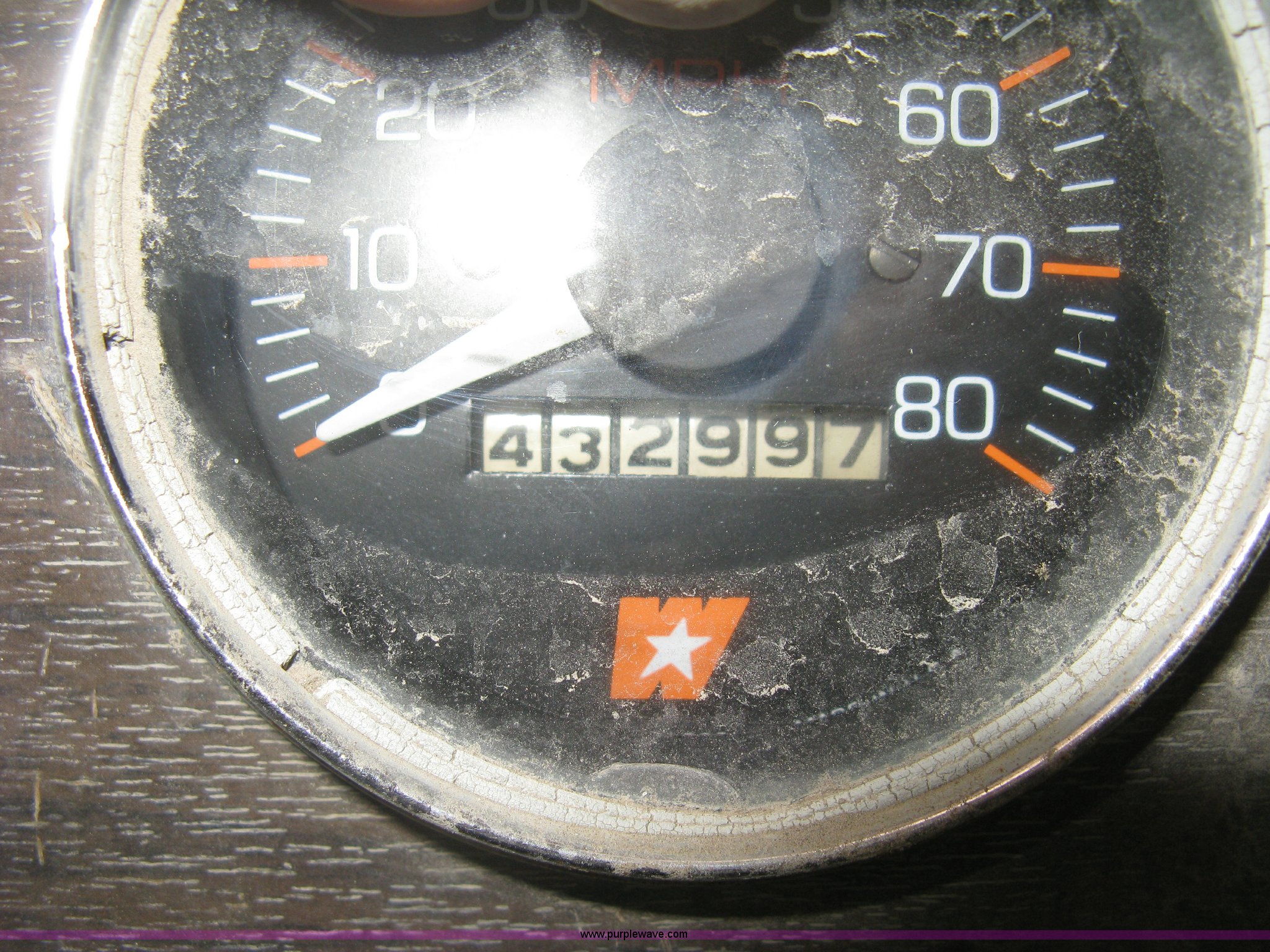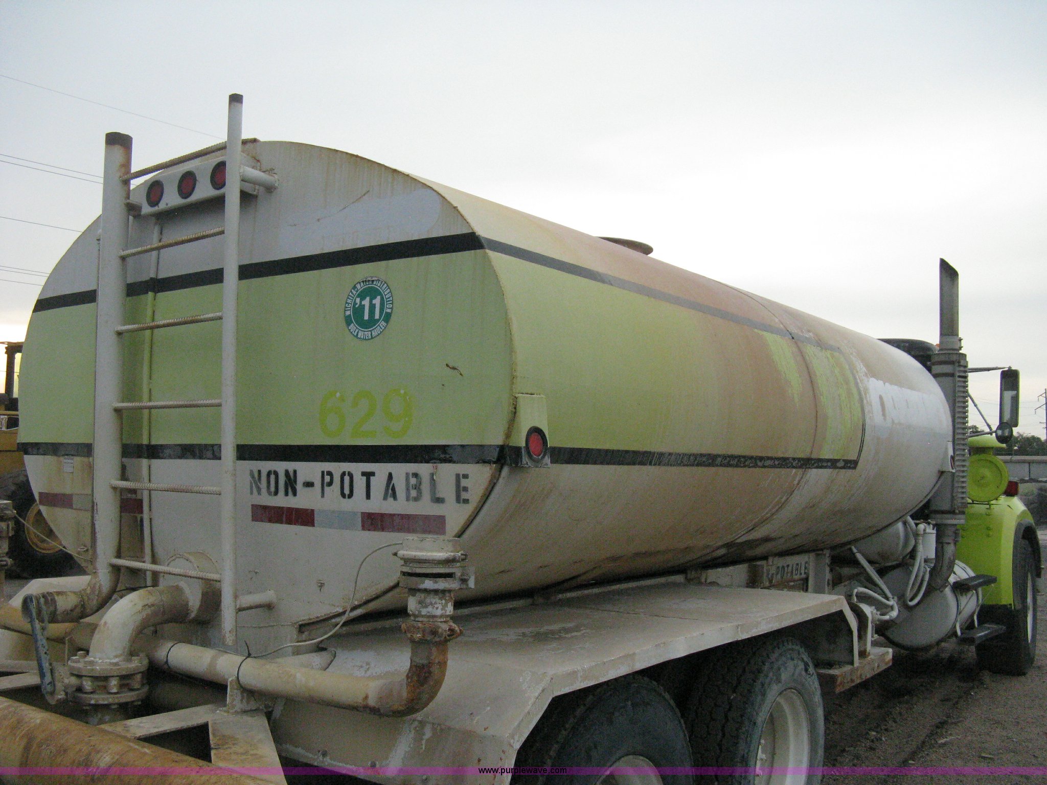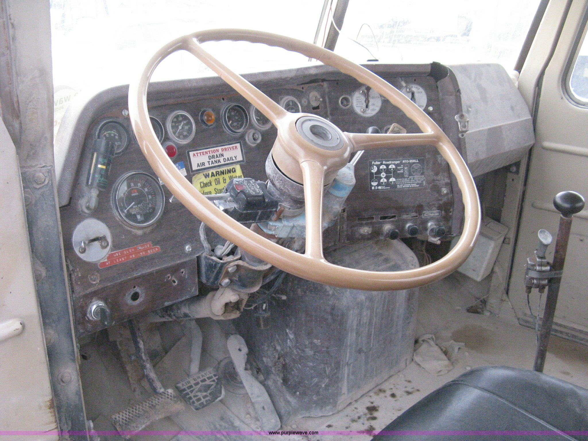 Purple Wave is selling a used Tank Truck or Water Truck in Kansas. This item is a 1977 White Western Star water tanker truck with the following: 432,997 miles on odometer, Not Actual Mileage, 2,233 hours on meter, 3306-PC7 diesel engine, Eaton Fuller RT0-958LL eight speed manual transmission, Deep reduction, Full screw, Heat, Air suspension seat, Single fuel tank, Single rear exhaust stack, PTO, Rear tow bumper, Air suspension, Air brakes, 236" wheelbase, 425/65R22.5 front tires, 295/75R22.5 rear tires, Interior/exterior cosmetic damage, Windshield cracked, Passenger side door handle missing, Driver's side window is rolled down, Will not raise, Brakes need work, Unit# 48.629