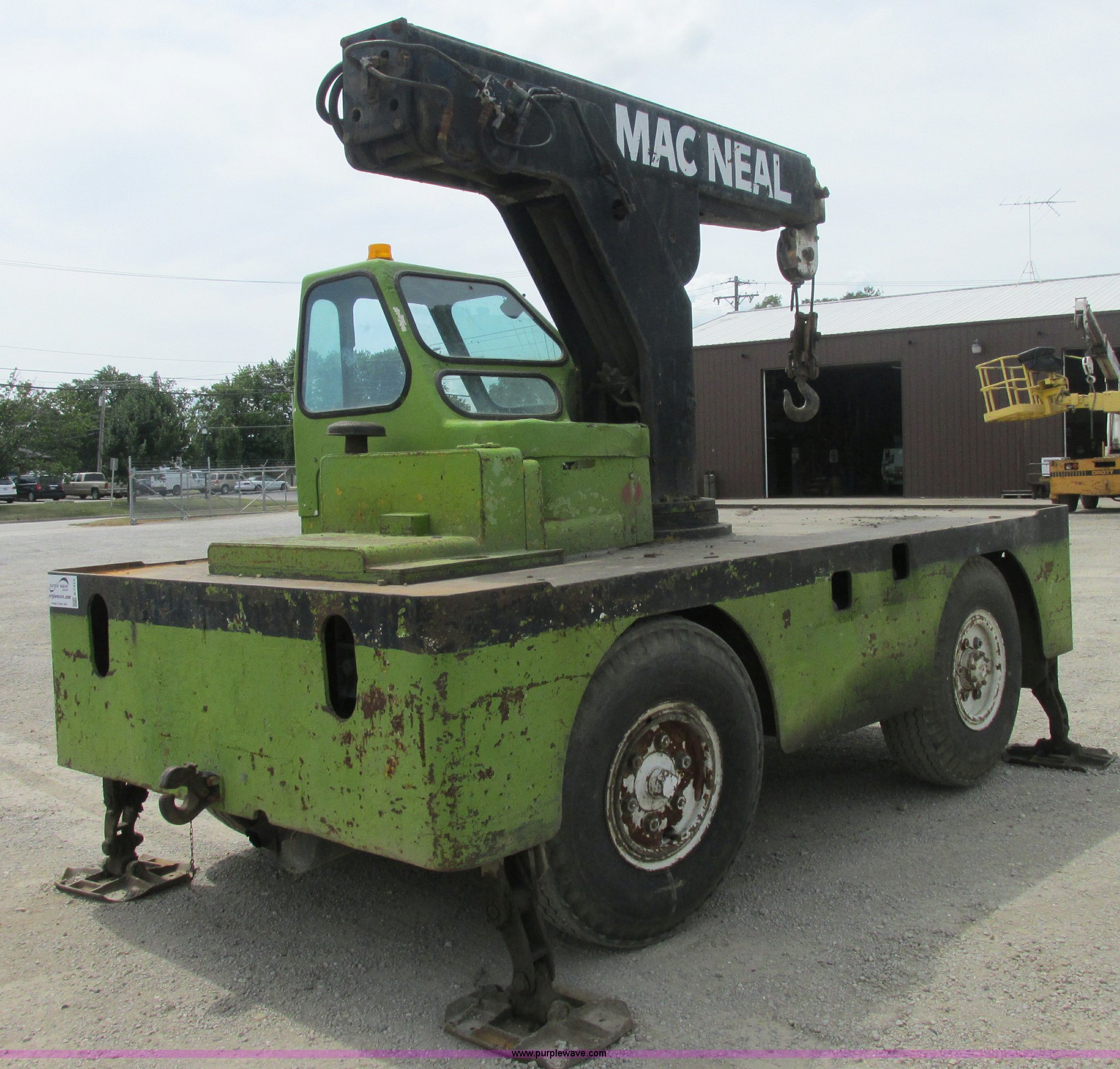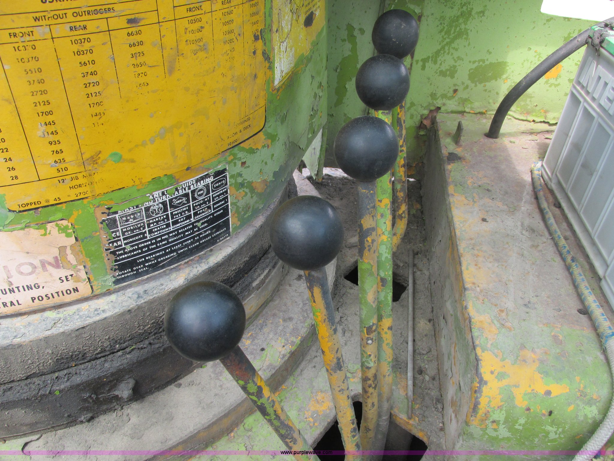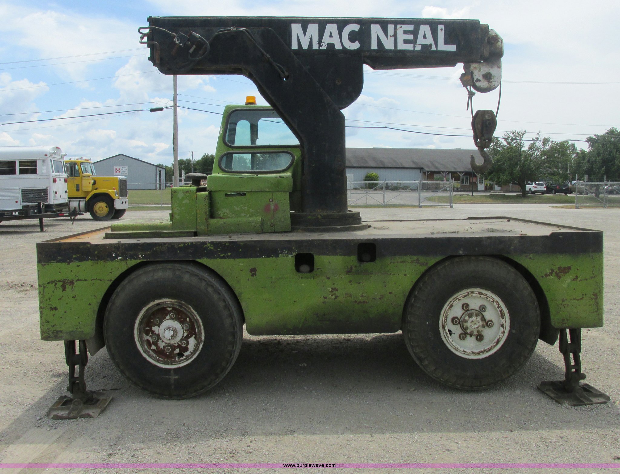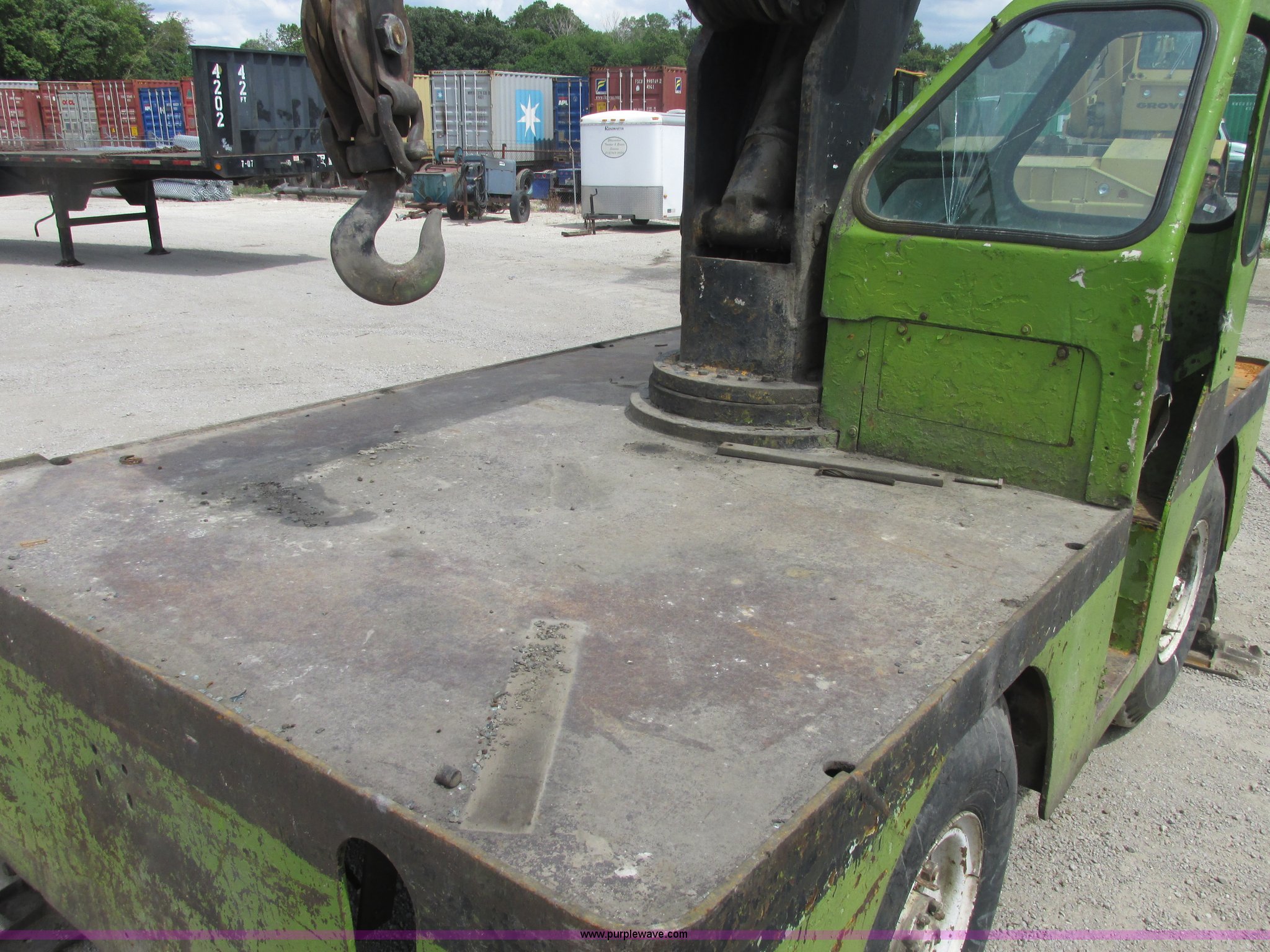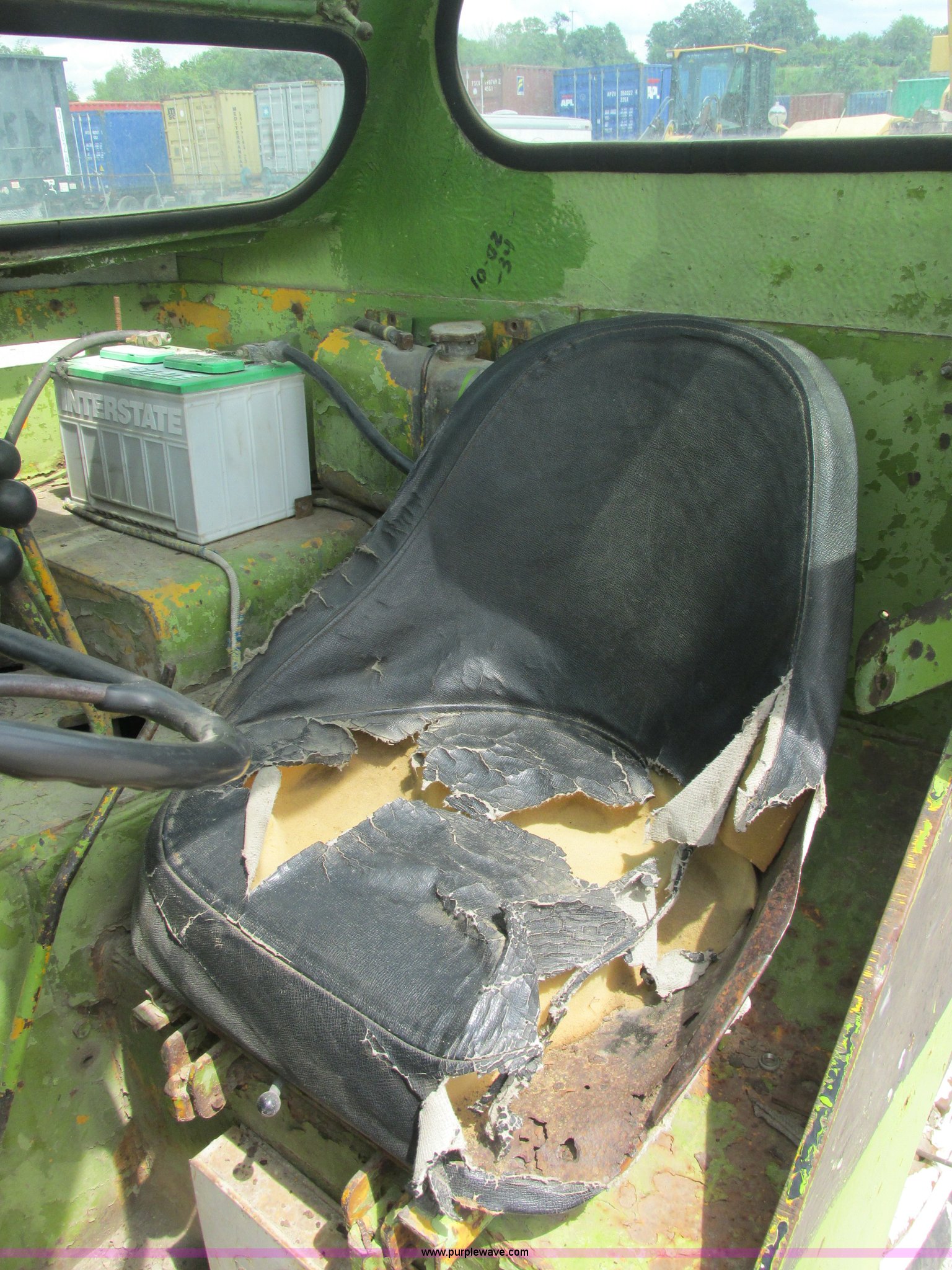 Purple Wave is selling a used Carry Deck Crane in Illinois. This item is a Drott 85RM2 carry deck crane with the following: 2,488 hours on meter, Diesel engine, Three speed transmission, Work platform, 28' maximum reach, Hook and shive, (4) hydraulic outriggers, Rear exhaust, Strobe light, Pin hitch, 9.00 x 15 tires, Windshield cracked, Minor engine leaks, Serial 1584