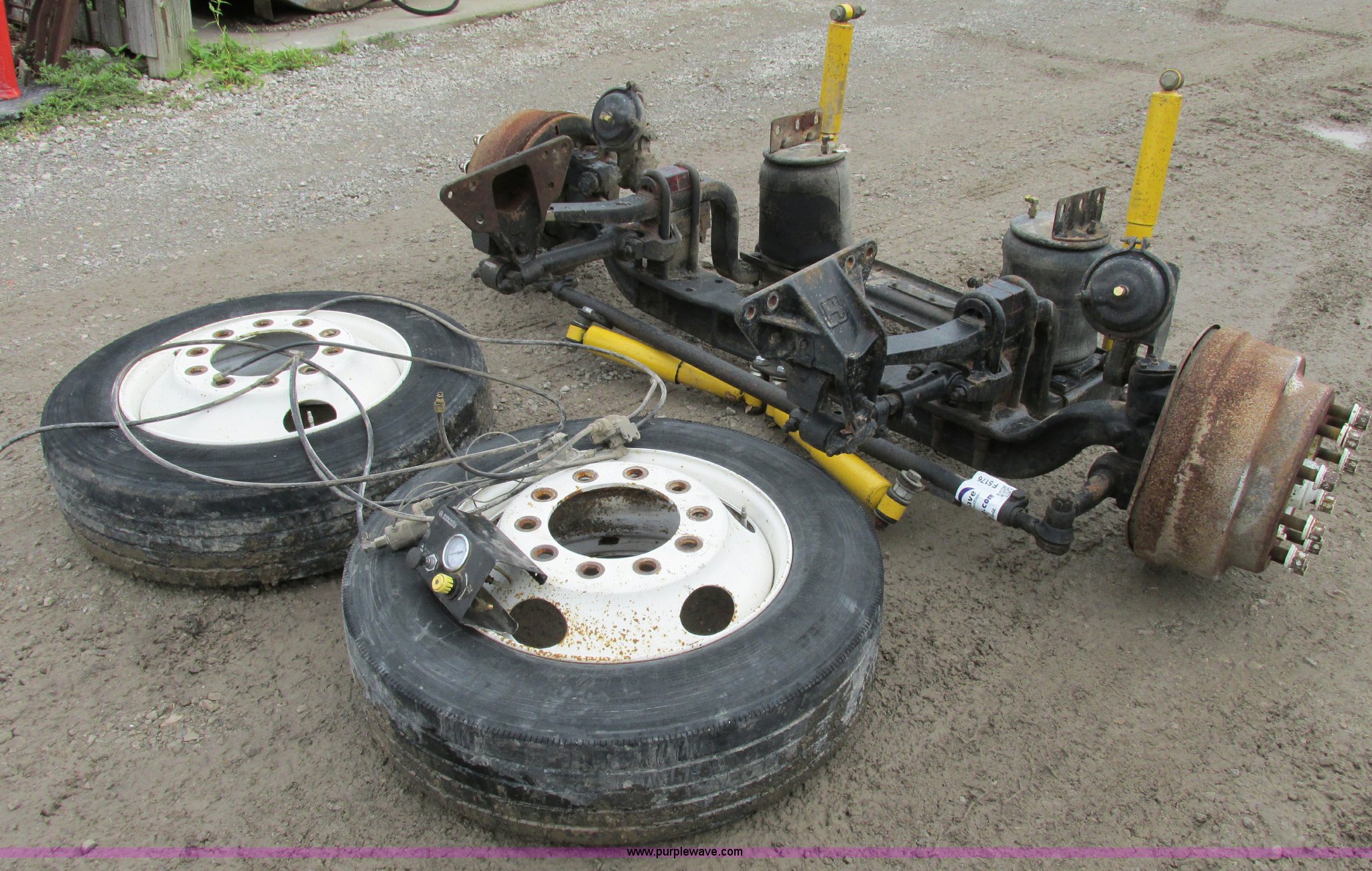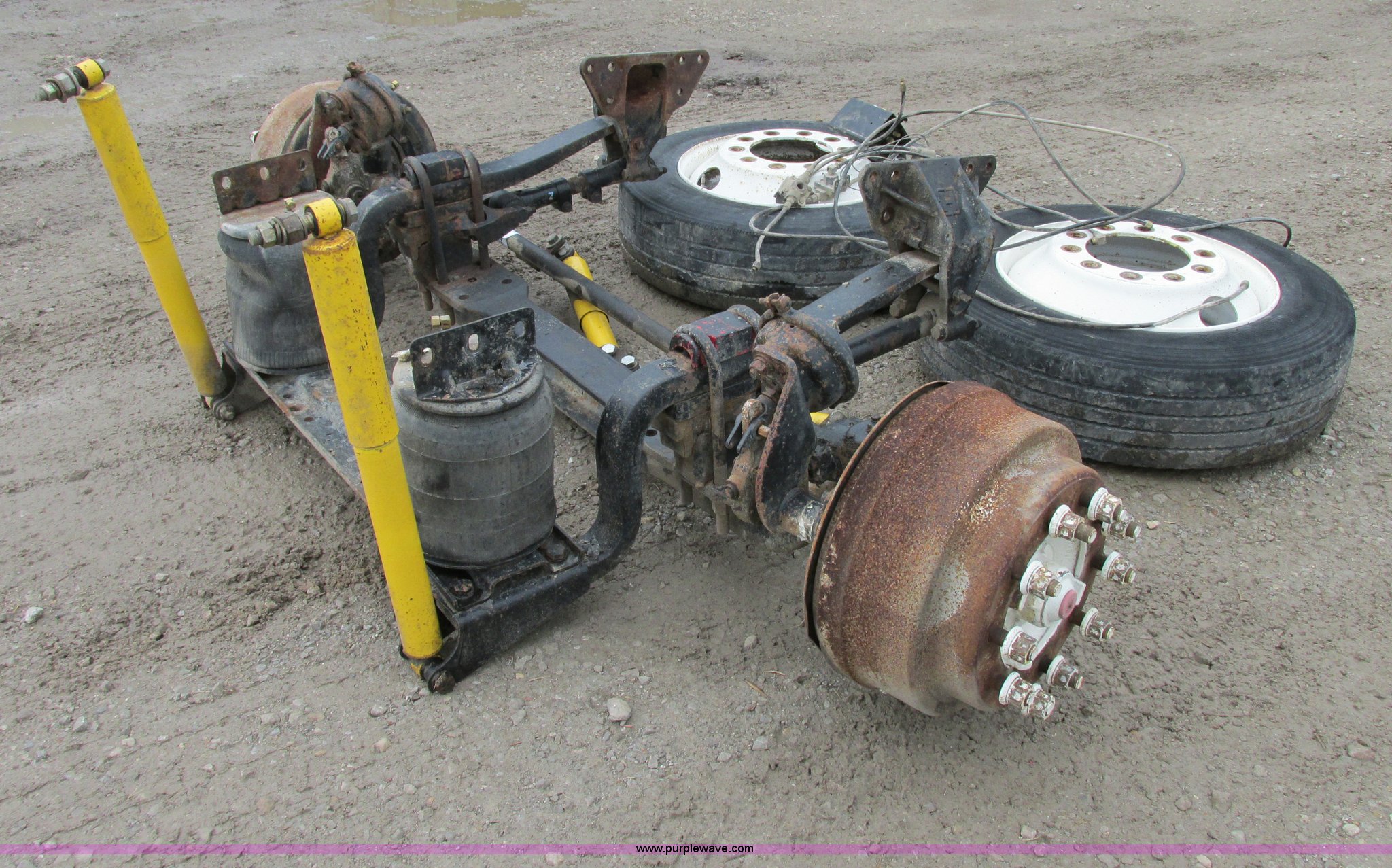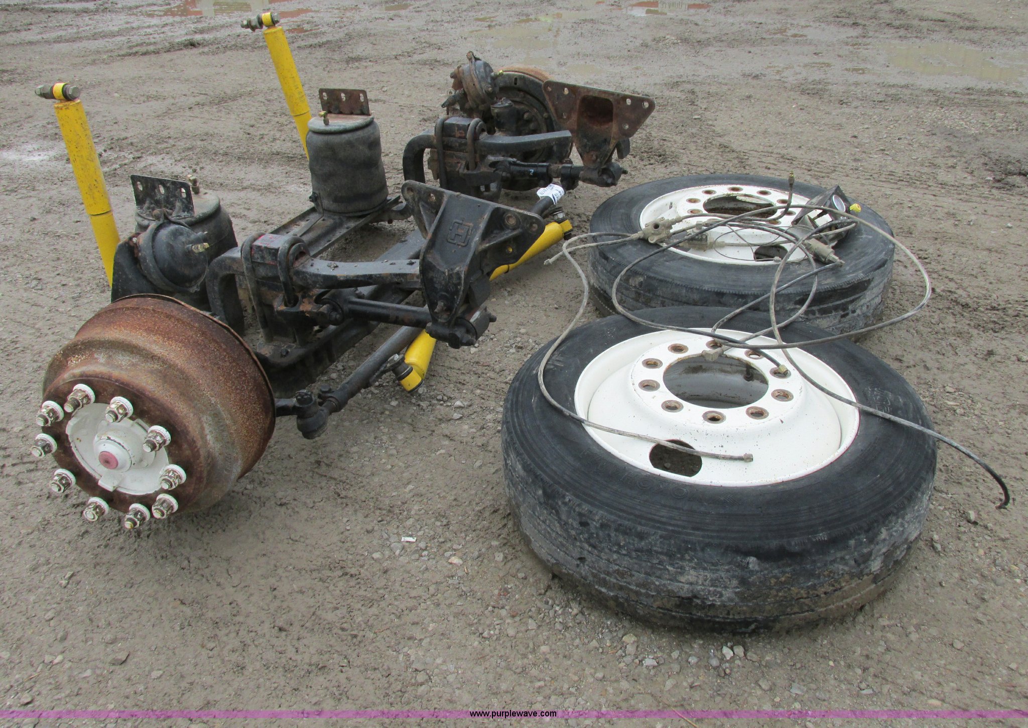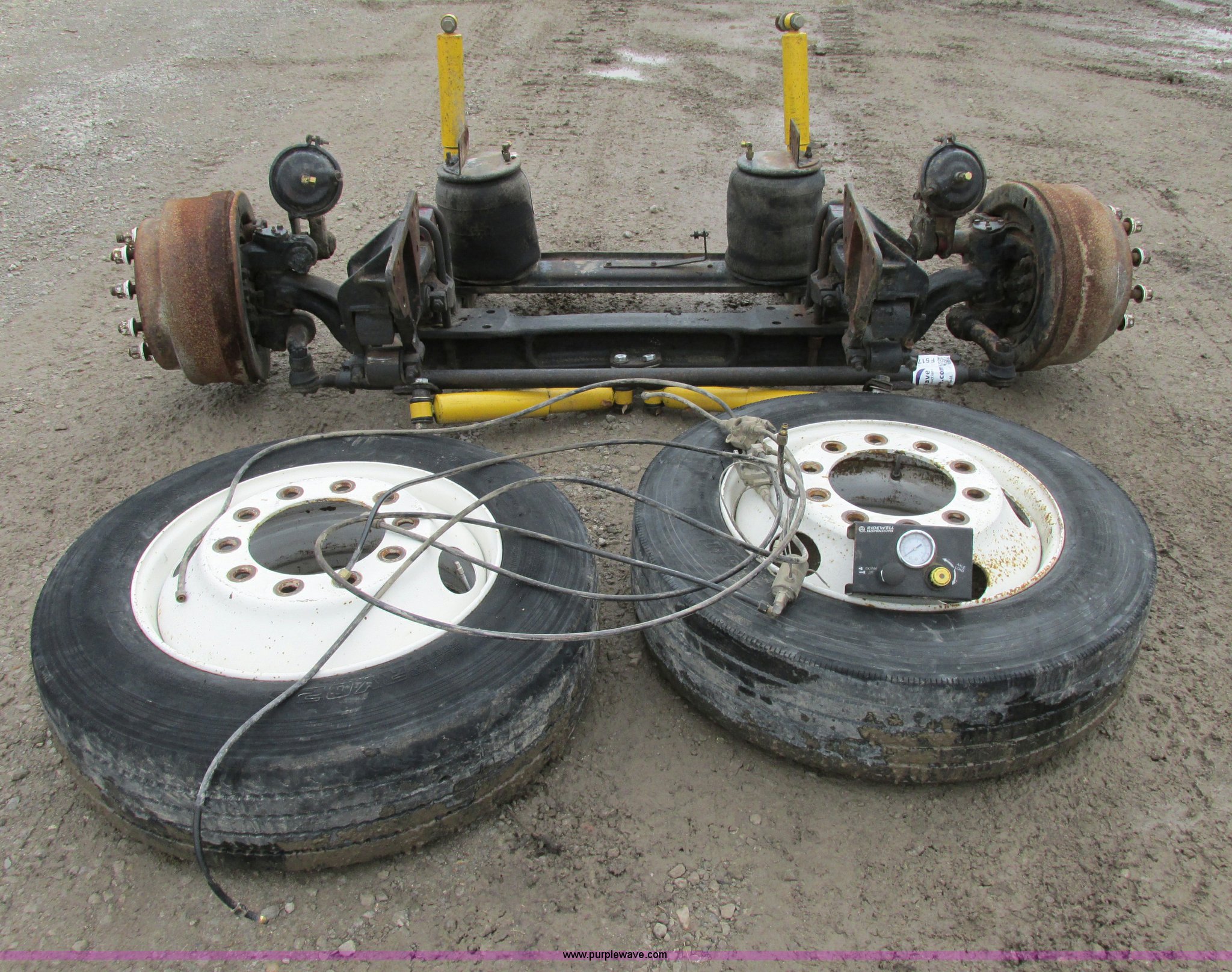 Purple Wave is selling a used Automotive Parts or Acces. in Missouri. This item is a Steerable air tag axle with the following: Air bags included, Shocks, Lug nuts, 10 bolt wheels, Air lines, Gauge and valve, Steering stabilizer shocks, Brakes, Oil bath hubs, 225/70R22.5 tires