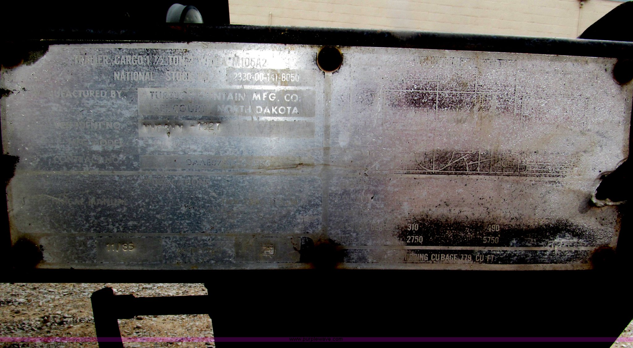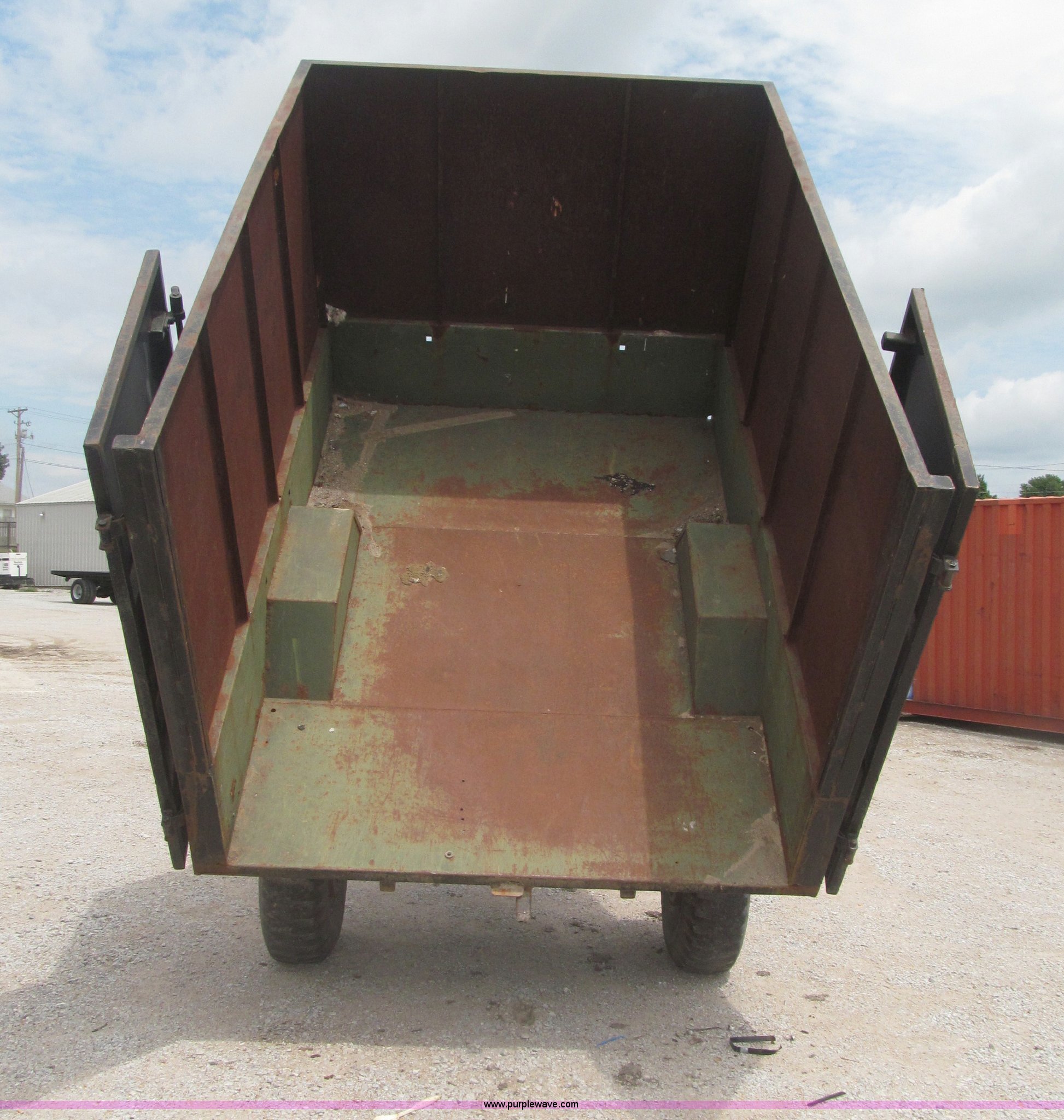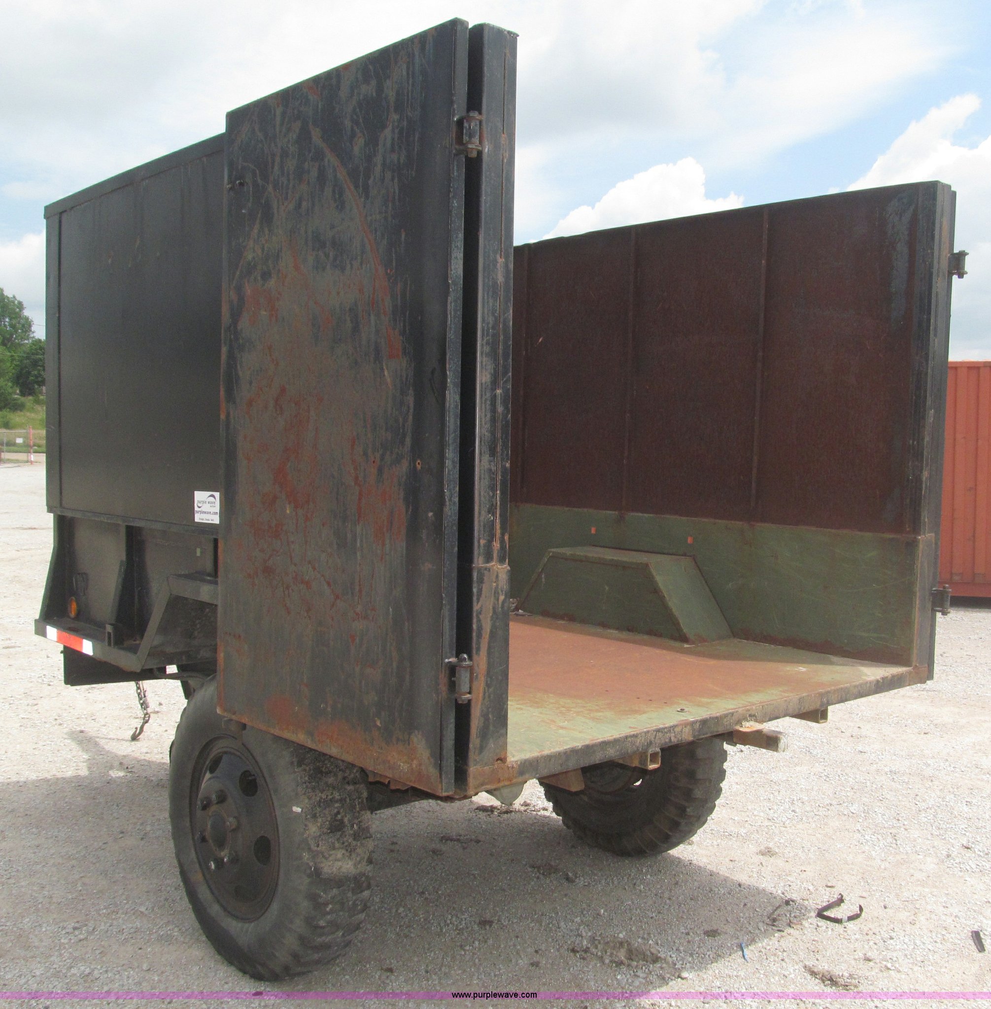Purple Wave is selling a used Dump Trailer in Nebraska. This item is a 1986 1.5 ton dump utility trailer with the following: Model M105A2, Approx. 15'L x 88"W x 105"H O.D. bed, 9'1 3/4"L x 74"W x 66 3/8"H I.D. bed, 53 5/8" I.D. between wheel wells, 6'L tongue, Remote control for hoist with 8'L cord, 24" x 16.5" box for hoist controls, Locking, Two swing door end gates, SPX 12V DC motor for hydraulic pump, D-ring tie downs, One missing, Tie down hooks, Front and side reflectors, DOT reflective tape, Individual front mounted manual brake levers, Six prong round light adaptor, Taillights, 2" ball hitch, Six hole steel wheels, 9.00-20 tires, GVWR 5,750 lbs, One safety chain missing
