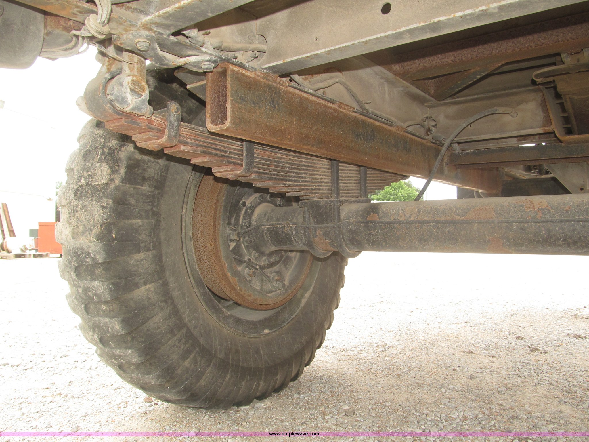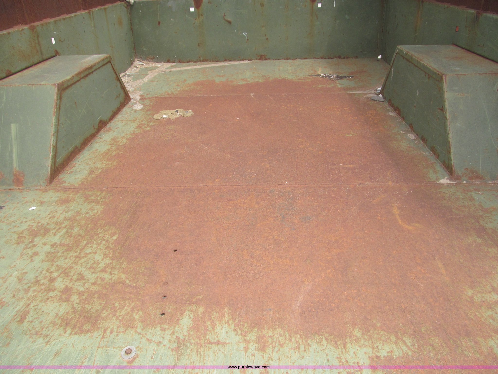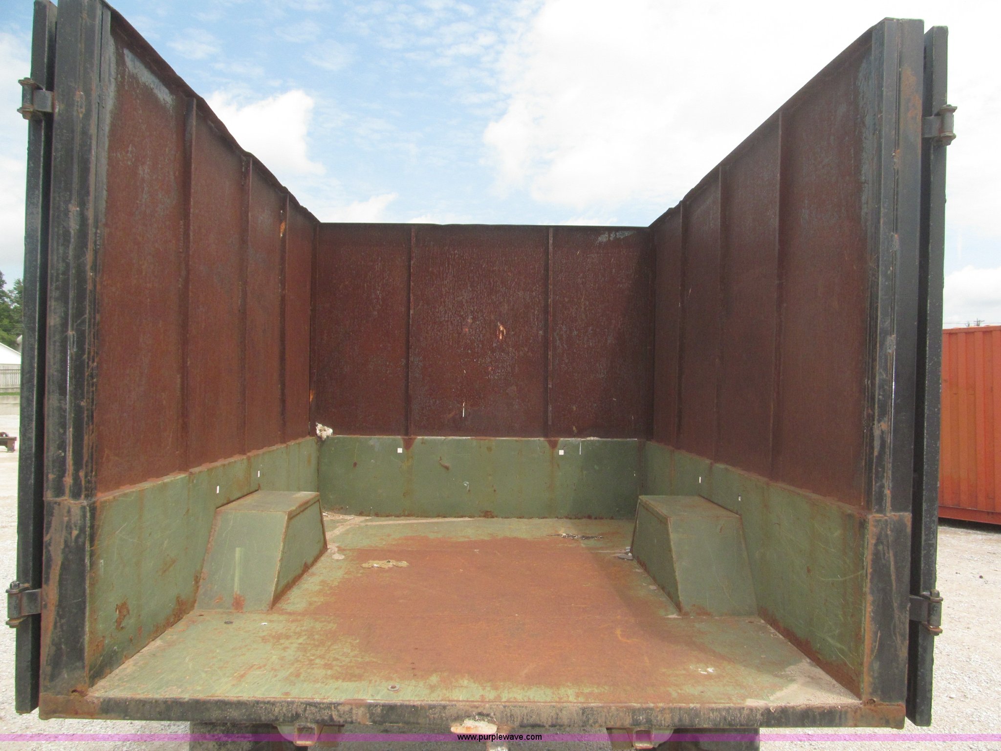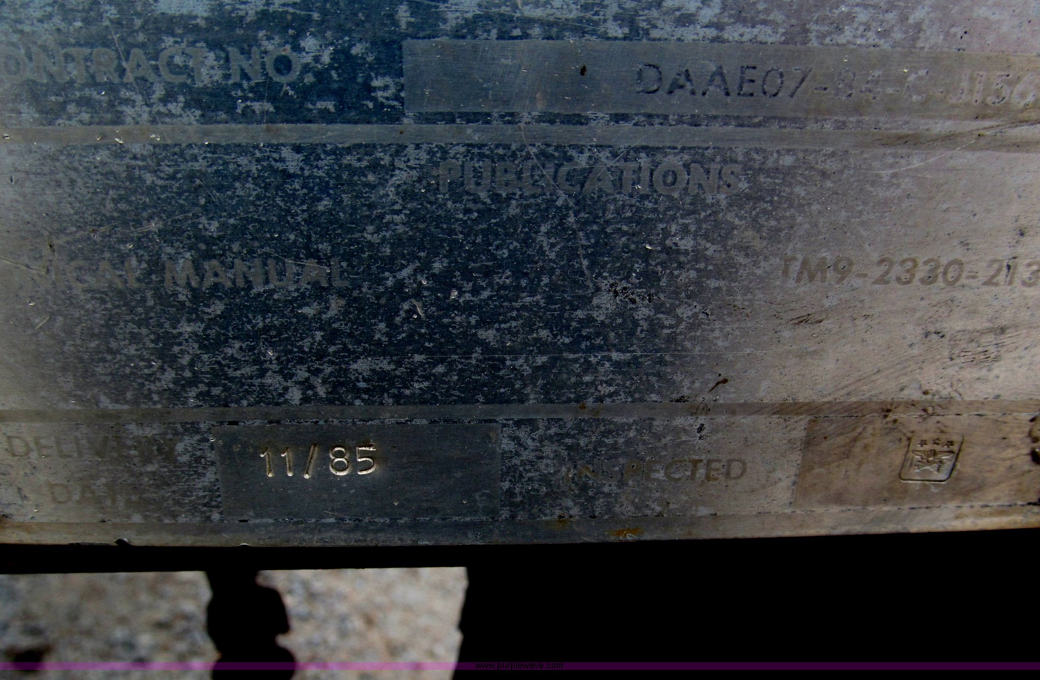 Purple Wave is selling a used Dump Trailer in Nebraska. This item is a 1986 1.5 ton dump utility trailer with the following: Model M105A2, Approx. 15'L x 88"W x 105"H O.D. bed, 9'1 3/4"L x 74"W x 66 3/8"H I.D. bed, 53 5/8" I.D. between wheel wells, 6'L tongue, Remote control for hoist with 8'L cord, 24" x 16.5" box for hoist controls, Locking, Two swing door end gates, SPX 12V DC motor for hydraulic pump, D-ring tie downs, One missing, Tie down hooks, Front and side reflectors, DOT reflective tape, Individual front mounted manual brake levers, Six prong round light adaptor, Taillights, 2" ball hitch, Six hole steel wheels, 9.00-20 tires, GVWR 5,750 lbs, One safety chain missing