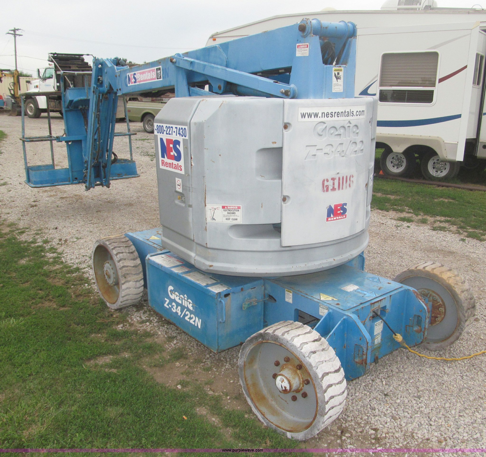 Purple Wave is selling a used Boom Lift in Nebraska. This item is a 1999 Genie Z34/22N narrow electric boom lift with the following: 2,949 hours on meter, 40' max working height, 34' max platform height, 22' max horizontal reach, 56'W x 30" x 43.5" operator basket, 110V rear mounted battery charger, Ground and platform controls, (8) Rayovac Ultra Pro batteries, 6'7" transport height, Two person or 500 lbs platform capacity, Zero degree max incline elevated, 28 mph max allowable speed during use, 150 lbs max allowable side force on platform, Safety decals, Platform tie offs, Self-closing entry bar, Joystick/toggle switch controls, Chassis tie downs, Approx. 57 3/4" overall width, Auxiliary power, 115V, 15 amp power to basket outlet, Slight cord damage, Foot pedal safety switch, Jib extension, Basket rotate, Non-marking tires, 11,500 lbs. base operating weight, No operators manual, One battery lid missing, Damaged platform toe board, Ground controls not operating, except through auxiliary function, Serial 1939, Unit# GI1116