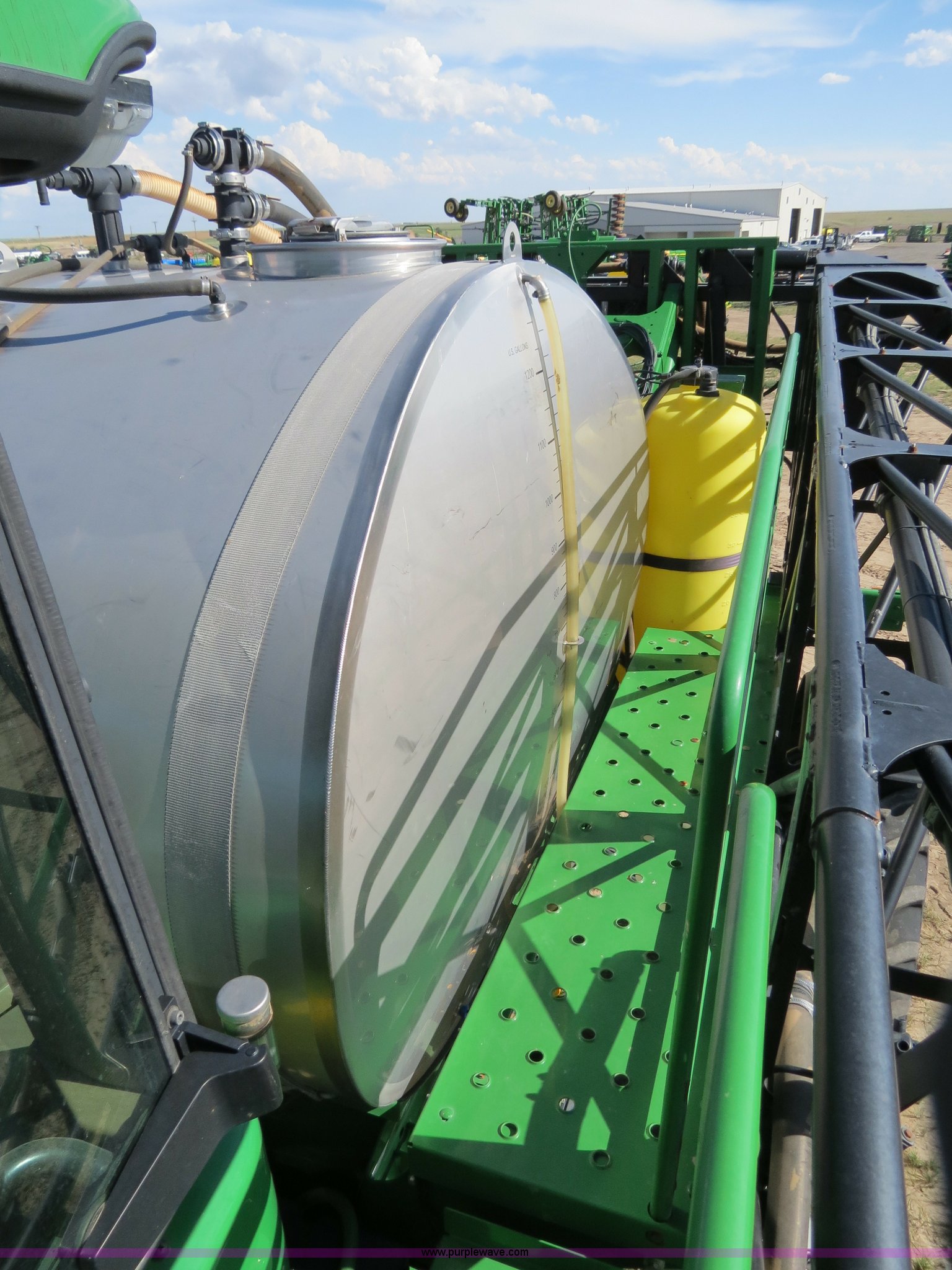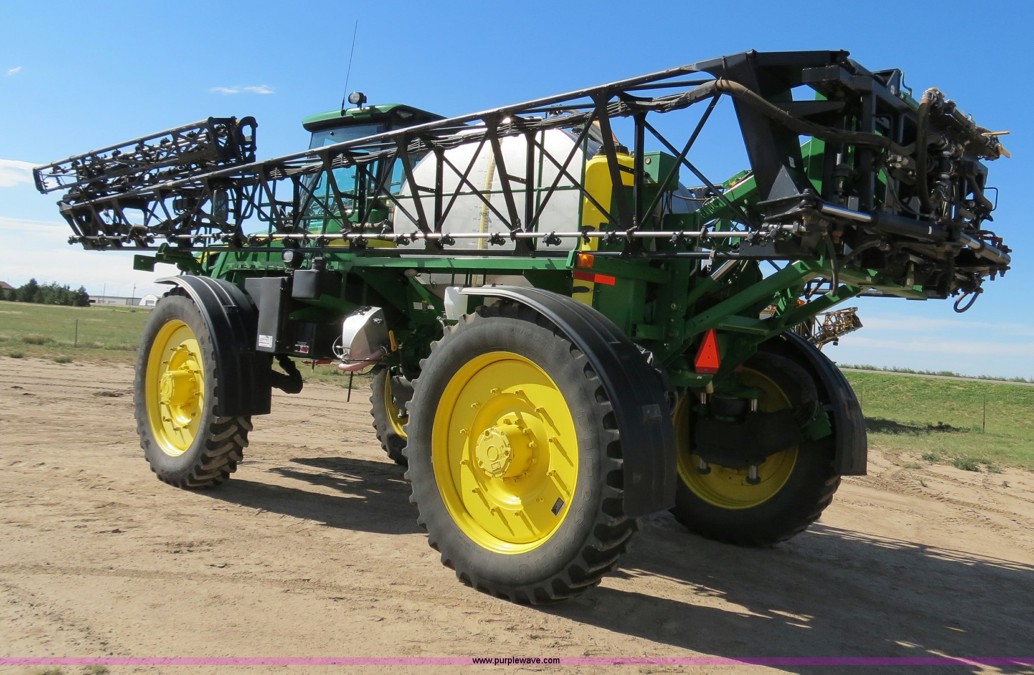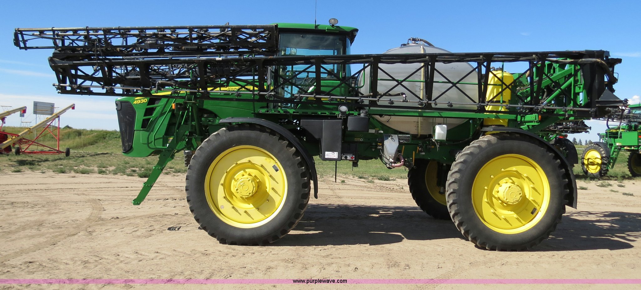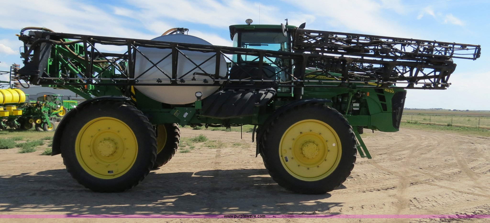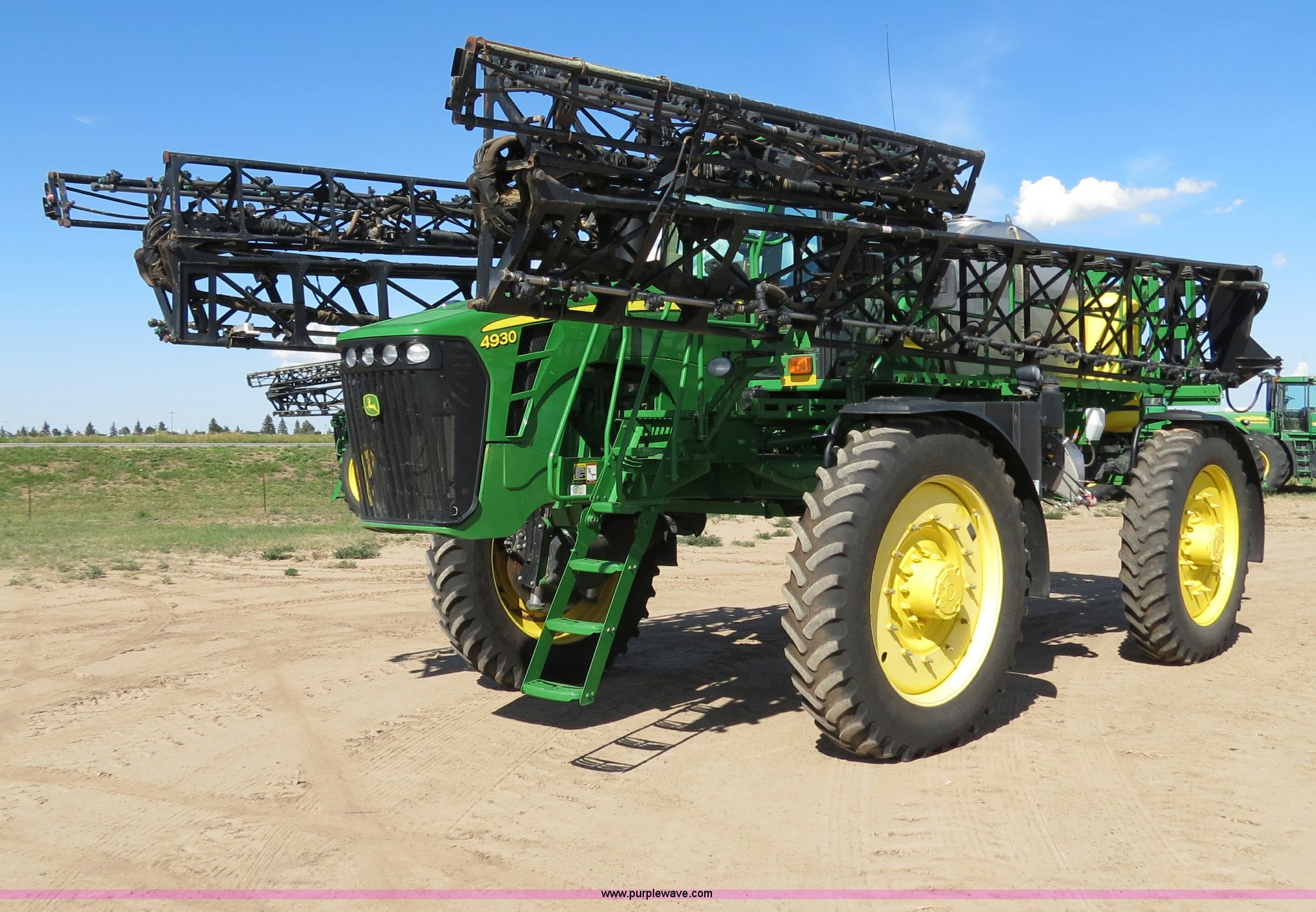Purple Wave is selling a used Applicator Self Propelled in Colorado. This item is a 2009 John Deere 4930 self-propelled sprayer with the following: 1,870 hours on meter, John Deere 6090 9.0L six cylinder diesel engine, 325 HP, Serial RG6090L046067, Hydrostatic transmission, Four wheel drive, Engine block heater, 1,200 gallon stainless steel tank, 150 gallon rinse tank, 120'W boom, (7) boom sections, 20" nozzle spacing, Hydraulic height adjust, Hydraulic boom fold, Foam marker, Stainless steel chemical eductor, Auto air spring level system, Five position standard flow nozzle, Wet boom, Fence row nozzles, Boomtrac auto level system five sensor, AC and heat, AM/FM/CD, (4) speakers, Air suspension seat, Tilt/telescoping steering wheel, Xenon HID work lights, Radar ground speed sensor, Row crop fenders, Wheel motor shields, Wheel traction control, Hydraulic axle width adjust, 380/105R50 tires, Serial N04930X006154, Unit# C019027