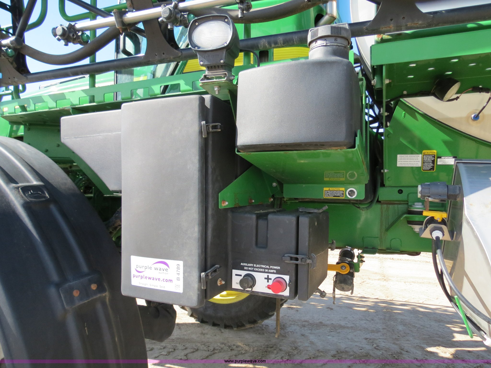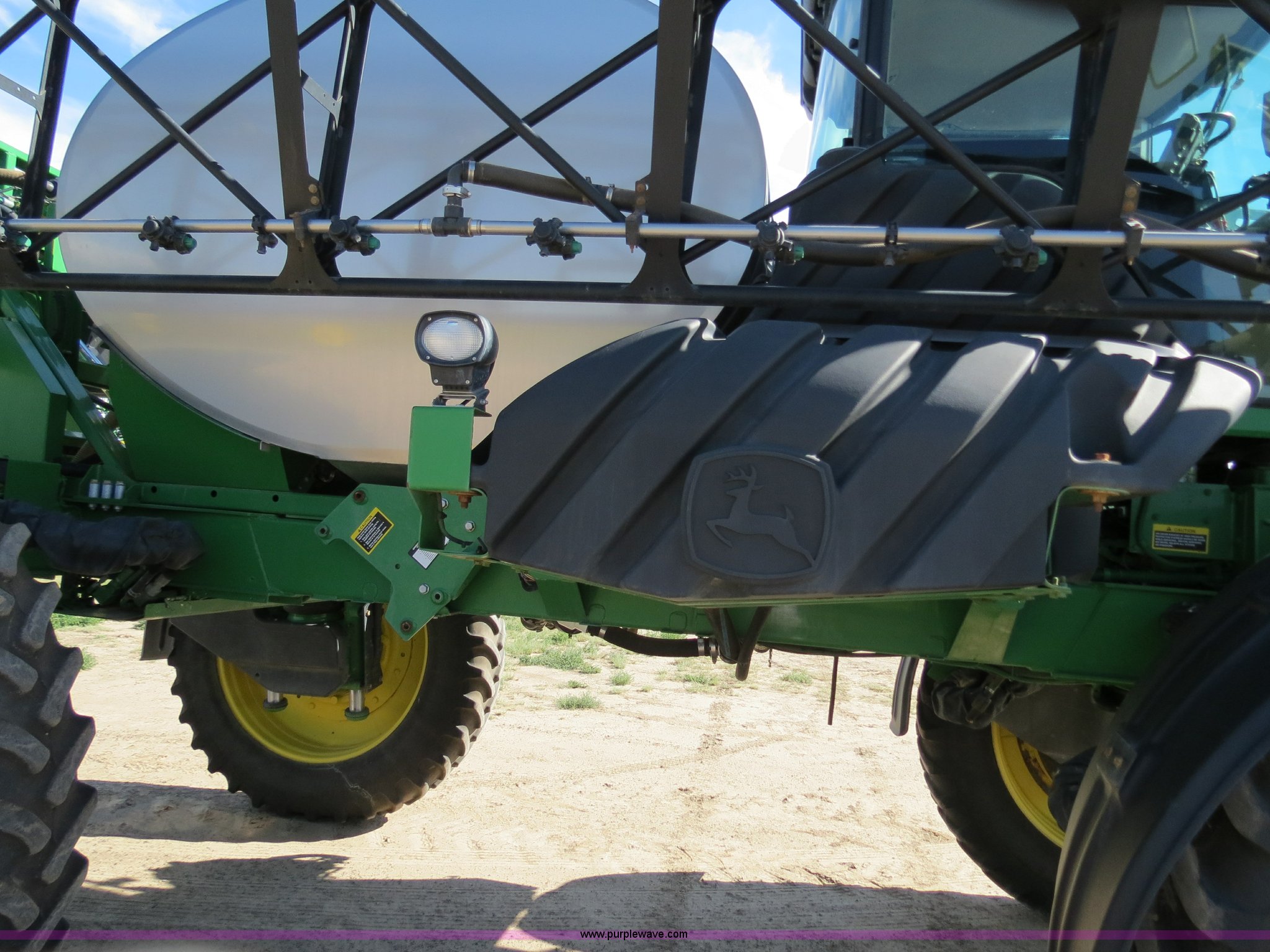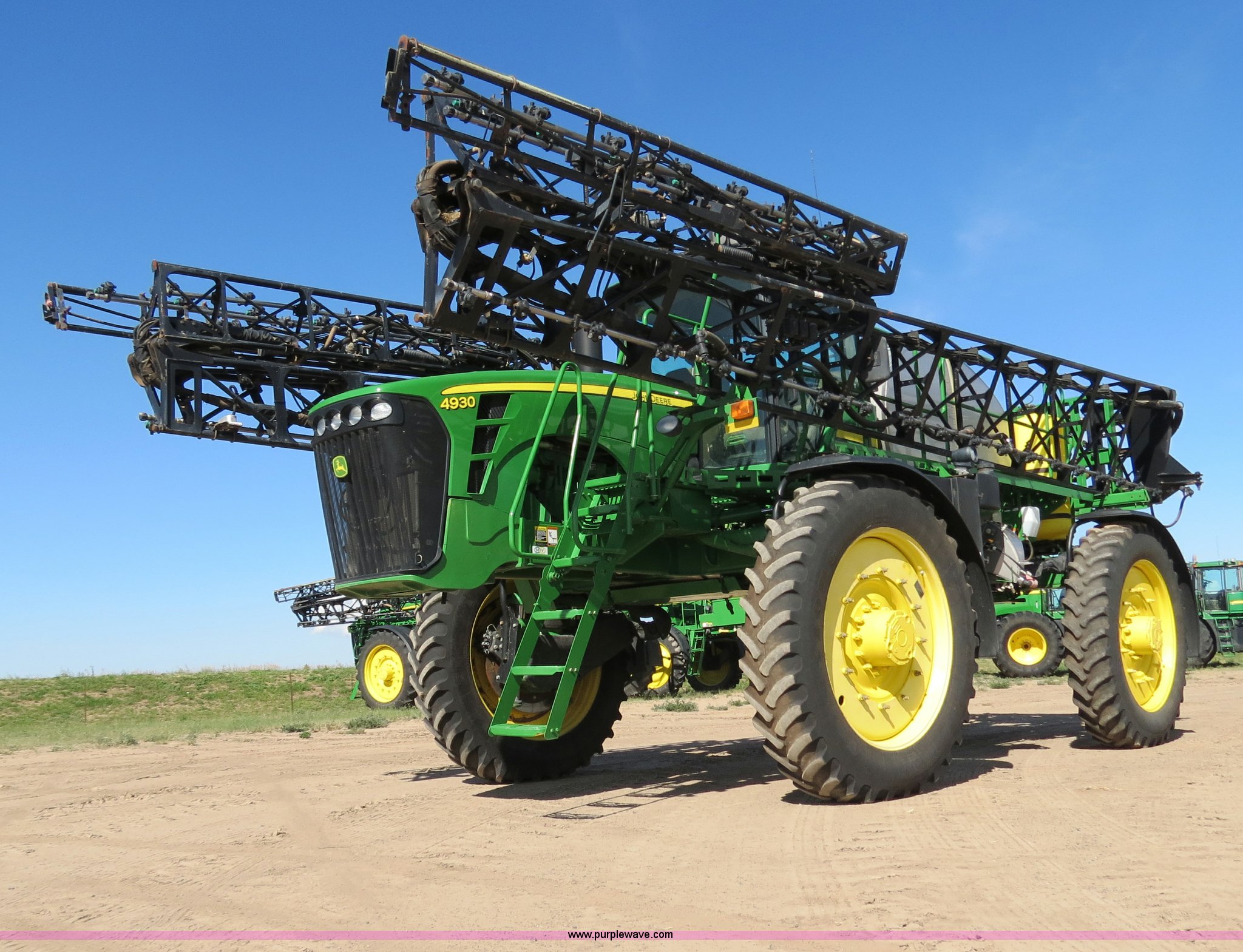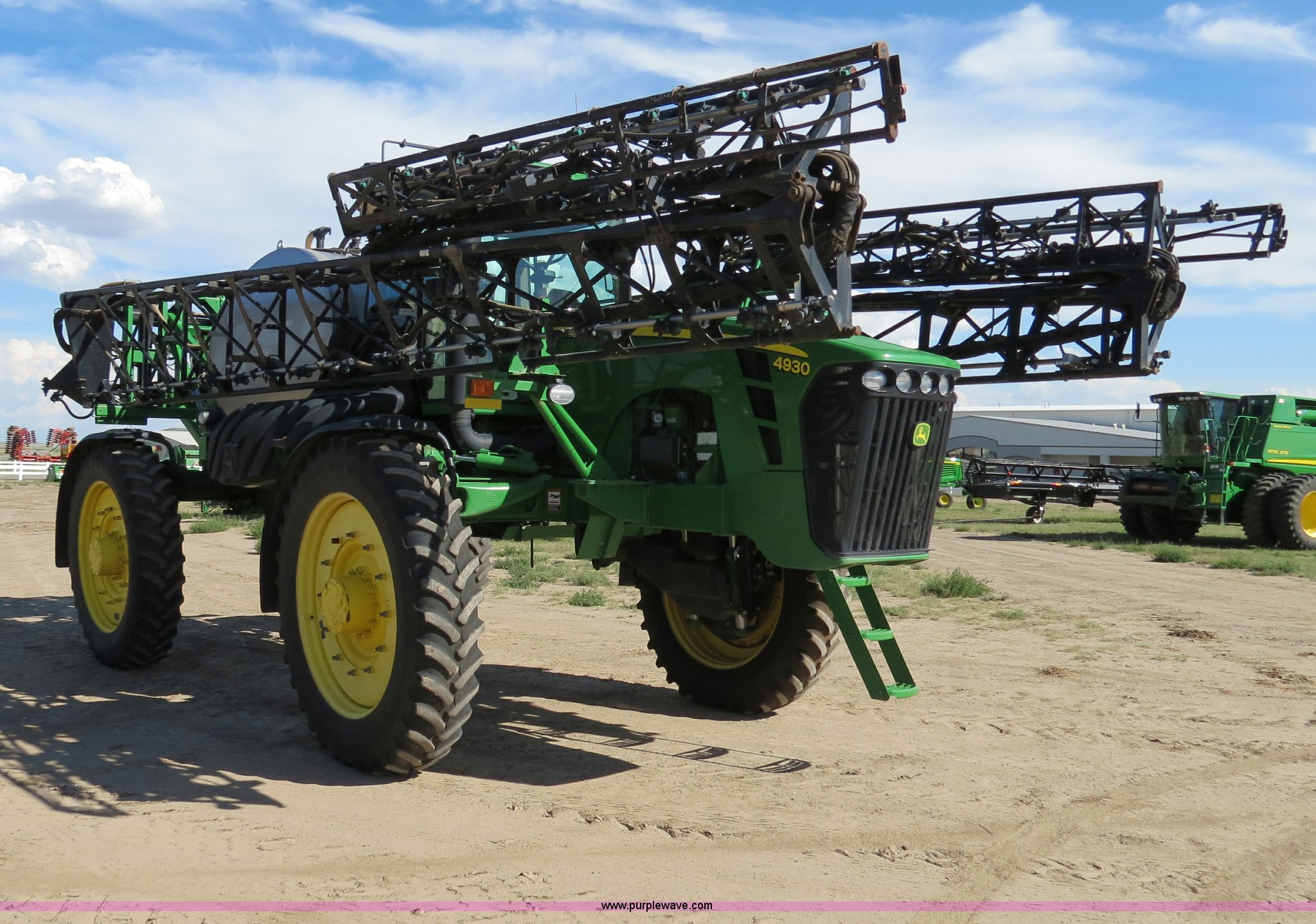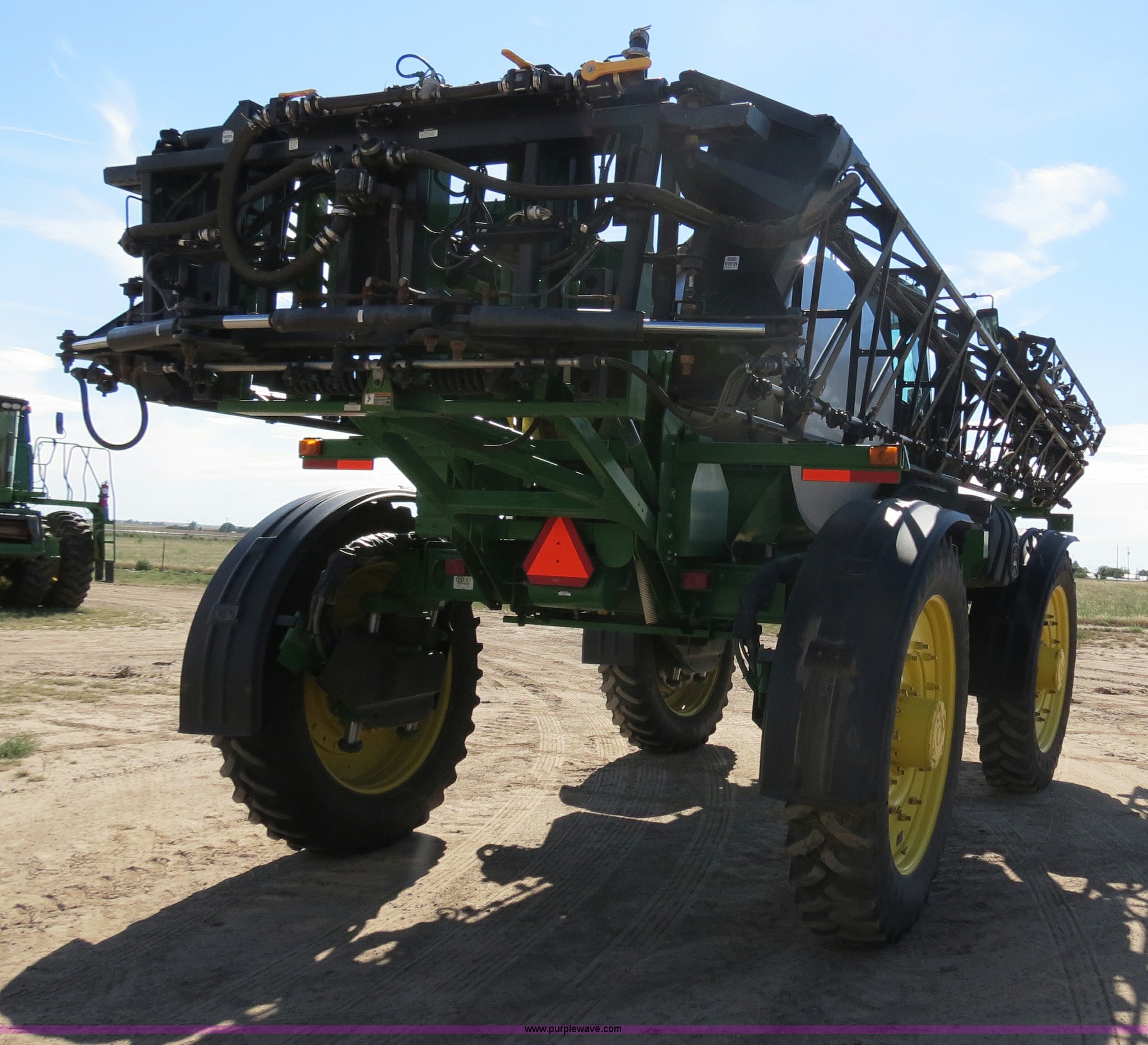 Purple Wave is selling a used Applicator Self Propelled in Colorado. This item is a 2009 John Deere 4930 self-propelled sprayer with the following: 1,870 hours on meter, John Deere 6090 9.0L six cylinder diesel engine, 325 HP, Serial RG6090L046067, Hydrostatic transmission, Four wheel drive, Engine block heater, 1,200 gallon stainless steel tank, 150 gallon rinse tank, 120'W boom, (7) boom sections, 20" nozzle spacing, Hydraulic height adjust, Hydraulic boom fold, Foam marker, Stainless steel chemical eductor, Auto air spring level system, Five position standard flow nozzle, Wet boom, Fence row nozzles, Boomtrac auto level system five sensor, AC and heat, AM/FM/CD, (4) speakers, Air suspension seat, Tilt/telescoping steering wheel, Xenon HID work lights, Radar ground speed sensor, Row crop fenders, Wheel motor shields, Wheel traction control, Hydraulic axle width adjust, 380/105R50 tires, Serial N04930X006154, Unit# C019027