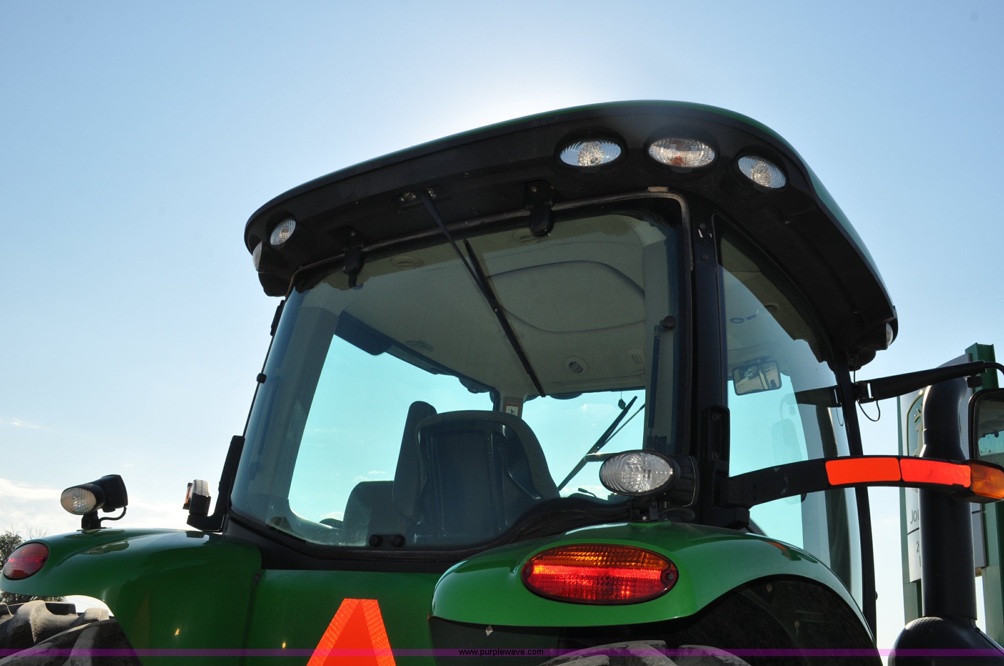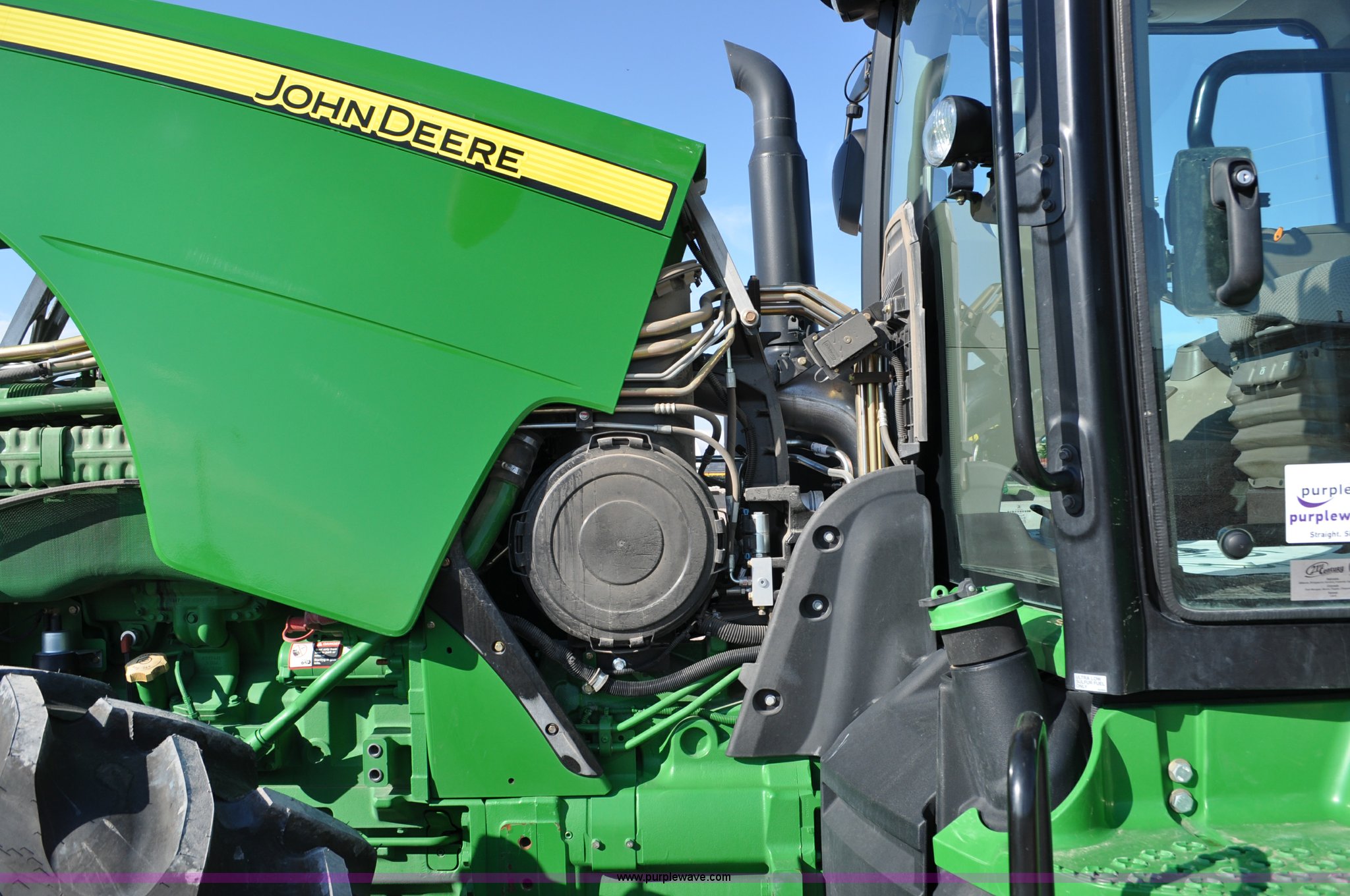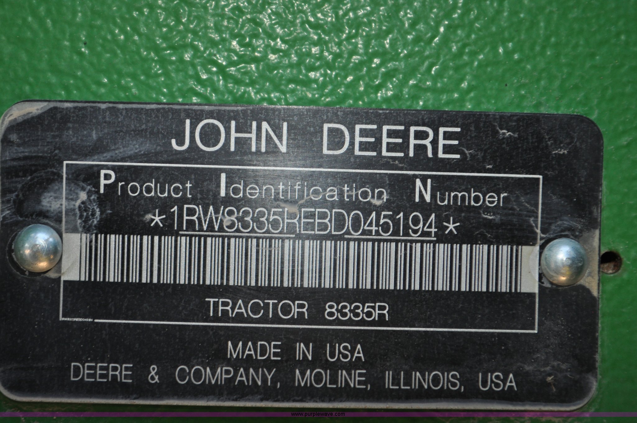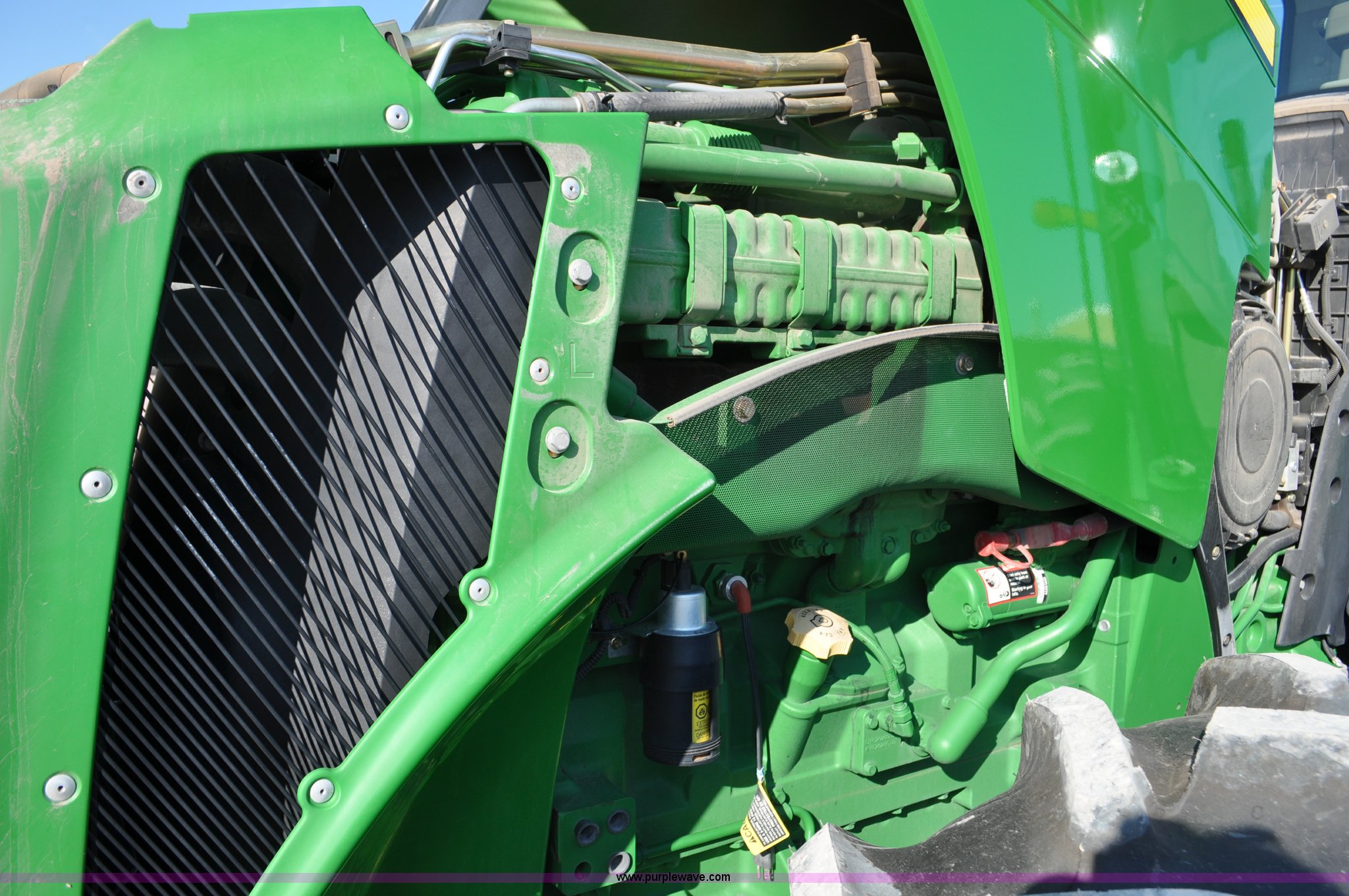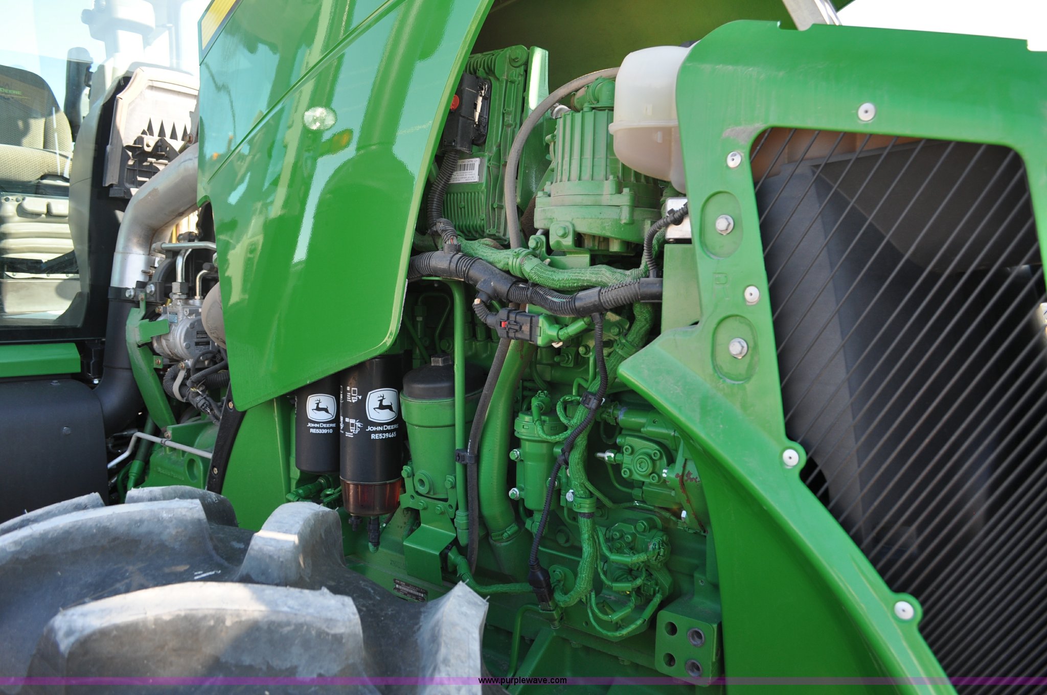 Purple Wave is selling a used Tractor in Nebraska. This item is a 2011 John Deere 8335R MFWD tractor with the following: 1,442 hours on meter, John Deere 6090 9.0L six cylinder diesel engine, IVT transmission, Differential lock, Commandview II Premium cab, AC and heat, AM/FM/CD/XM/weatherband, Active air seat, Instructor's seat, Tilt steering wheel, Visor, Foot operated throttle control, HID light package, Engine block heater, Three point, Quick attach, Draw bar, 1000 PTO, (5) rear hydraulic remotes, Independent link suspension, (20) suitcase weights, Wheel weights, 118.9 wheelbase, 380/80R38 dual front tires, 480/80R50 dual rear tires, New warrantied front tires, Top link on quick tach will be replaced by auction date, Basic Warranty until September 14, 2013, Extended Power Train Warranty until September 14, 2014, JDLINK ULT Promo until September 14, 2014, Serial 1RW8335REBD045194, Unit# C011528