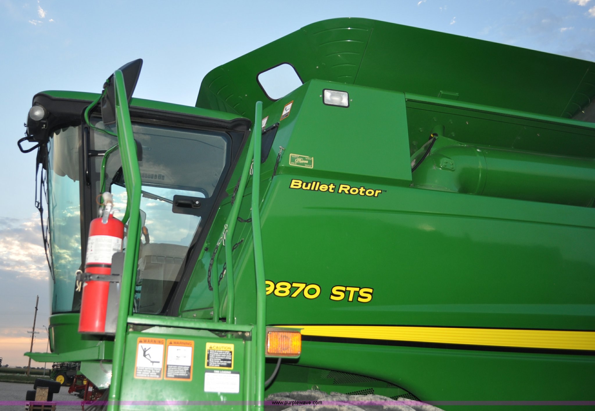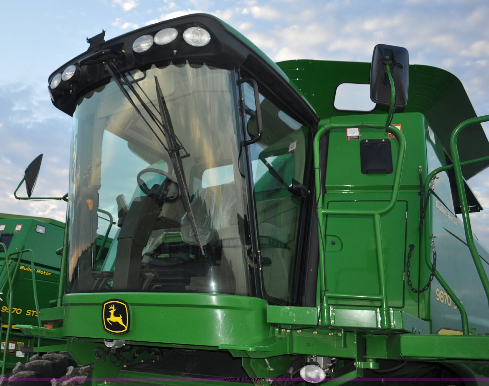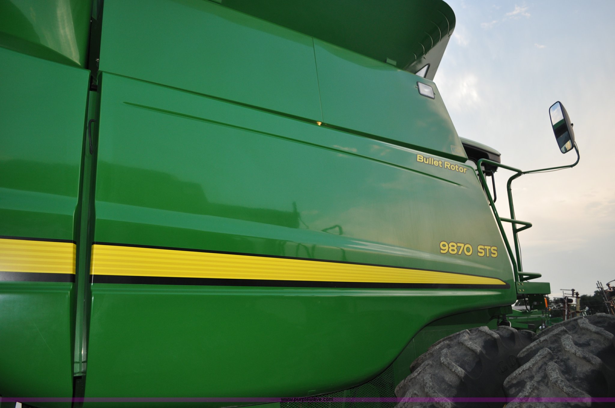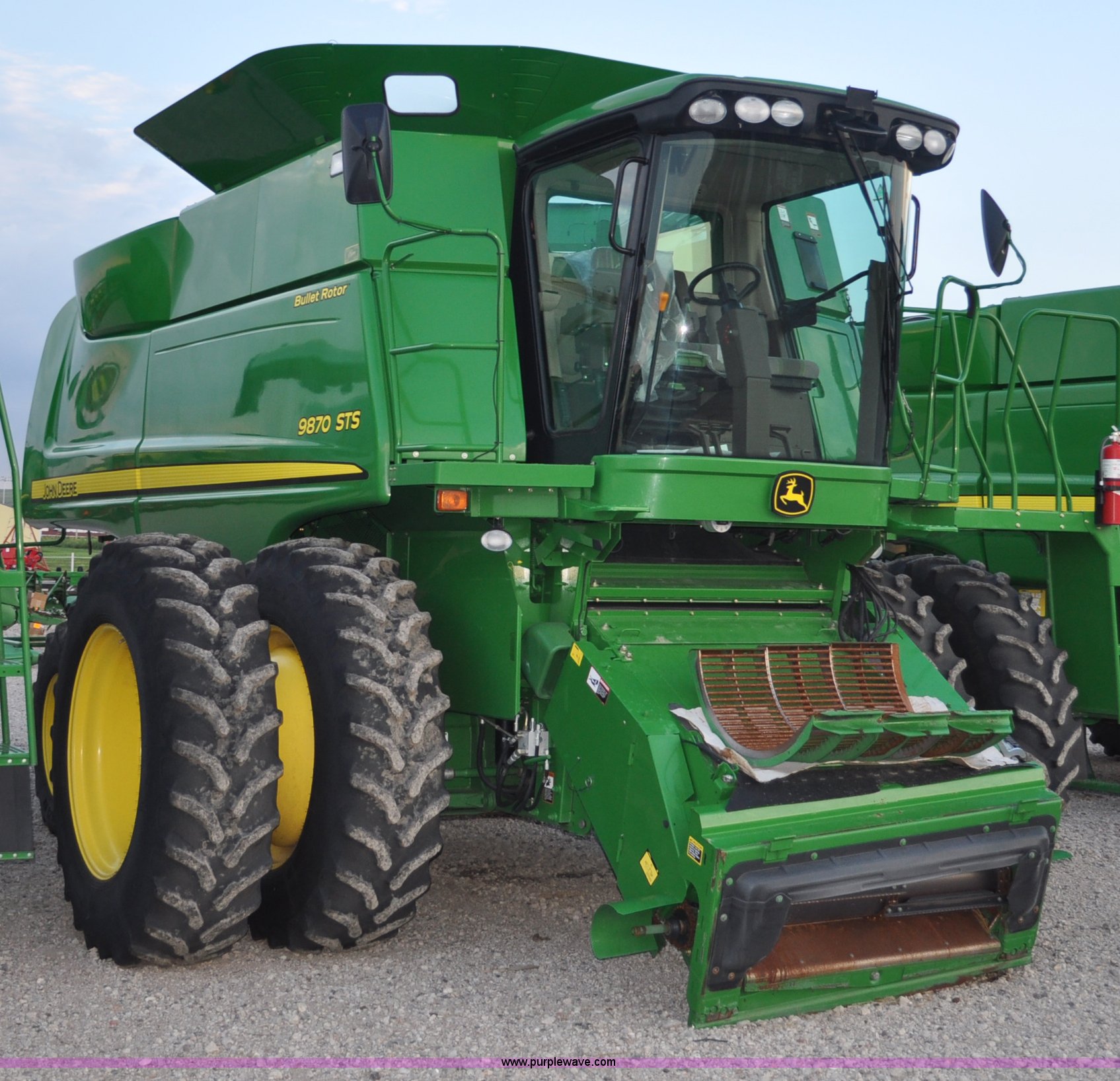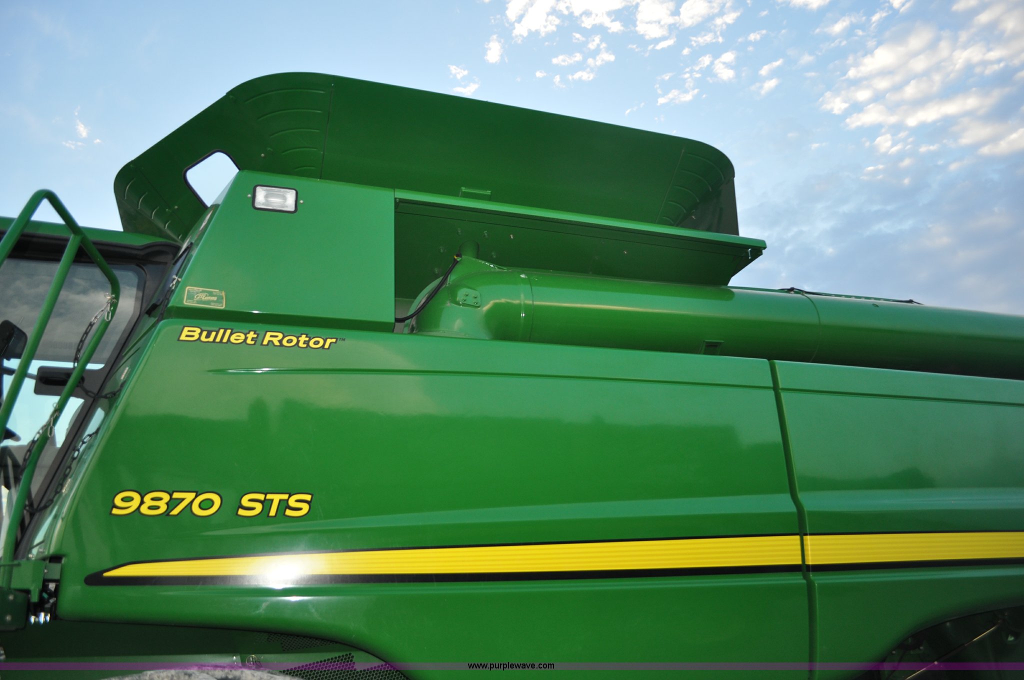 Purple Wave is selling a used Combine in Nebraska. This item is a 2008 John Deere 9870 STS 2WD combine with the following: 1,554 engine hours on meter, 1,076 separator hours on meter, John Deere 6135 13.5L six cylinder diesel engine, 440 HP, Hydrostatic transmission, 3F-3R gears, Contour Master feeder house, Reverser, Single point hookup, Straw chopper, AC and heat, AM/FM/CD/weatherband, Air suspension seat, Instructor's seat, Tilt steering wheel, Visor, Power mirrors, In-cab chaffer and sieve adjust, John Deere bin extensions, 300 bushel bin capacity, Work lights, Yield monitor, Greenstar ready, 520/85R42 dual drive tires, 480/70R30 rear tires, Serial H09870S725859, Unit# C009974