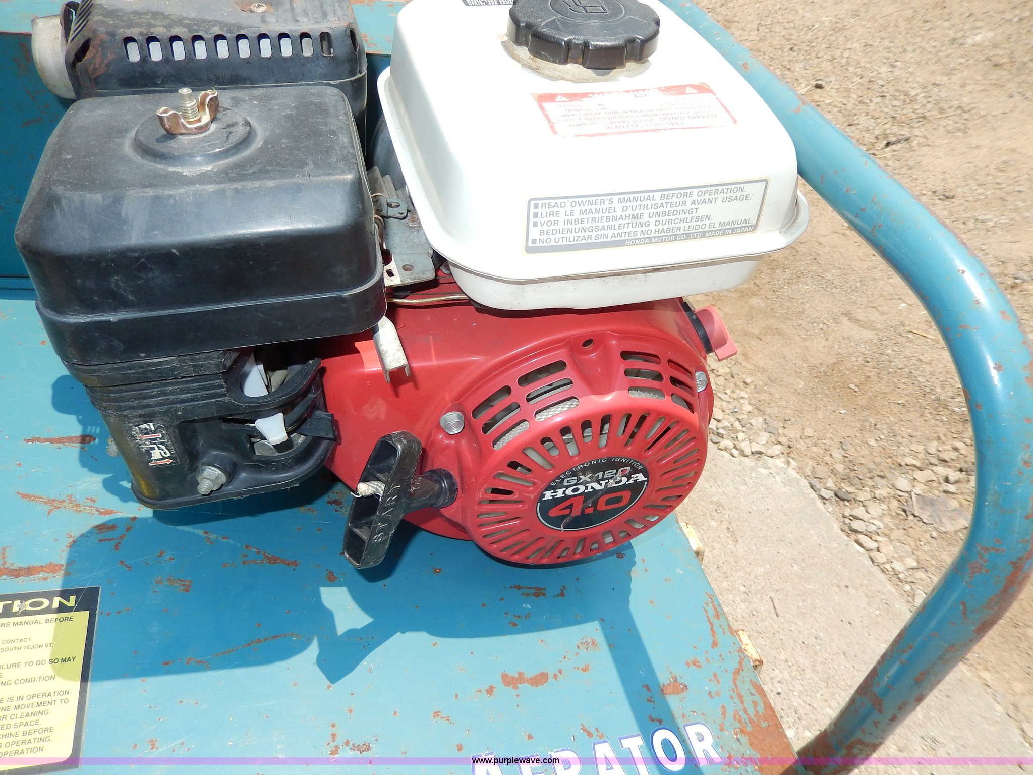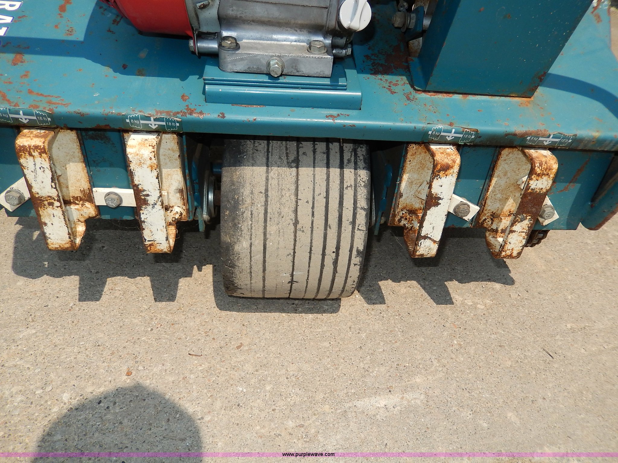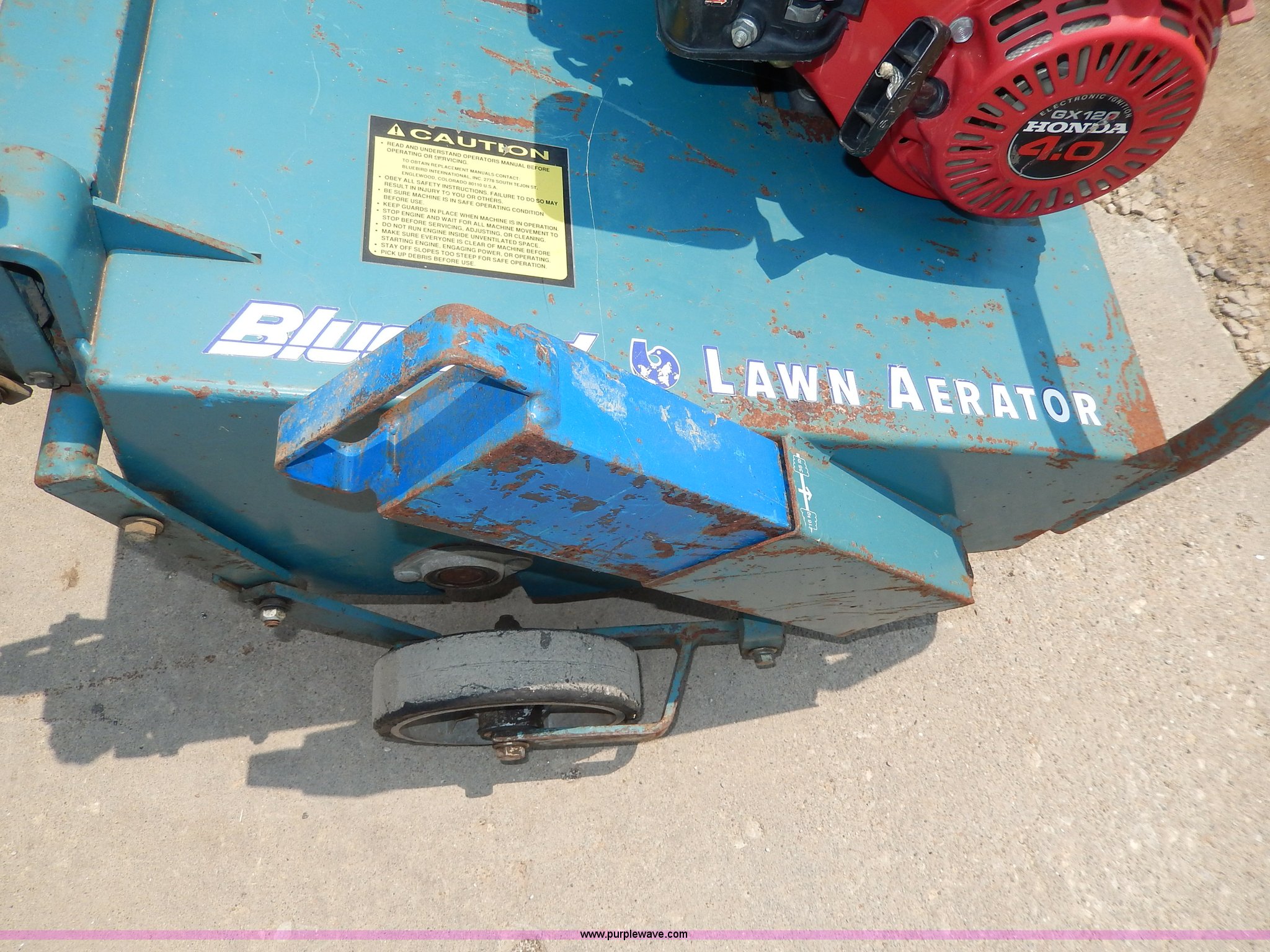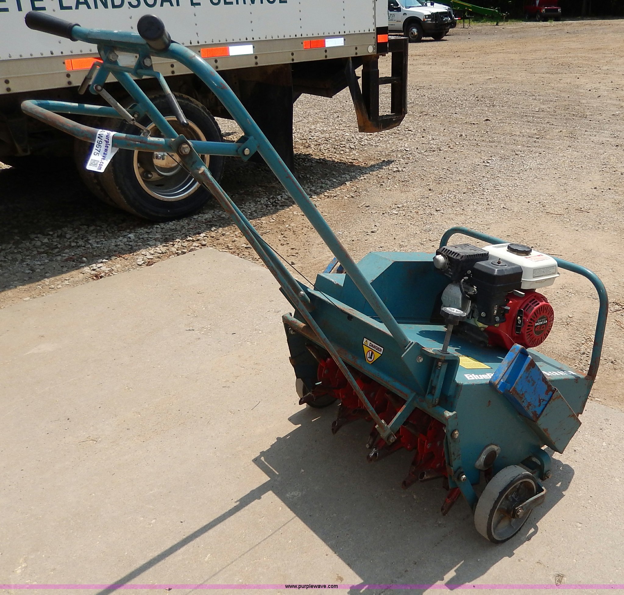Purple Wave is selling a used Lawn and Garden in Kansas. This item is a Bluebird lawn aerator with the following: Honda GX120 engine, 4 HP, 27"W swath, 4" tines, Adjustable depth, (2) side weights, 16 and 36 lbs