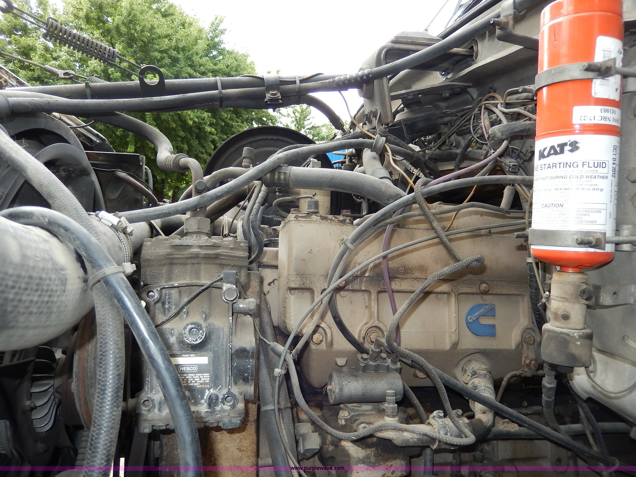 Purple Wave is selling a used Truck Tractor in Kansas. This item is a 1983 Ford LNT9000 semi truck with the following: 338,764 actual miles, Cummins NTC-350 diesel engine, 350 HP, Serial 11075509, Road Ranger 10 speed manual transmission, Differential lock, AC and heat, AC compressor clutch is out, AM/FM, Heated mirrors, Unknown operating condition, Cloth interior, Bug deflector, Front tow hooks, Block heater, Dual 100 gallon fuel tanks, Single rear exhaust stack, Manual sliding fifth wheel, Steel deck plate, Quarter fenders, One fender guard, Spring suspension, Air brakes, 11R24.5 tires, GVWR 44,800 lbs, Recently replaced brake seals and bearings, Exterior cosmetic damage to hood, Paint peeling