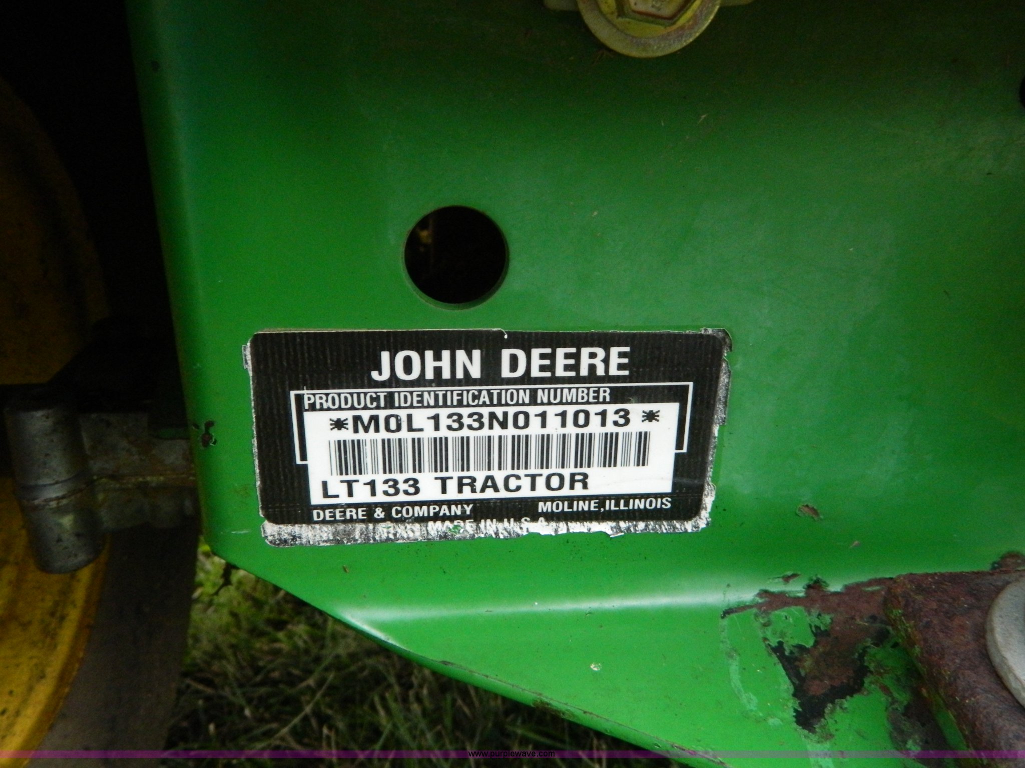 Purple Wave is selling a used Lawn and Garden in Kansas. This item is a John Deere LT133 lawn mower with the following: 38" cut, 13 HP gas engine, Five speed transmission, Serial M0L133N011013