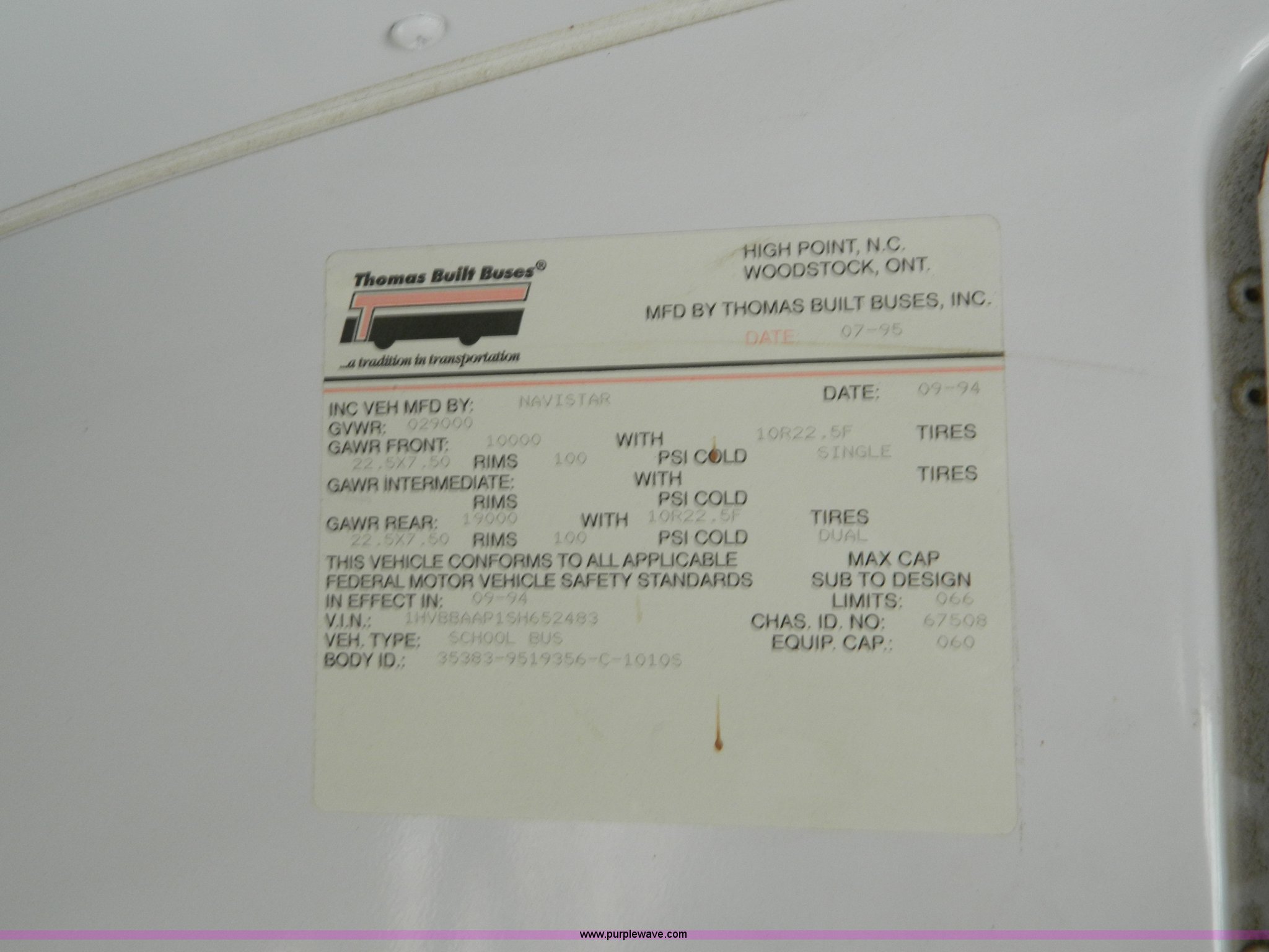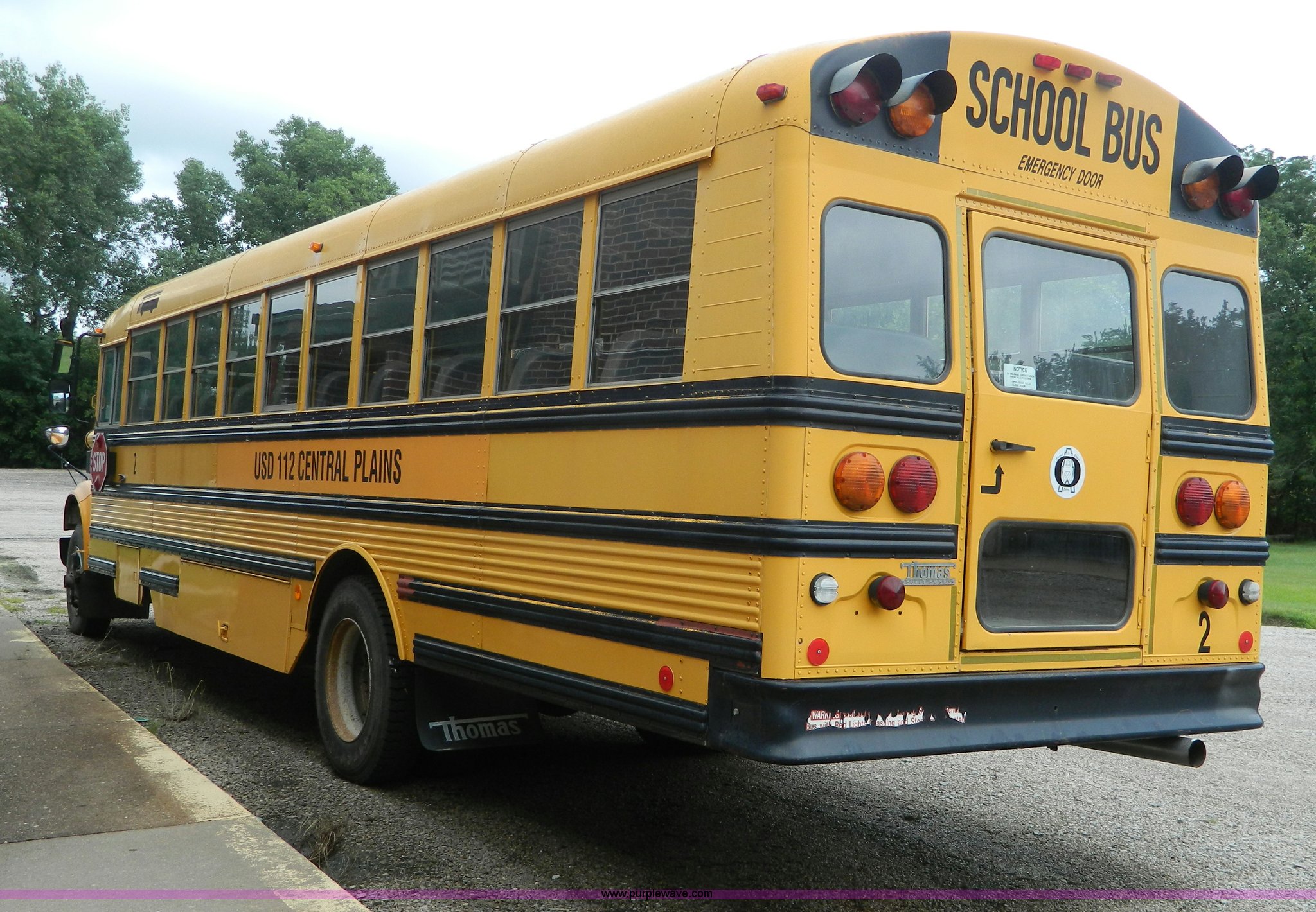 Purple Wave is selling a used Bus in Kansas. This item is a 1995 International Thomas school bus with the following: 195,604 miles on odometer, International DT466 7.6L L6 diesel engine, Automatic transmission, 60 passenger capacity, AM/FM, Hand throttle, Block heater, Hydraulic brakes, 254" wheelbase, 10R22.5 tires, Owner's manual