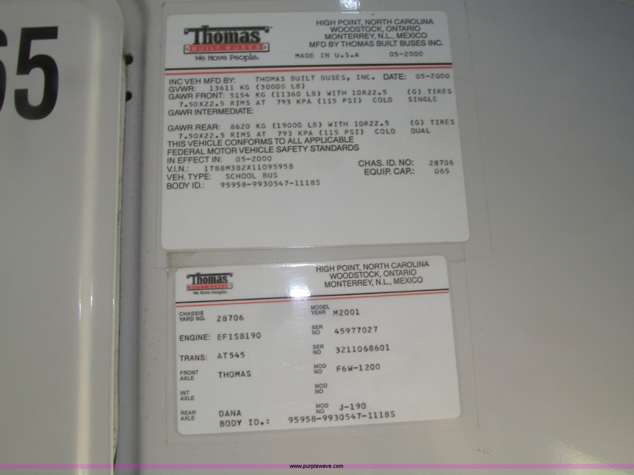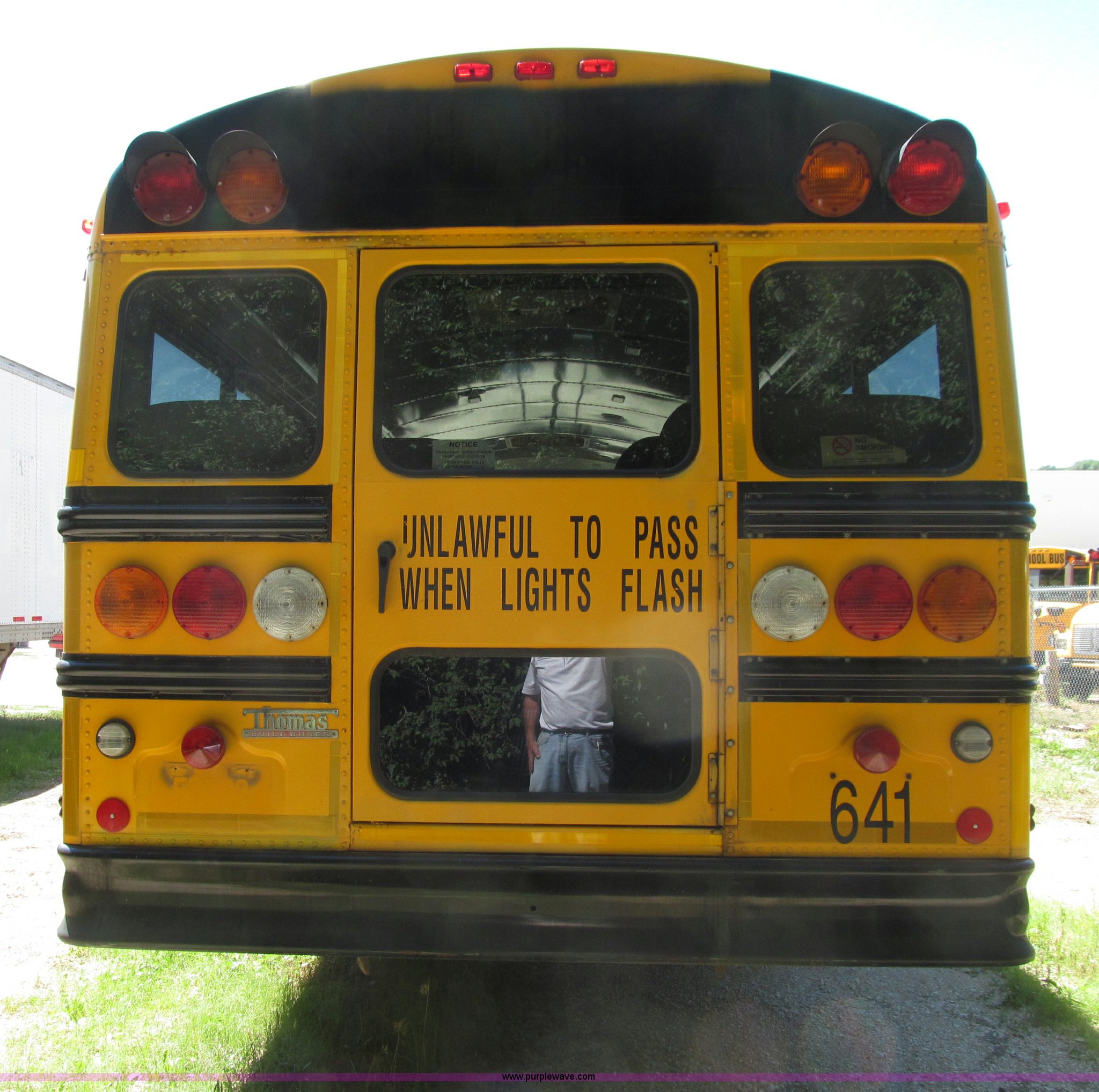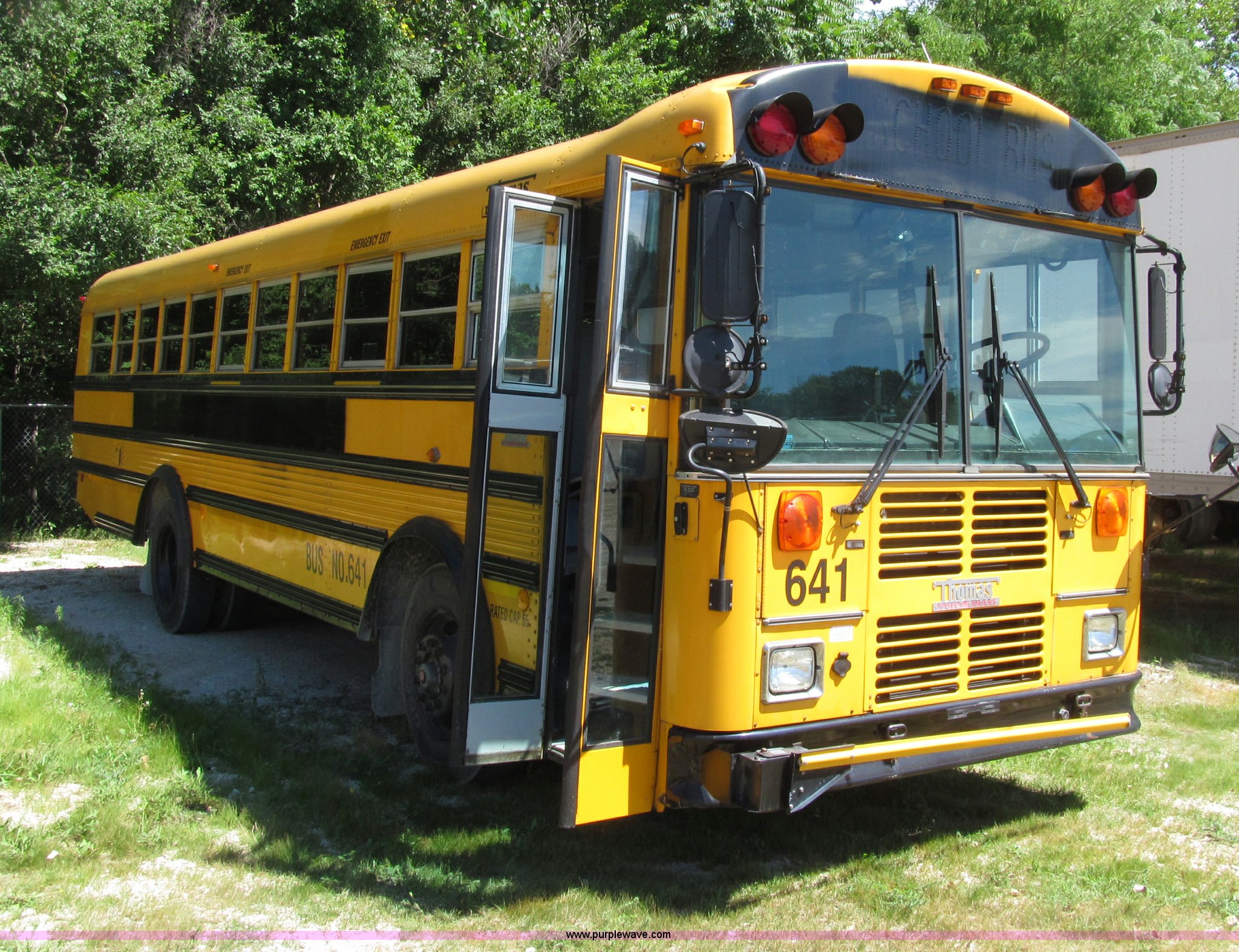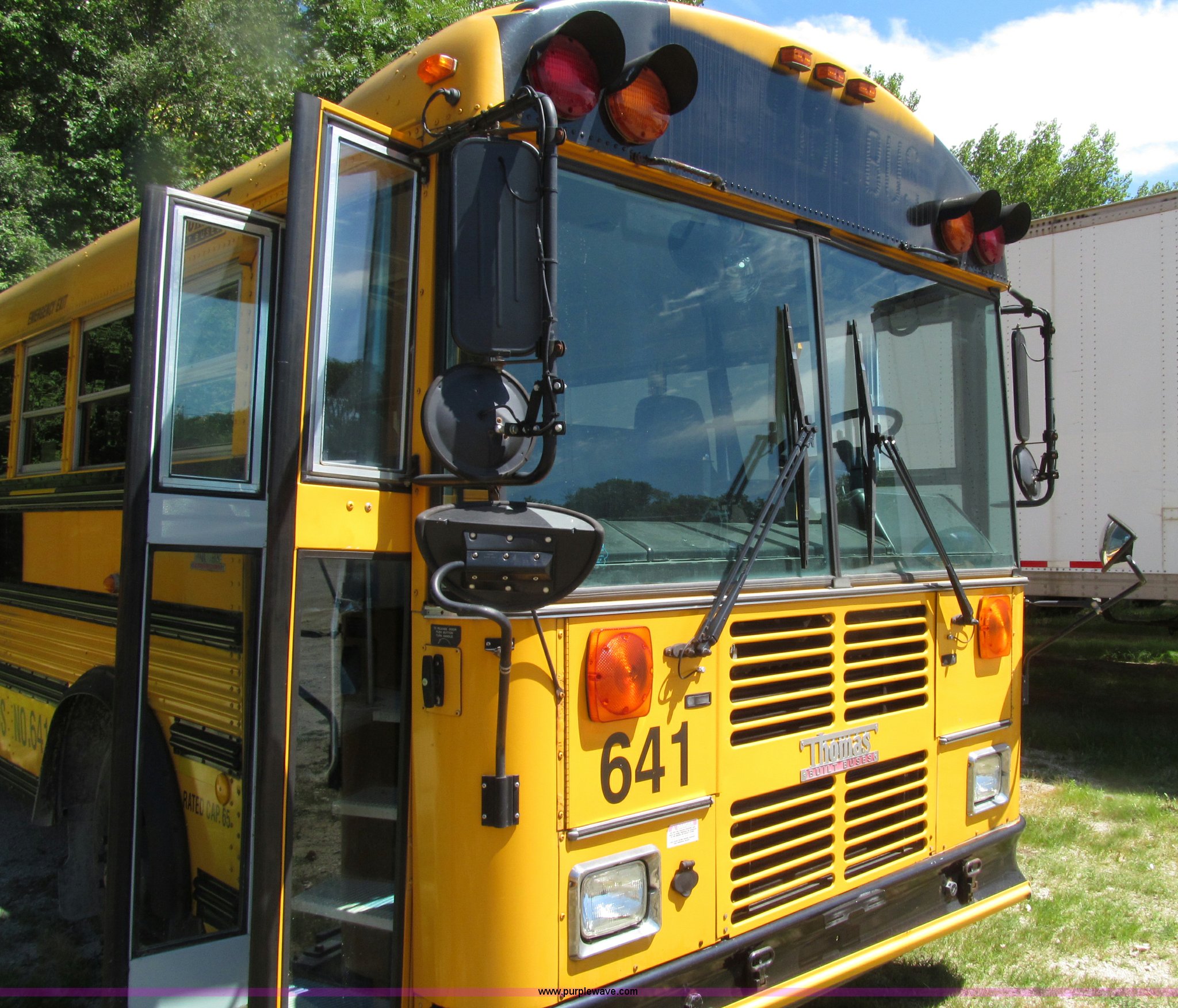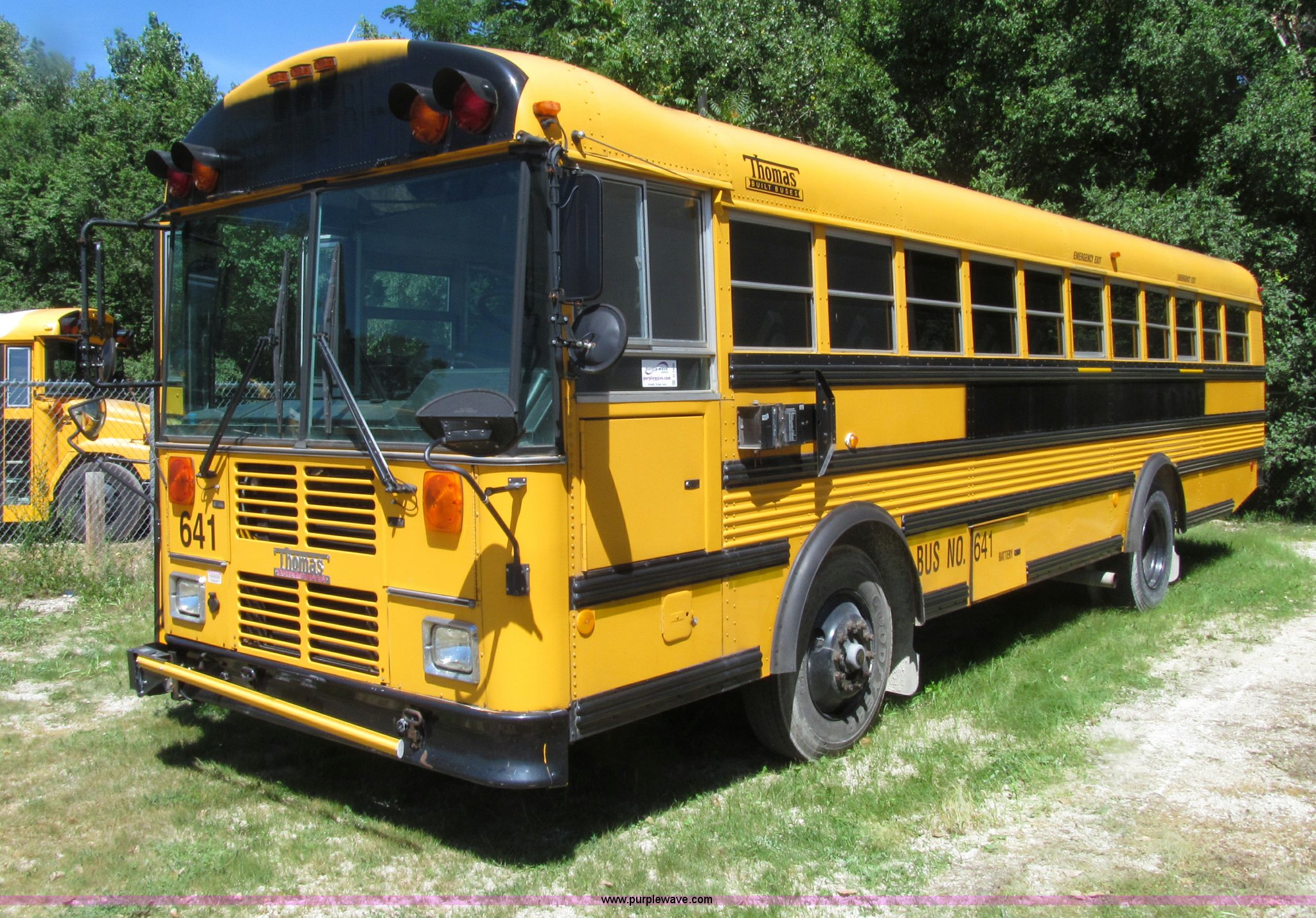 Purple Wave is selling a used Bus in Iowa. This item is a 2001 Thomas school bus with the following: 25,167 miles on odometer, 131,925 total miles, 2,302 hours on meter, Cummins ISC 7.2L L6 diesel engine, Automatic transmission, Heat, Tilt, Cruise, AM/FM/cassette, Manual windows, Cush-N-Aire driver's seat, Vinyl interior, 65 passenger capacity, (7) emergency egress, Spring suspension, 10R22.5 tires, GVWR 30,000 lbs, FAWR 11,360 lbs, RAWR 19,000 lbs, Unit# 641