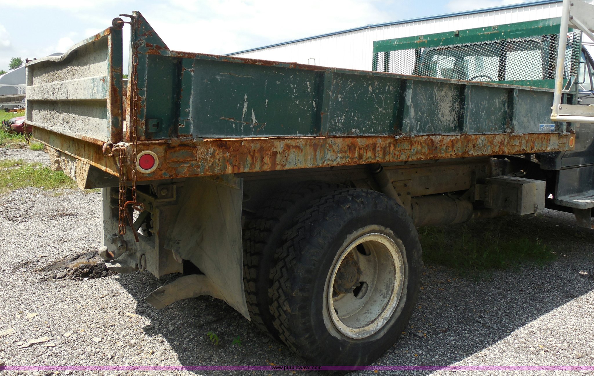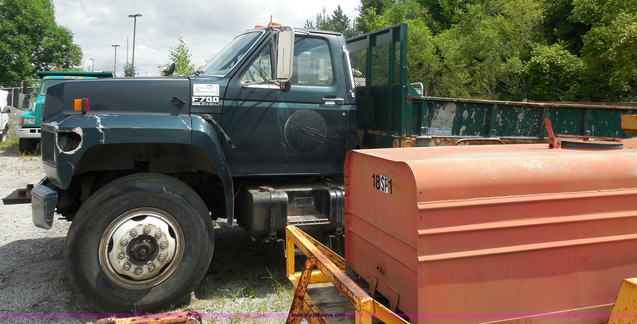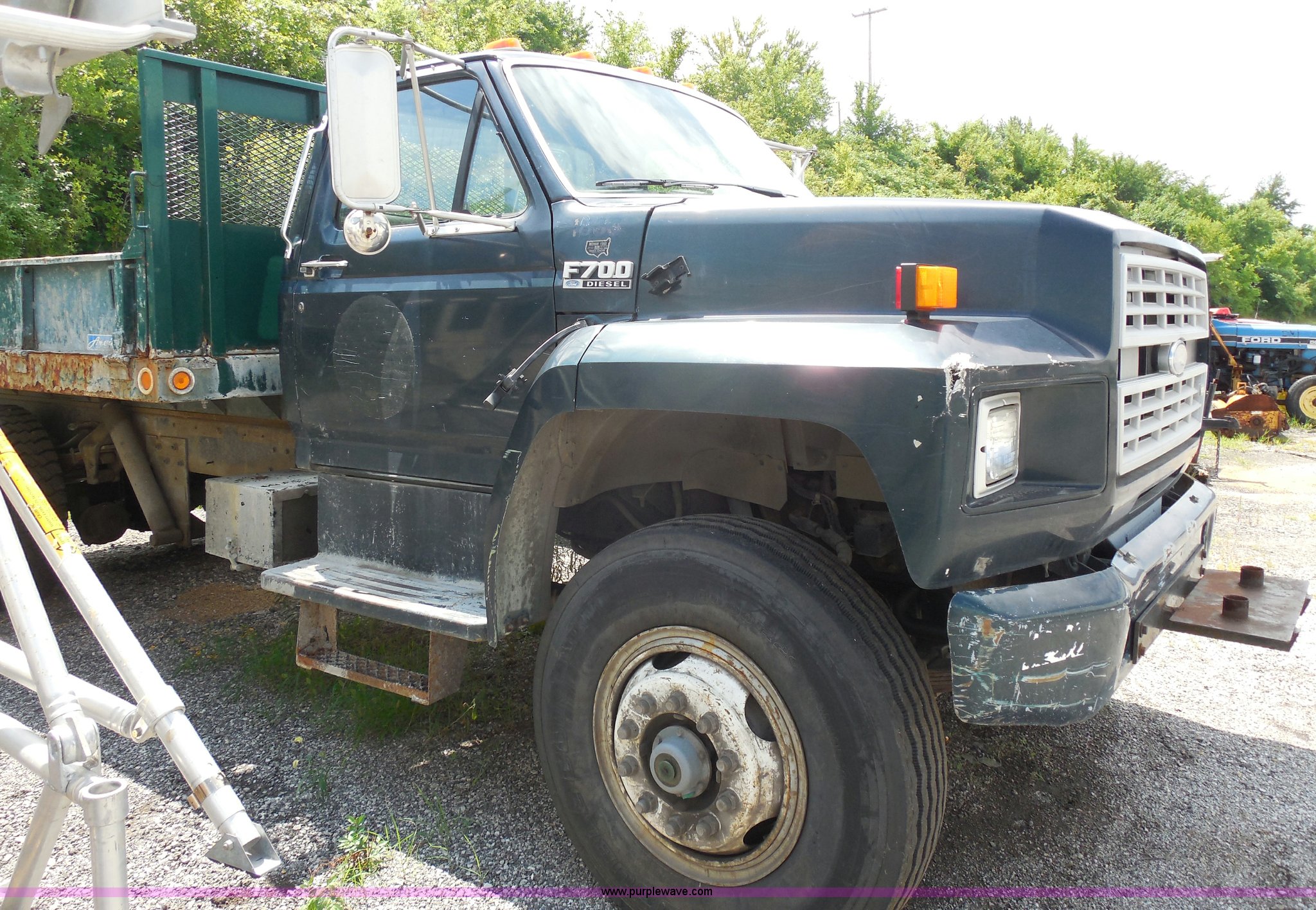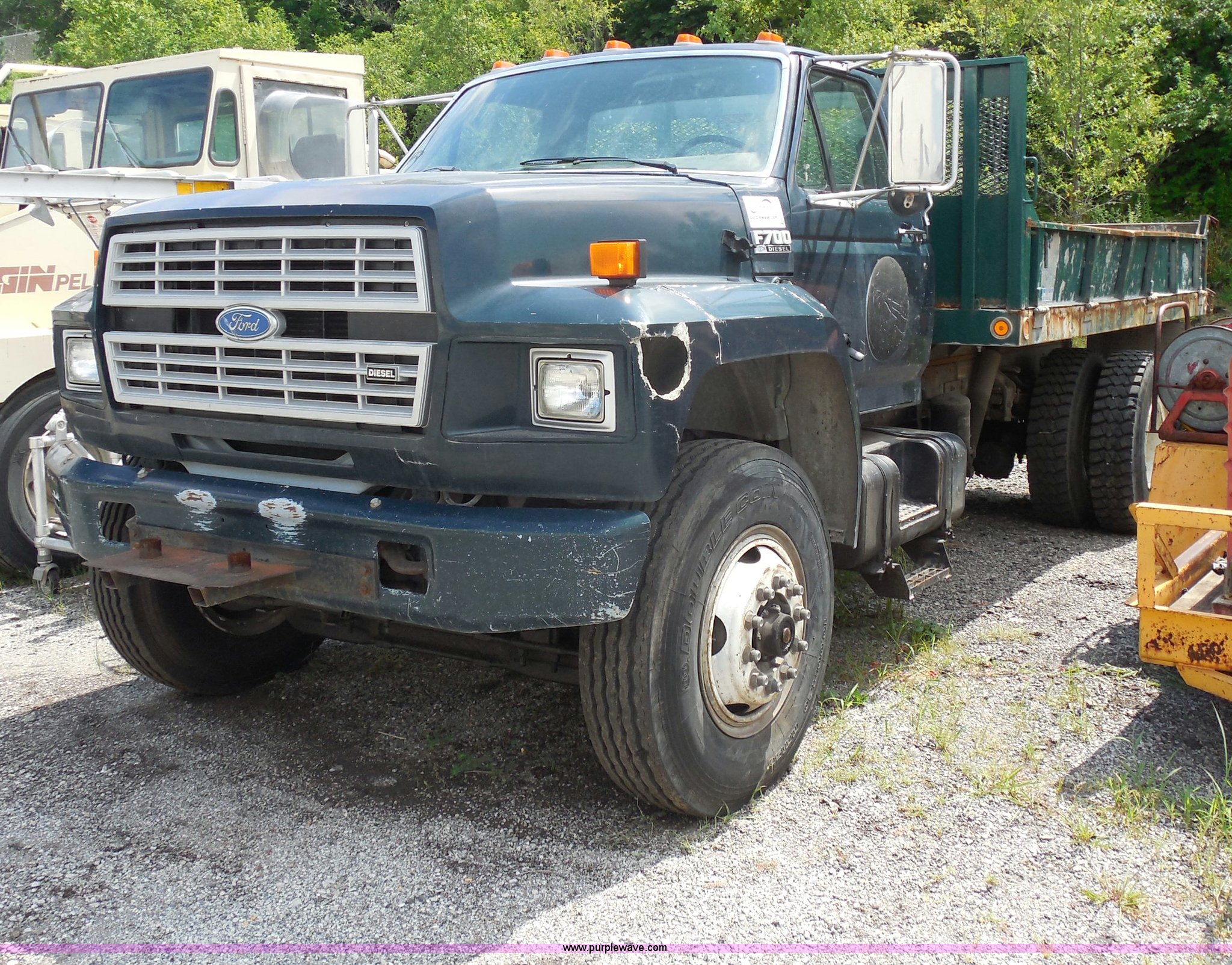 Purple Wave is selling a used Construction Dump Truck in Kansas. This item is a 1993 Ford F700 dump truck with the following: 66,436 miles on odometer, Cummins 5.9L L6 diesel engine, Automatic transmission, American 12.6' dump bed, Dual ram hoist, 50 gallon fuel tank, PTO, Pintle hitch, Spring suspension, Air brakes, 10.00-20 tires, GVWR 33,200 lbs, Dead battery, Cosmetic damage, Starts and runs