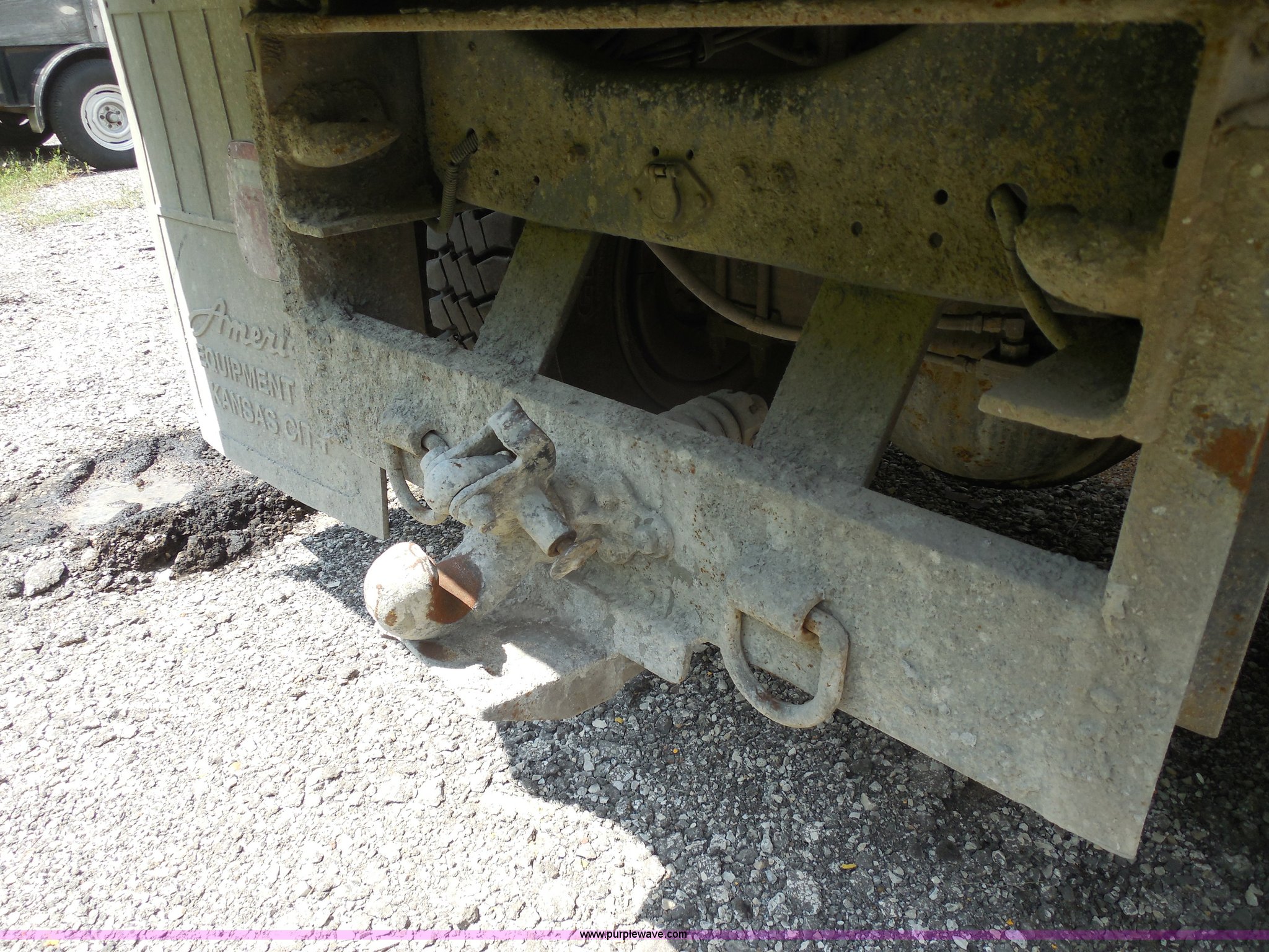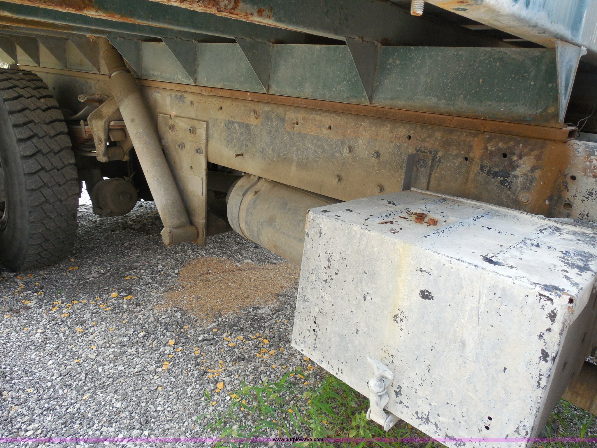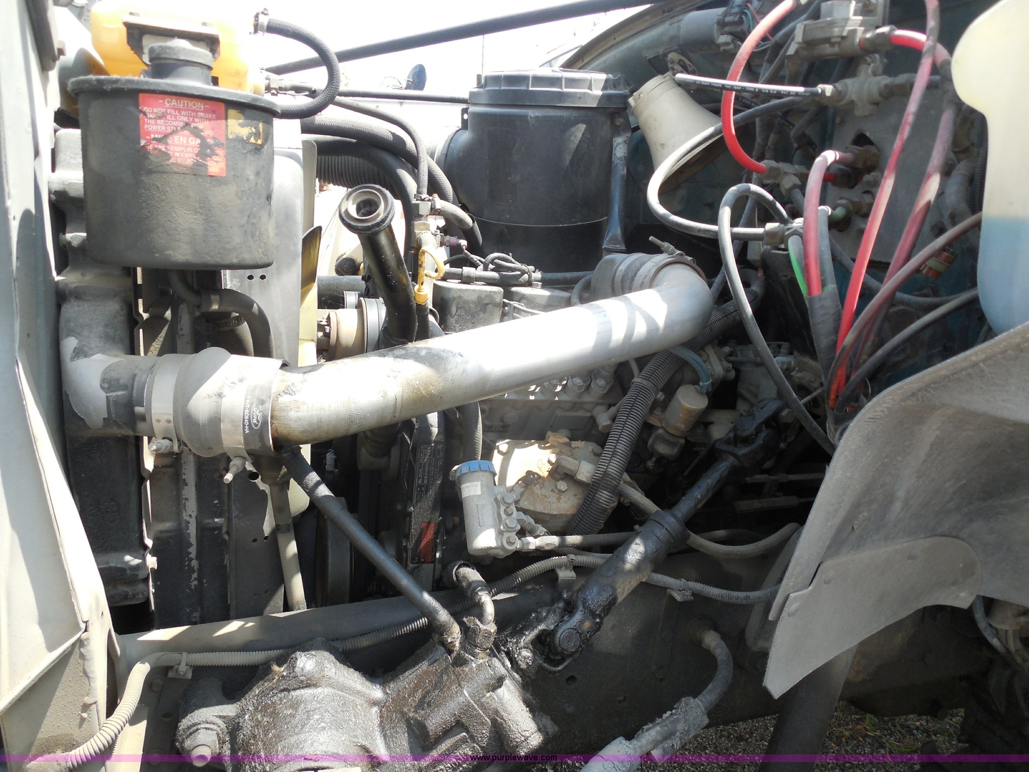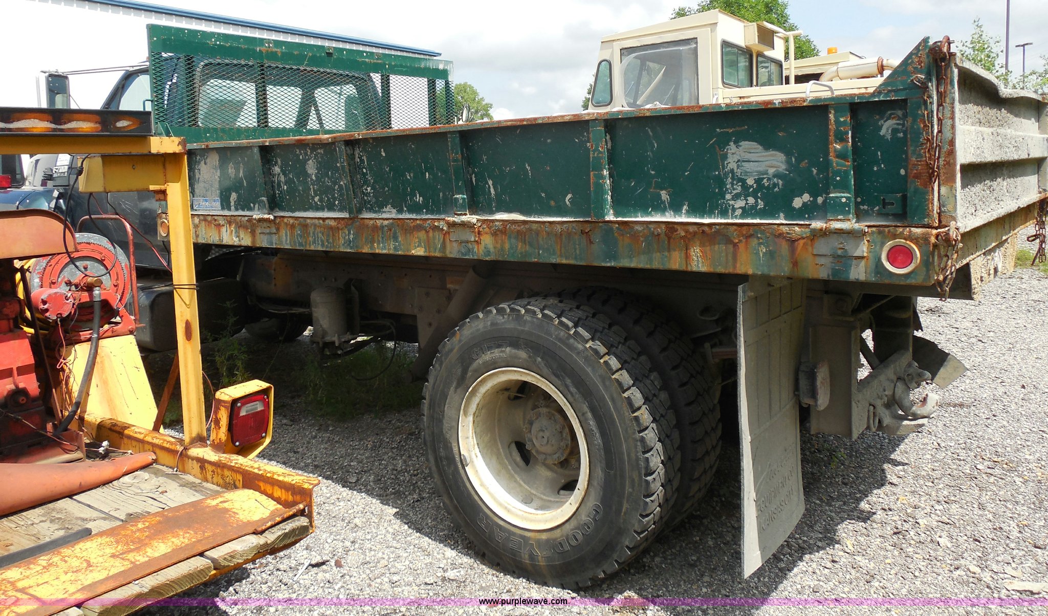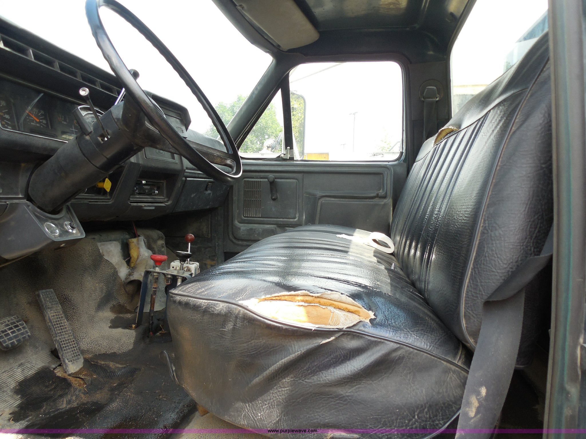 Purple Wave is selling a used Construction Dump Truck in Kansas. This item is a 1993 Ford F700 dump truck with the following: 66,436 miles on odometer, Cummins 5.9L L6 diesel engine, Automatic transmission, American 12.6' dump bed, Dual ram hoist, 50 gallon fuel tank, PTO, Pintle hitch, Spring suspension, Air brakes, 10.00-20 tires, GVWR 33,200 lbs, Dead battery, Cosmetic damage, Starts and runs