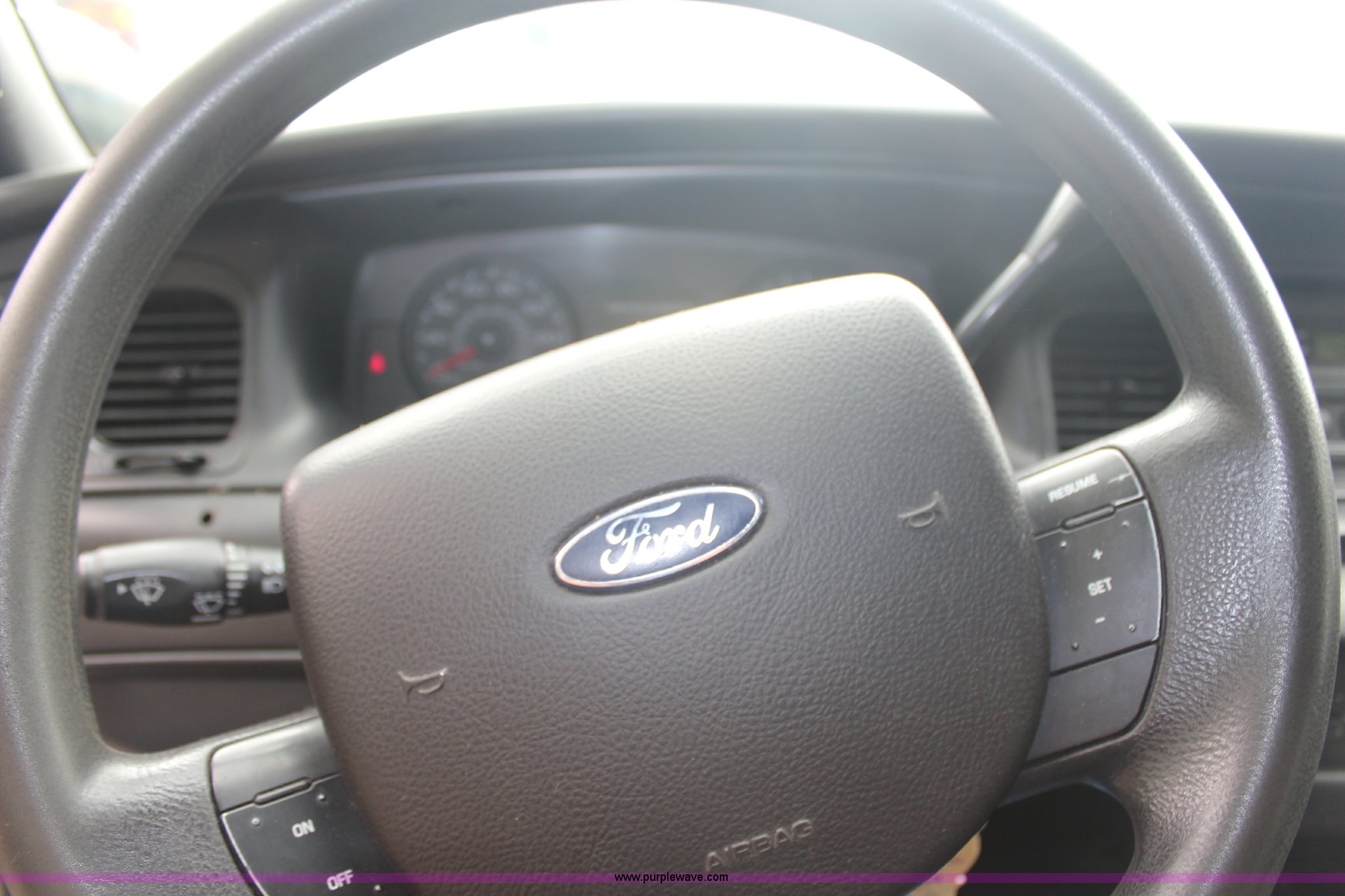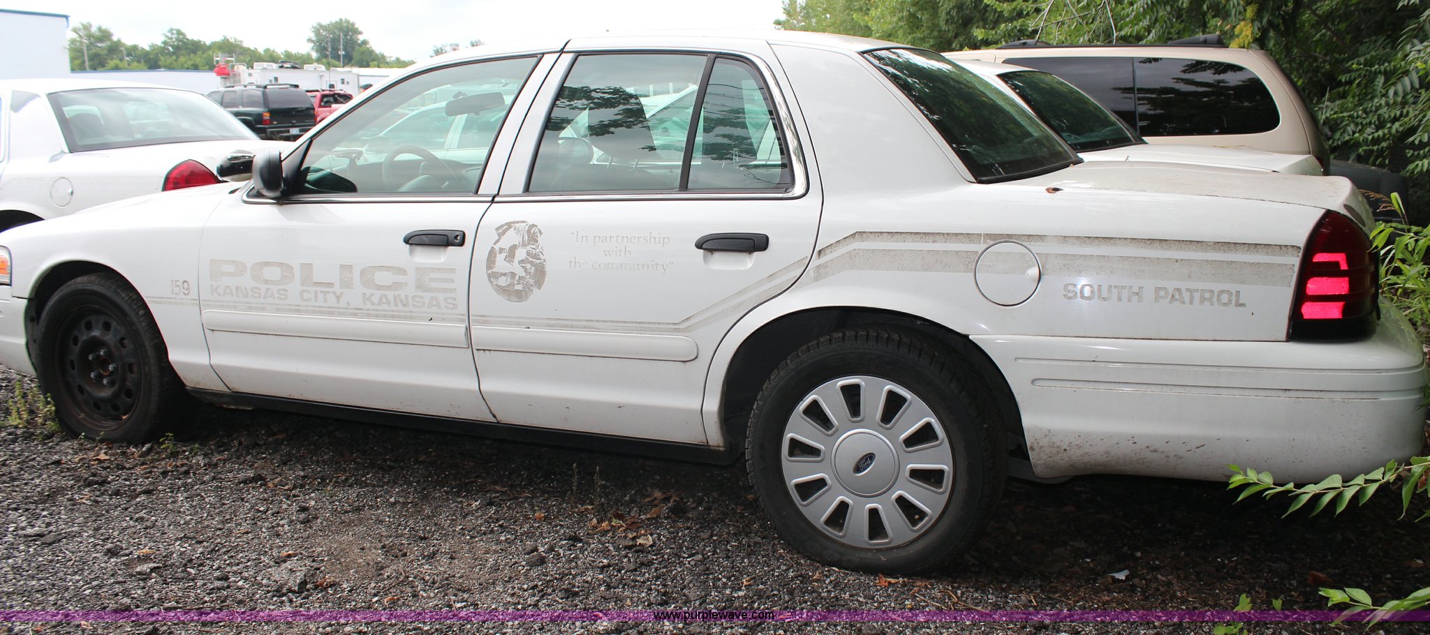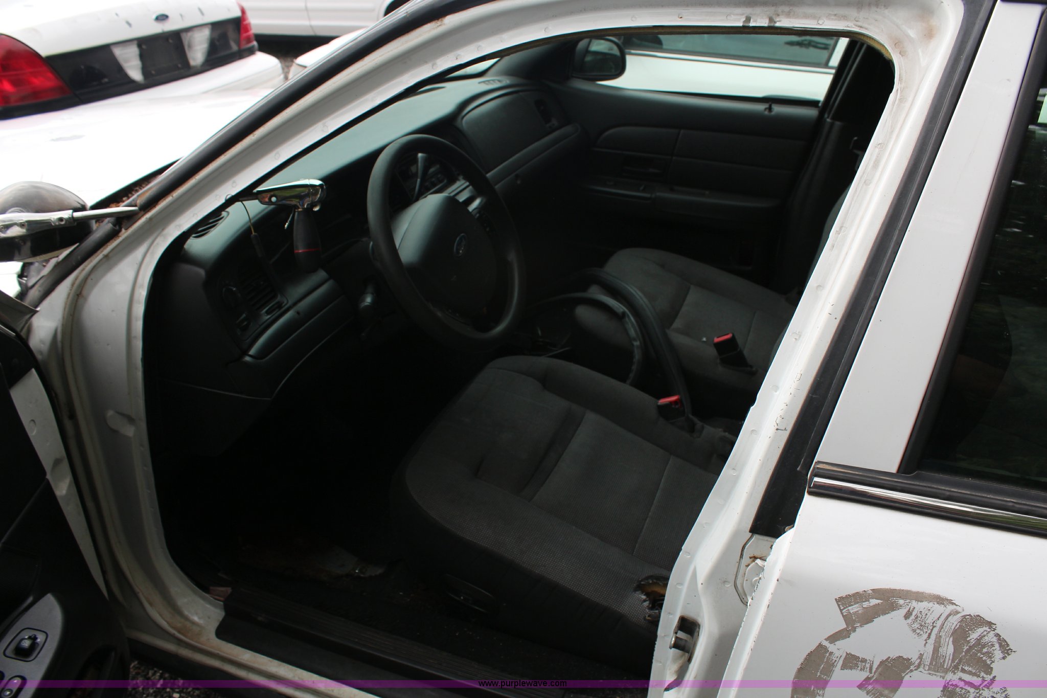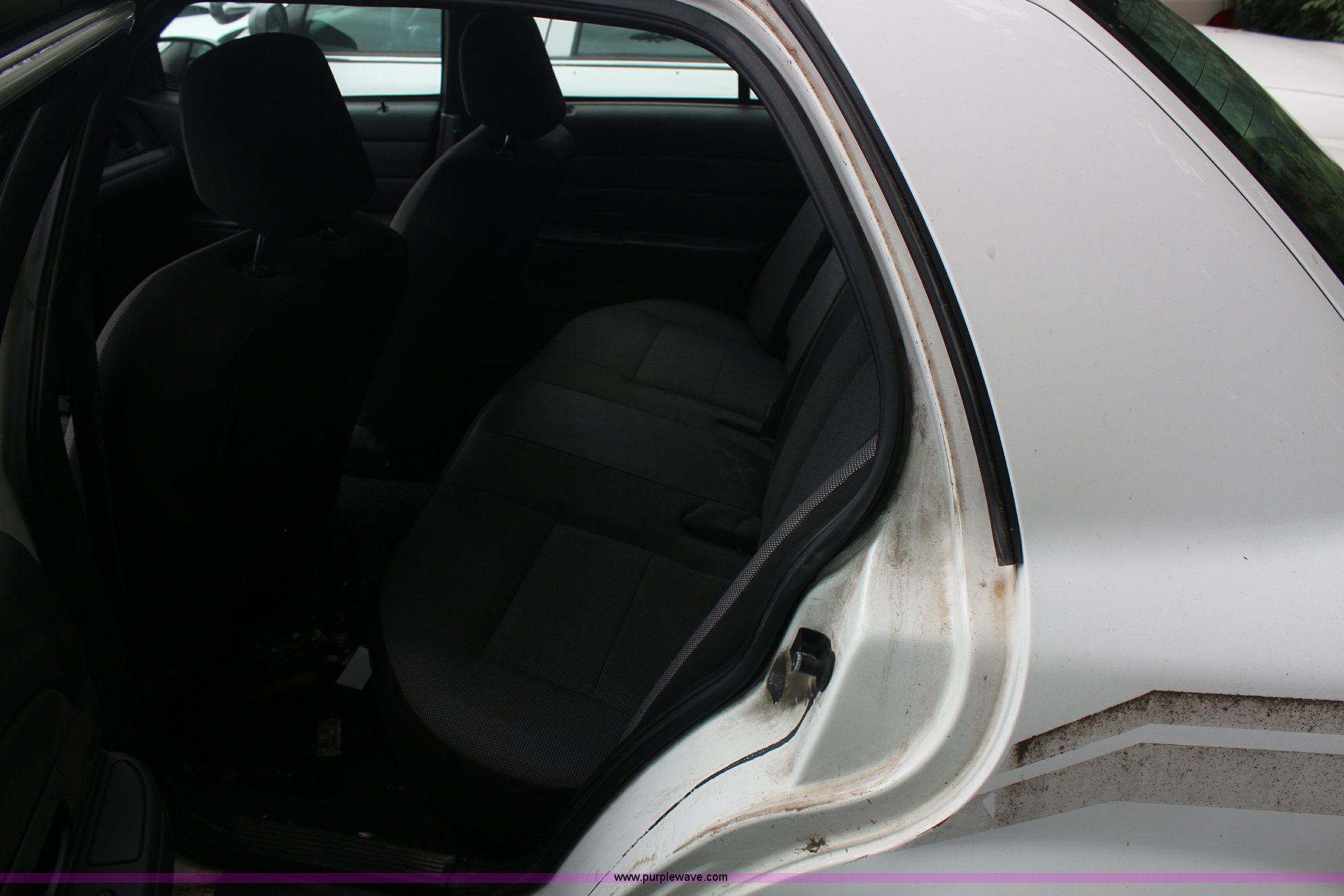 Purple Wave is selling a used Passenger Vehicle in Kansas. This item is a 2008 Ford Crown Victoria Police Interceptor with the following: 175,150 miles on odometer, 4.6L V8 SOHC 16V gas engine, Automatic transmission, AC and heat, Tilt, Cruise, AM/FM, Power windows, locks, and mirrors, Cloth interior, P235/55R17 tires, Exterior cosmetic damage, Paint faded and peeling, TPMS light is on, Starts and runs