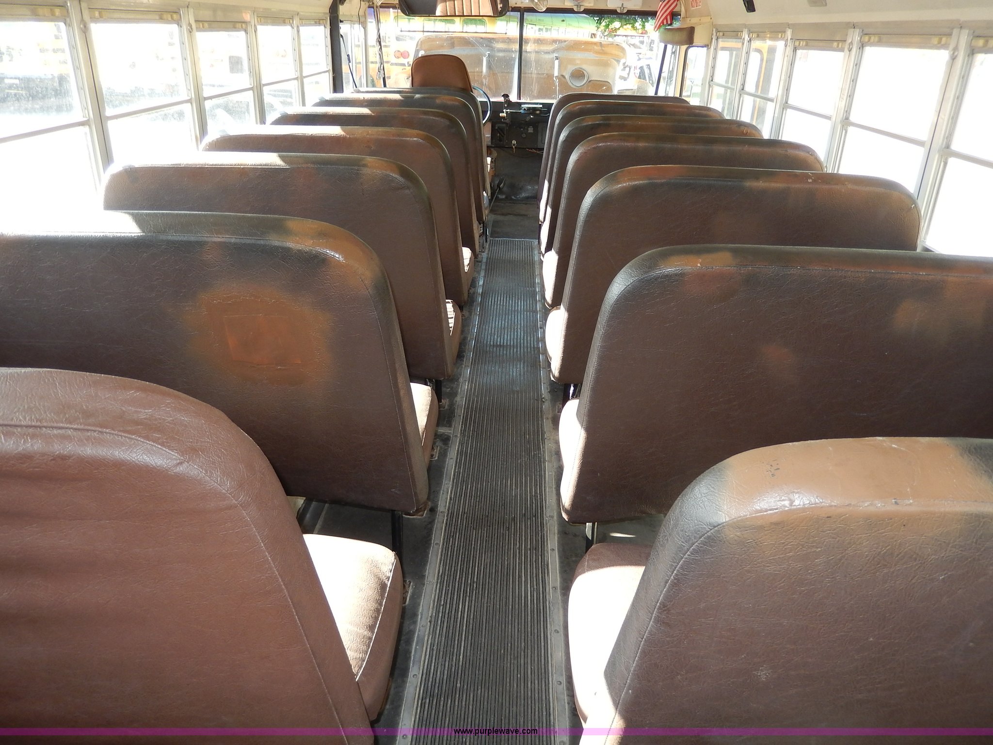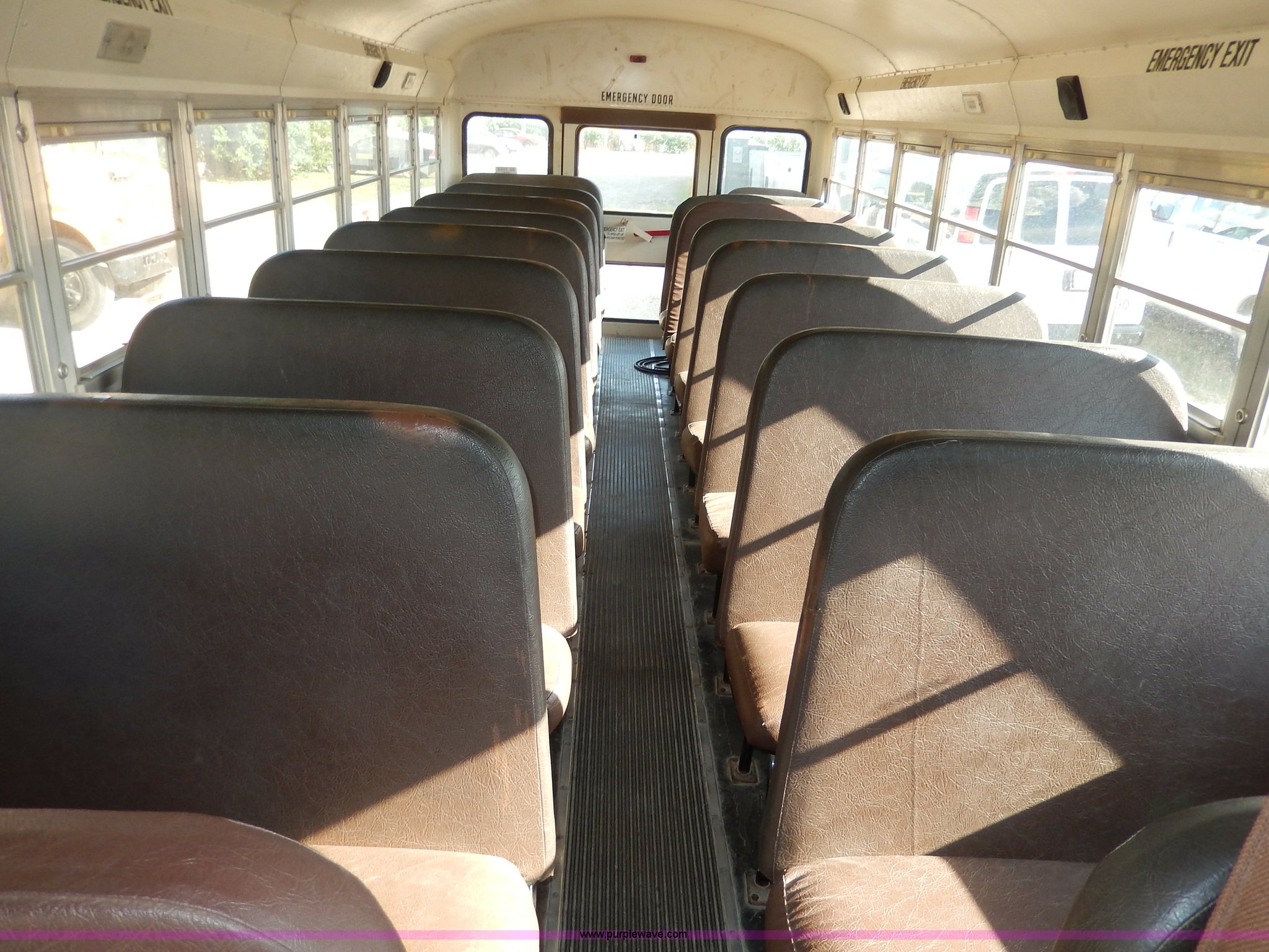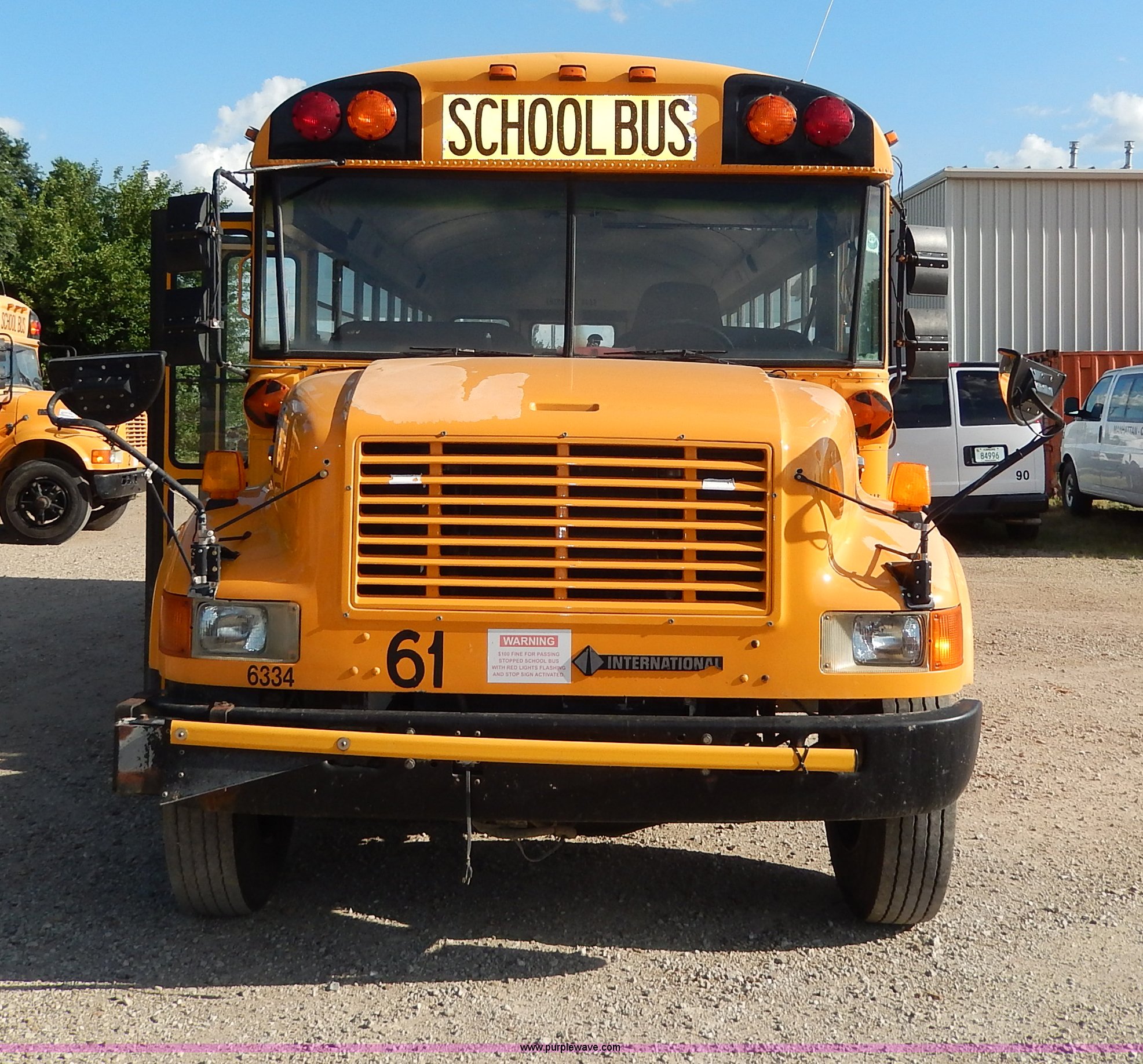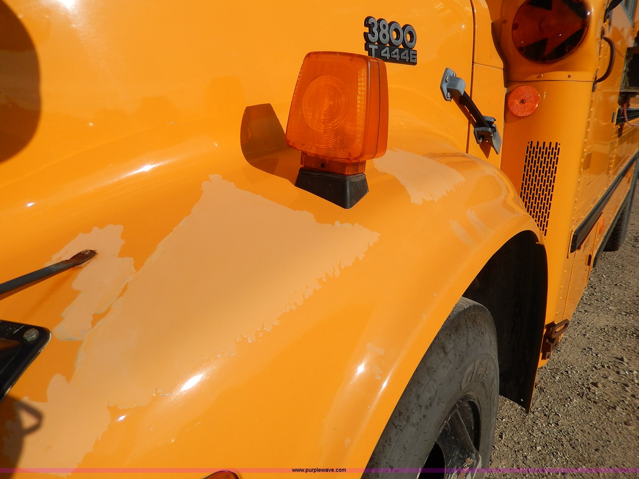 Purple Wave is selling a used Bus in Kansas. This item is a 1998 International 3800 school bus with the following: 59,319 miles on odometer, 9,594 hours on meter, International T444E 7.3L V8 diesel engine, Automatic transmission, Heat, AM/FM, Heated mirrors, Manual windows and locks, Cloth driver's interior, Vinyl passenger interior, 47 passenger capacity, Block heater, Front and rear tow hooks, Backup alarm, 10R22.5 tires, GVWR 25,500 lbs, Rust, Paint peeling