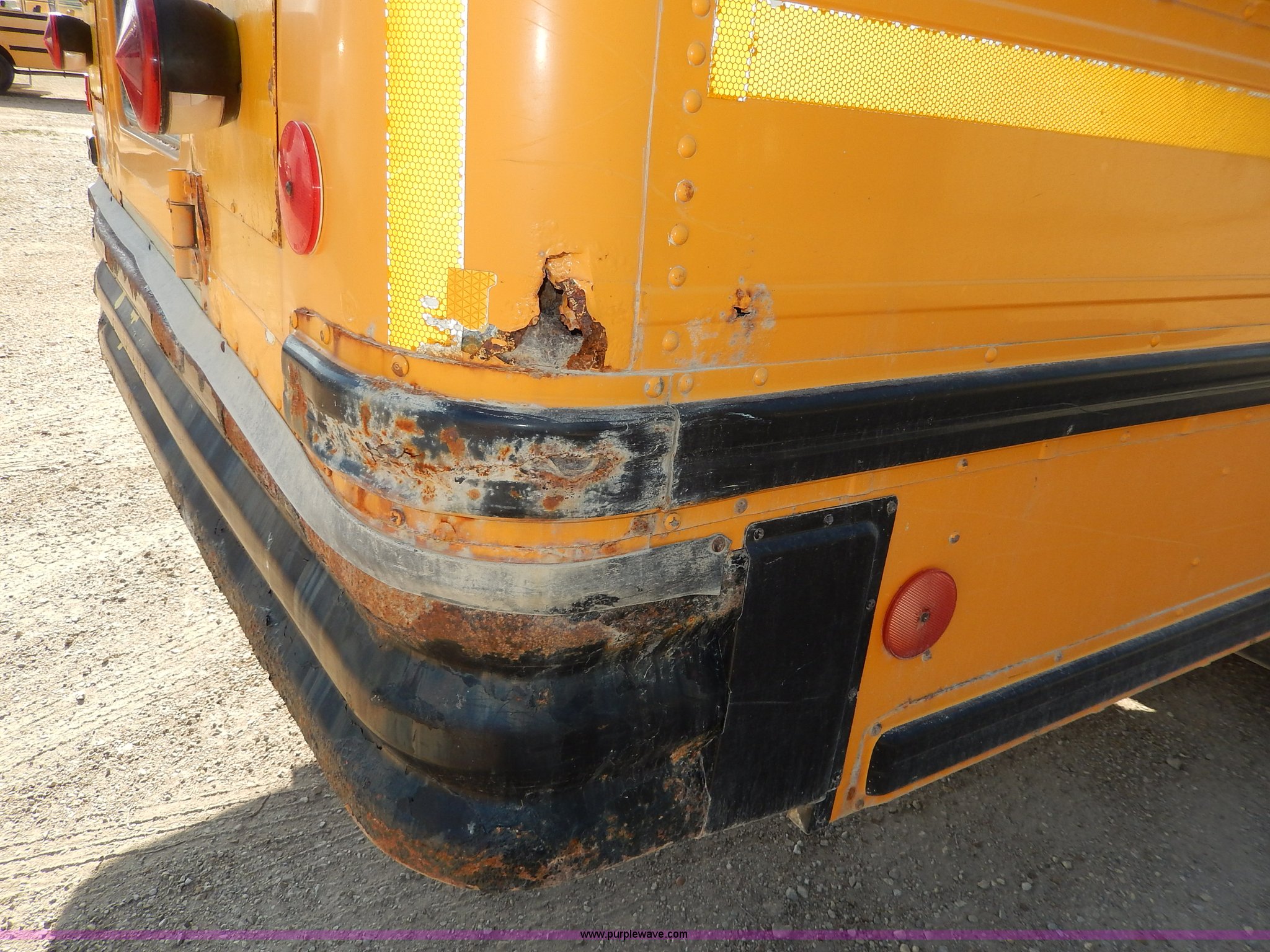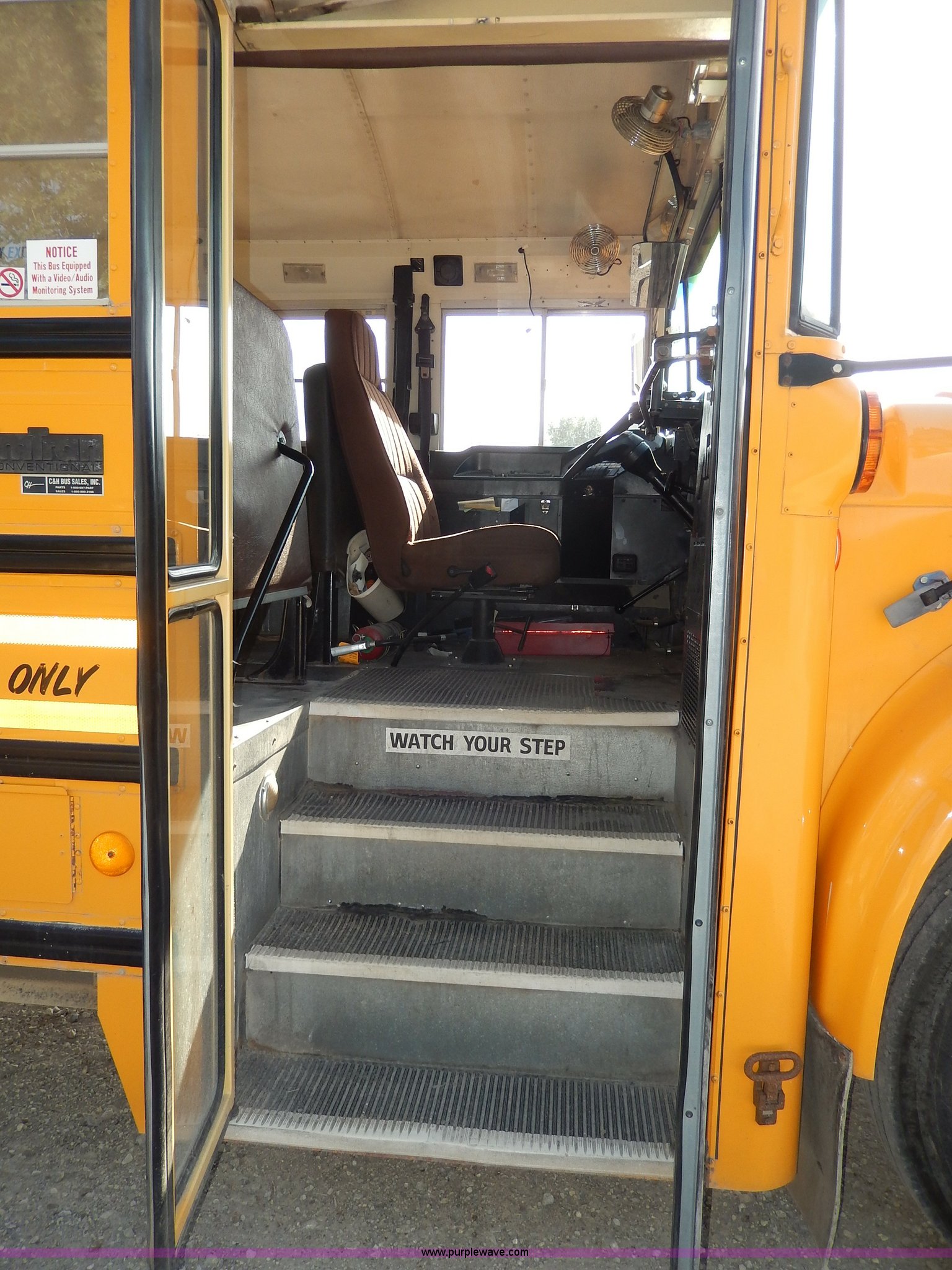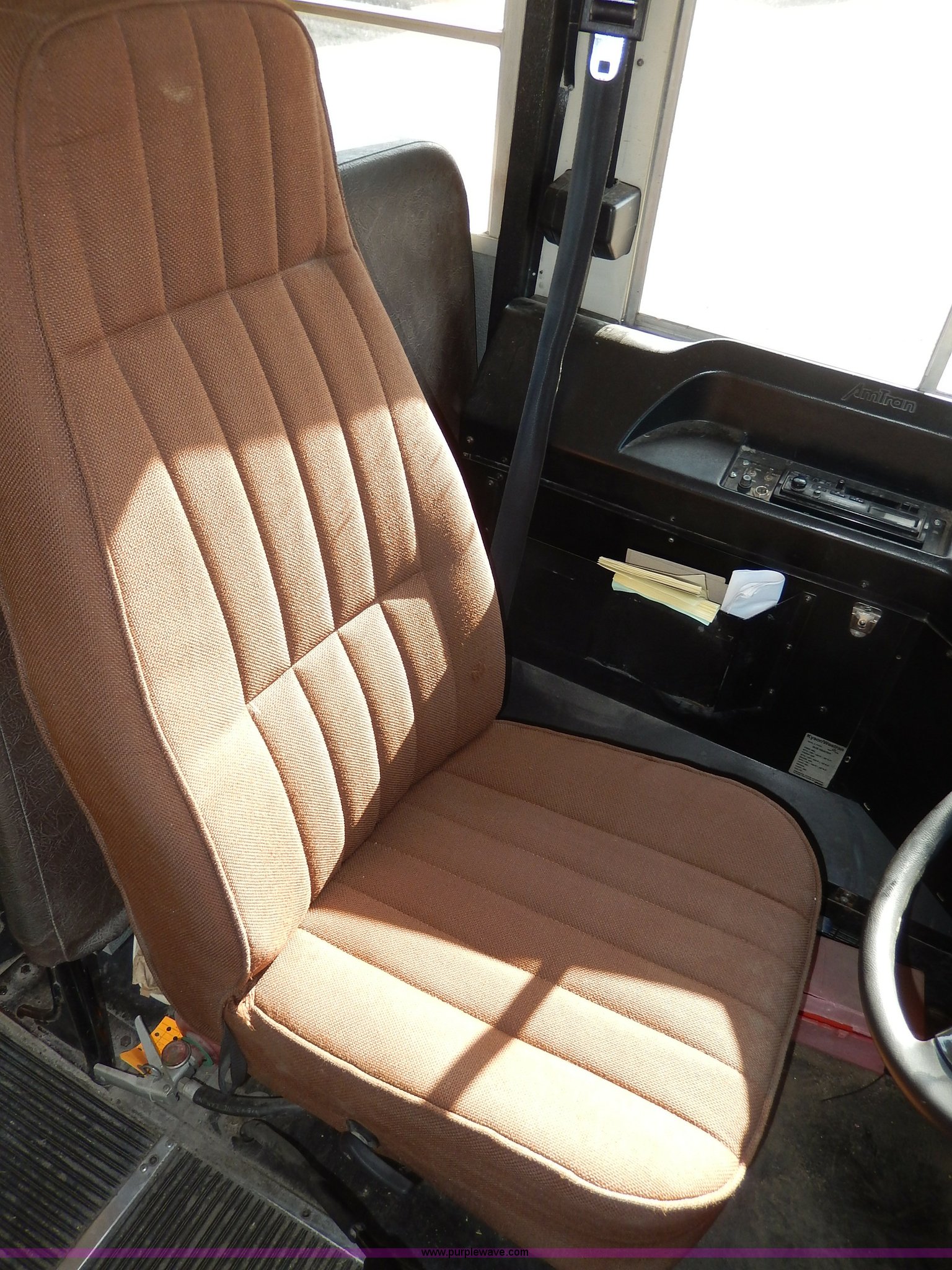 Purple Wave is selling a used Bus in Kansas. This item is a 1998 International 3800 school bus with the following: 59,319 miles on odometer, 9,594 hours on meter, International T444E 7.3L V8 diesel engine, Automatic transmission, Heat, AM/FM, Heated mirrors, Manual windows and locks, Cloth driver's interior, Vinyl passenger interior, 47 passenger capacity, Block heater, Front and rear tow hooks, Backup alarm, 10R22.5 tires, GVWR 25,500 lbs, Rust, Paint peeling