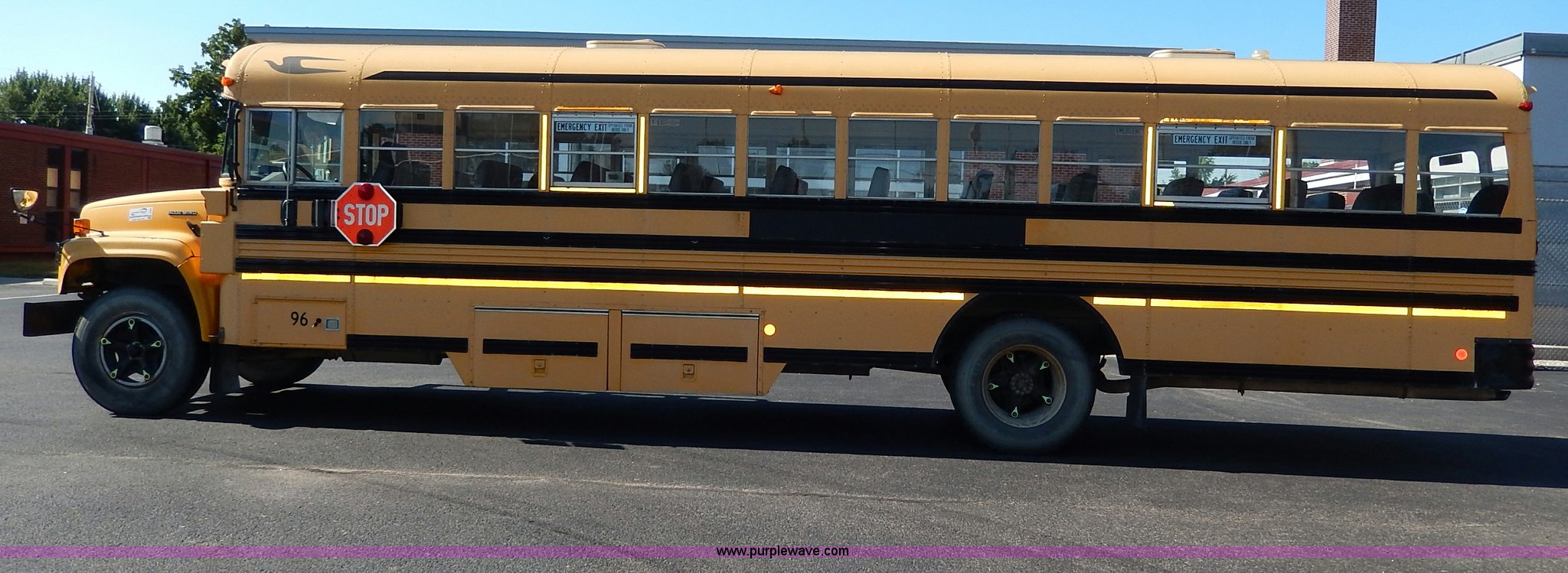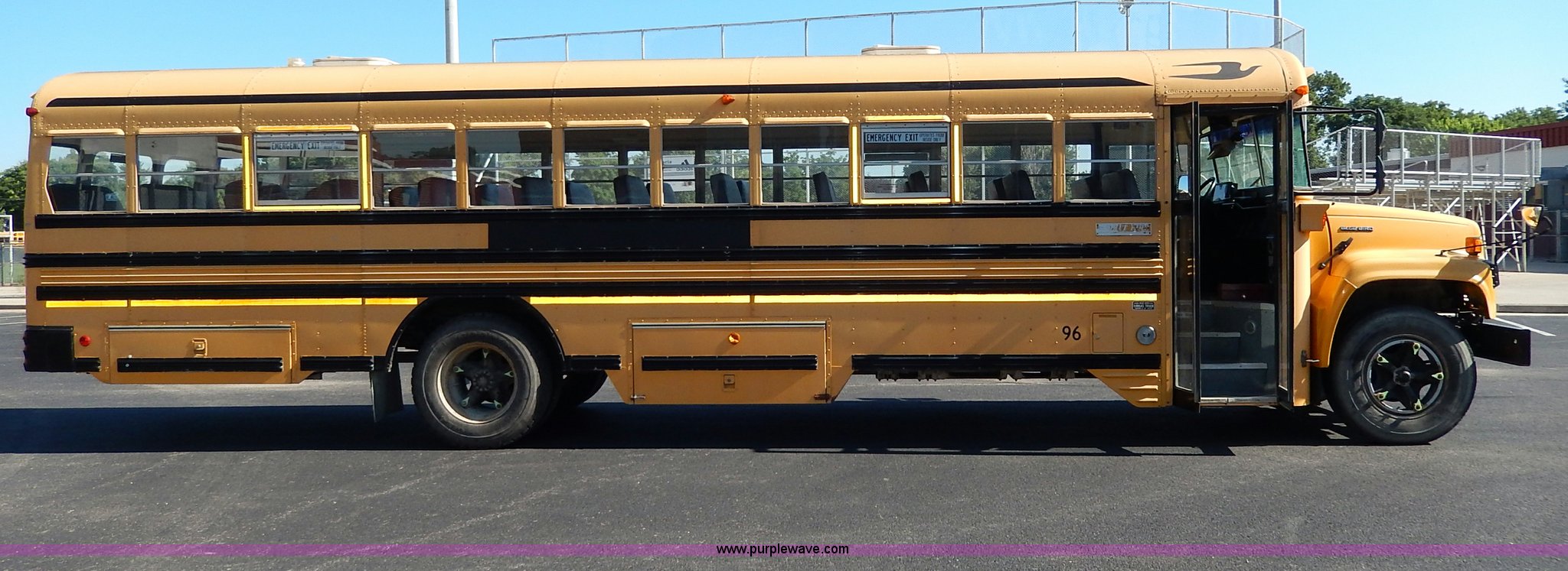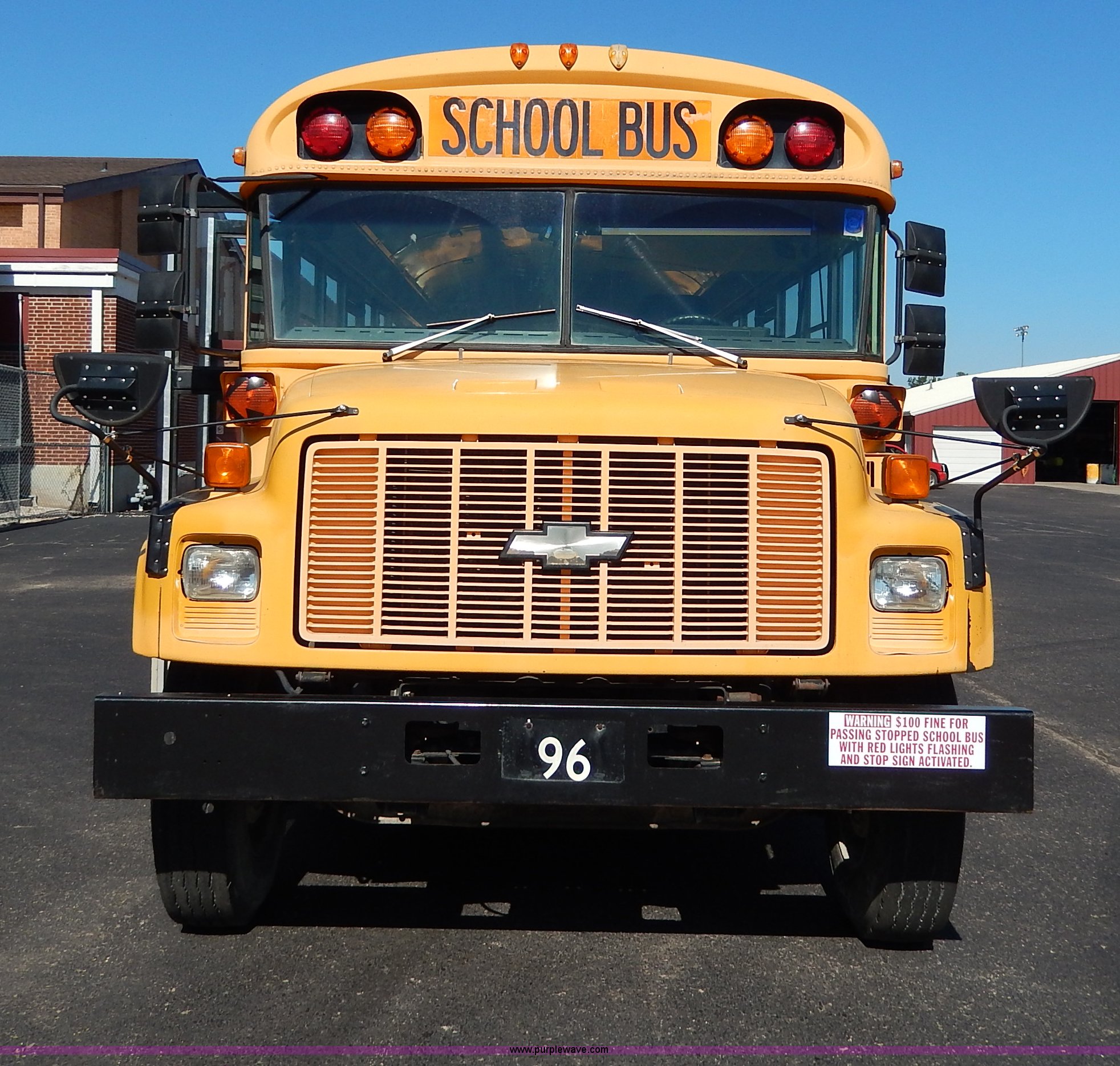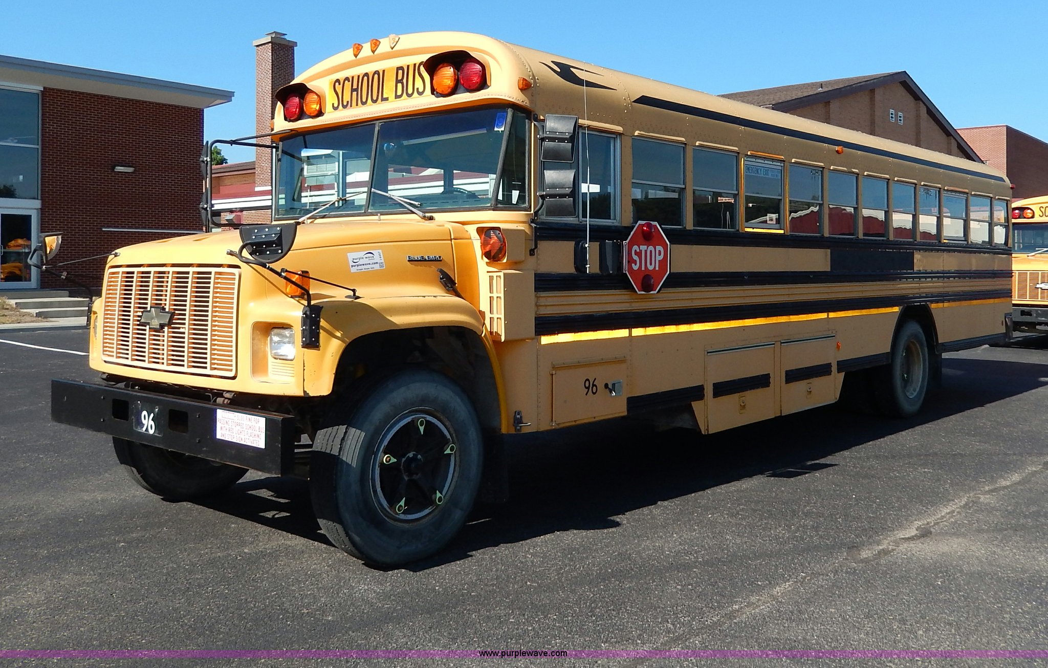 Purple Wave is selling a used Bus in Kansas. This item is a 1997 Chevrolet B7 Blue Bird school bus with the following: 153,480 miles on odometer, 6.0L V8 gas engine, Automatic transmission, Heat, Manual windows and locks, Vinyl interior, 65 passenger capacity, (4) underside storage compartments, Rear tow hooks, Hi-idle button, 10R22.5 tires, GVWR 27,060 lbs, Interior/exterior cosmetic damage, Paint peeling/chipping, Unit# 96