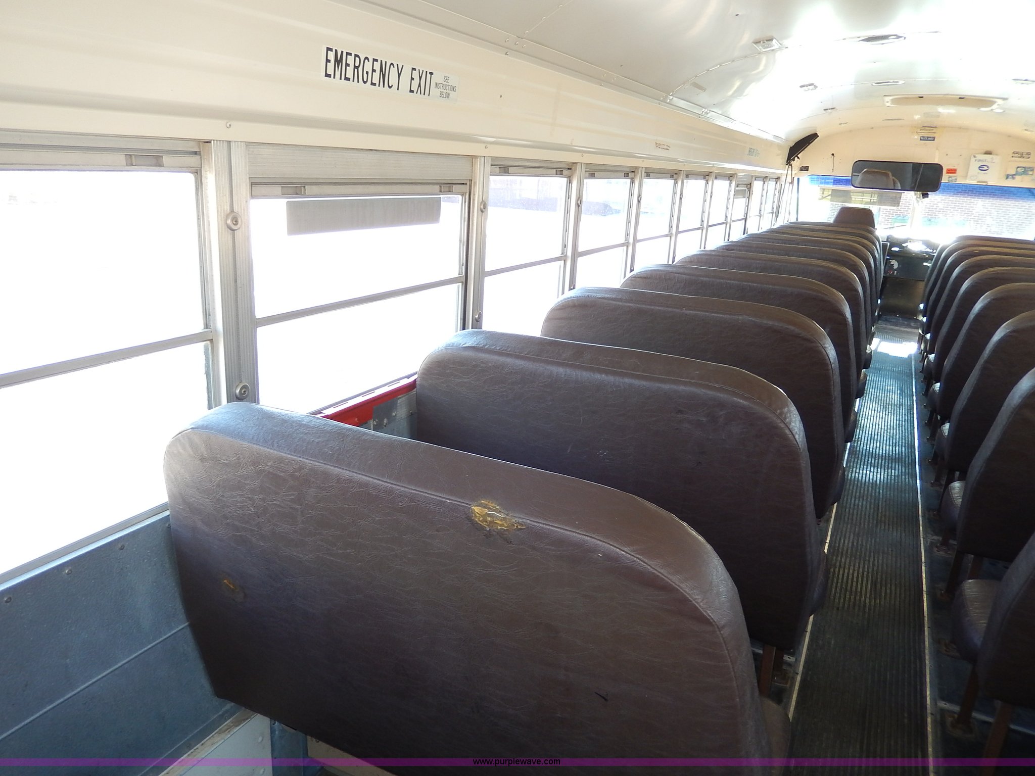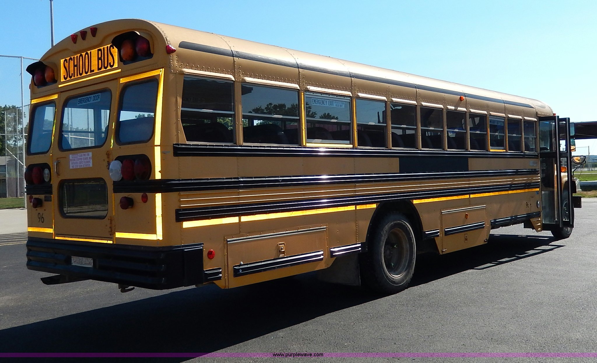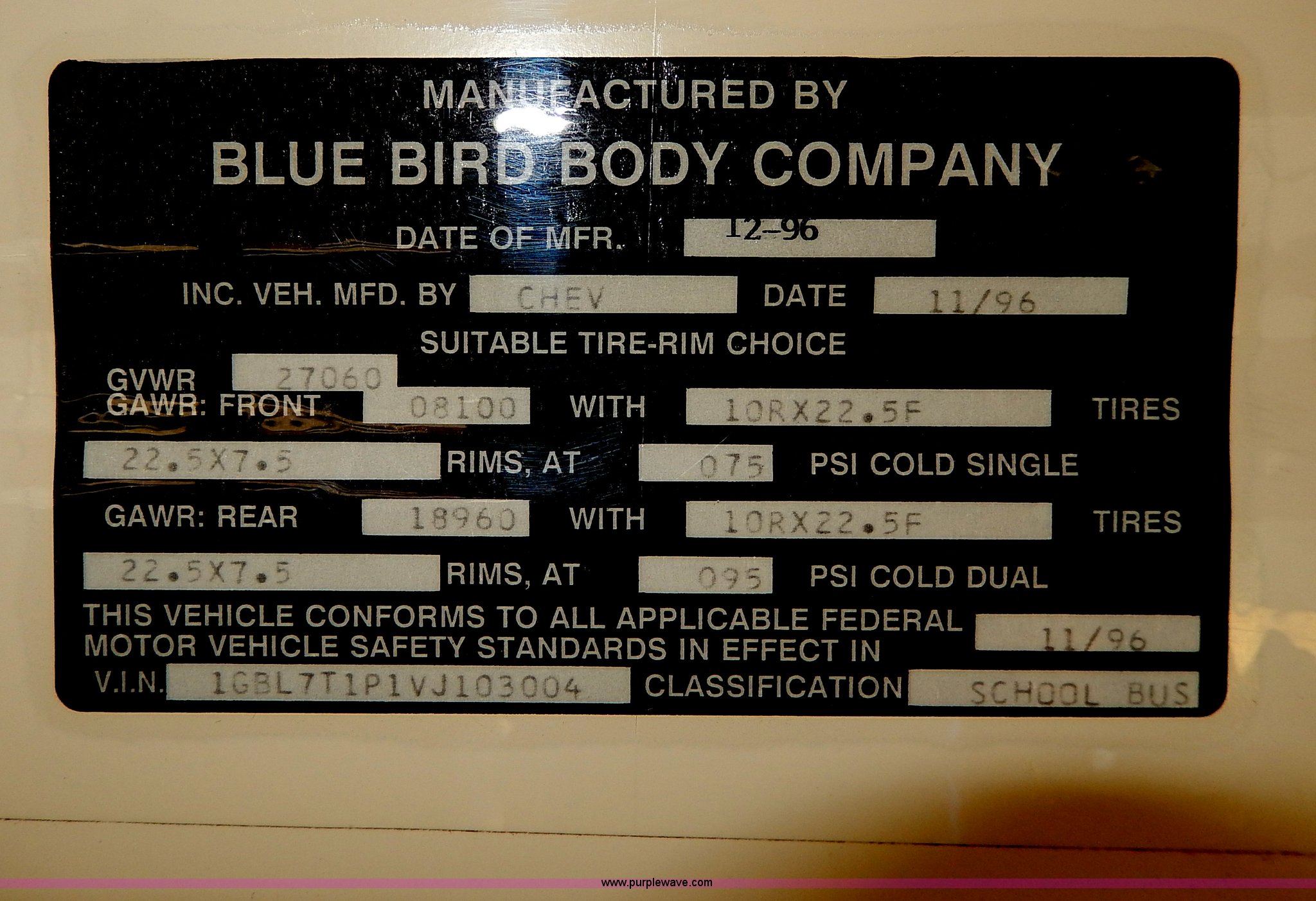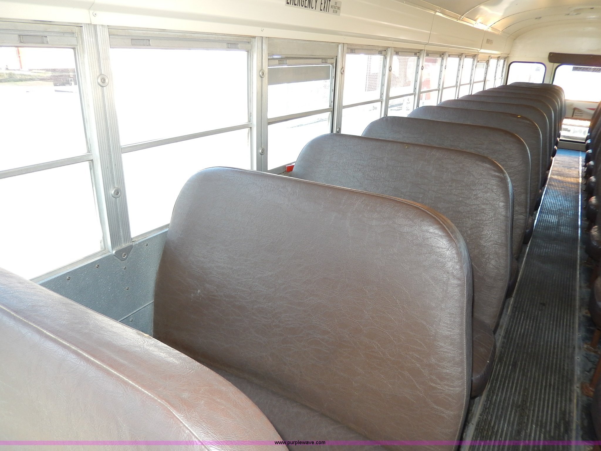 Purple Wave is selling a used Bus in Kansas. This item is a 1997 Chevrolet B7 Blue Bird school bus with the following: 153,480 miles on odometer, 6.0L V8 gas engine, Automatic transmission, Heat, Manual windows and locks, Vinyl interior, 65 passenger capacity, (4) underside storage compartments, Rear tow hooks, Hi-idle button, 10R22.5 tires, GVWR 27,060 lbs, Interior/exterior cosmetic damage, Paint peeling/chipping, Unit# 96