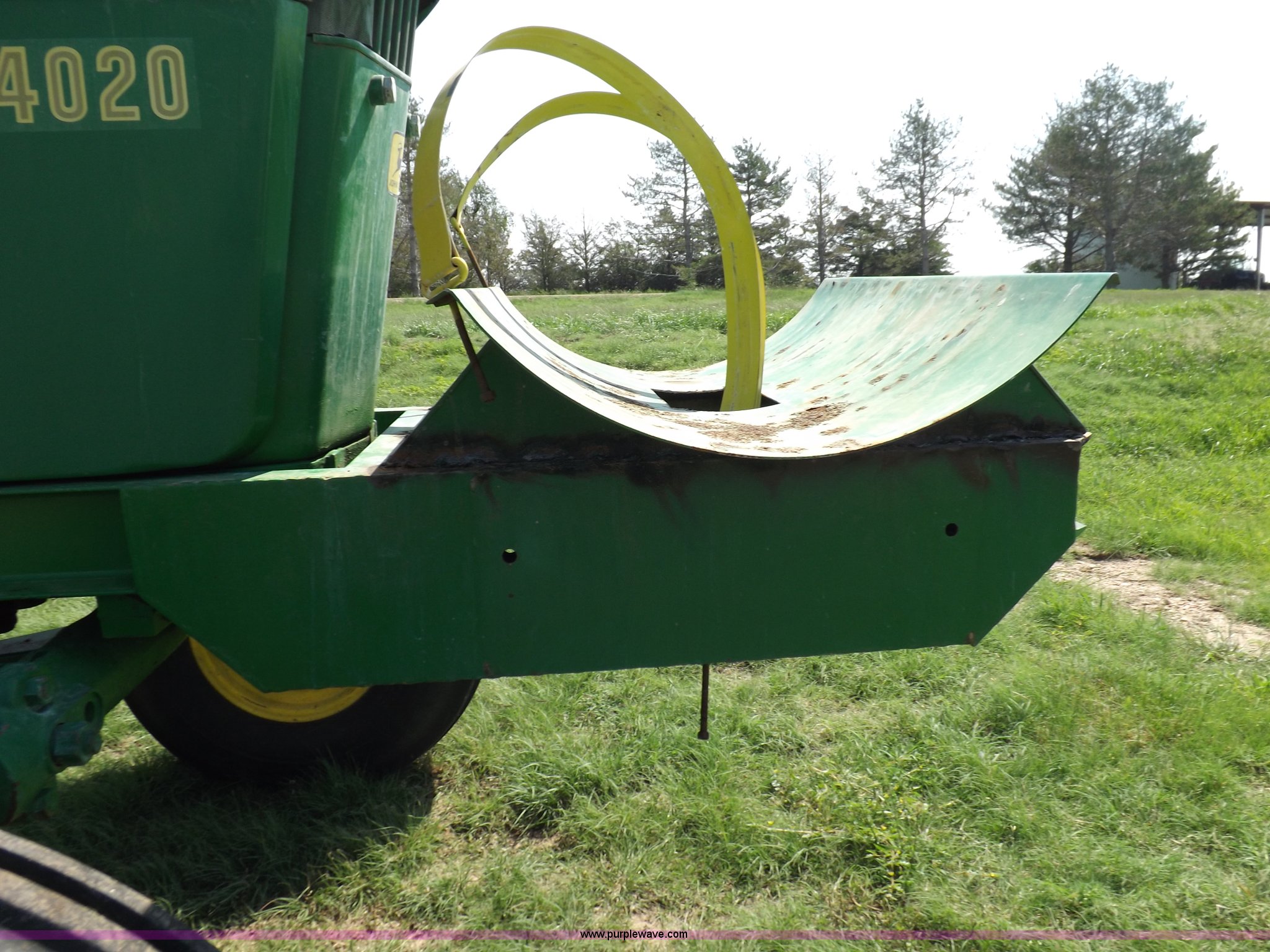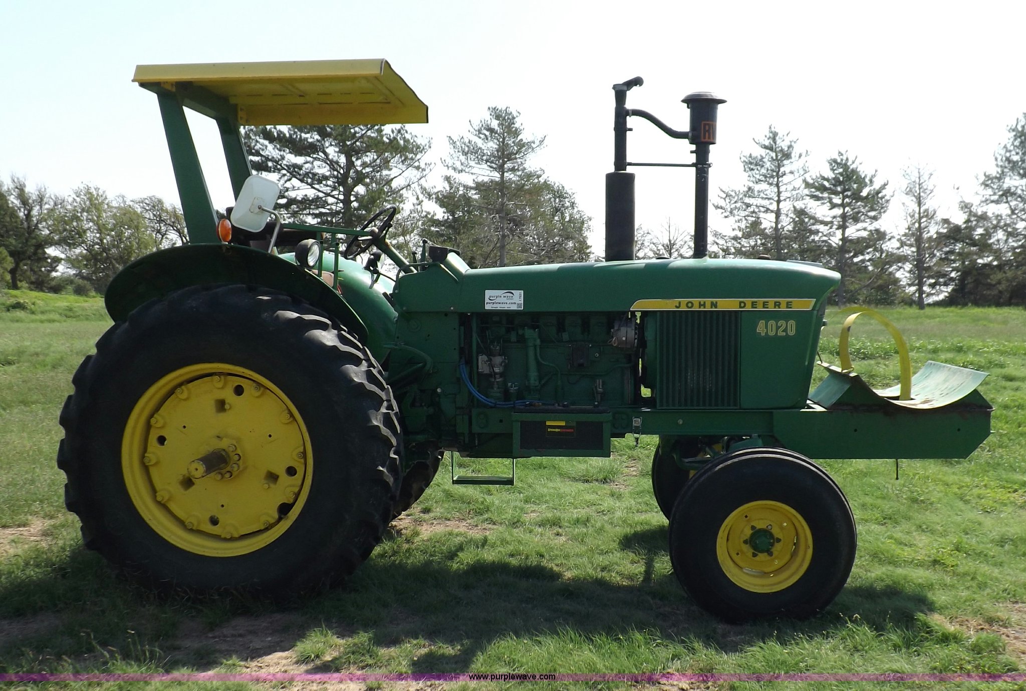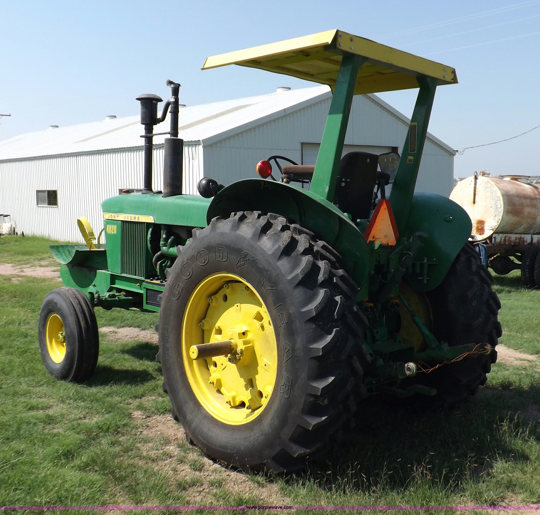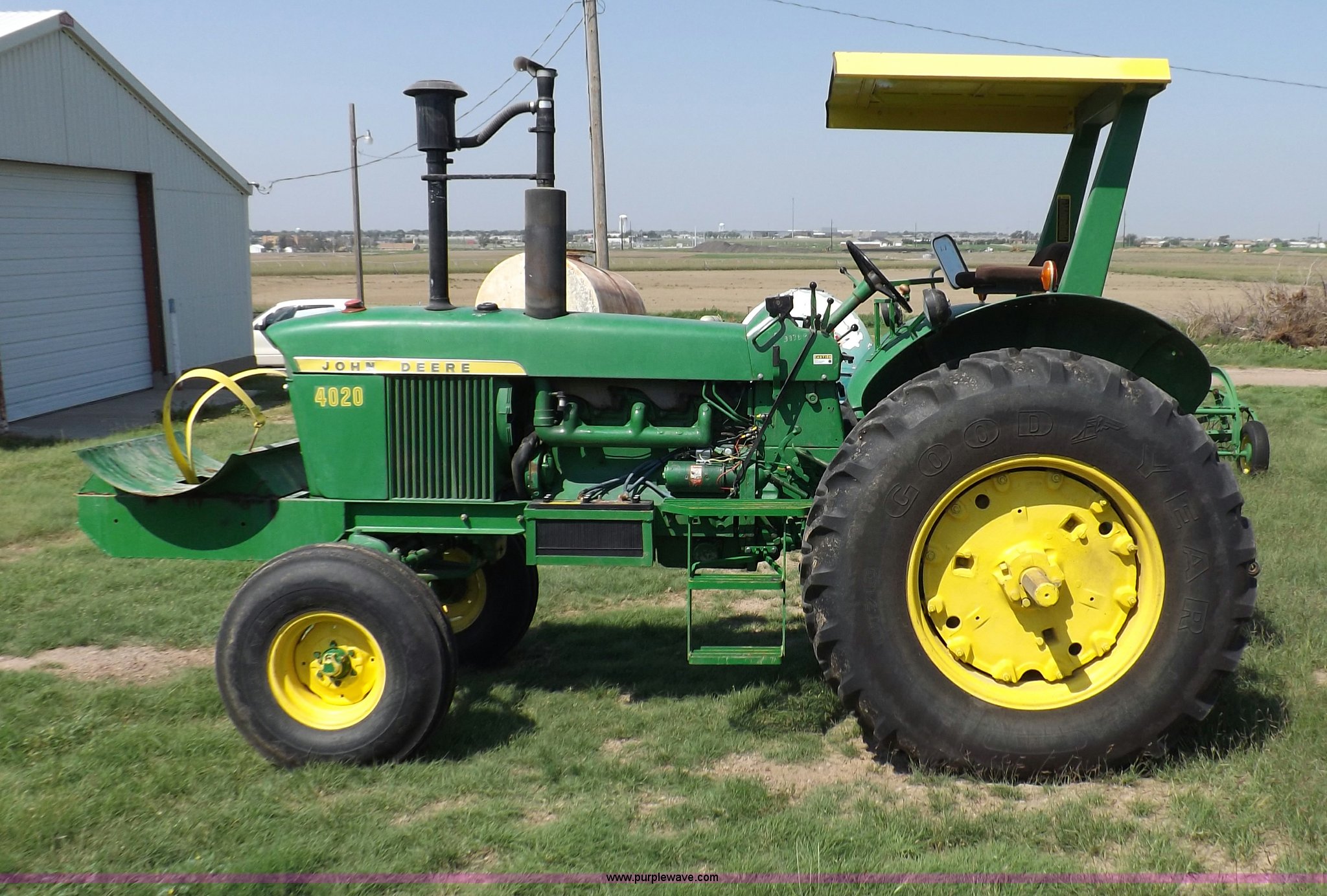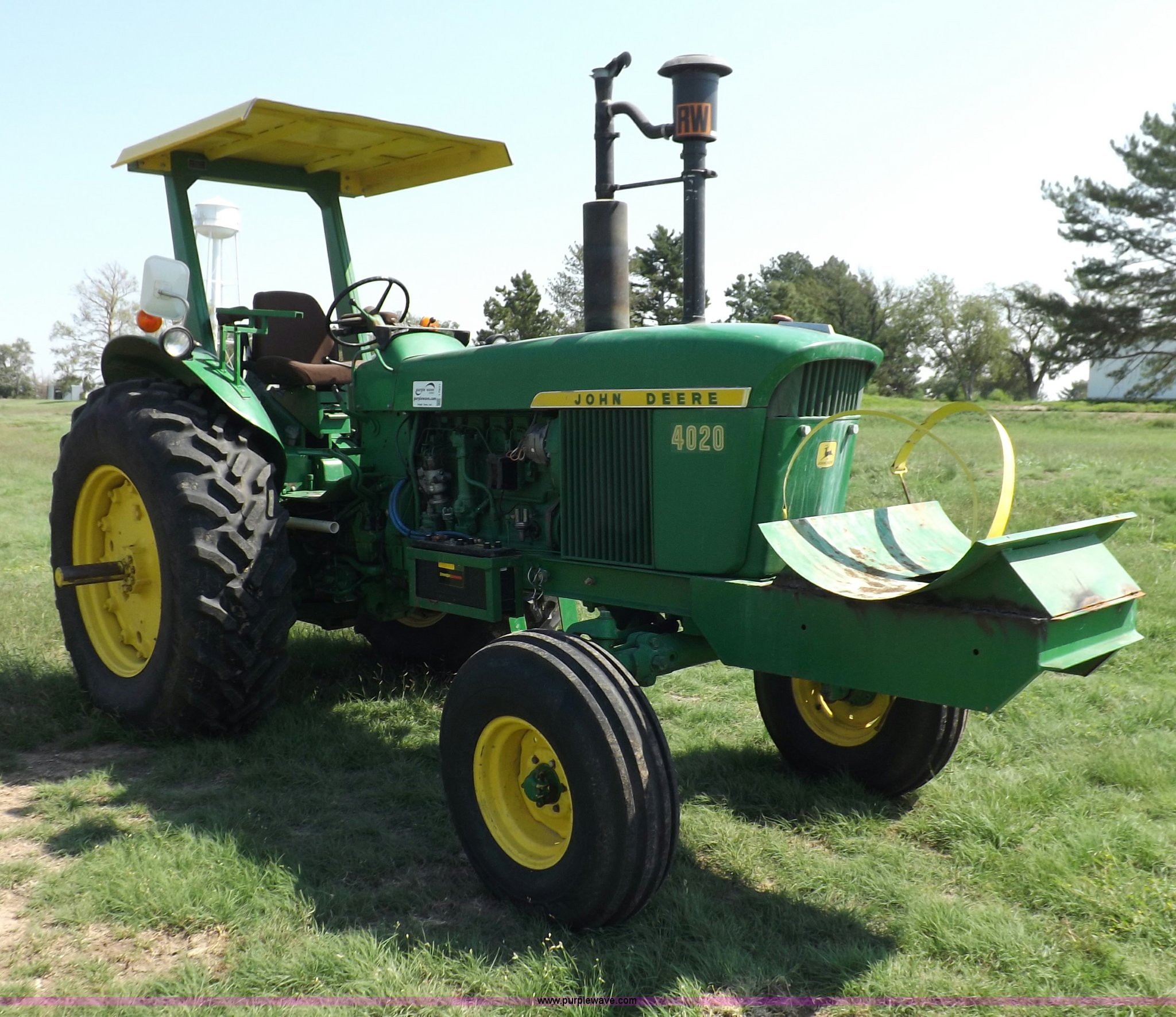 Purple Wave is selling a used Tractor in Kansas. This item is a John Deere 4020 tractor with the following: 499 hours on meter, John Deere six cylinder diesel engine, Powershift transmission, 8F-4R gears, Spring suspension seat, Three point, Draw bar, Auxiliary outlet, 1000 PTO, Inoperable, Sun shades, Shop built front tank carrier, Wheel weights, 102" wheelbase, 10.00-16 front tires, 18.4R34 rear tires, Serial T213P165106R