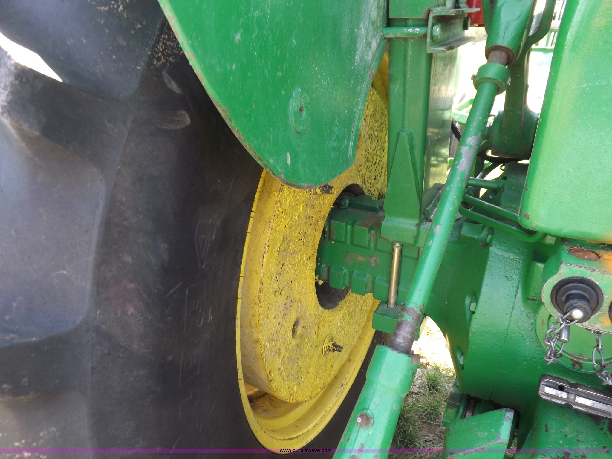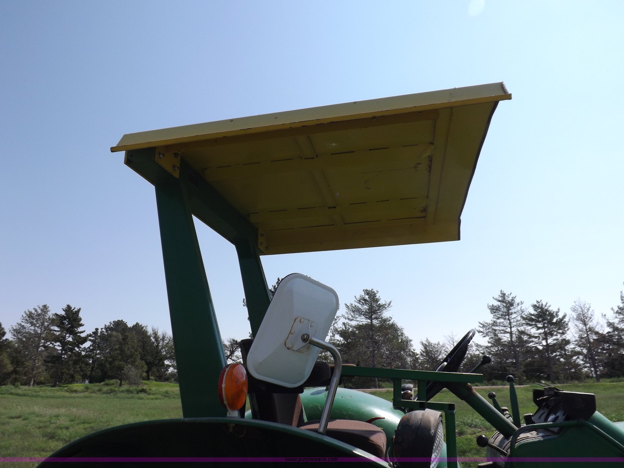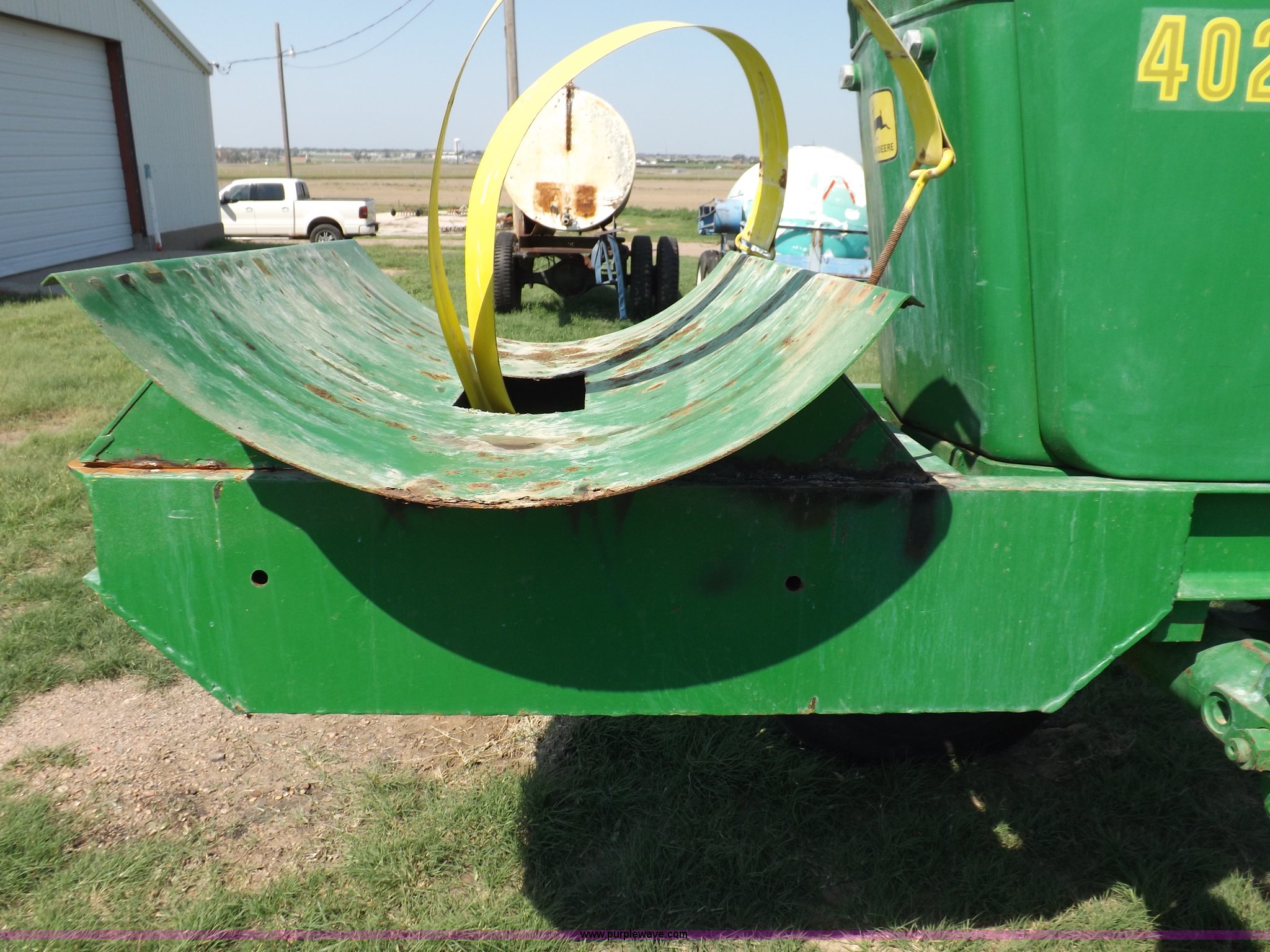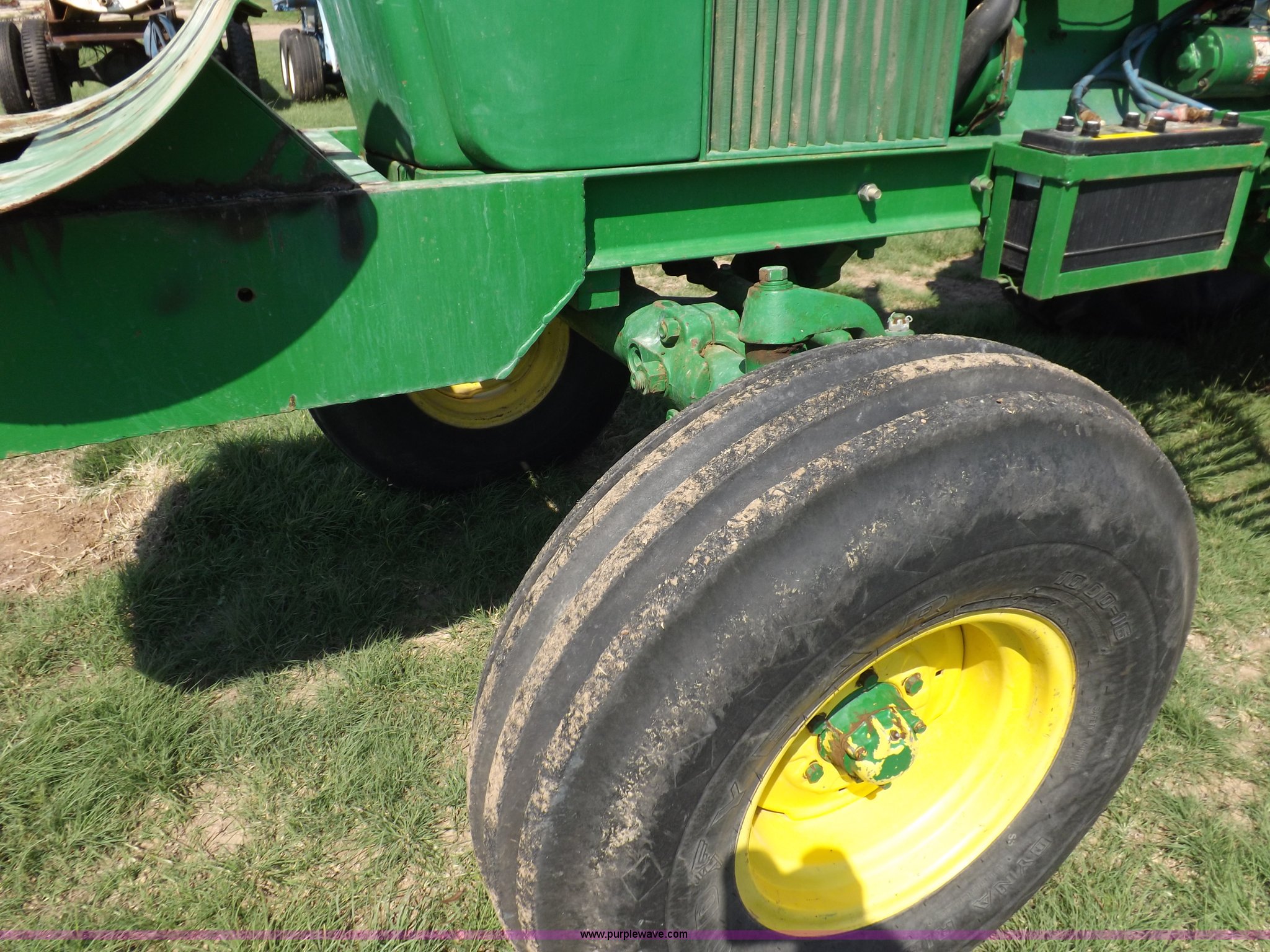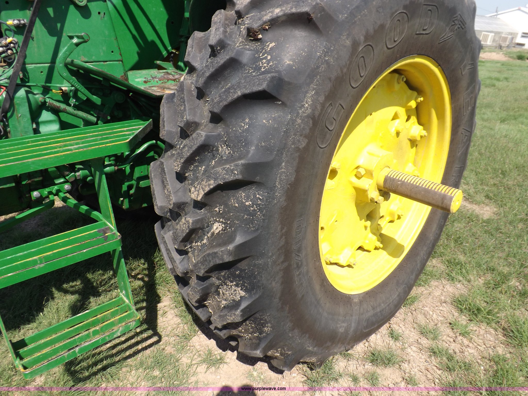Purple Wave is selling a used Tractor in Kansas. This item is a John Deere 4020 tractor with the following: 499 hours on meter, John Deere six cylinder diesel engine, Powershift transmission, 8F-4R gears, Spring suspension seat, Three point, Draw bar, Auxiliary outlet, 1000 PTO, Inoperable, Sun shades, Shop built front tank carrier, Wheel weights, 102" wheelbase, 10.00-16 front tires, 18.4R34 rear tires, Serial T213P165106R