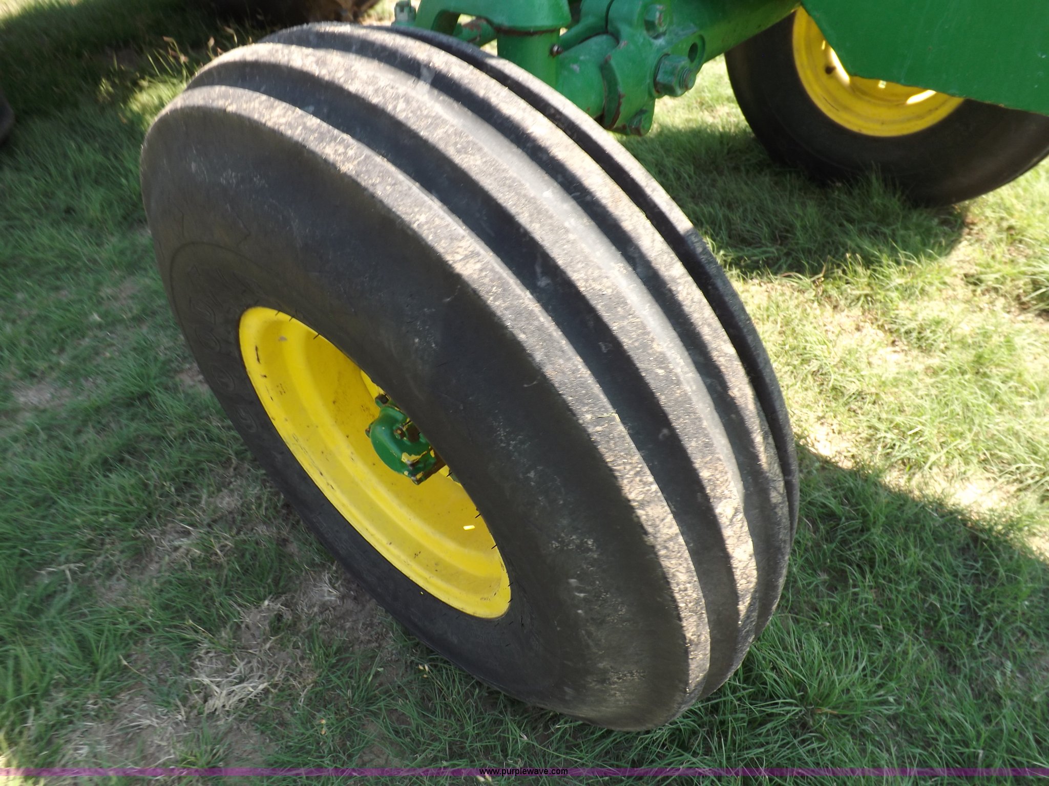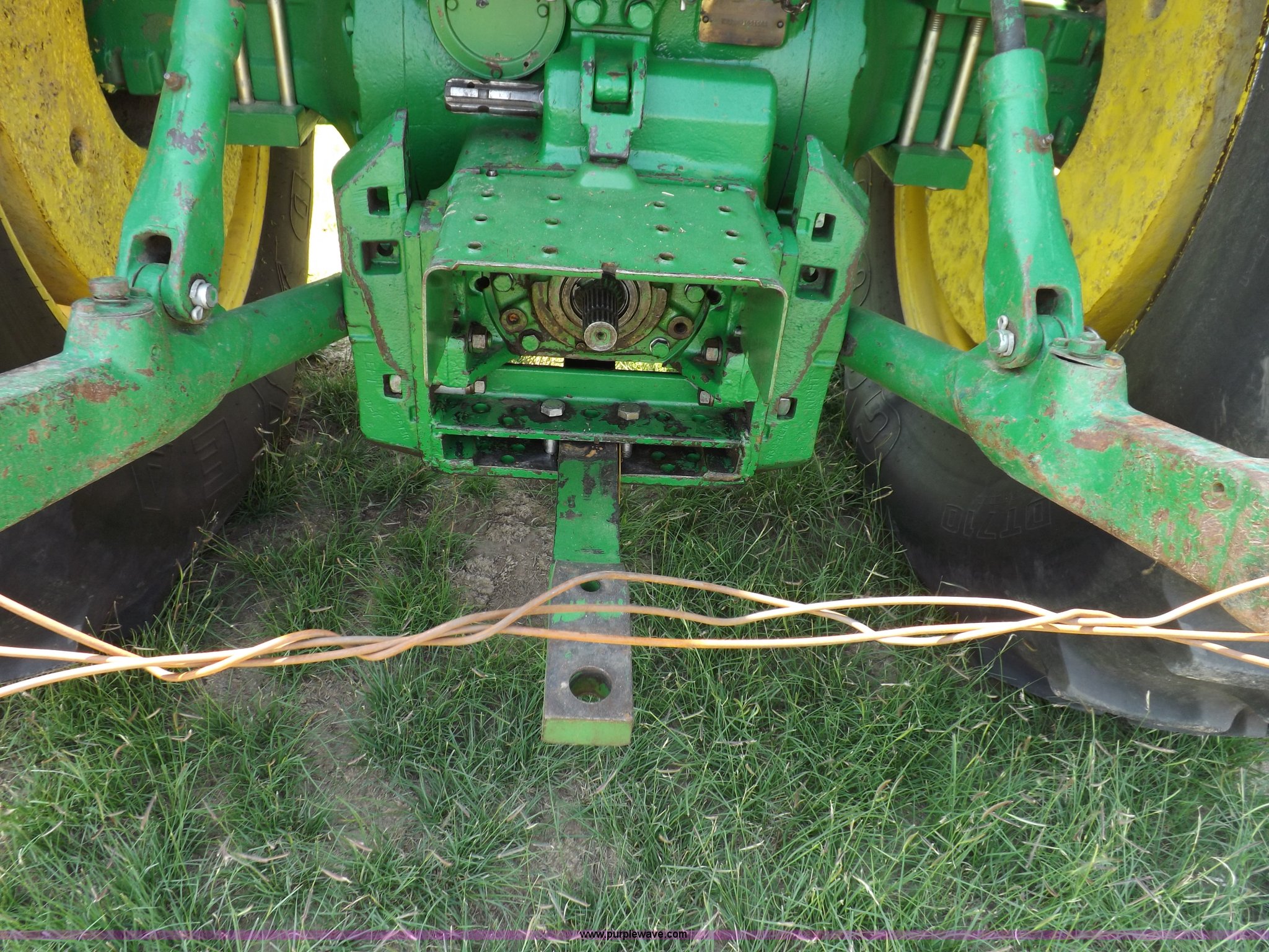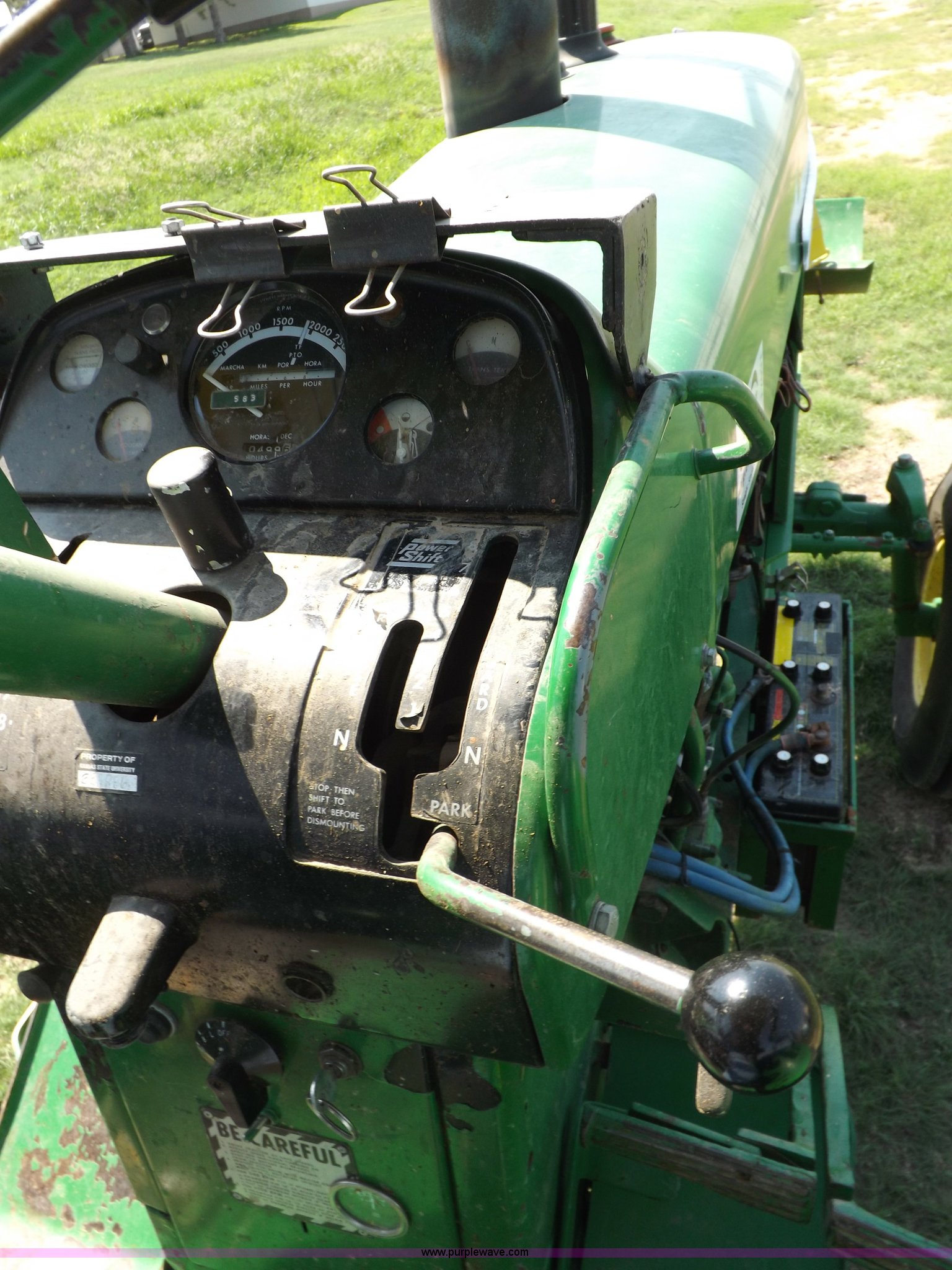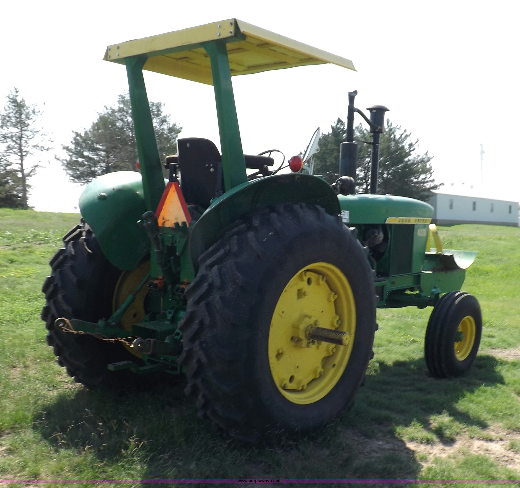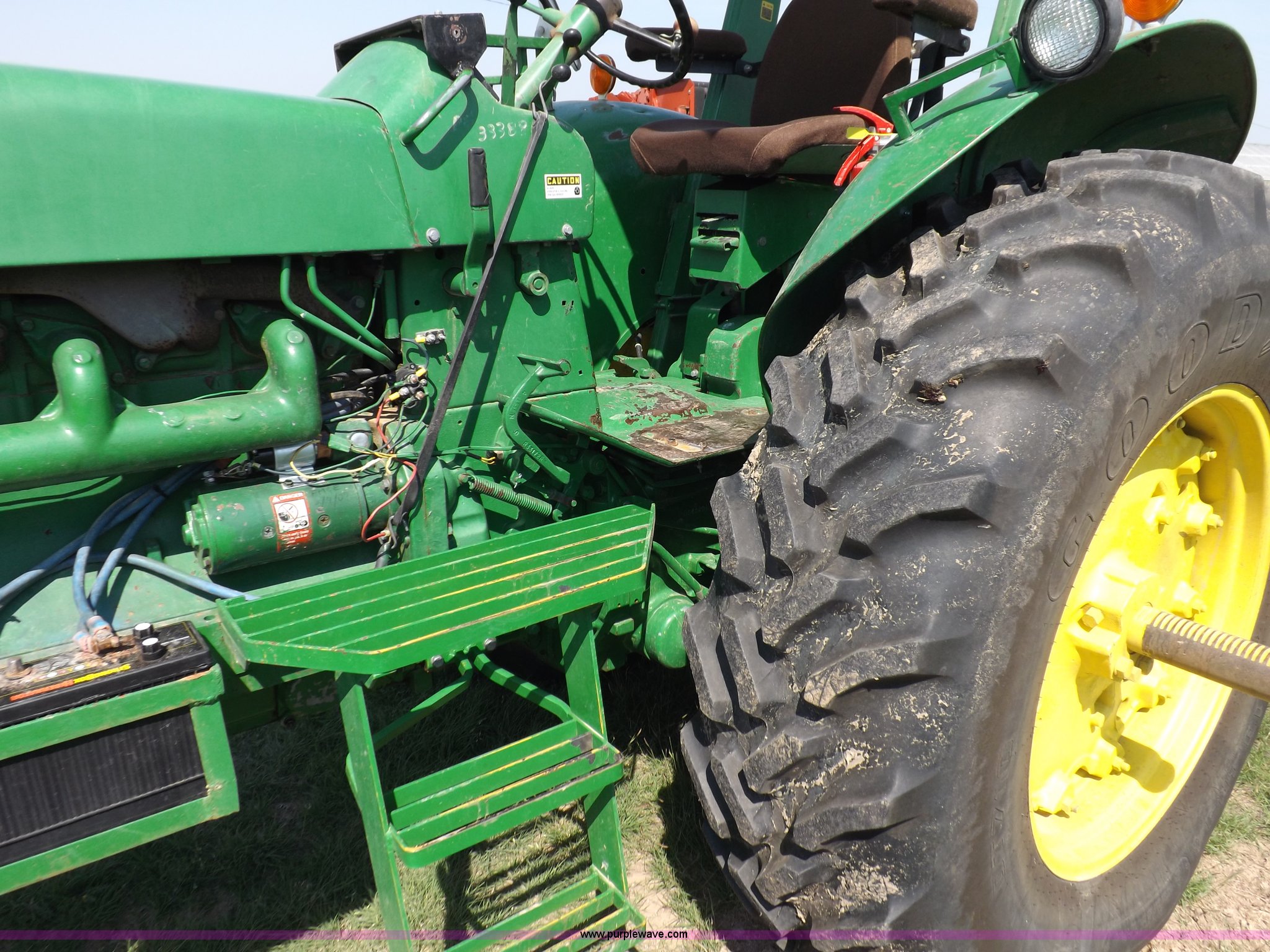 Purple Wave is selling a used Tractor in Kansas. This item is a John Deere 4020 tractor with the following: 499 hours on meter, John Deere six cylinder diesel engine, Powershift transmission, 8F-4R gears, Spring suspension seat, Three point, Draw bar, Auxiliary outlet, 1000 PTO, Inoperable, Sun shades, Shop built front tank carrier, Wheel weights, 102" wheelbase, 10.00-16 front tires, 18.4R34 rear tires, Serial T213P165106R