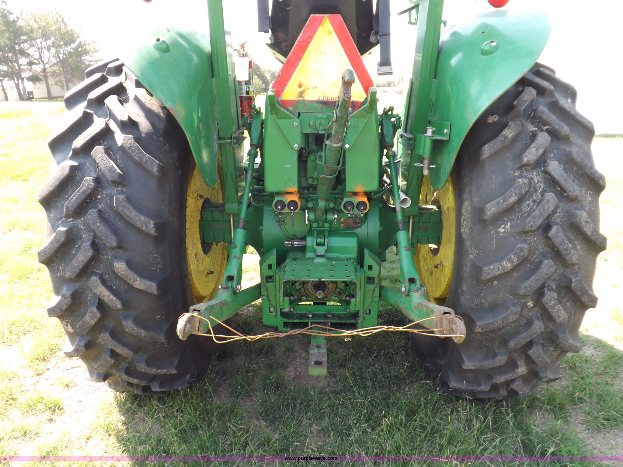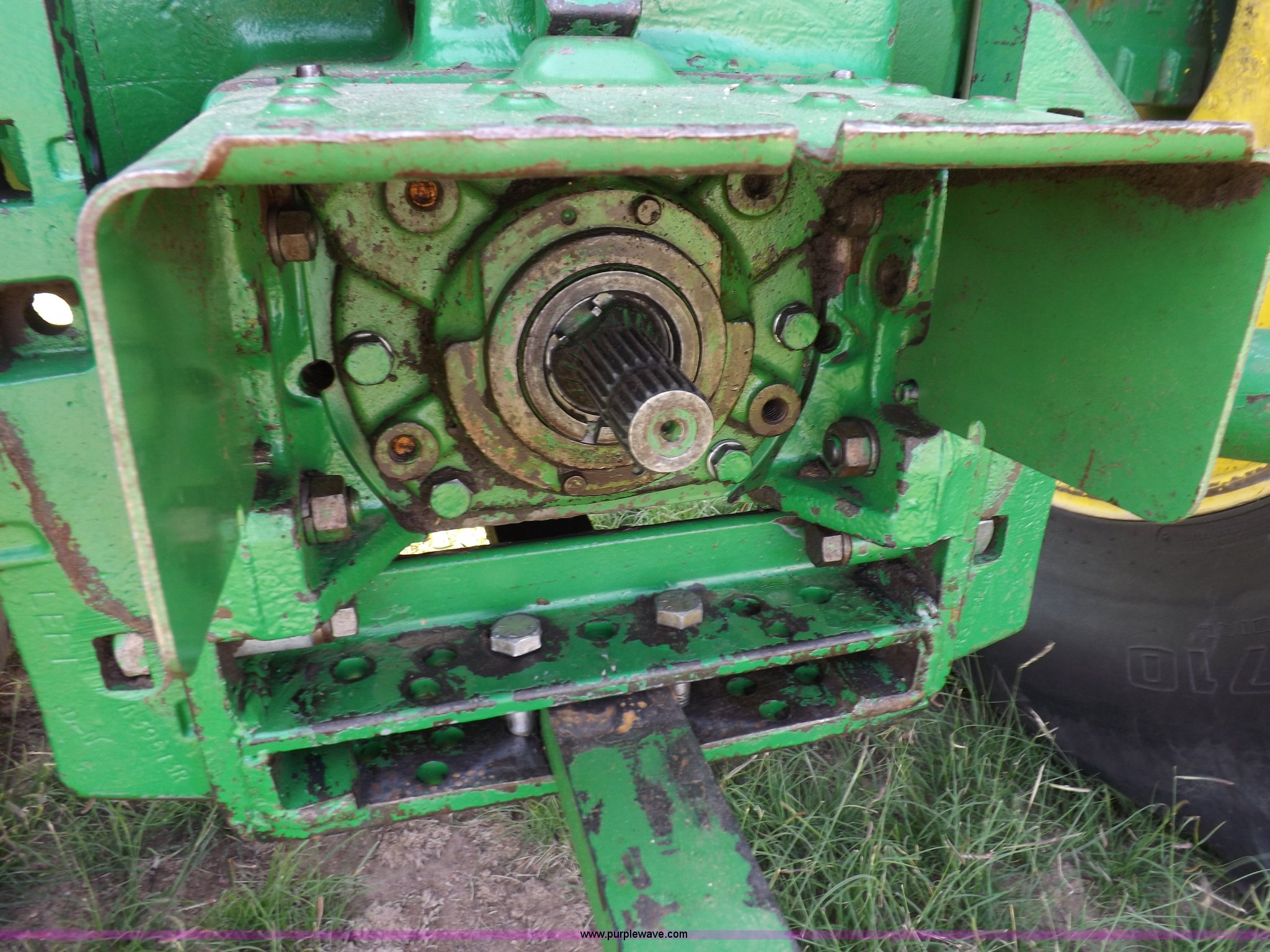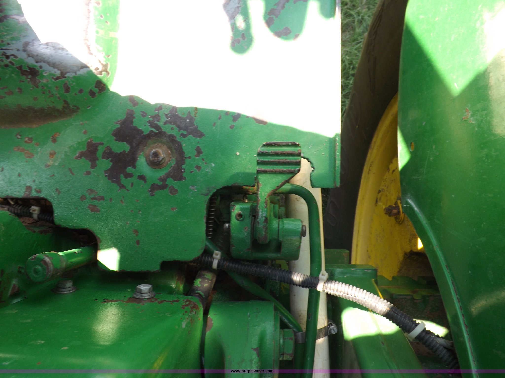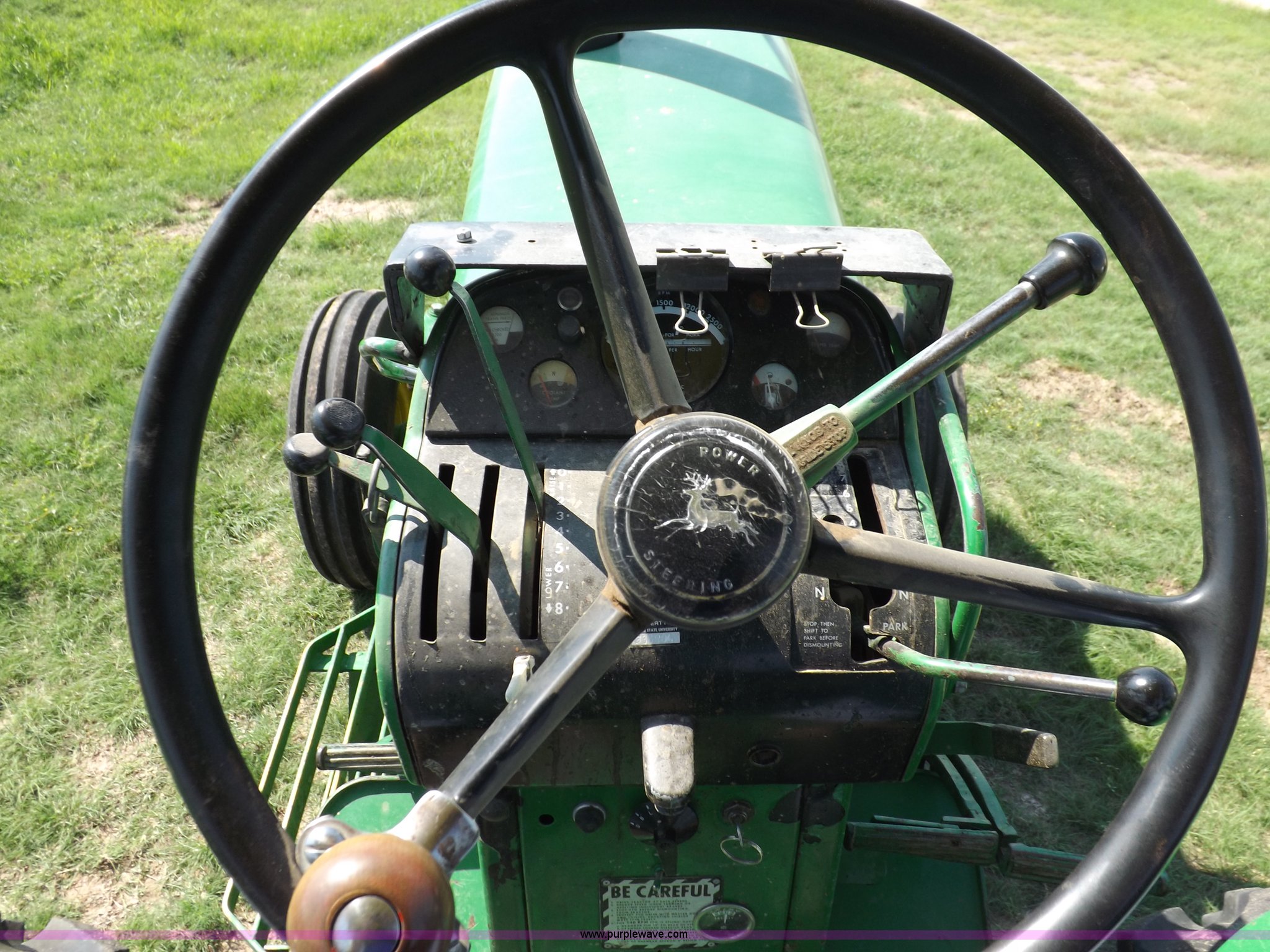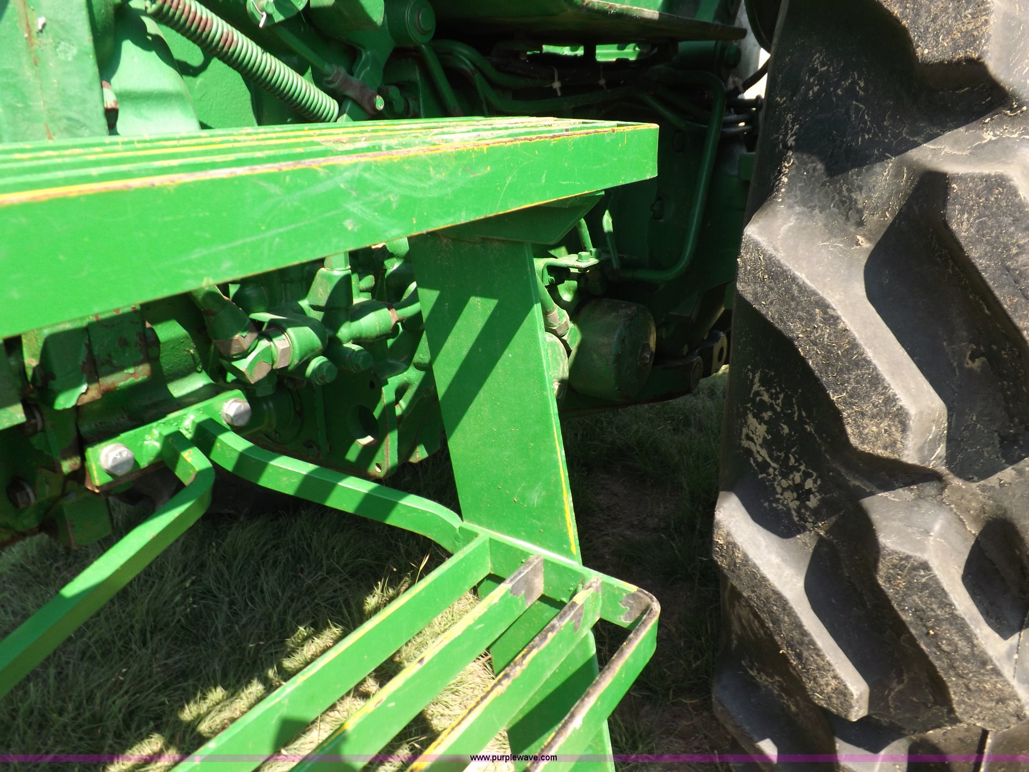 Purple Wave is selling a used Tractor in Kansas. This item is a John Deere 4020 tractor with the following: 499 hours on meter, John Deere six cylinder diesel engine, Powershift transmission, 8F-4R gears, Spring suspension seat, Three point, Draw bar, Auxiliary outlet, 1000 PTO, Inoperable, Sun shades, Shop built front tank carrier, Wheel weights, 102" wheelbase, 10.00-16 front tires, 18.4R34 rear tires, Serial T213P165106R