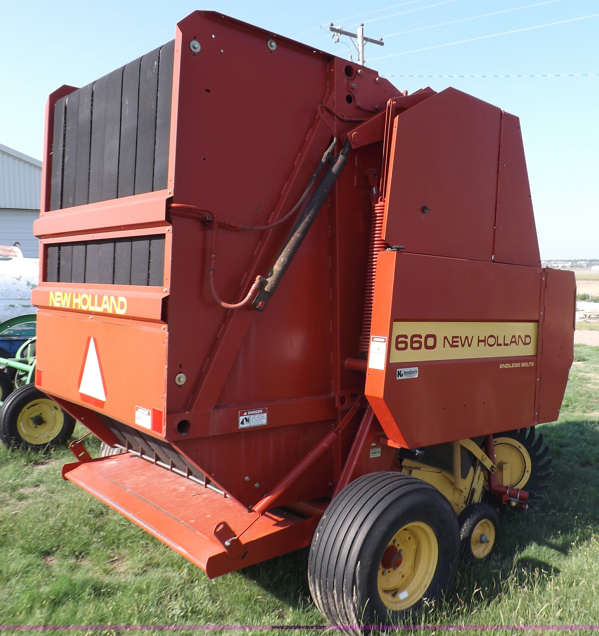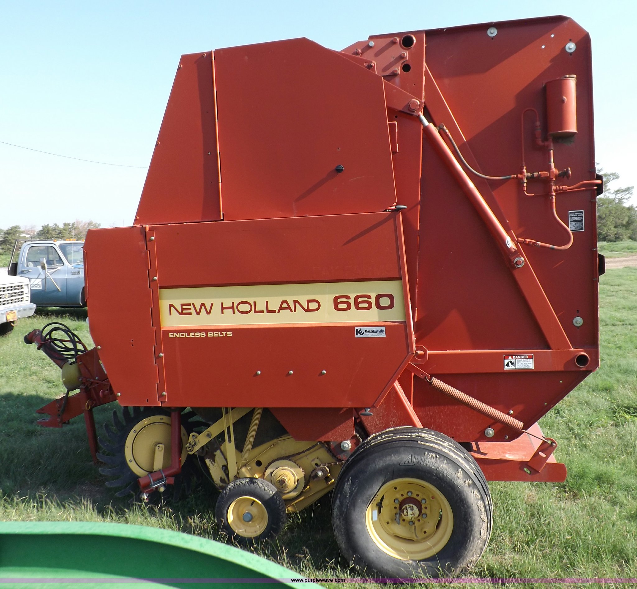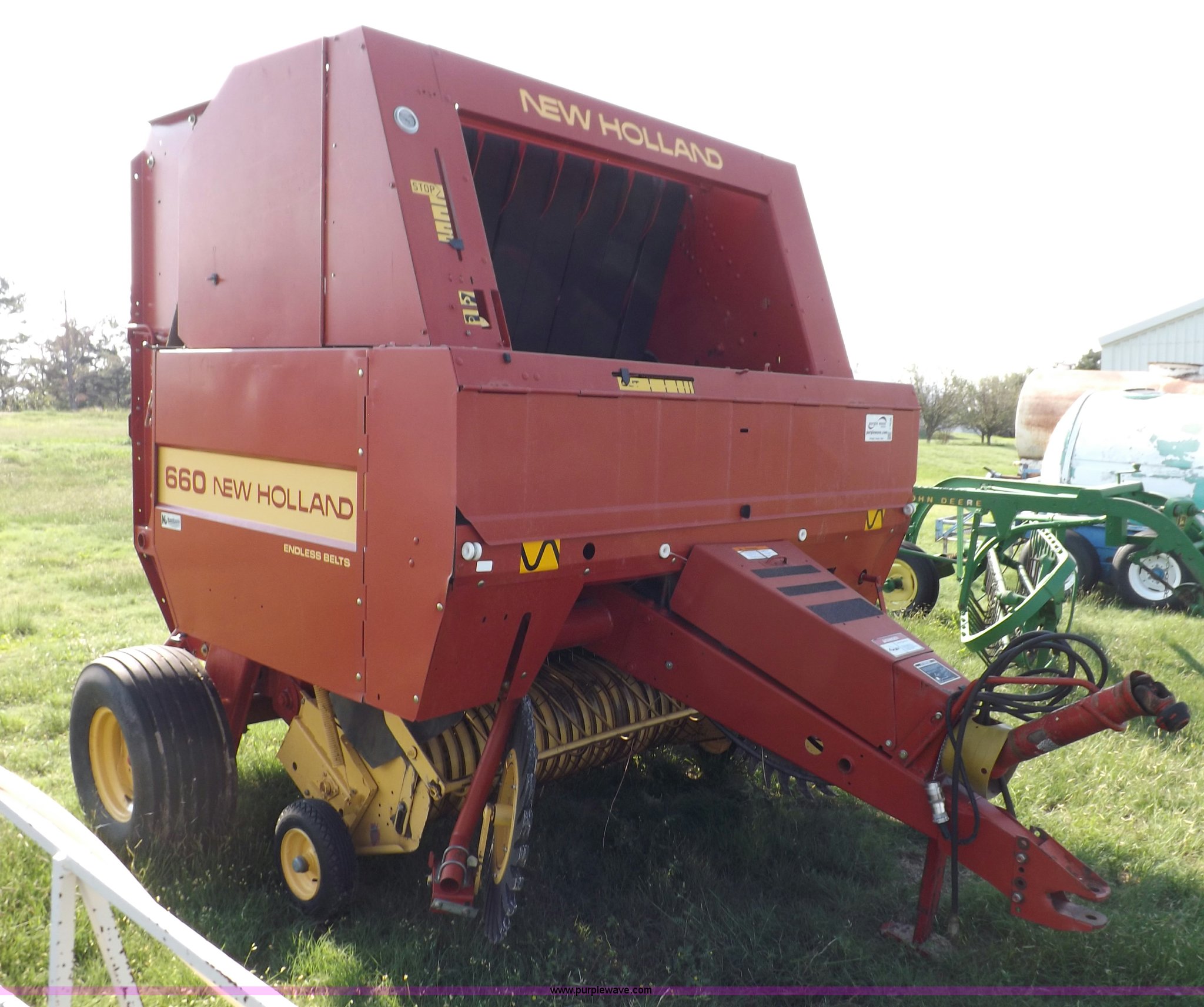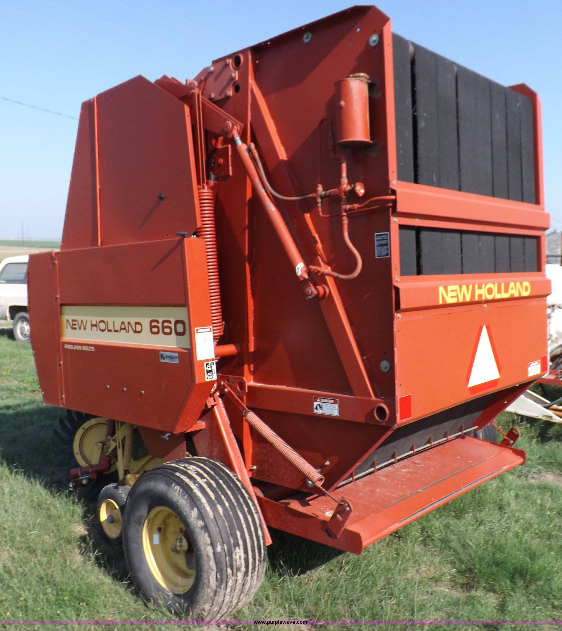 Purple Wave is selling a used Round Baler in Kansas. This item is a 1994 New Holland 660 round baler with the following: 5' x 6' bale capacity, 5.5'W pickup, Bale kicker, Twine tie, Small 1000 PTO, Pin hitch, Endless belts, 4.80 x 8 gauge wheel tires, 31 x 13.5-15 tires, Automatic twine feed inoperable, One cylinder leaks, Serial 899416