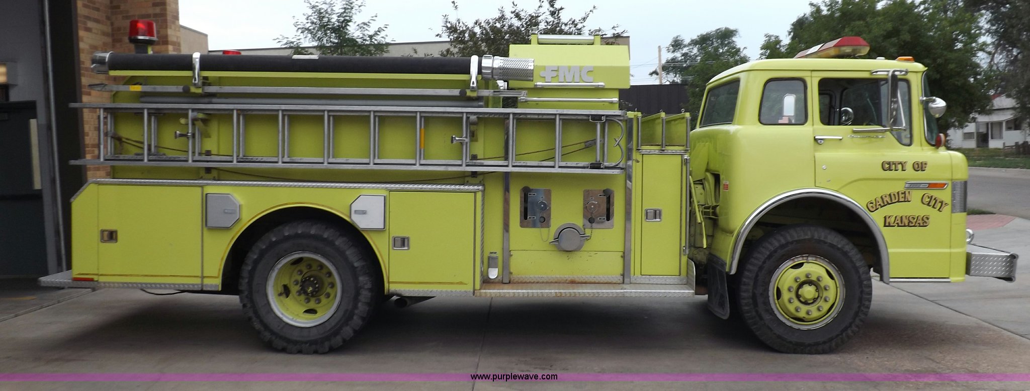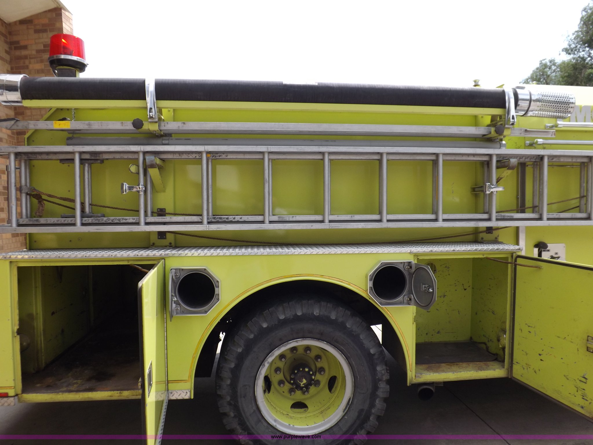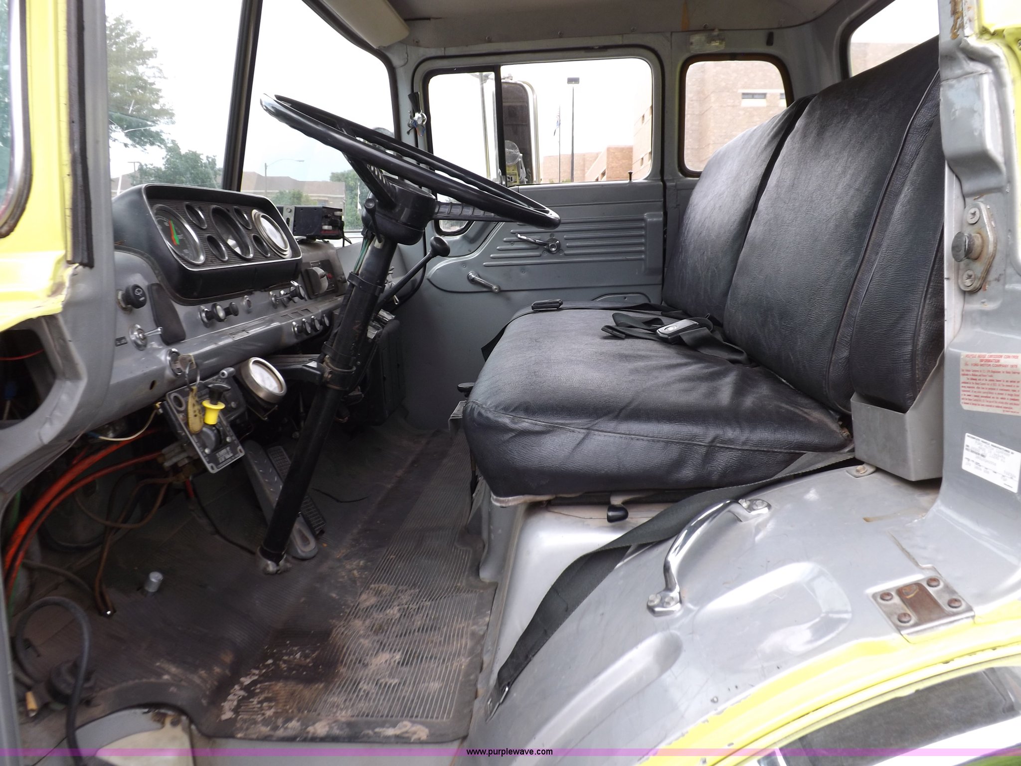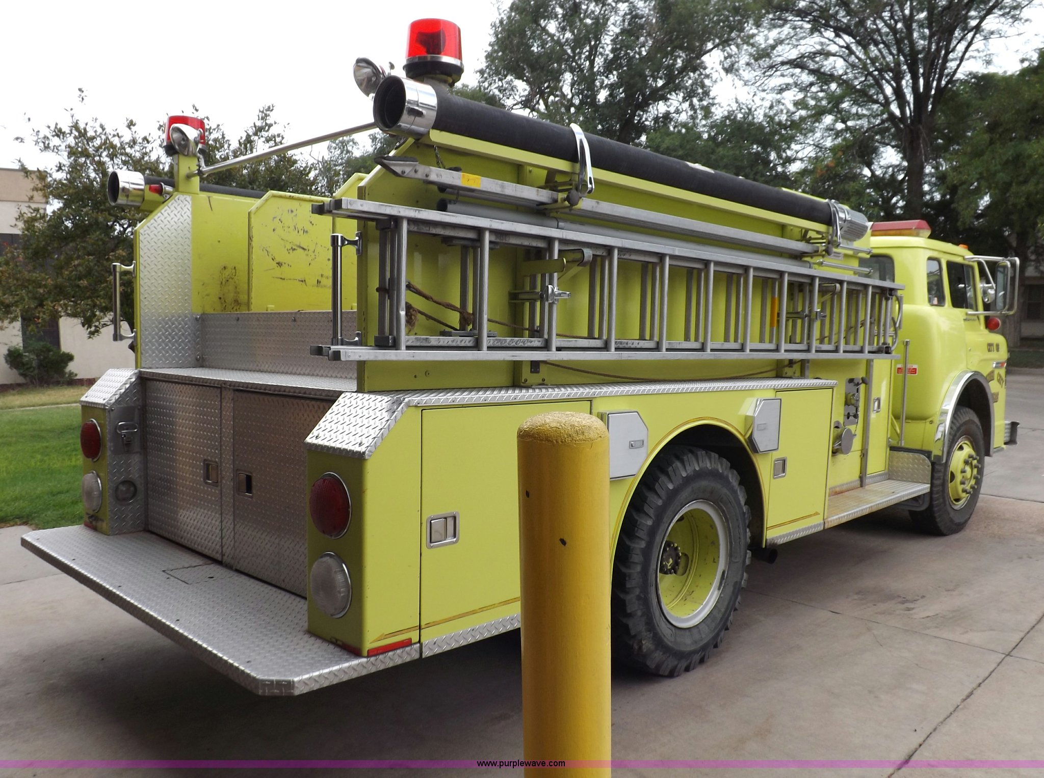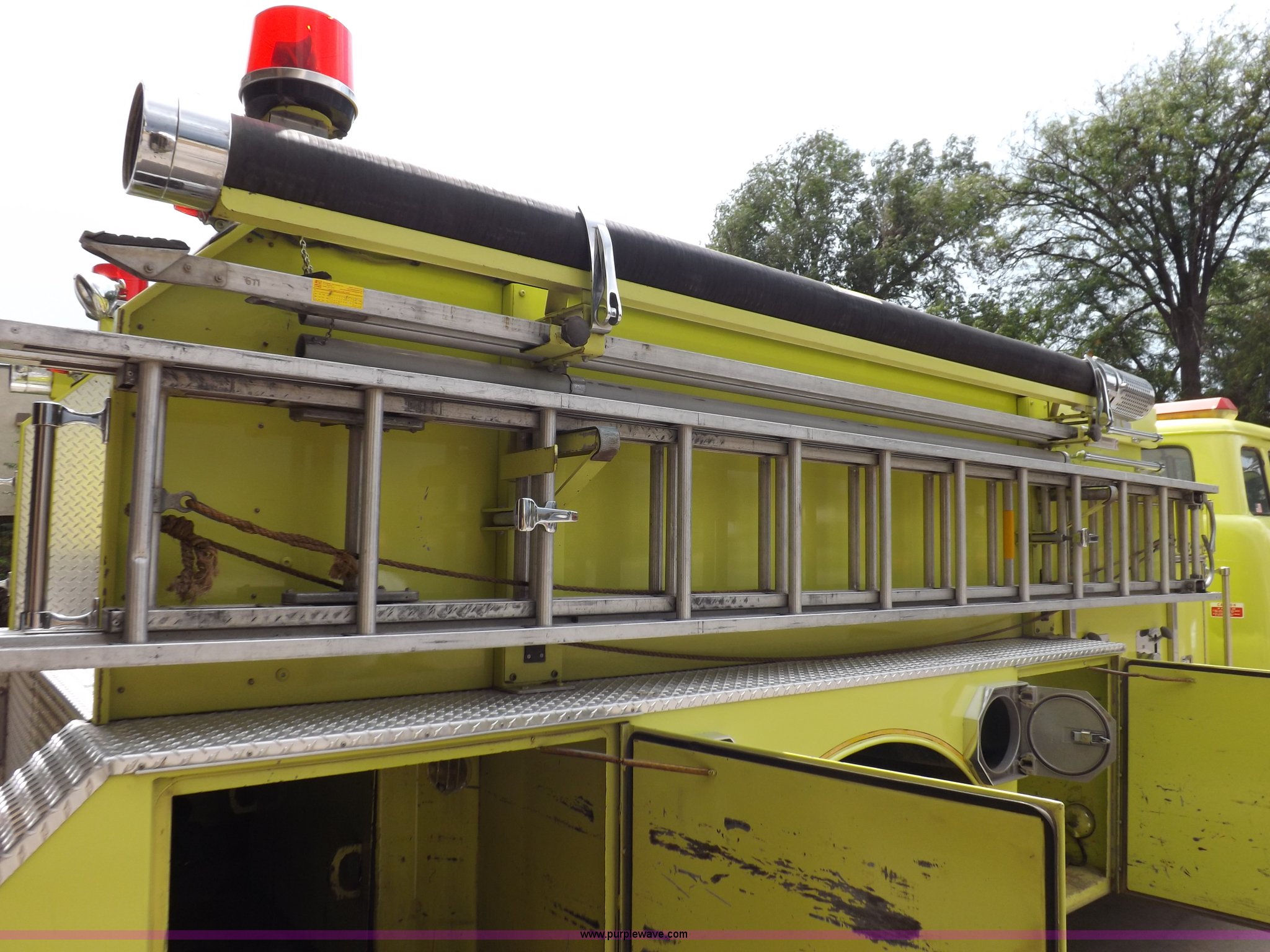 Purple Wave is selling a used Fire Truck or Emergency Vehicle in Kansas. This item is a 1980 Ford Custom Cab 8000 firetruck with the following: 32,312 miles on odometer, Caterpillar 3208 diesel engine, Engine replaced at 29,975 miles, AT540 automatic transmission, Heat, 500 gallon water tank, 1,000 gpm pump capacity, 5" suction, (4) 2.5" discharge, (2) 1" booster reels, Approximately 100'L hose per reel, 2.5" auxiliary inlet, (2) 10'L x 5" diameter hard suction hoses, 24' extension ladder, 14' roof ladder, 10' attic ladder, Pump and roll capable, Front and rear work lights, Chrome bumper, PTO, Spring suspension, Air brakes, 153" wheelbase, 10.00R20 tires, GVWR 29,300 lbs, Tires weathered, Driver's windshield cracked, Driver's door damaged, Unit# 200040