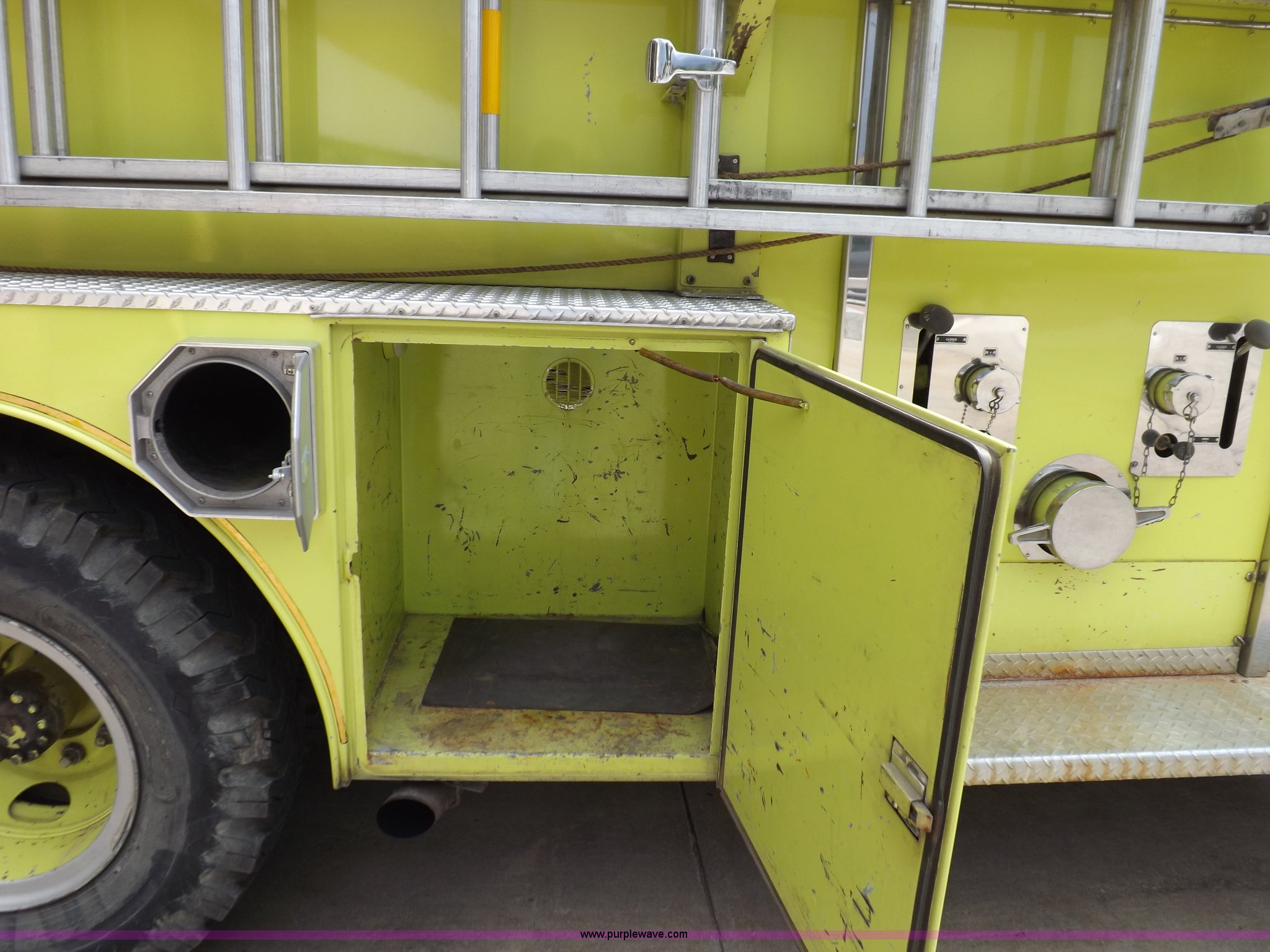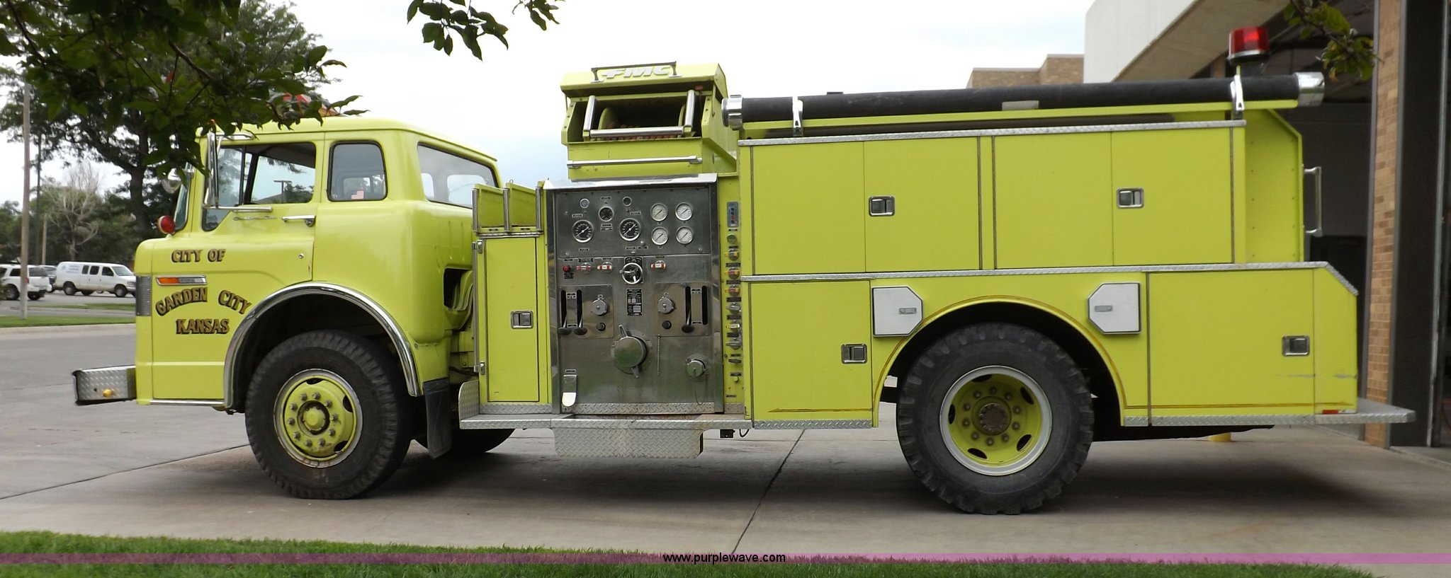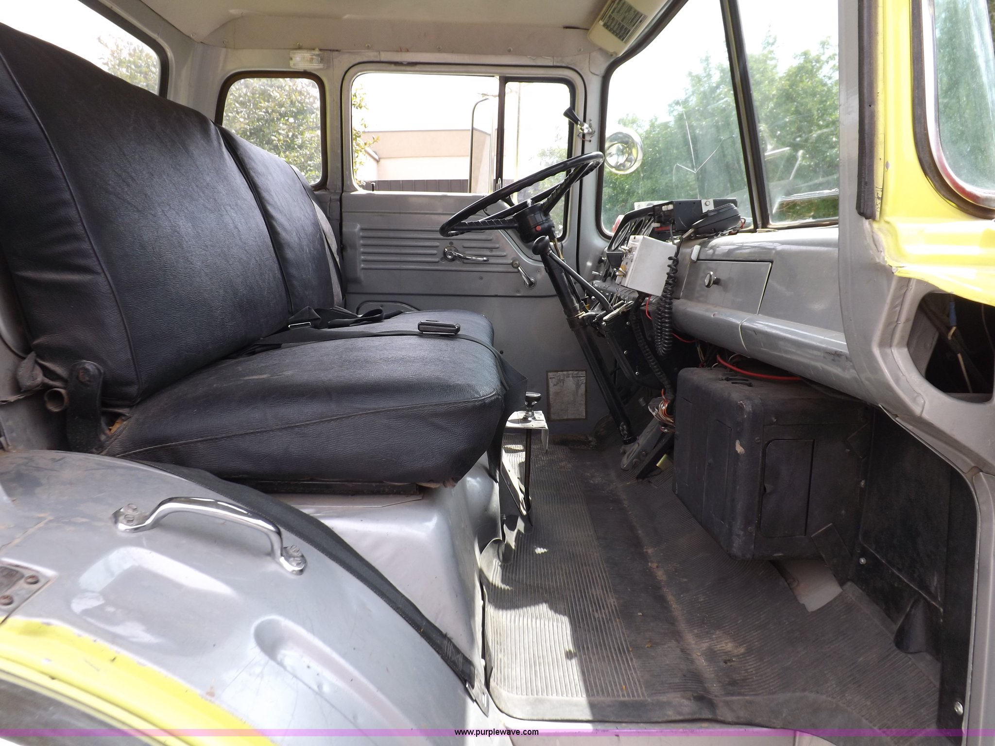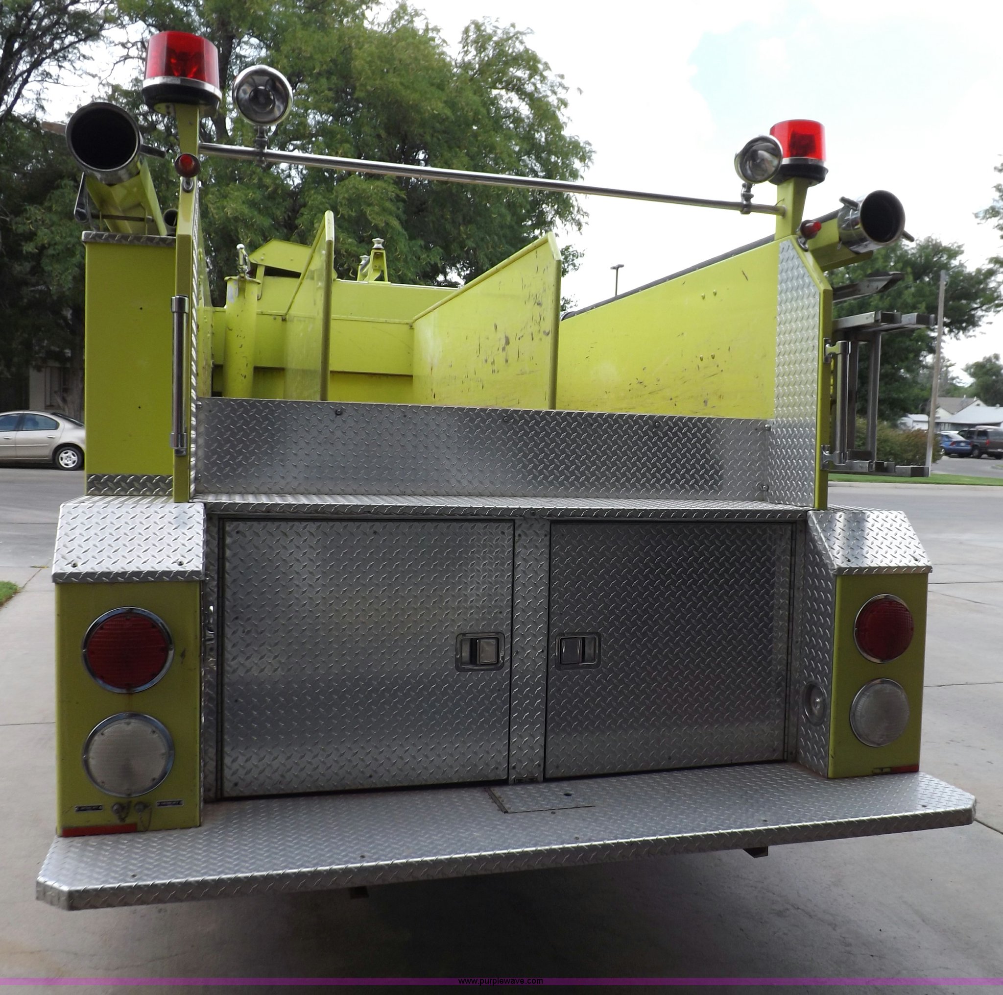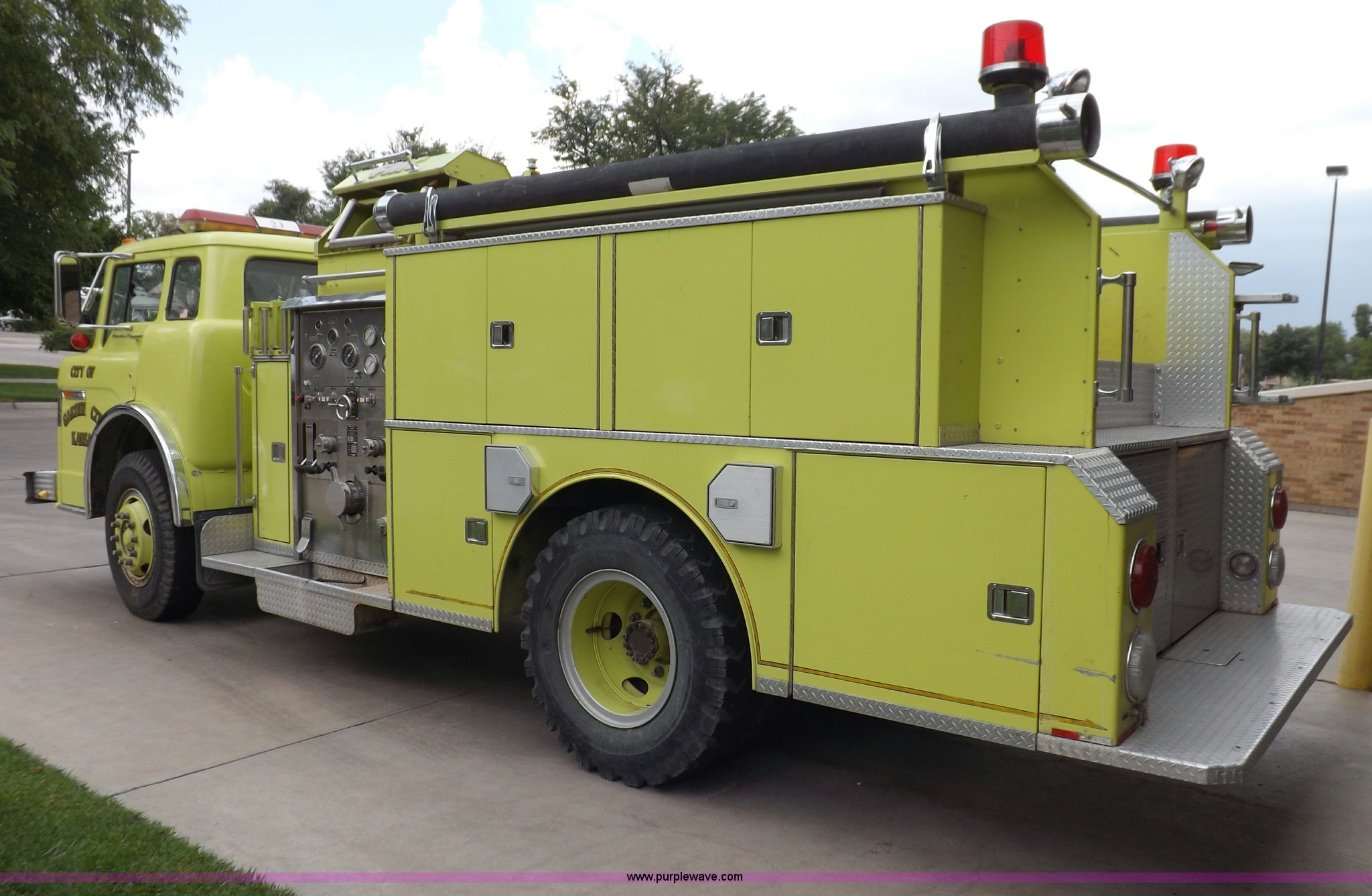 Purple Wave is selling a used Fire Truck or Emergency Vehicle in Kansas. This item is a 1980 Ford Custom Cab 8000 firetruck with the following: 32,312 miles on odometer, Caterpillar 3208 diesel engine, Engine replaced at 29,975 miles, AT540 automatic transmission, Heat, 500 gallon water tank, 1,000 gpm pump capacity, 5" suction, (4) 2.5" discharge, (2) 1" booster reels, Approximately 100'L hose per reel, 2.5" auxiliary inlet, (2) 10'L x 5" diameter hard suction hoses, 24' extension ladder, 14' roof ladder, 10' attic ladder, Pump and roll capable, Front and rear work lights, Chrome bumper, PTO, Spring suspension, Air brakes, 153" wheelbase, 10.00R20 tires, GVWR 29,300 lbs, Tires weathered, Driver's windshield cracked, Driver's door damaged, Unit# 200040
