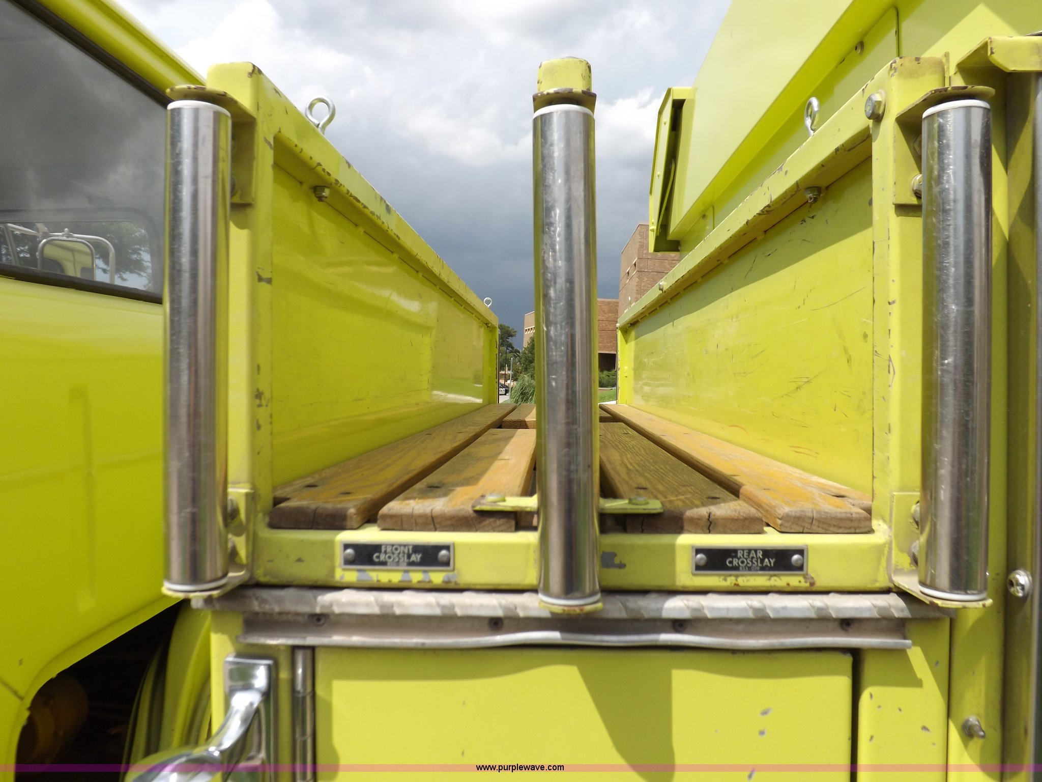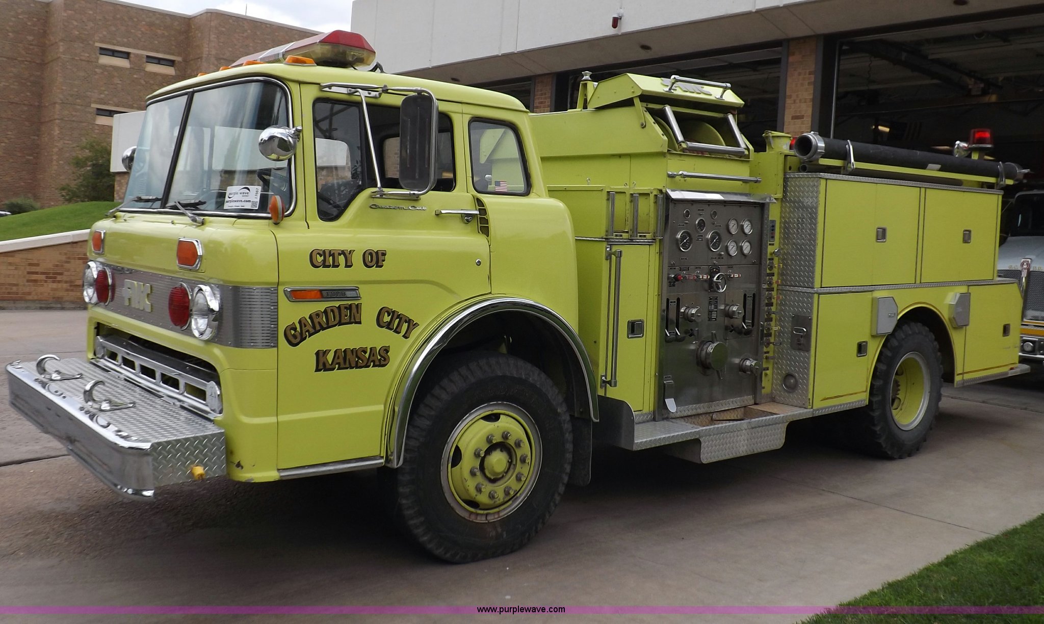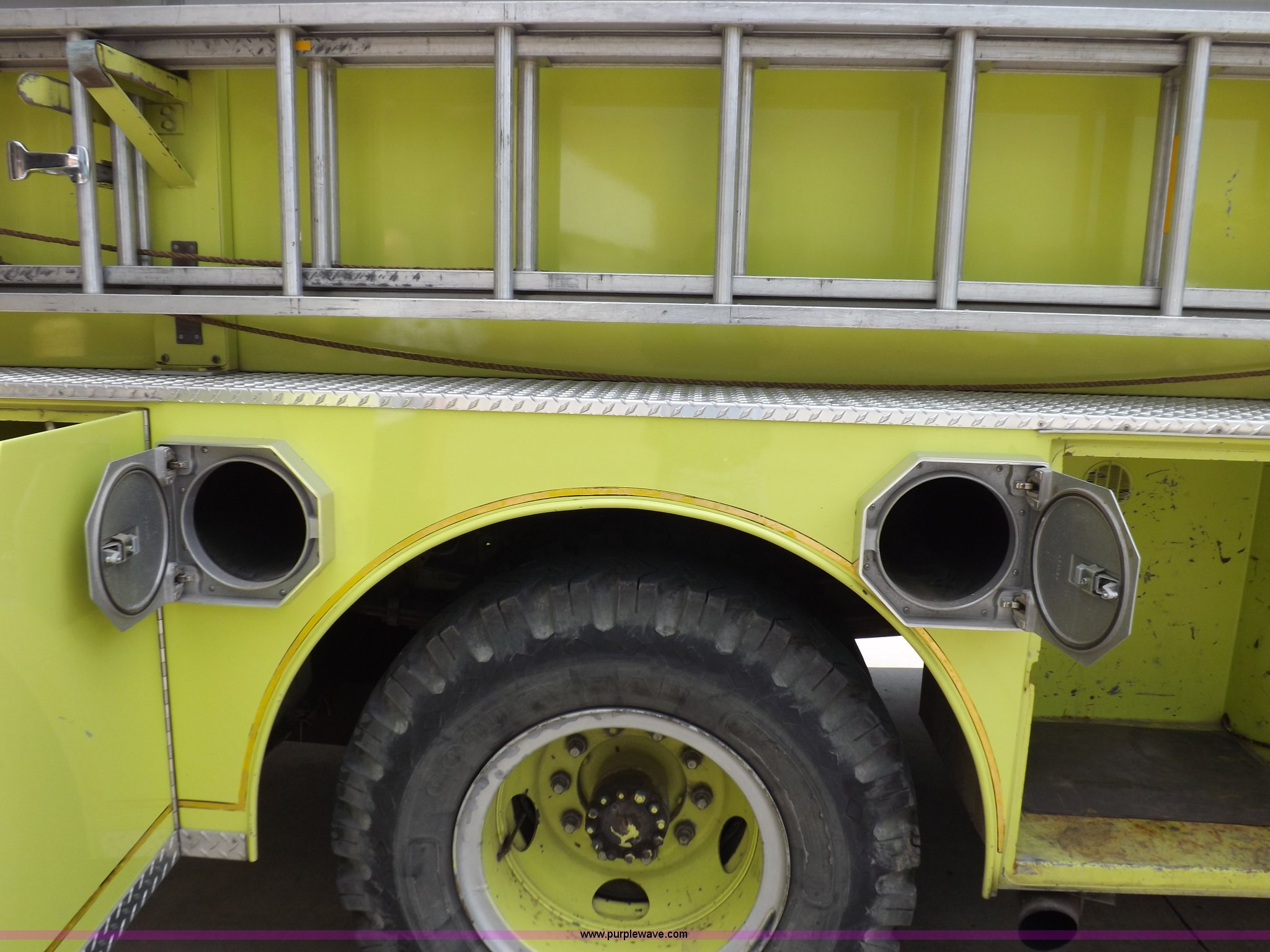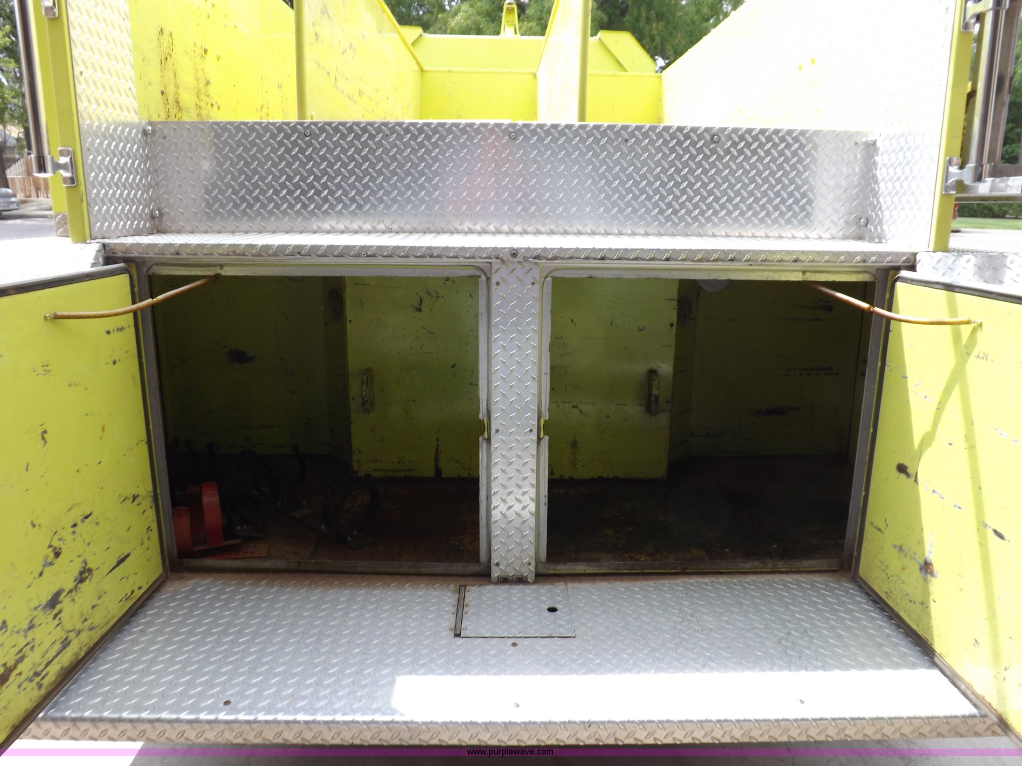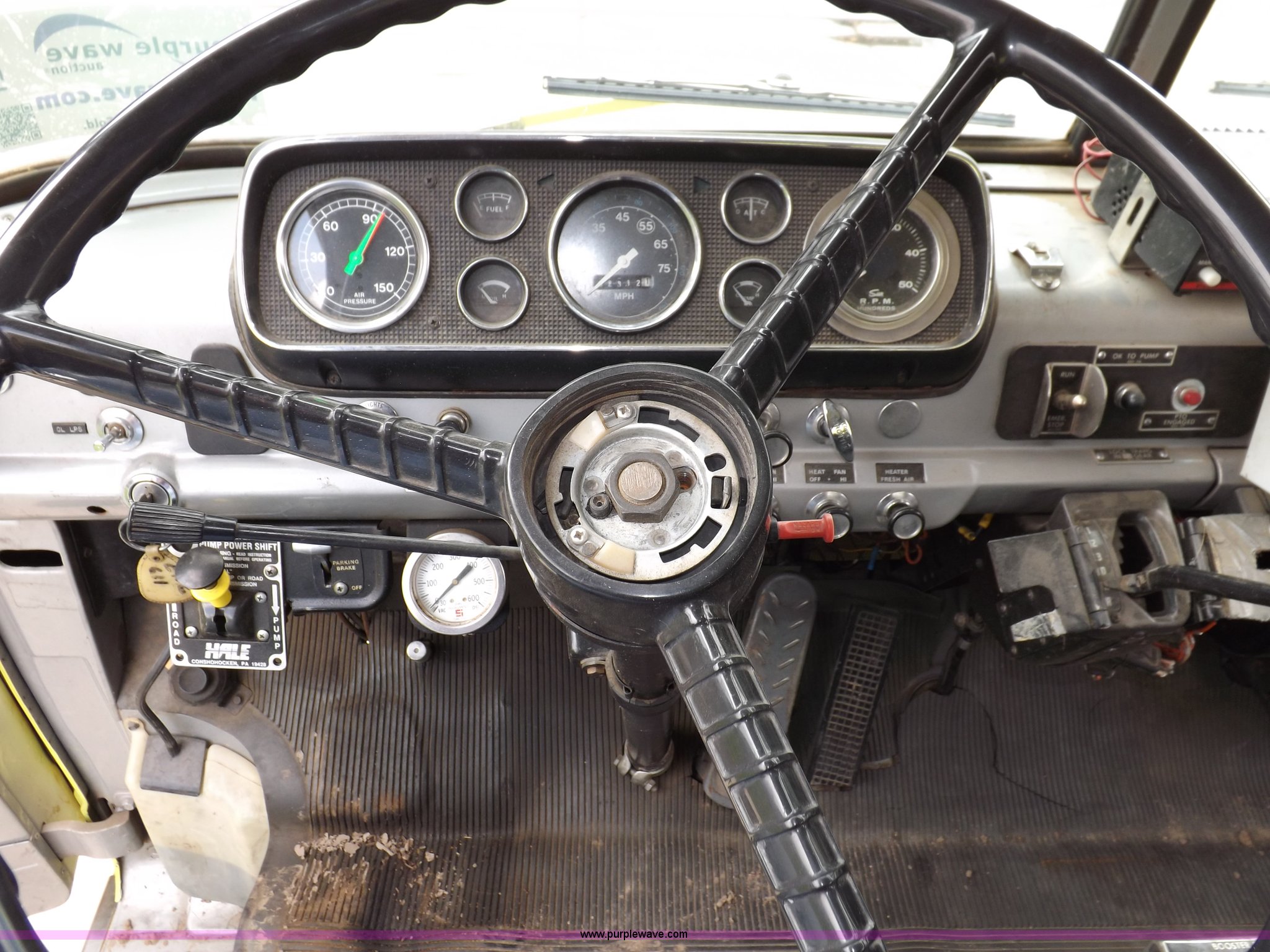 Purple Wave is selling a used Fire Truck or Emergency Vehicle in Kansas. This item is a 1980 Ford Custom Cab 8000 firetruck with the following: 32,312 miles on odometer, Caterpillar 3208 diesel engine, Engine replaced at 29,975 miles, AT540 automatic transmission, Heat, 500 gallon water tank, 1,000 gpm pump capacity, 5" suction, (4) 2.5" discharge, (2) 1" booster reels, Approximately 100'L hose per reel, 2.5" auxiliary inlet, (2) 10'L x 5" diameter hard suction hoses, 24' extension ladder, 14' roof ladder, 10' attic ladder, Pump and roll capable, Front and rear work lights, Chrome bumper, PTO, Spring suspension, Air brakes, 153" wheelbase, 10.00R20 tires, GVWR 29,300 lbs, Tires weathered, Driver's windshield cracked, Driver's door damaged, Unit# 200040