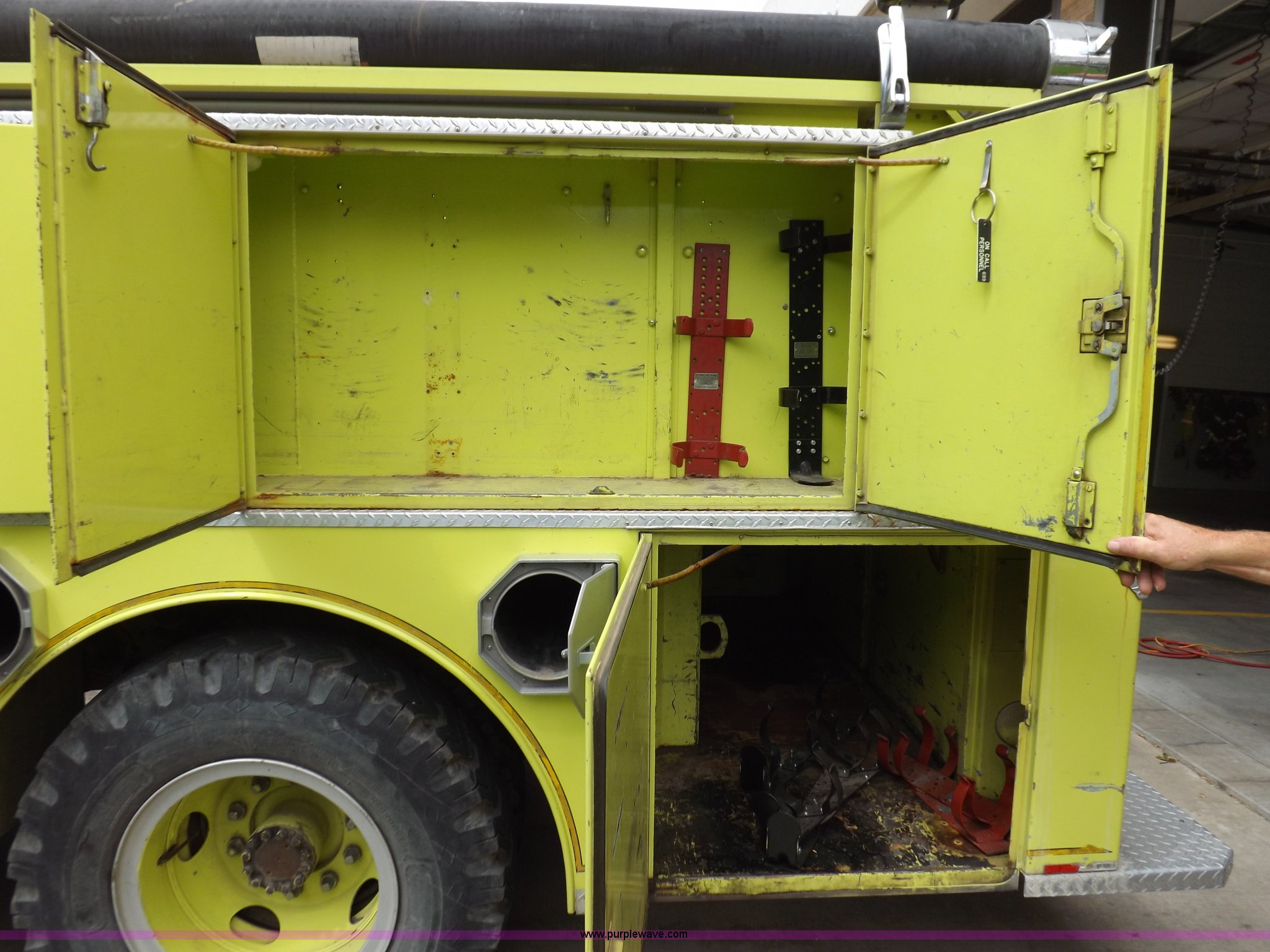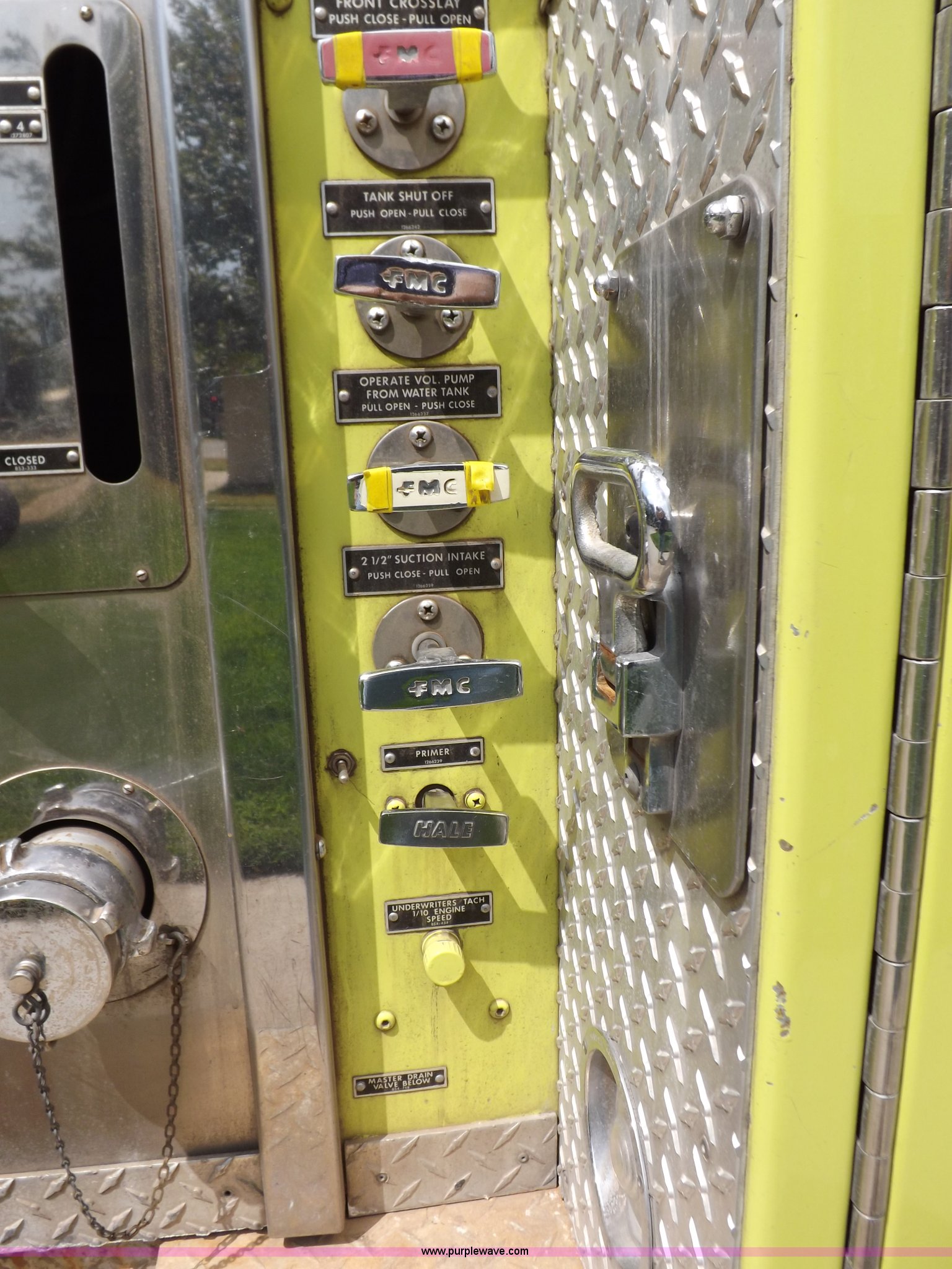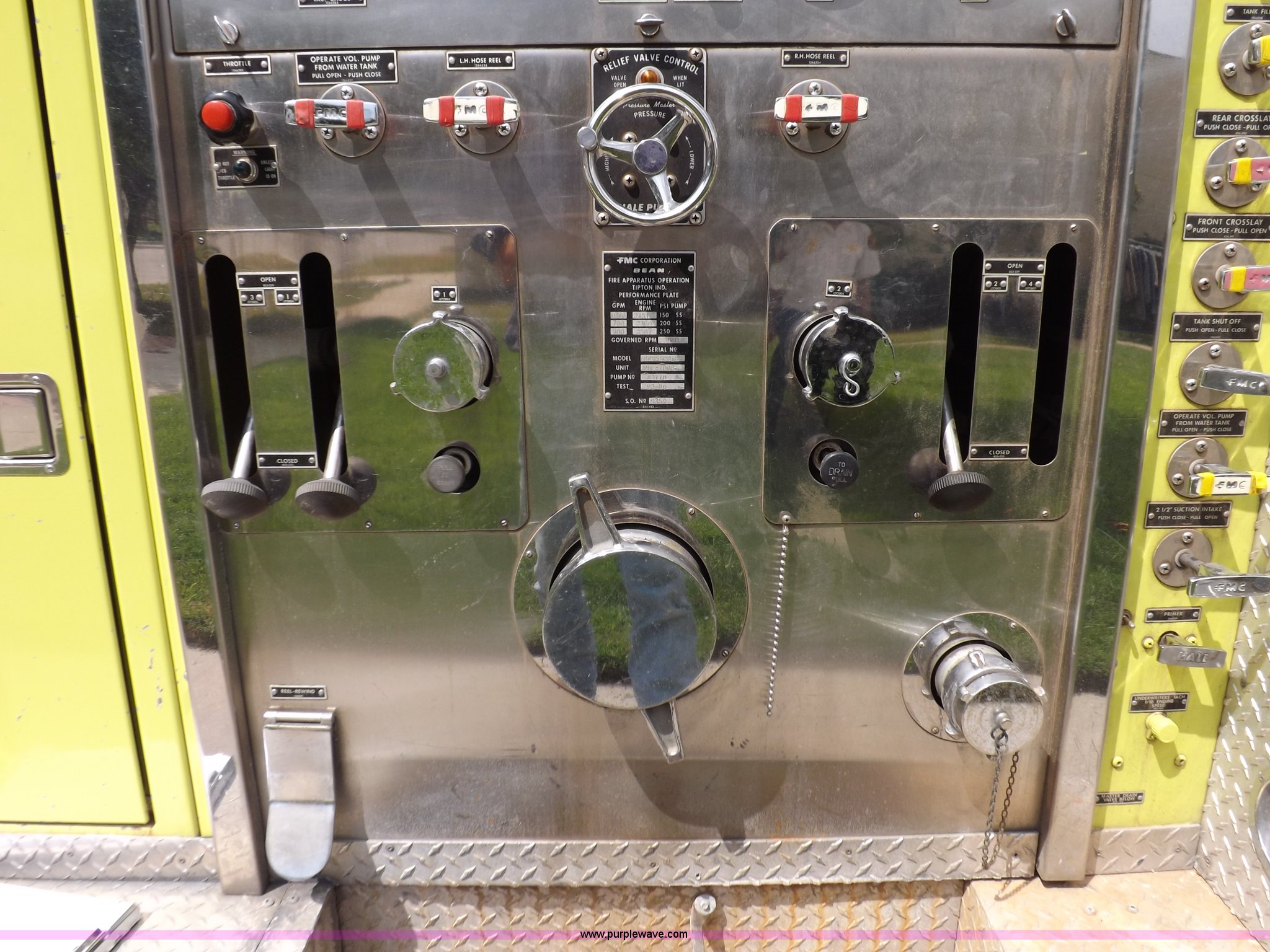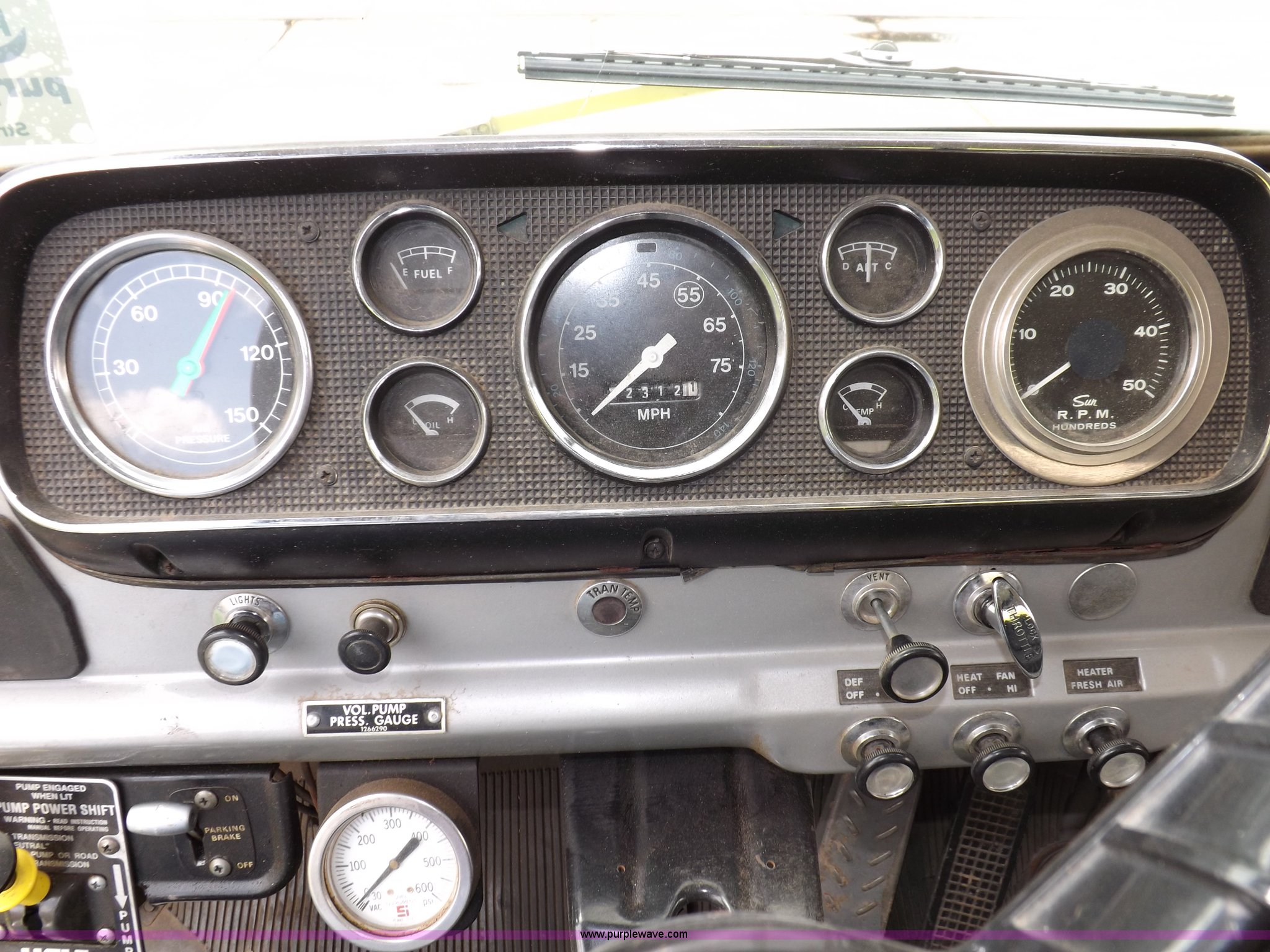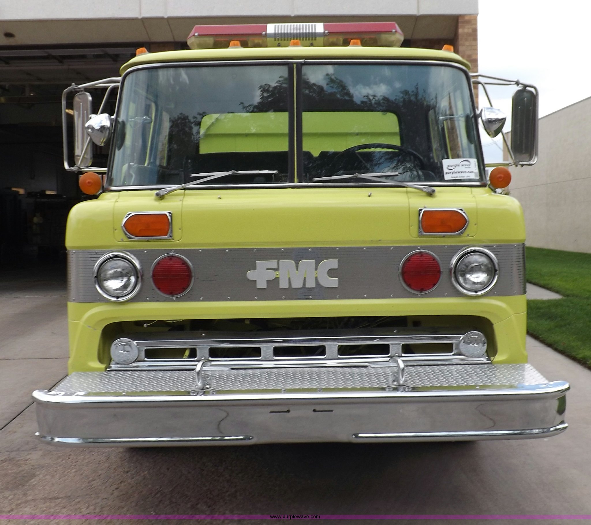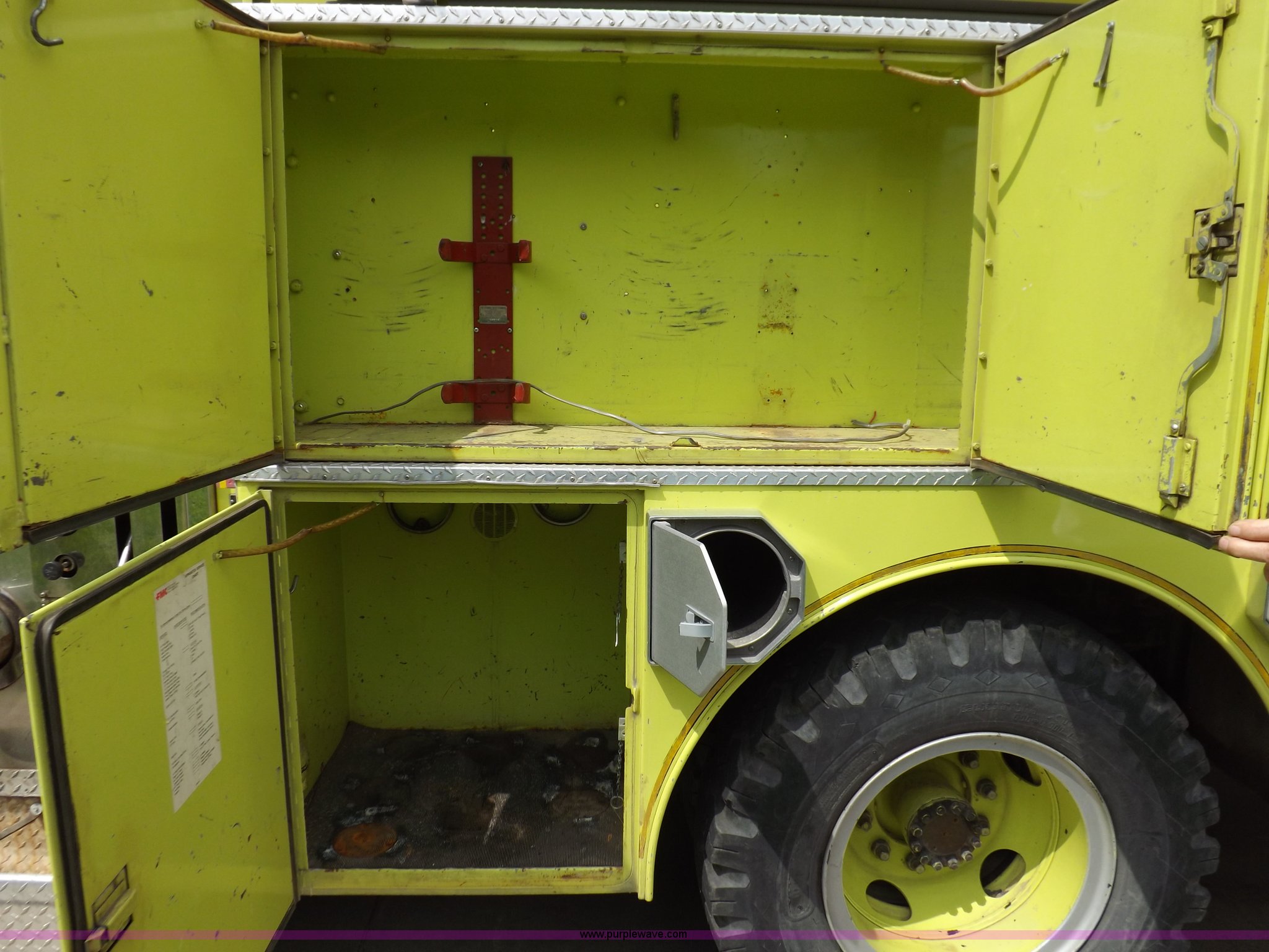 Purple Wave is selling a used Fire Truck or Emergency Vehicle in Kansas. This item is a 1980 Ford Custom Cab 8000 firetruck with the following: 32,312 miles on odometer, Caterpillar 3208 diesel engine, Engine replaced at 29,975 miles, AT540 automatic transmission, Heat, 500 gallon water tank, 1,000 gpm pump capacity, 5" suction, (4) 2.5" discharge, (2) 1" booster reels, Approximately 100'L hose per reel, 2.5" auxiliary inlet, (2) 10'L x 5" diameter hard suction hoses, 24' extension ladder, 14' roof ladder, 10' attic ladder, Pump and roll capable, Front and rear work lights, Chrome bumper, PTO, Spring suspension, Air brakes, 153" wheelbase, 10.00R20 tires, GVWR 29,300 lbs, Tires weathered, Driver's windshield cracked, Driver's door damaged, Unit# 200040