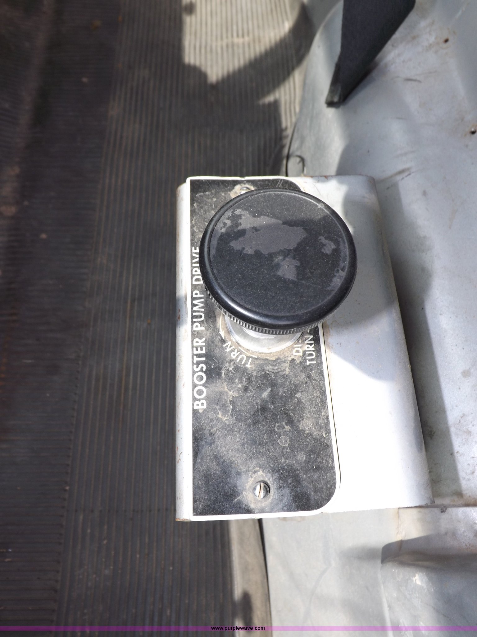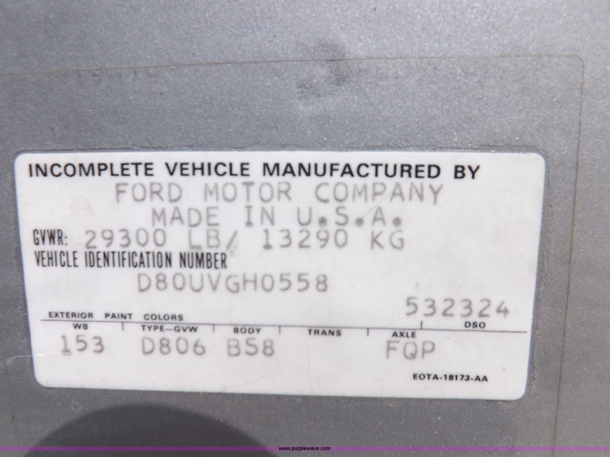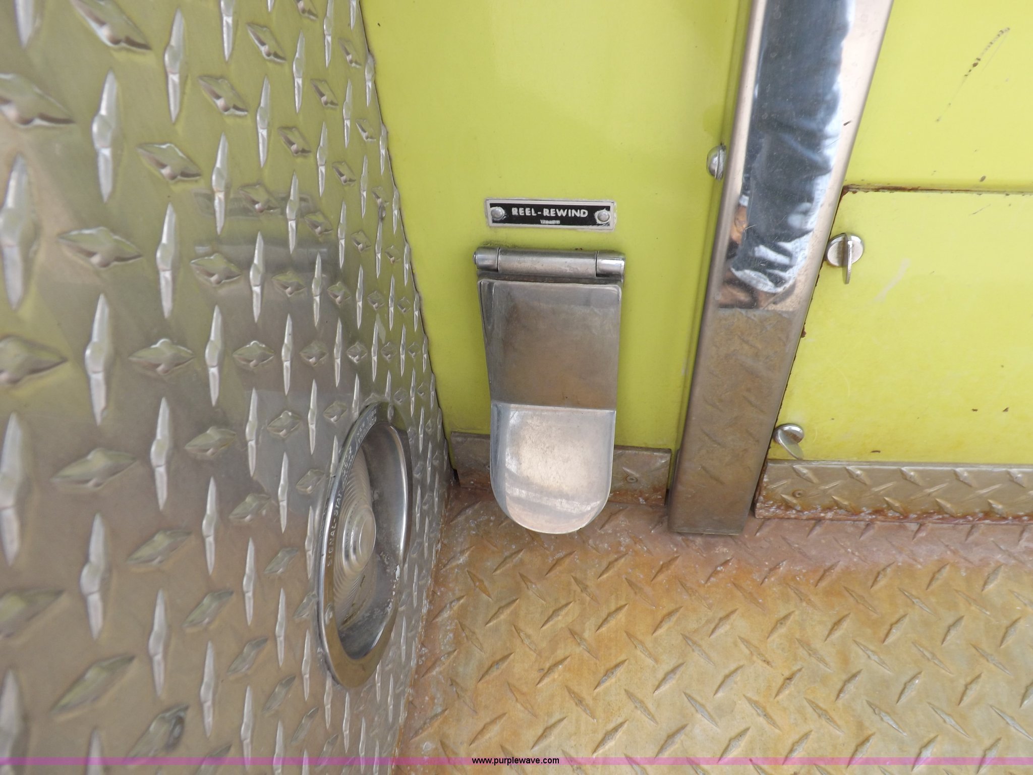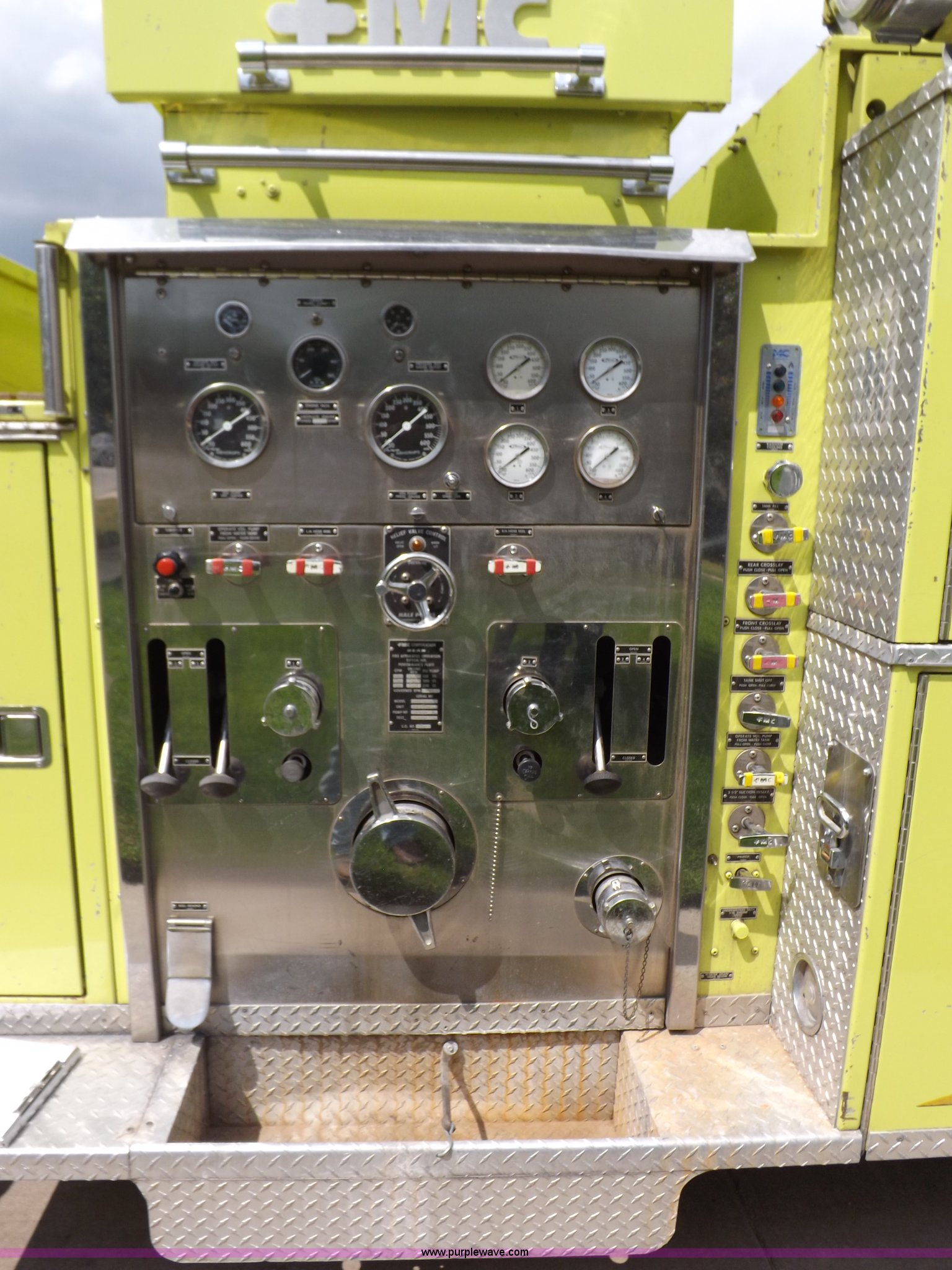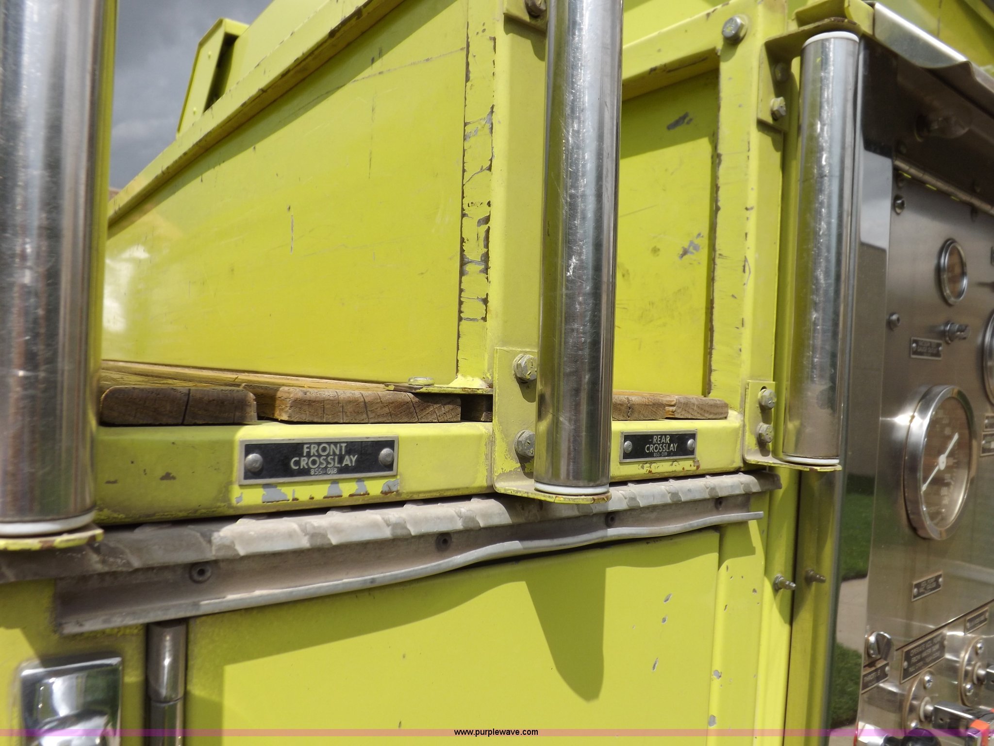 Purple Wave is selling a used Fire Truck or Emergency Vehicle in Kansas. This item is a 1980 Ford Custom Cab 8000 firetruck with the following: 32,312 miles on odometer, Caterpillar 3208 diesel engine, Engine replaced at 29,975 miles, AT540 automatic transmission, Heat, 500 gallon water tank, 1,000 gpm pump capacity, 5" suction, (4) 2.5" discharge, (2) 1" booster reels, Approximately 100'L hose per reel, 2.5" auxiliary inlet, (2) 10'L x 5" diameter hard suction hoses, 24' extension ladder, 14' roof ladder, 10' attic ladder, Pump and roll capable, Front and rear work lights, Chrome bumper, PTO, Spring suspension, Air brakes, 153" wheelbase, 10.00R20 tires, GVWR 29,300 lbs, Tires weathered, Driver's windshield cracked, Driver's door damaged, Unit# 200040