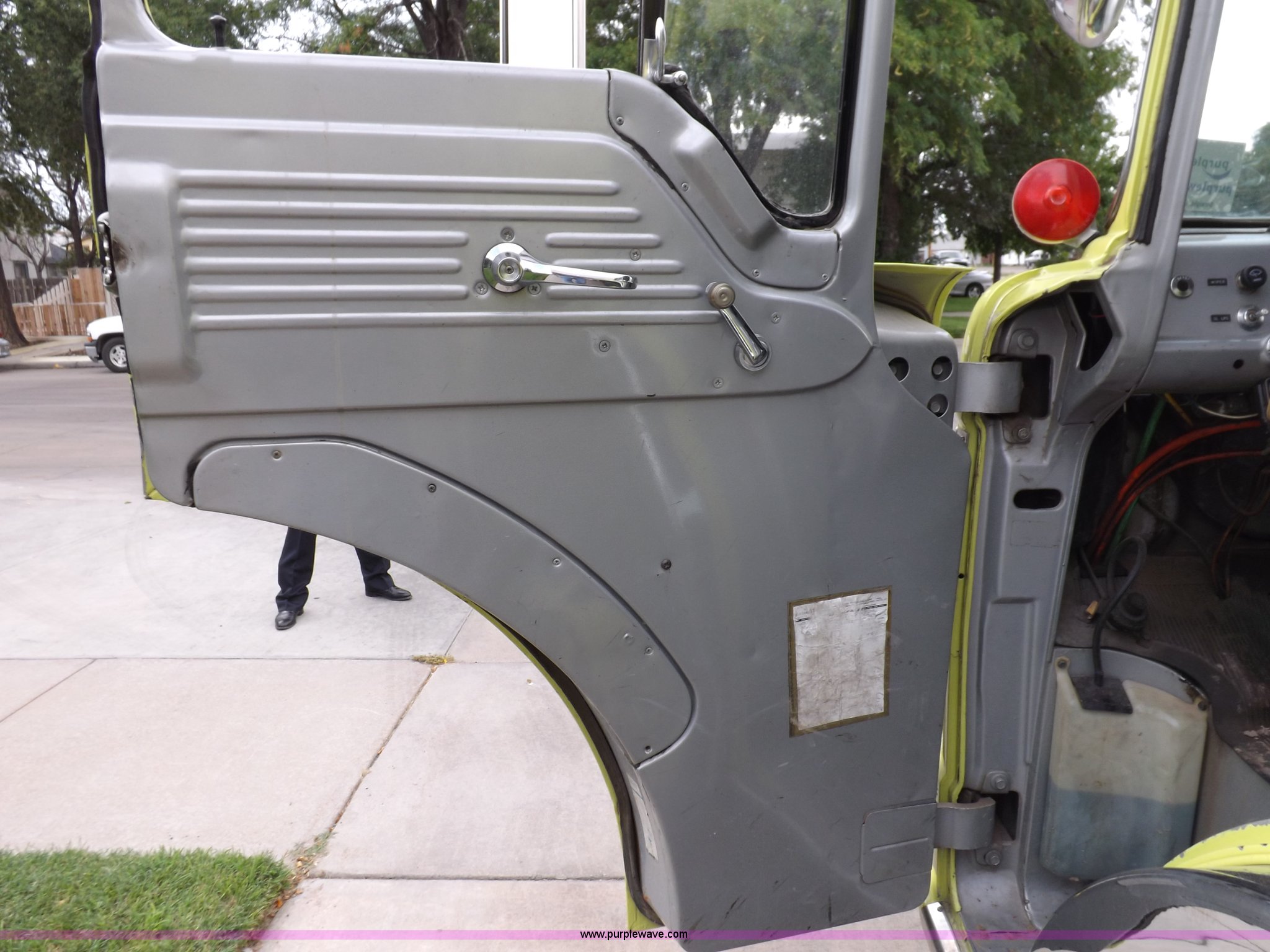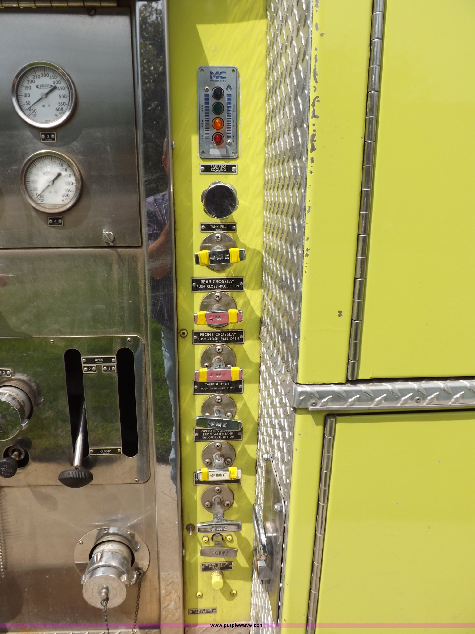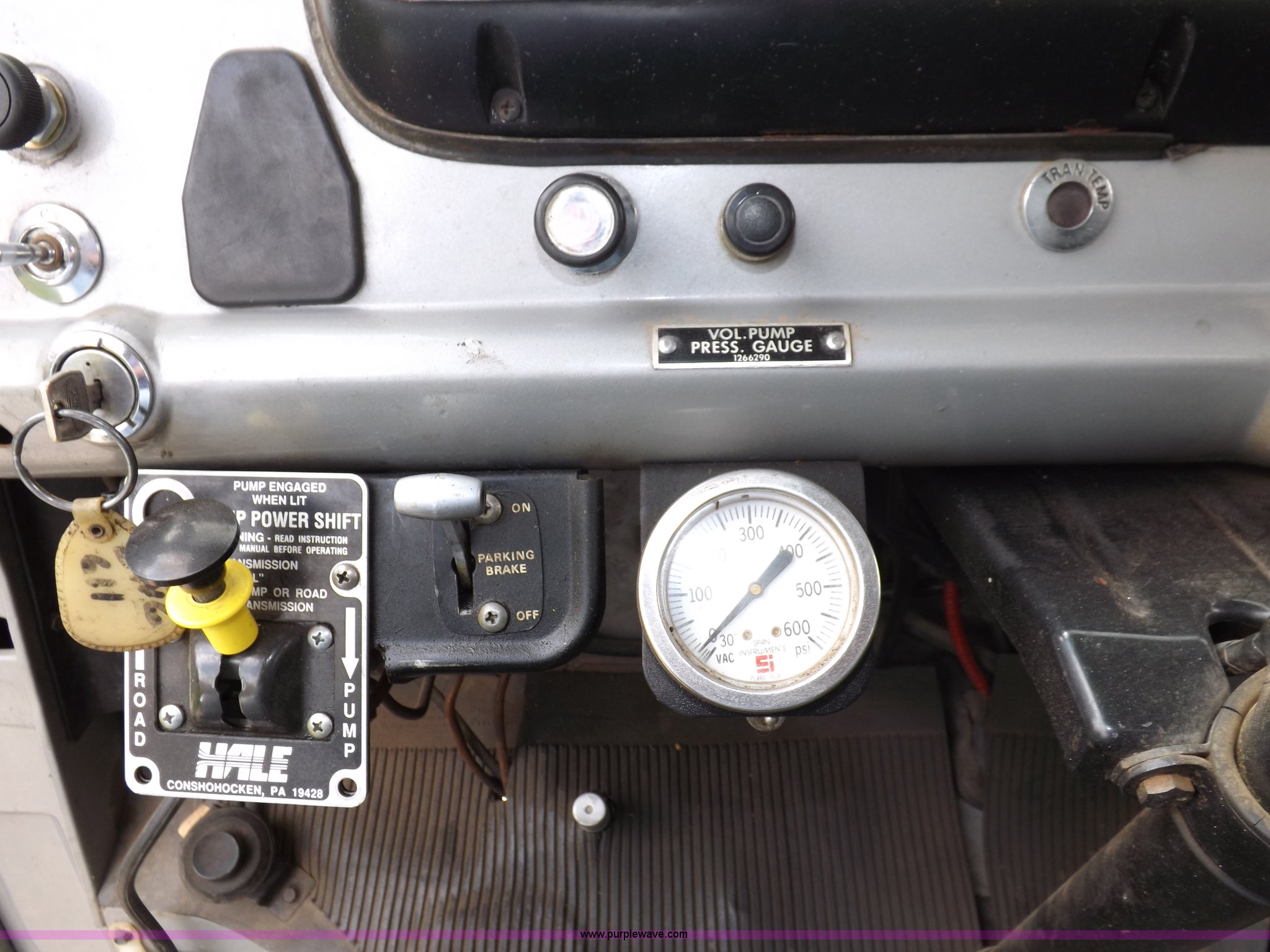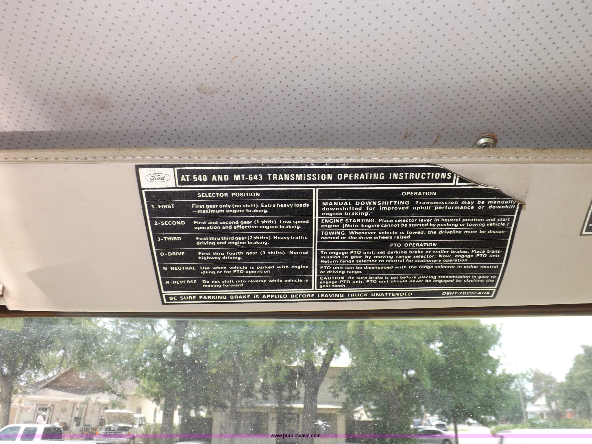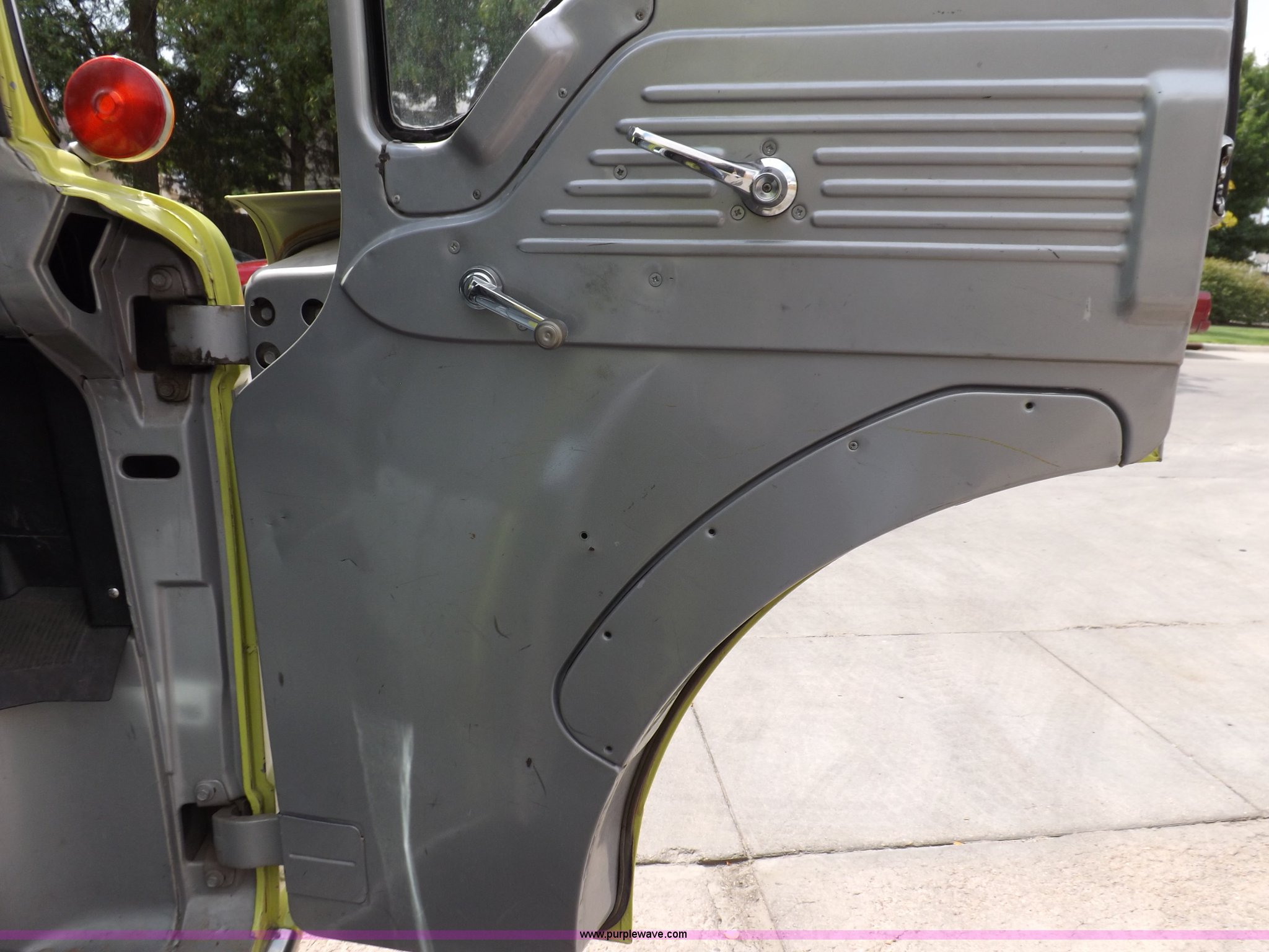 Purple Wave is selling a used Fire Truck or Emergency Vehicle in Kansas. This item is a 1980 Ford Custom Cab 8000 firetruck with the following: 32,312 miles on odometer, Caterpillar 3208 diesel engine, Engine replaced at 29,975 miles, AT540 automatic transmission, Heat, 500 gallon water tank, 1,000 gpm pump capacity, 5" suction, (4) 2.5" discharge, (2) 1" booster reels, Approximately 100'L hose per reel, 2.5" auxiliary inlet, (2) 10'L x 5" diameter hard suction hoses, 24' extension ladder, 14' roof ladder, 10' attic ladder, Pump and roll capable, Front and rear work lights, Chrome bumper, PTO, Spring suspension, Air brakes, 153" wheelbase, 10.00R20 tires, GVWR 29,300 lbs, Tires weathered, Driver's windshield cracked, Driver's door damaged, Unit# 200040