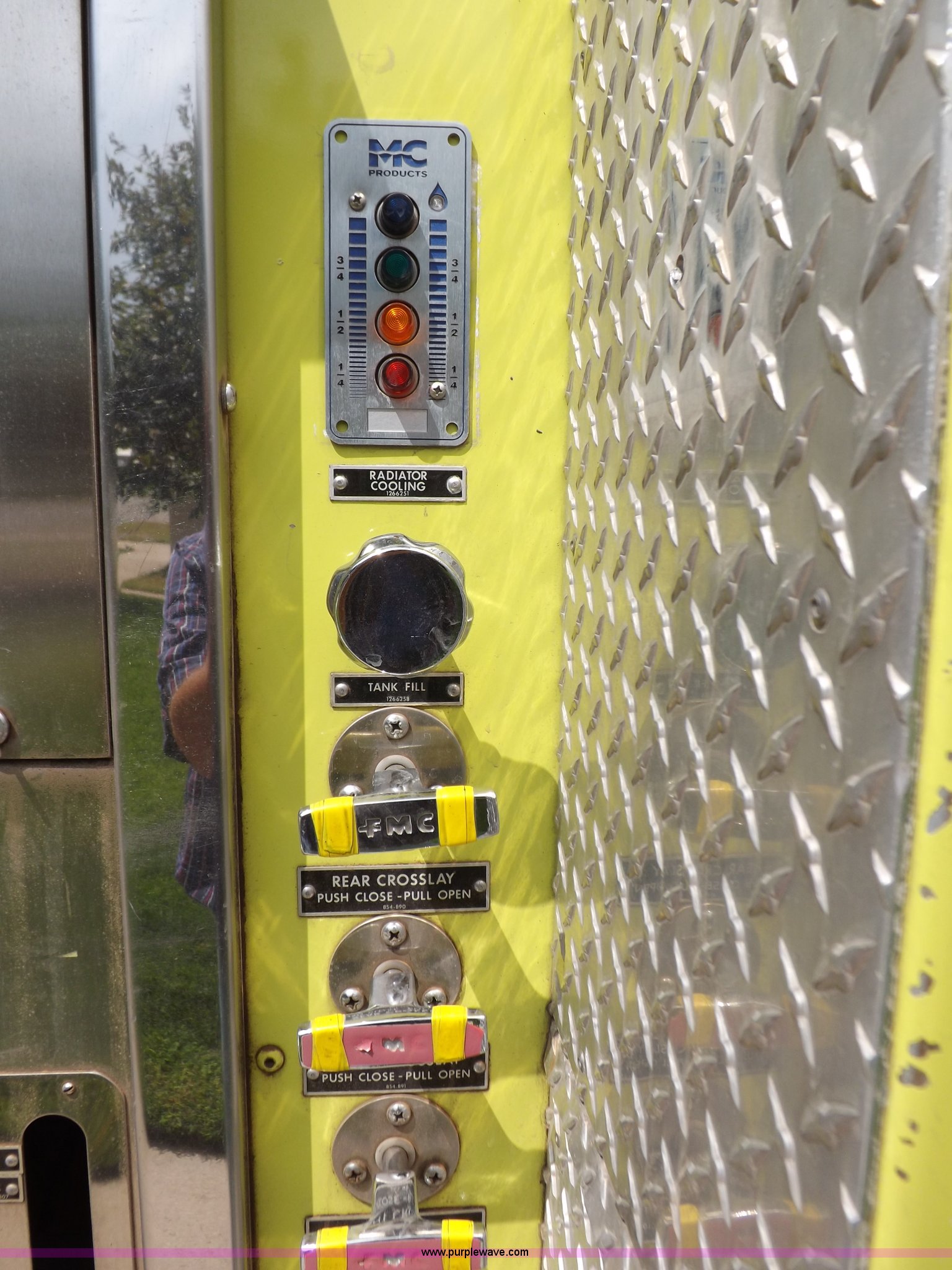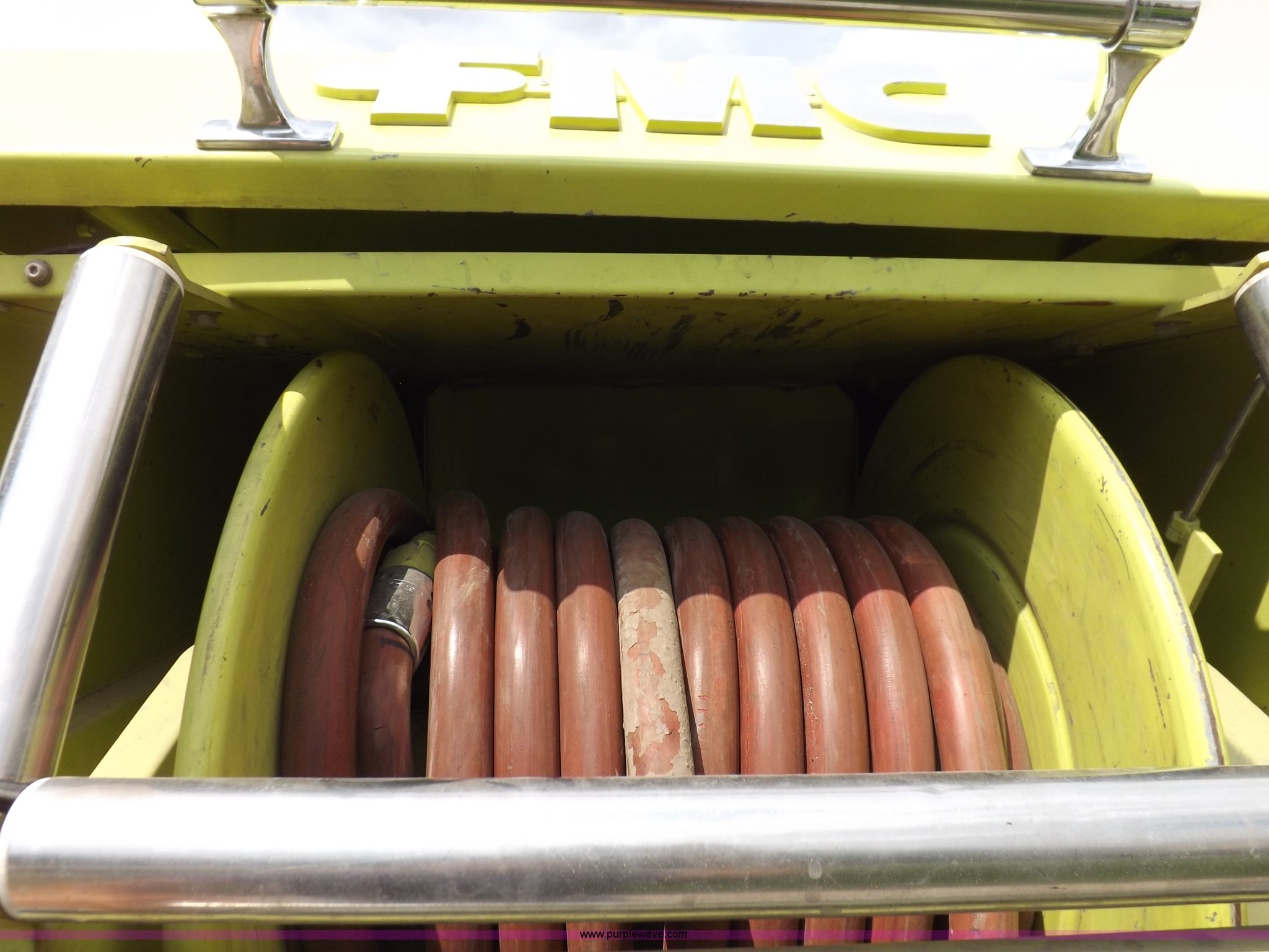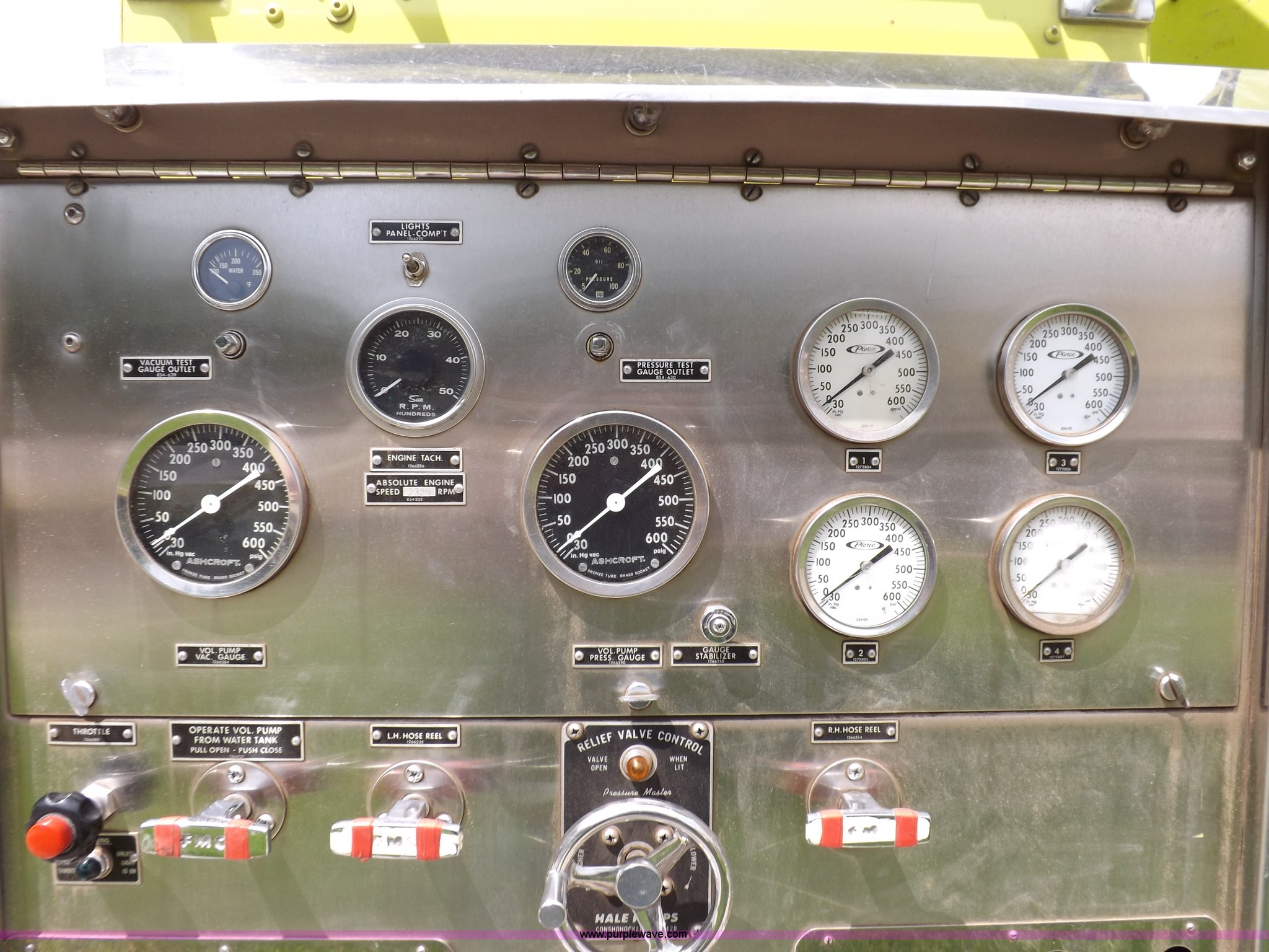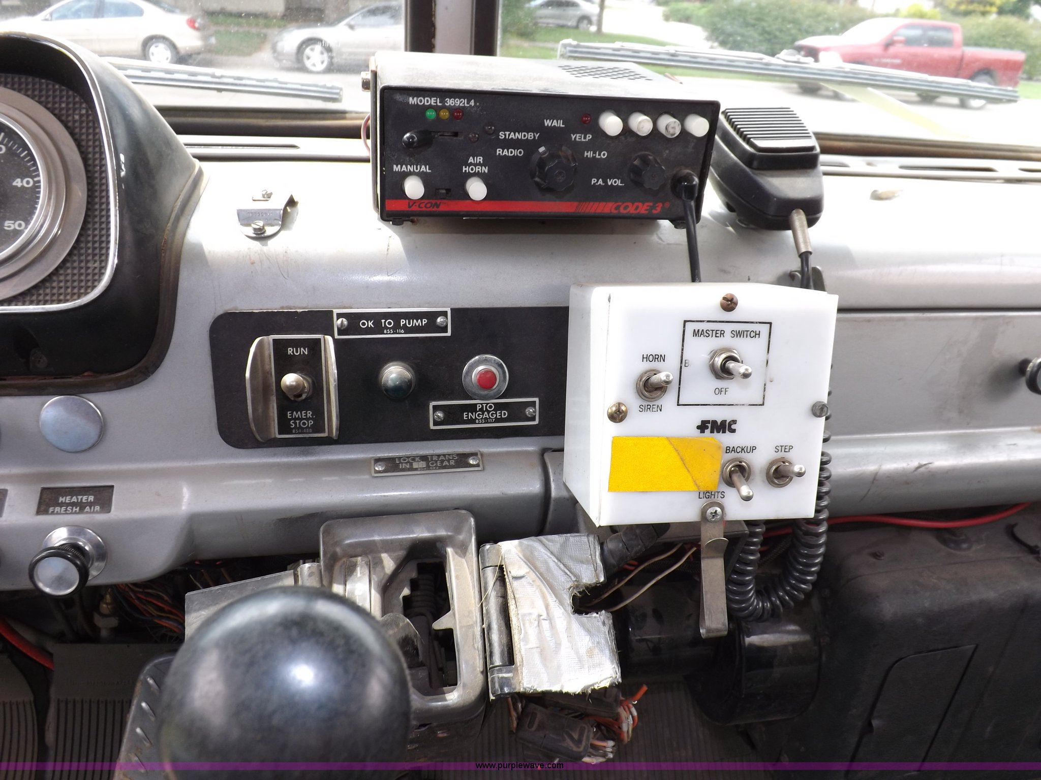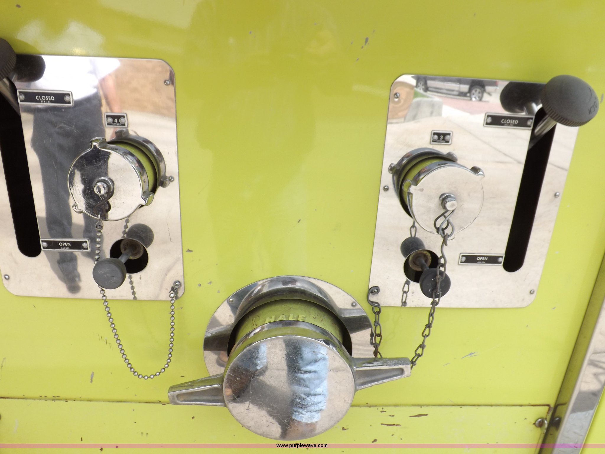 Purple Wave is selling a used Fire Truck or Emergency Vehicle in Kansas. This item is a 1980 Ford Custom Cab 8000 firetruck with the following: 32,312 miles on odometer, Caterpillar 3208 diesel engine, Engine replaced at 29,975 miles, AT540 automatic transmission, Heat, 500 gallon water tank, 1,000 gpm pump capacity, 5" suction, (4) 2.5" discharge, (2) 1" booster reels, Approximately 100'L hose per reel, 2.5" auxiliary inlet, (2) 10'L x 5" diameter hard suction hoses, 24' extension ladder, 14' roof ladder, 10' attic ladder, Pump and roll capable, Front and rear work lights, Chrome bumper, PTO, Spring suspension, Air brakes, 153" wheelbase, 10.00R20 tires, GVWR 29,300 lbs, Tires weathered, Driver's windshield cracked, Driver's door damaged, Unit# 200040