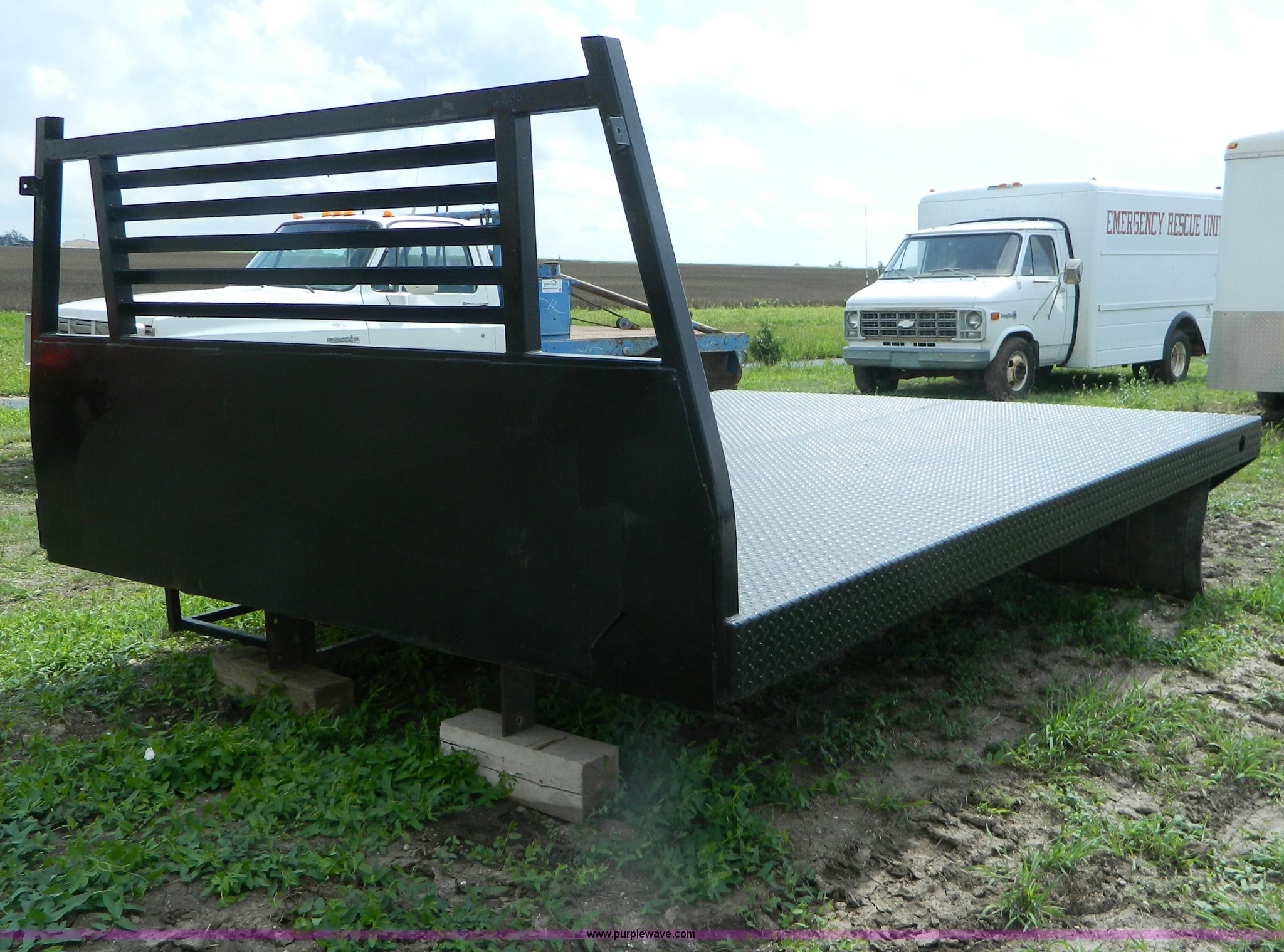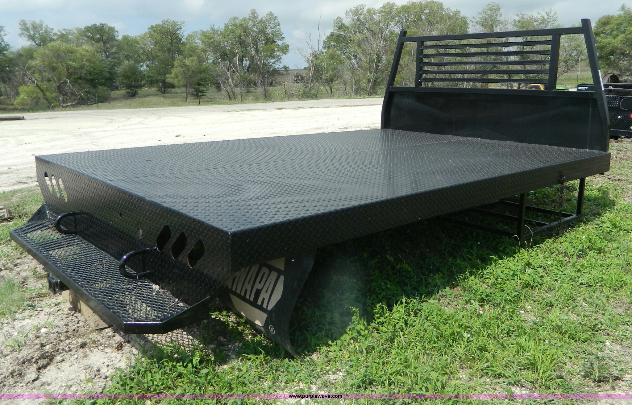 Purple Wave is selling a used Automotive Parts or Acces. in Kansas. This item is a Steel flatbed with the following: 11'L x 94"W, Headache rack, Steel tread plate