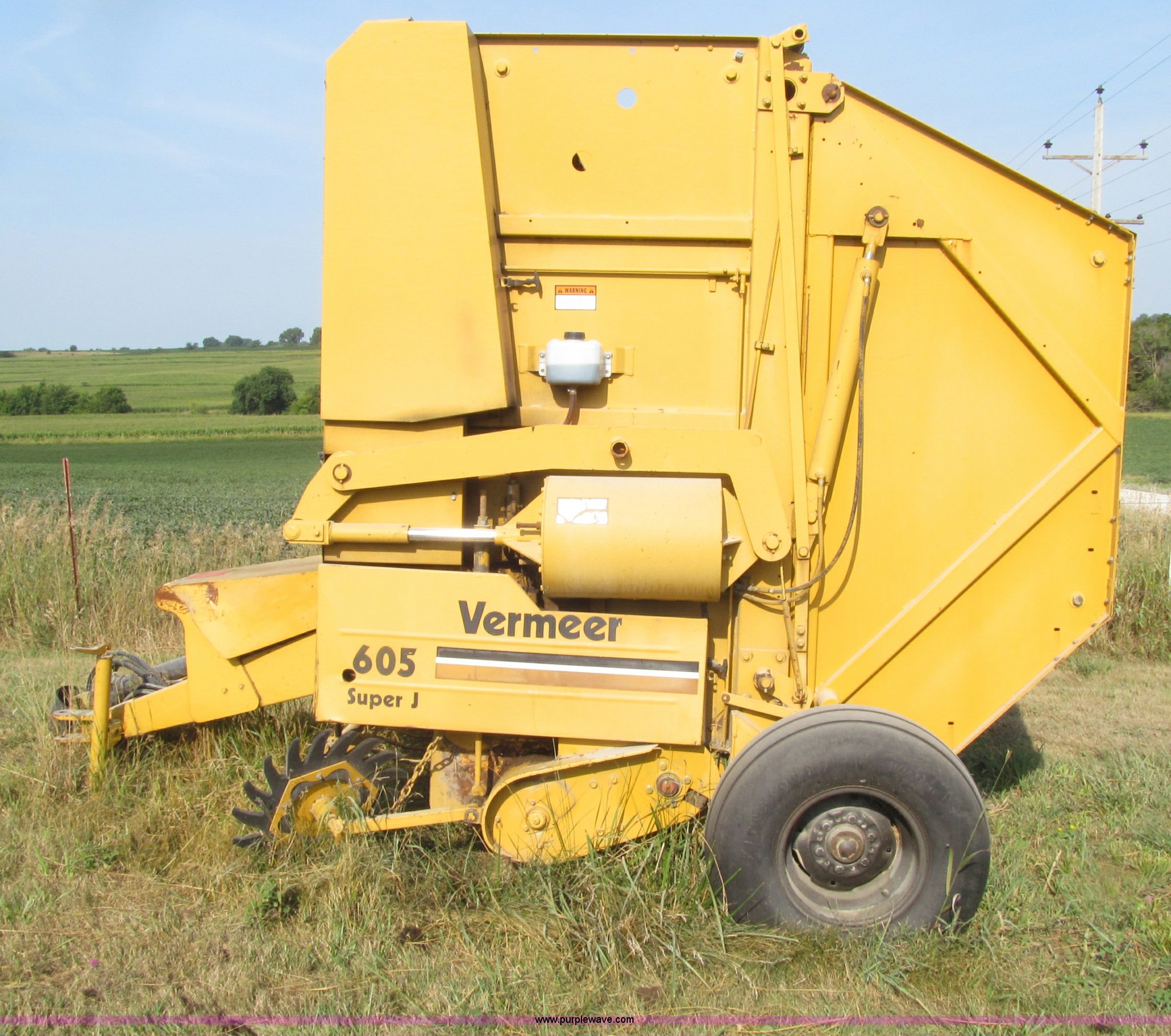 Purple Wave is selling a used Round Baler in Iowa. This item is a 1991 Vermeer 605 Super J round baler with the following: 540 PTO, Twine only, Bale counter, 31x13.50-15 tires, Serial 1VRA121R7M1005111