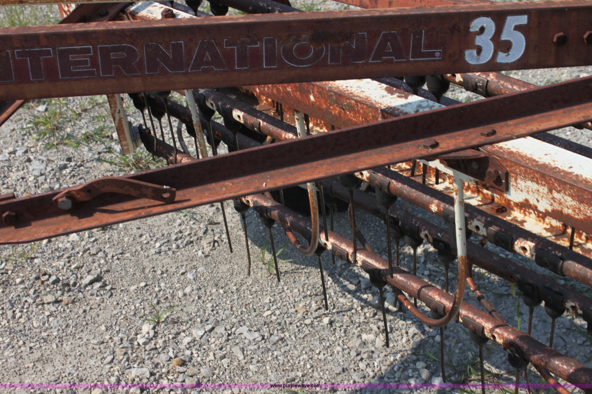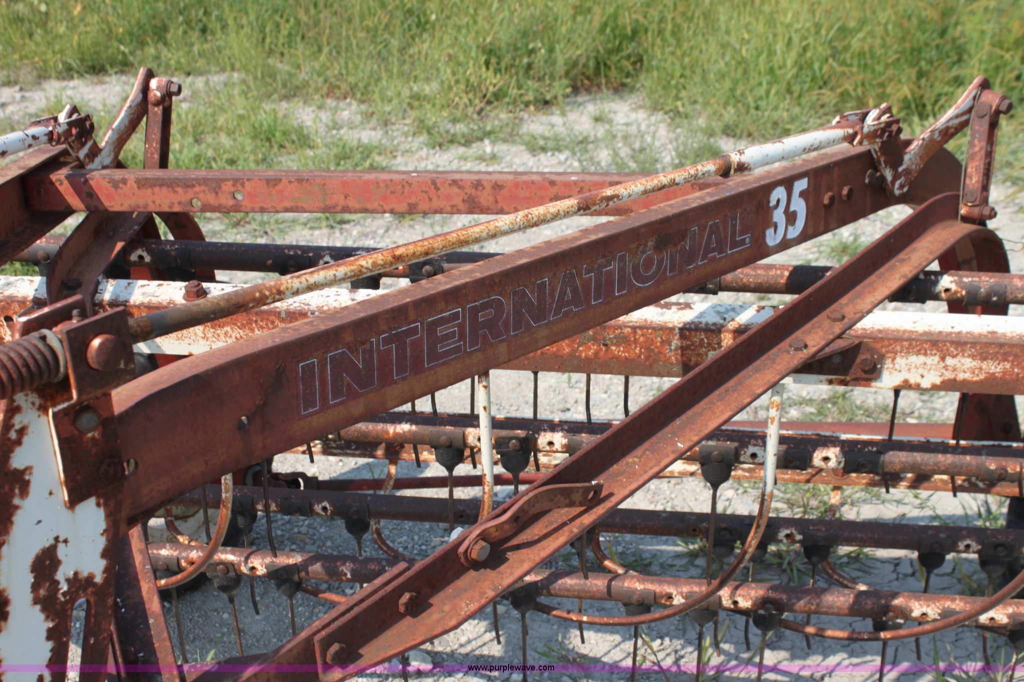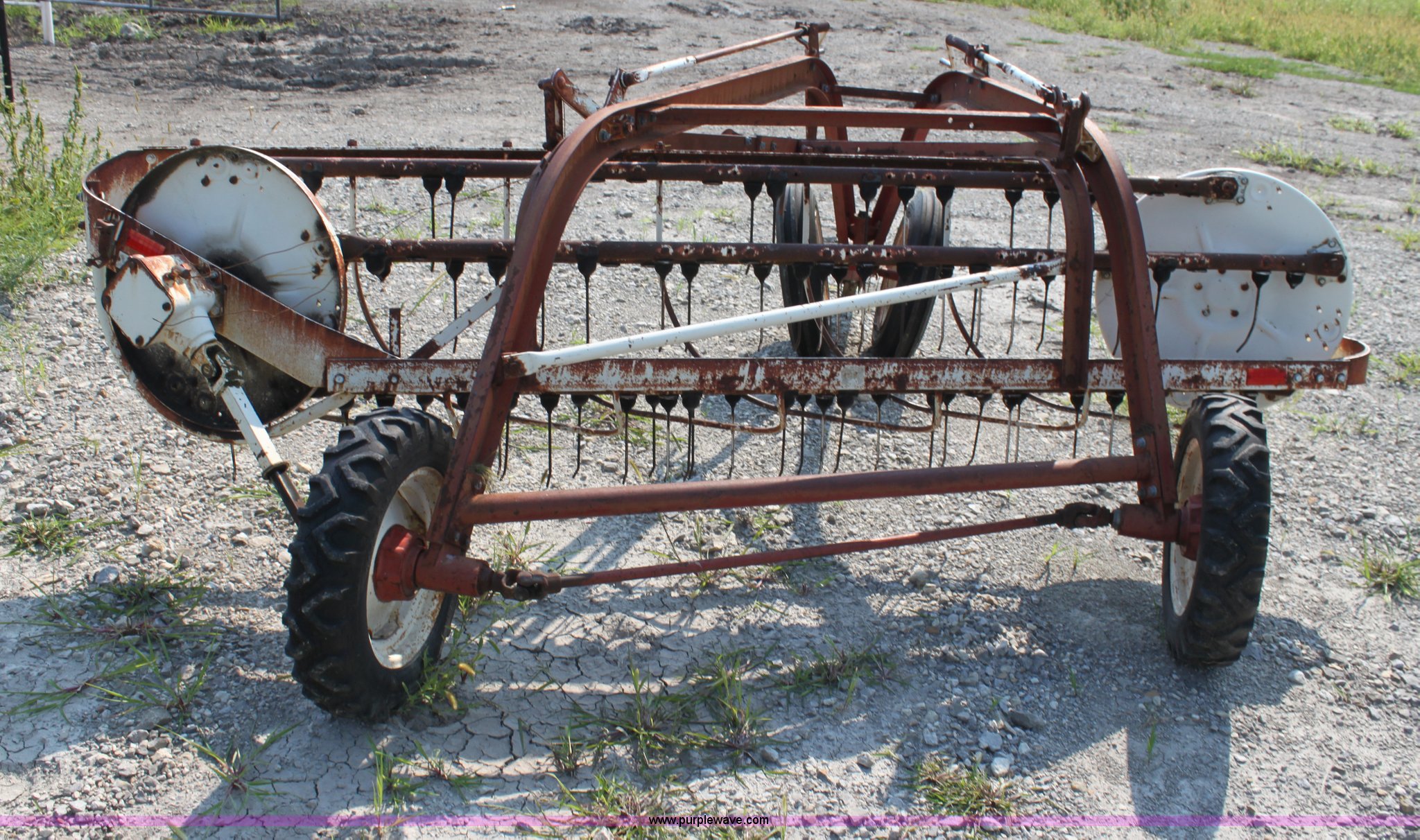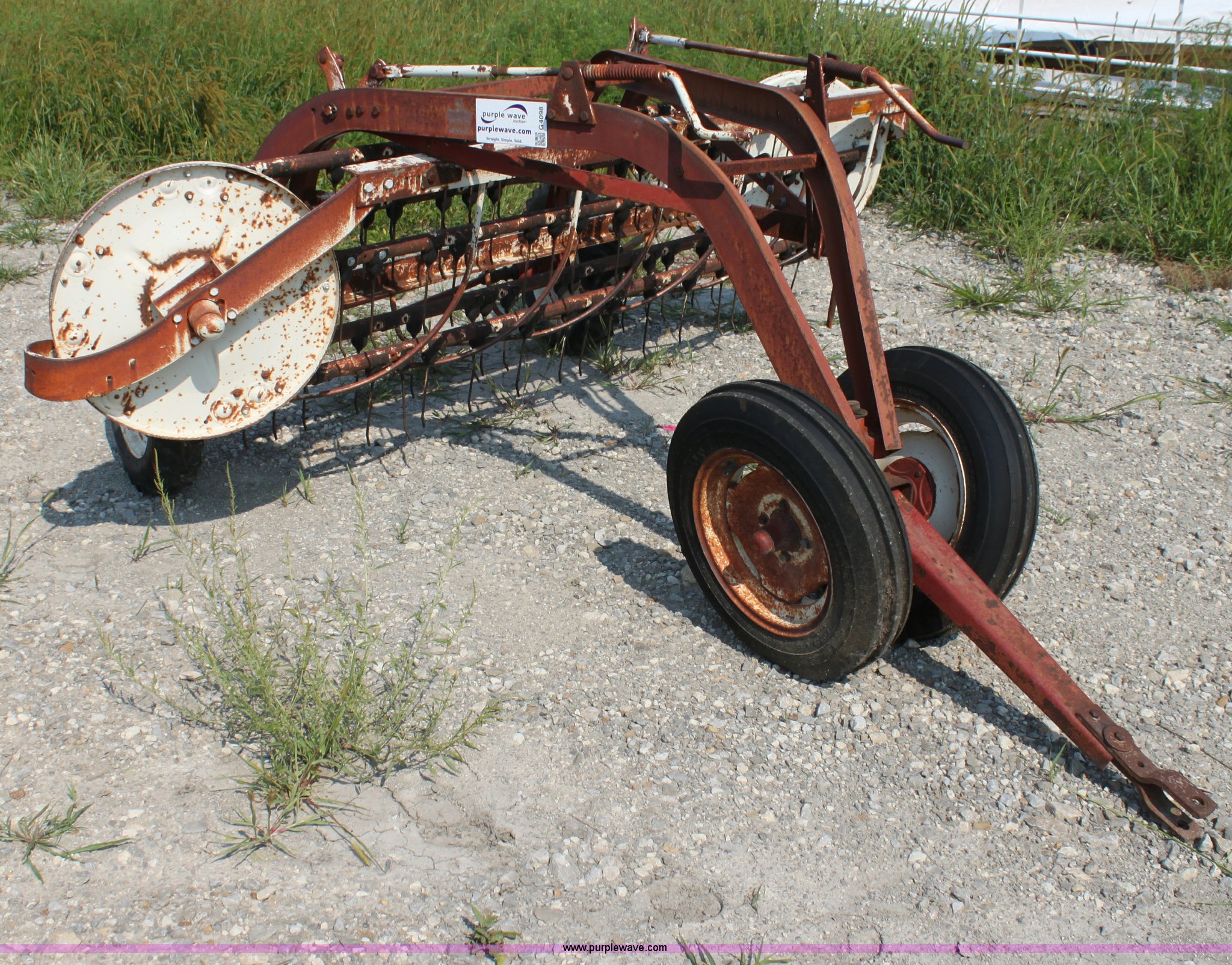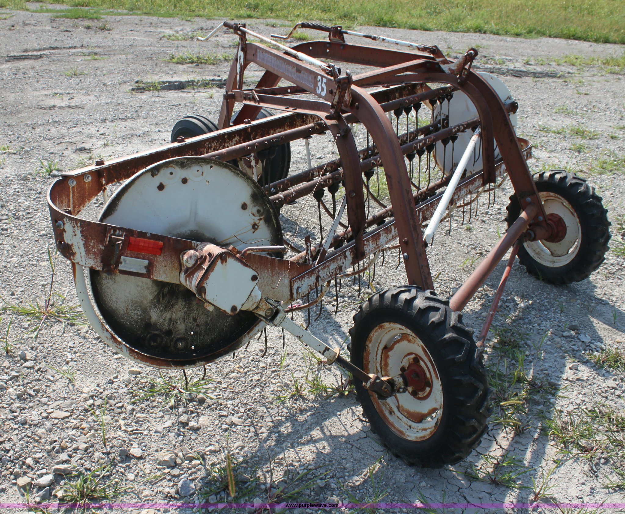 Purple Wave is selling a used Hay Rake in Kansas. This item is a International 35 side delivery hay rake with the following: Ground driven, Manual height adjustment, 15" tires, Serial 1110040U006527