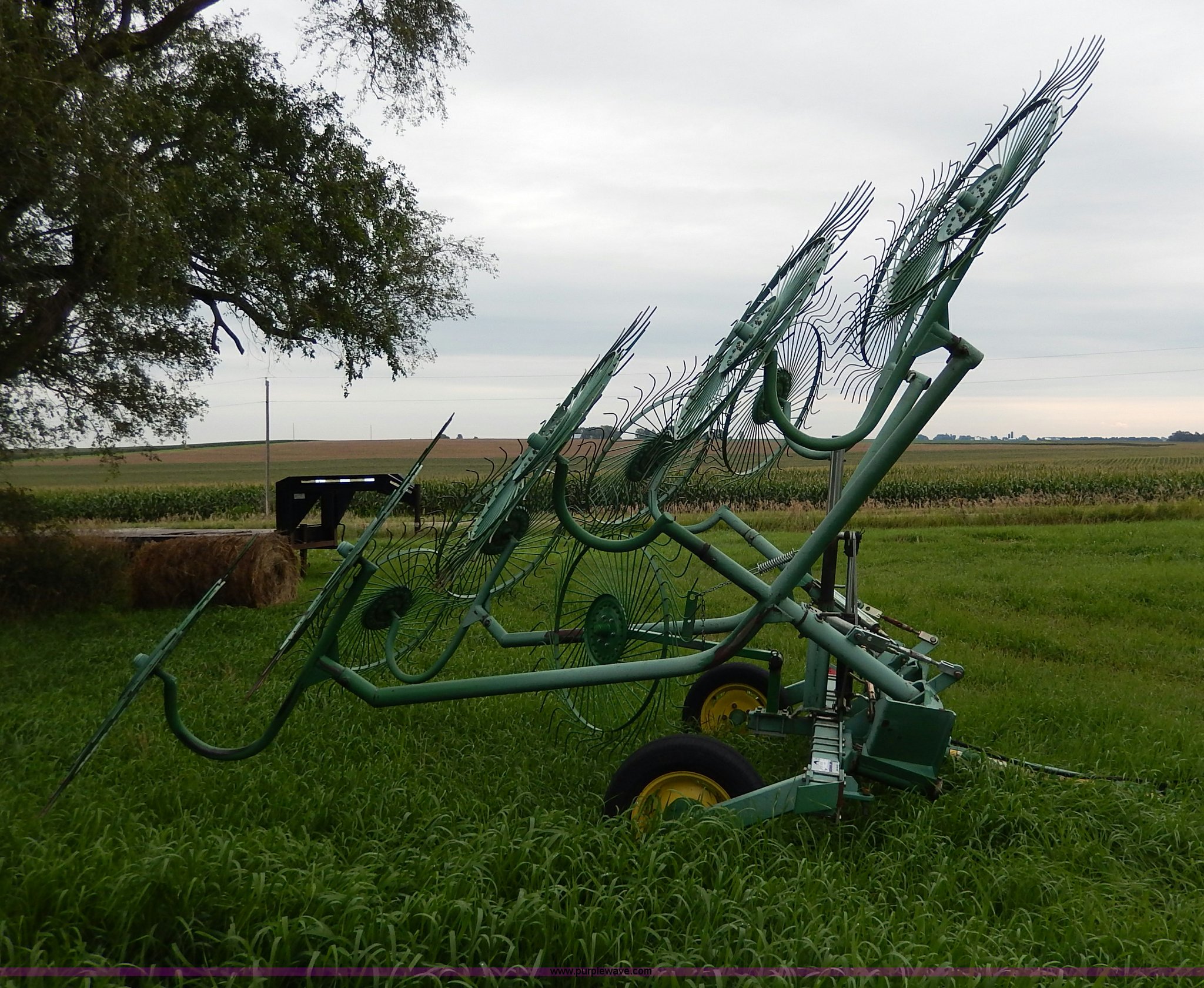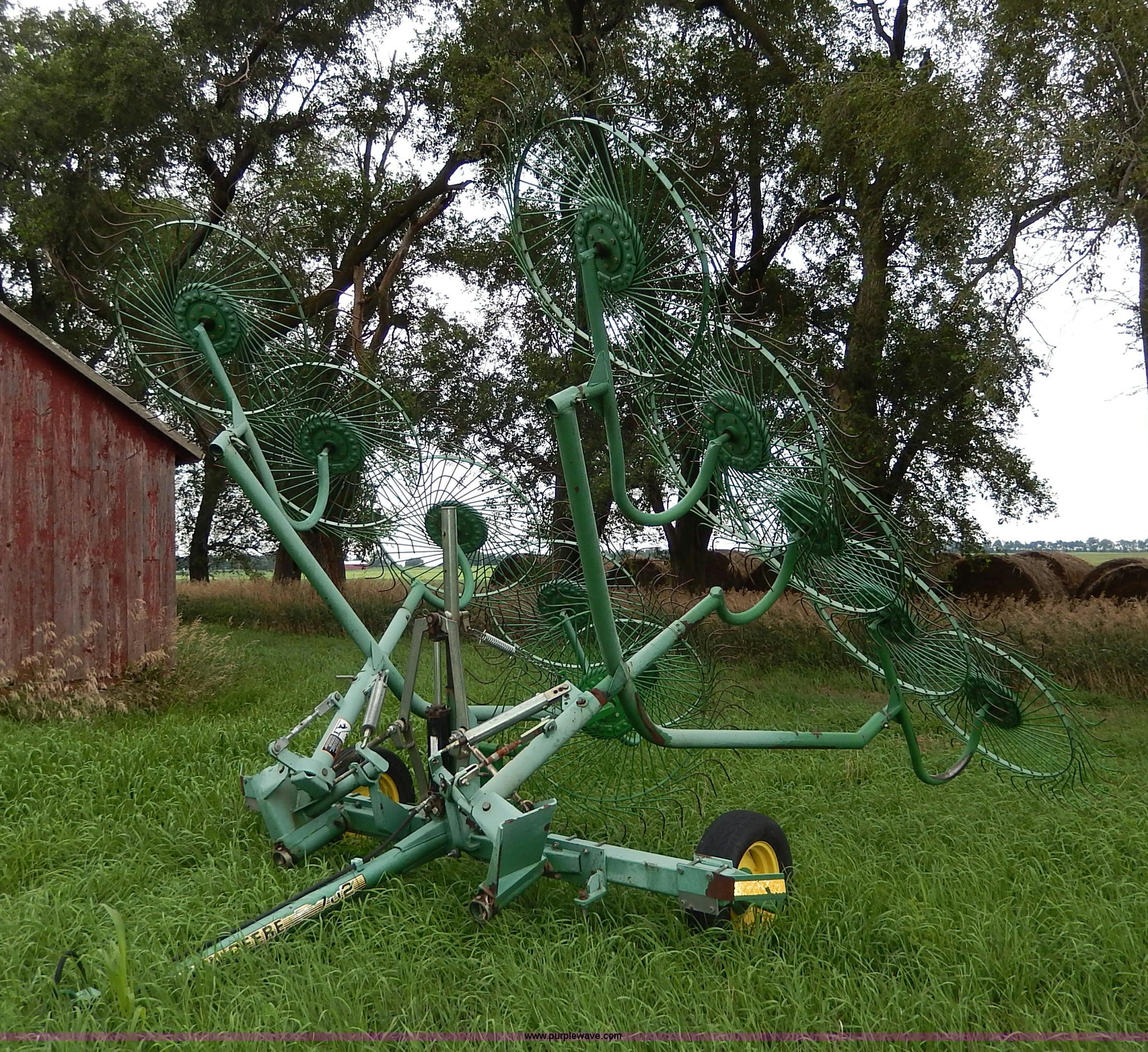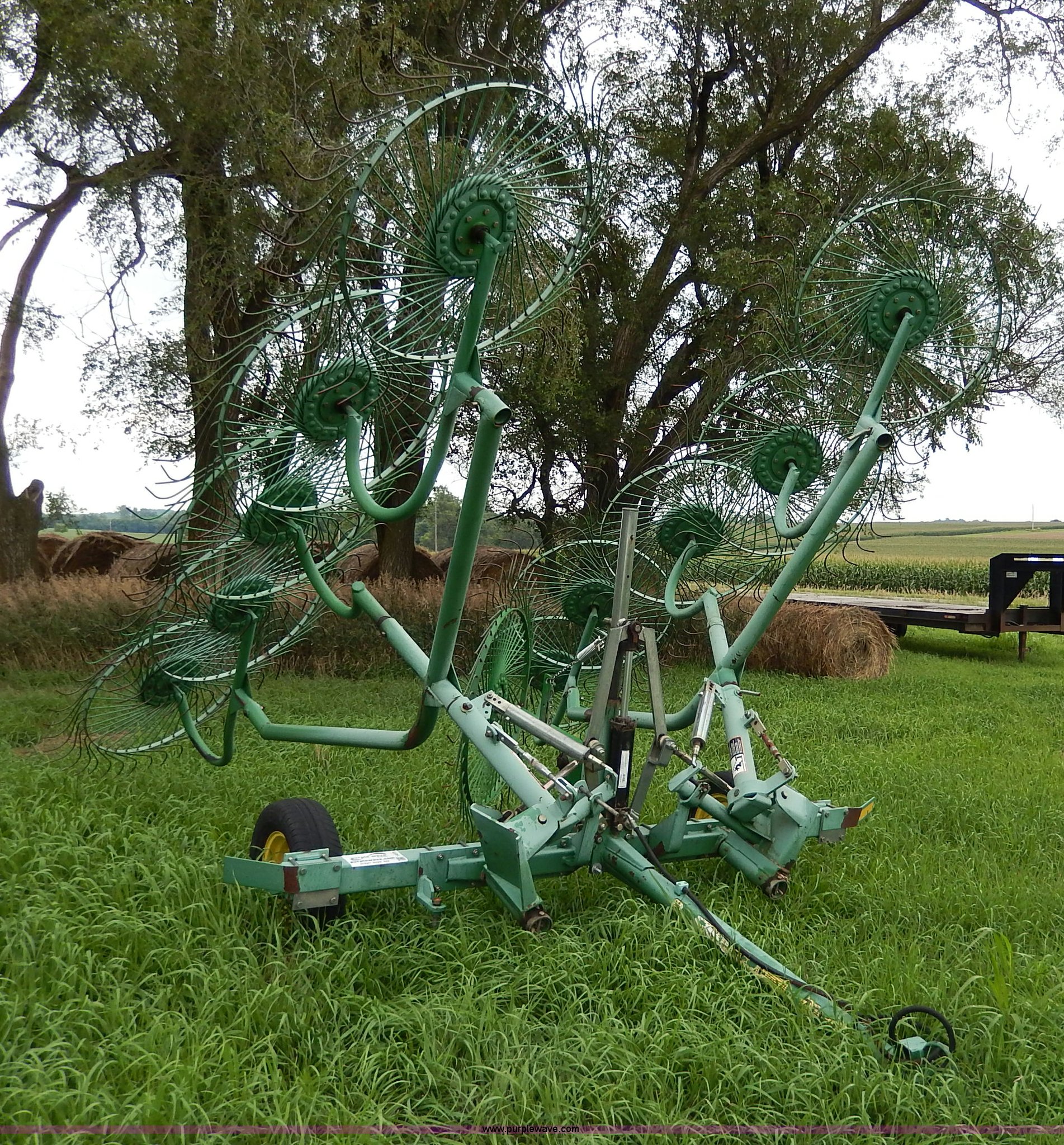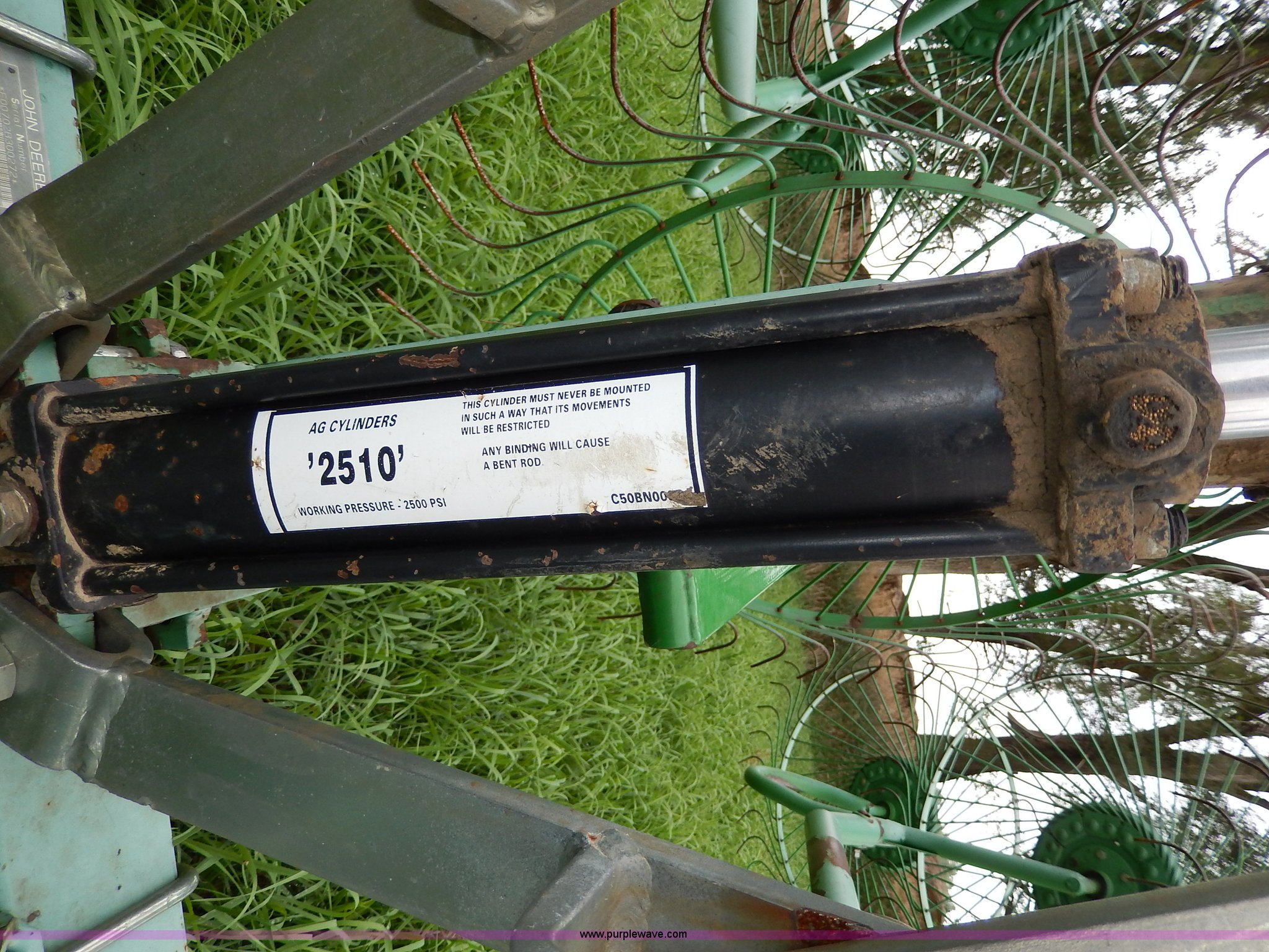 Purple Wave is selling a used Hay Rake in Kansas. This item is a John Deere 702 hay rake with the following: 25' to 30' adjustable span, 2,500 psi hydraulic cylinder, Kicker wheel, Pin hitch, 185/65R14 tires, Serial E00702B300272