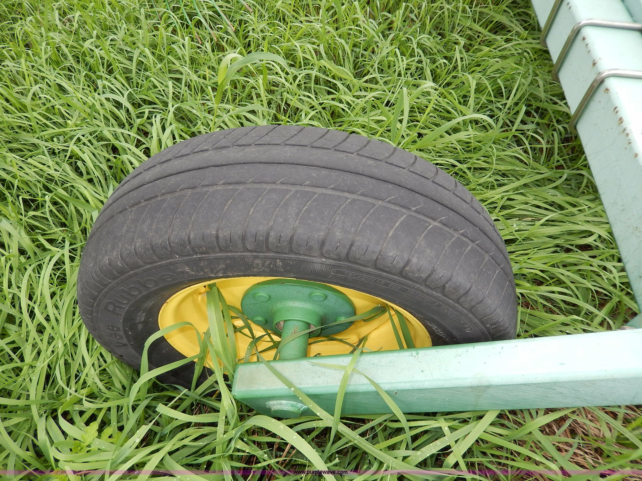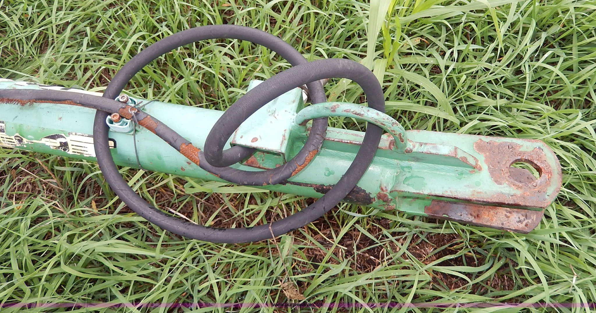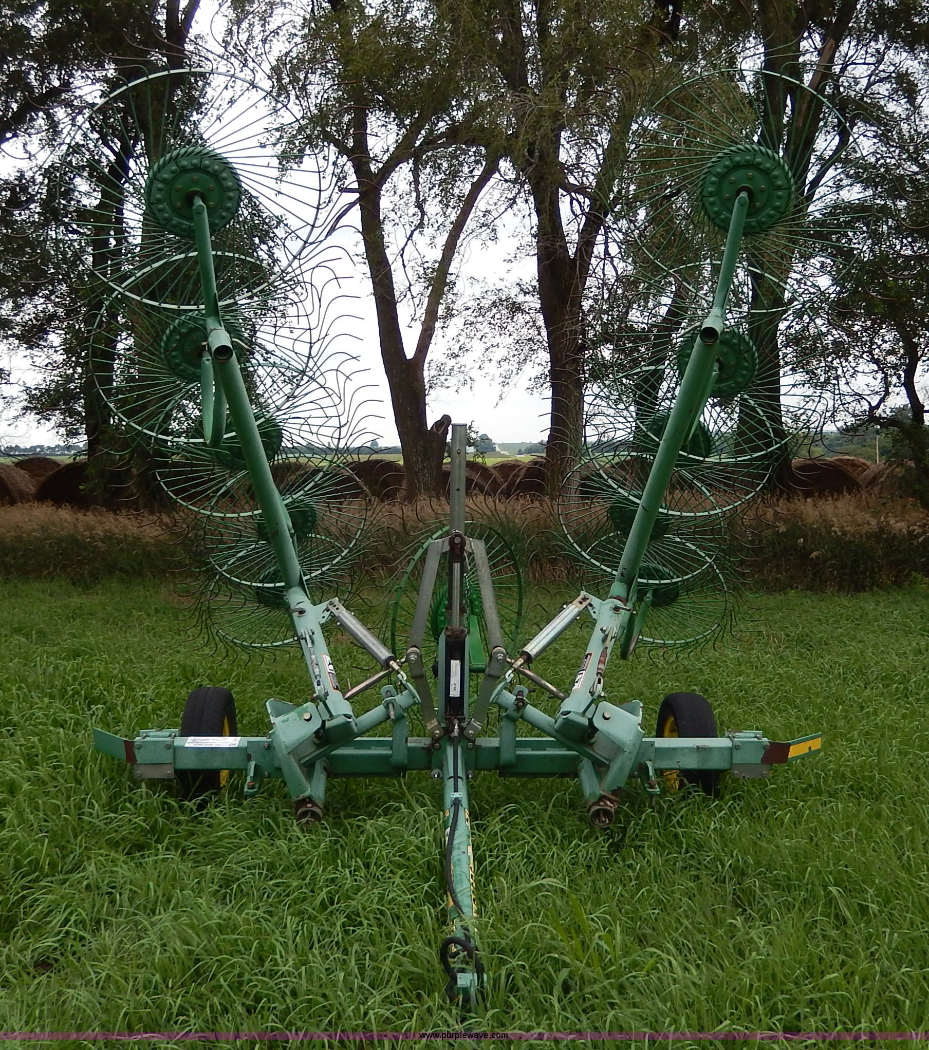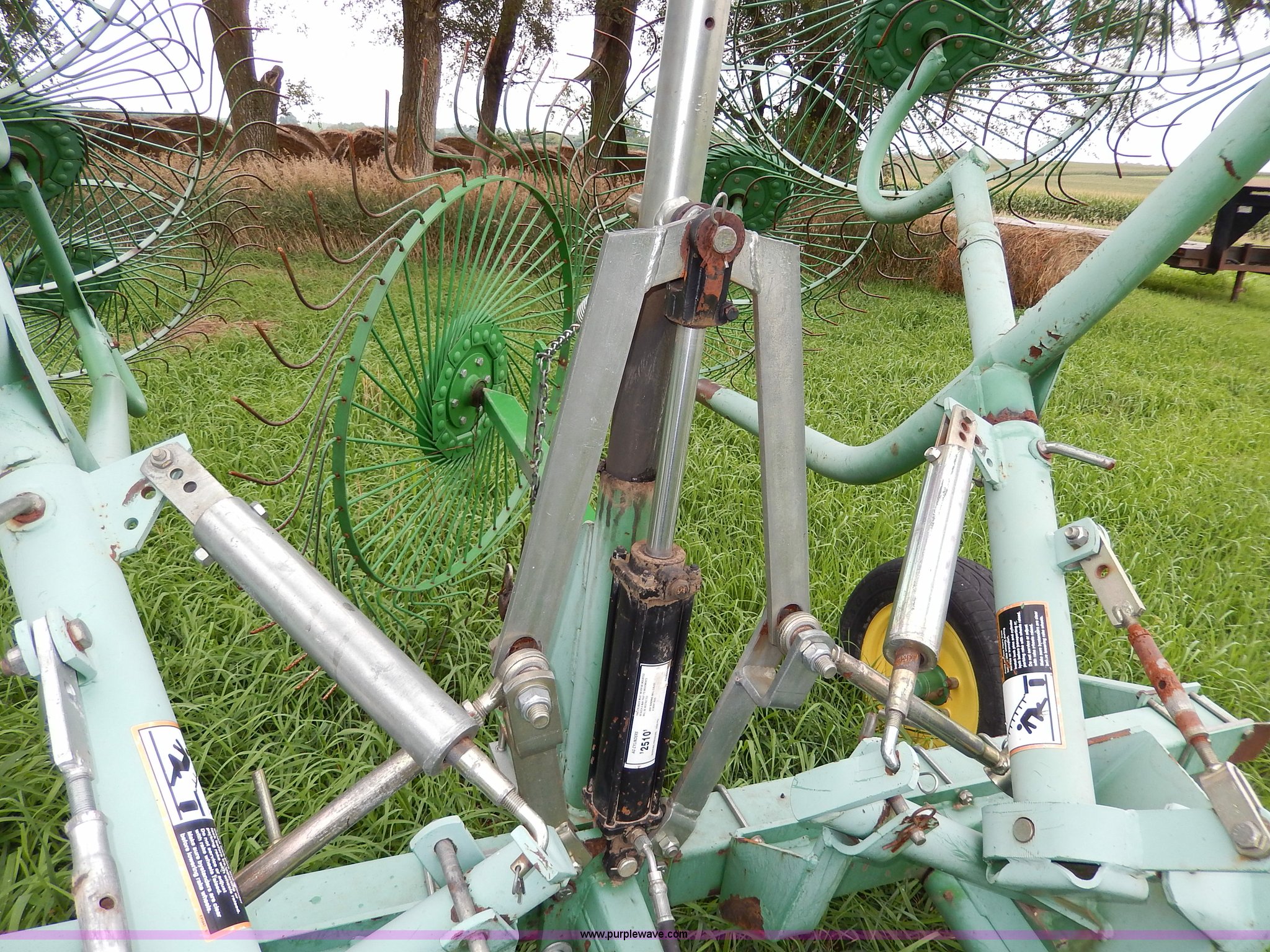 Purple Wave is selling a used Hay Rake in Kansas. This item is a John Deere 702 hay rake with the following: 25' to 30' adjustable span, 2,500 psi hydraulic cylinder, Kicker wheel, Pin hitch, 185/65R14 tires, Serial E00702B300272