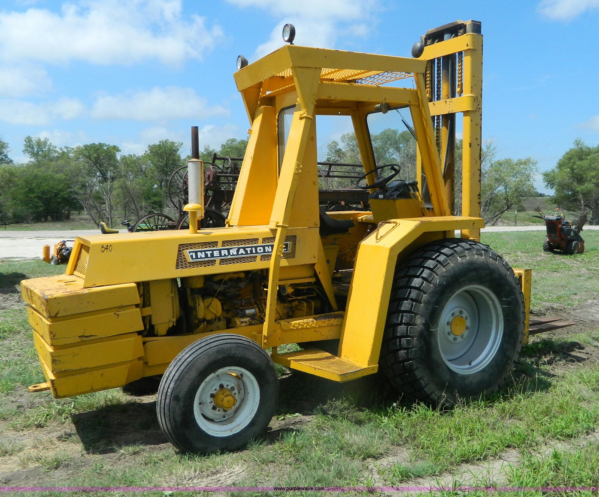 Purple Wave is selling a used Strt. Mast Rough Terr. Forklift in Kansas. This item is a International 7000 forklift with the following: 7,743 hours on meter, Four cylinder gas engine, Three speed transmission, Hi-Lo, 5,000 lbs maximum lift capacity, 56"L forks, Side shift, 16' mast, Serial 799