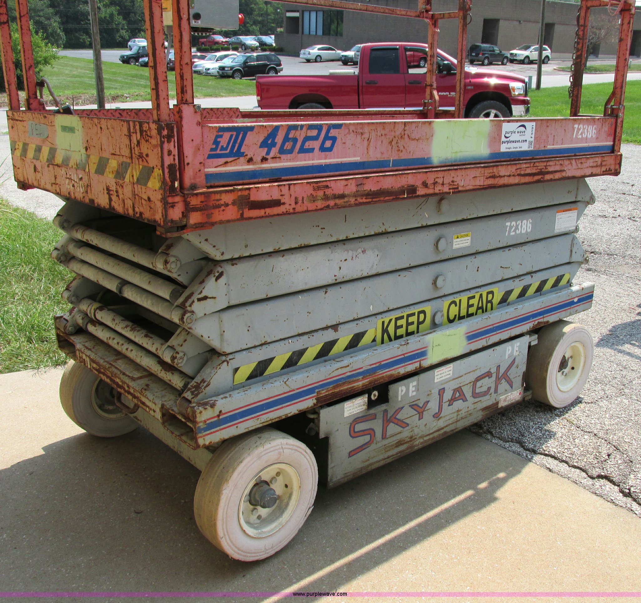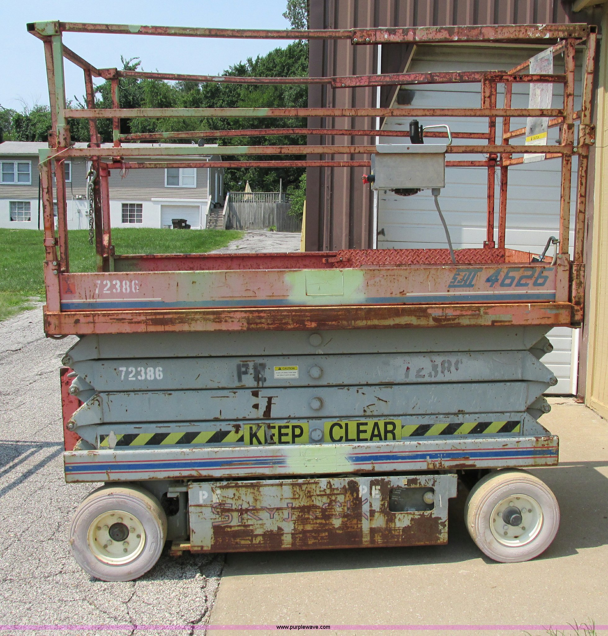 Purple Wave is selling a used Scissor or Vertical Lift in Missouri. This item is a 1995 Skyjack 4626 scissor lift with the following: 508 hours on meter, 26' maximum lift height, 850 lbs maximum capacity, 46"W, 36" slide-out extensions, Built in charger, Non marking tires, 4,160 lbs. base operating weight, New controller installed 2012, Serial 72386