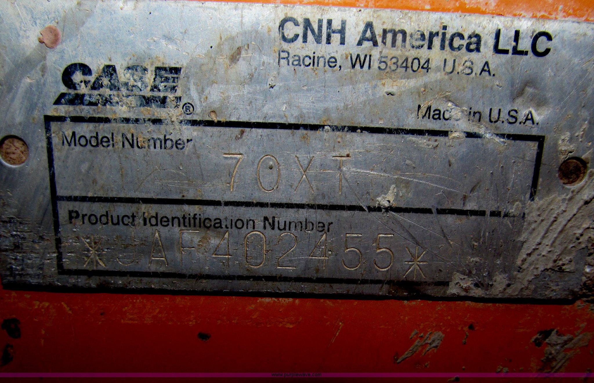 Purple Wave is selling a used Skid Steer Loader in Nebraska. This item is a 2003 Case 70XT skid steer with the following: 2,668 hours on meter, Hours may vary, still in use, Case 4T-390 diesel engine, 85 HP, ExMark operator seat, 72" smooth cutting edge bucket, Two pin manual bucket attachment, Self leveling, Work lights, (6) front mount hydraulic couplers, 12 x 16.5 tires, 6,906 lbs. base operating weight, Key box wired on with light, ROPS serial JAF40713H, 2,000 lbs capacity, 6,906 lbs. base operating weight, Serial JAF402455